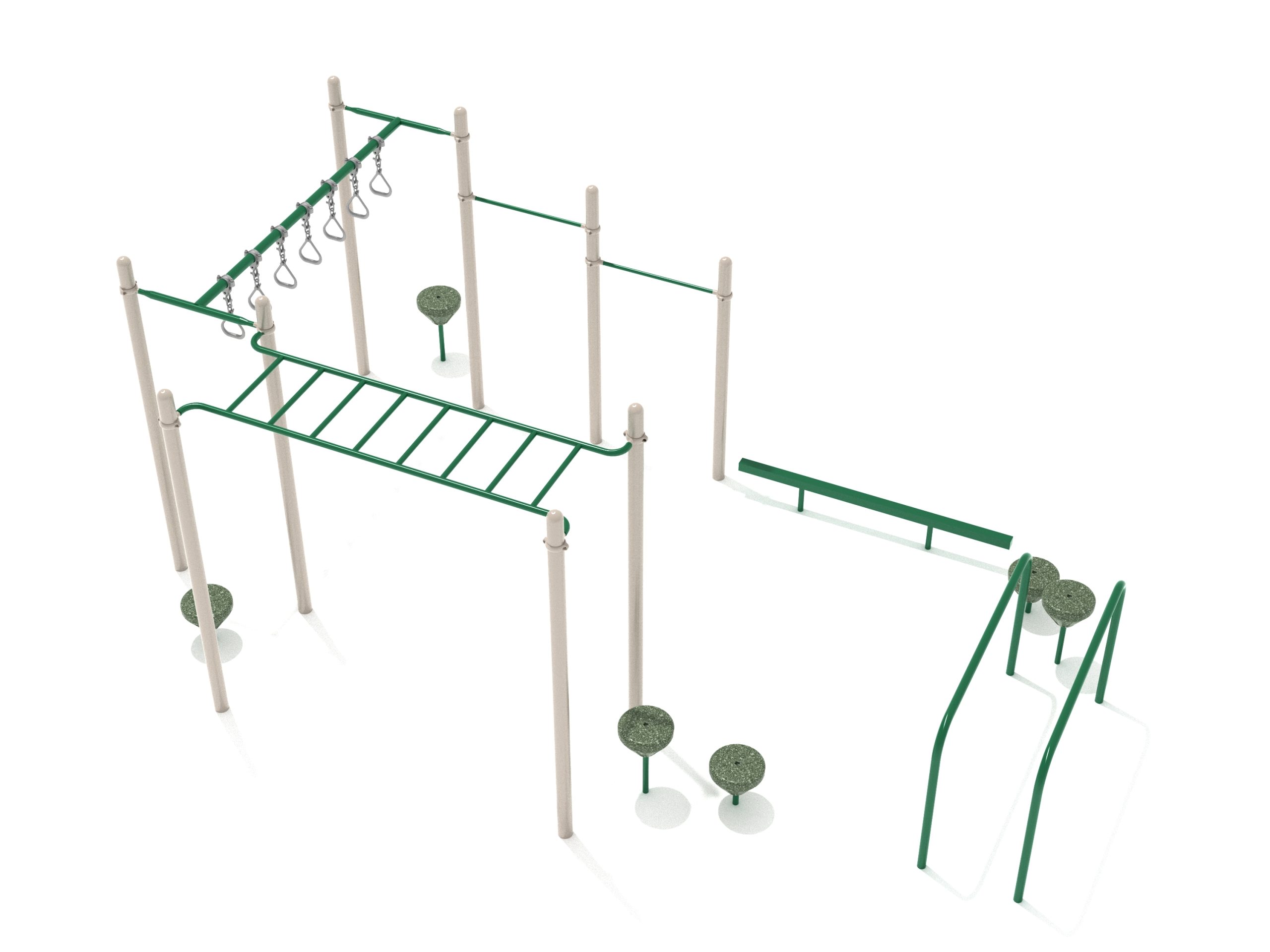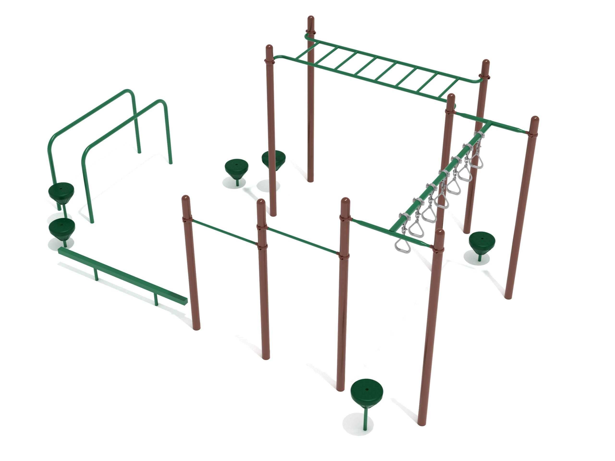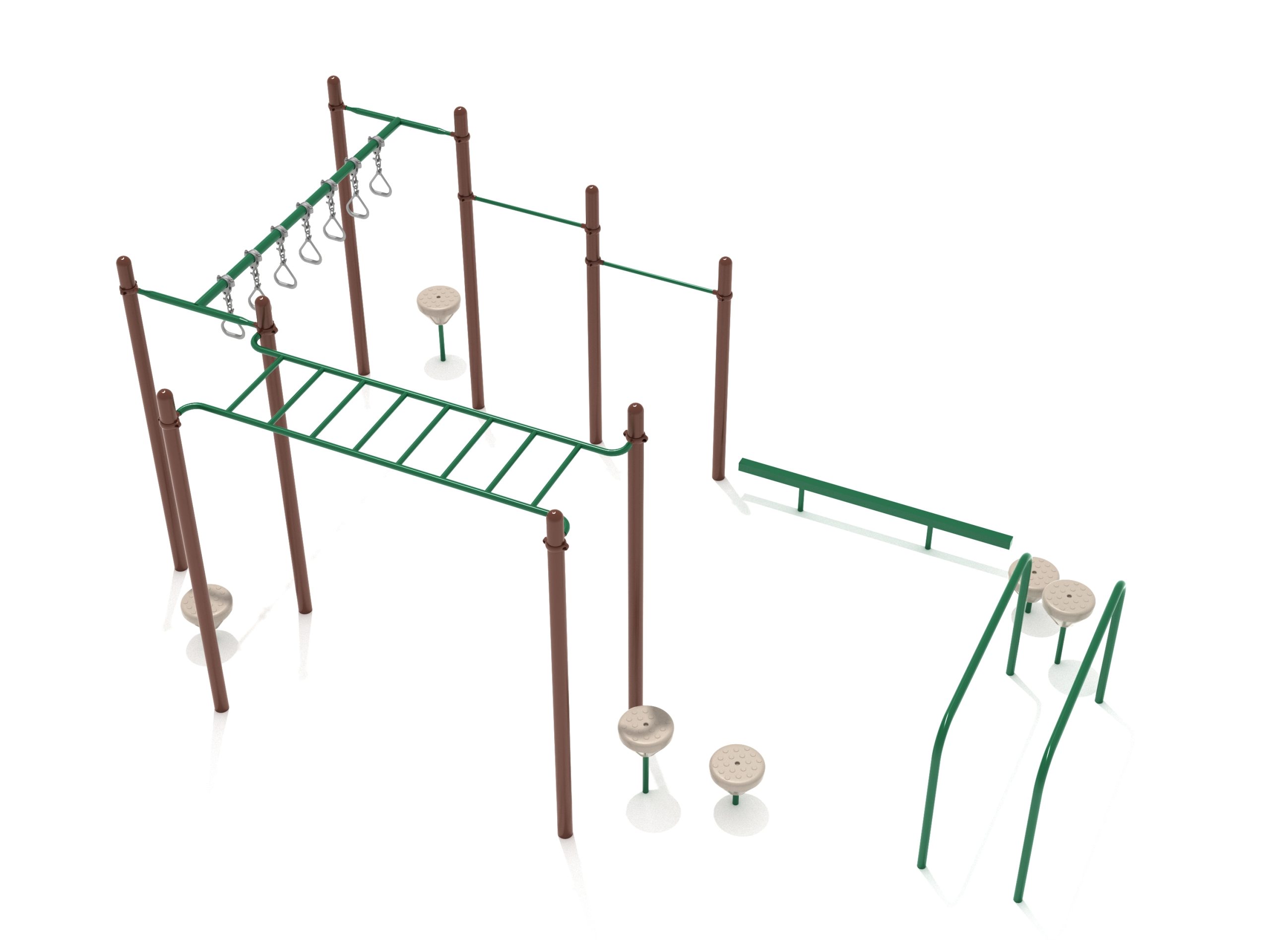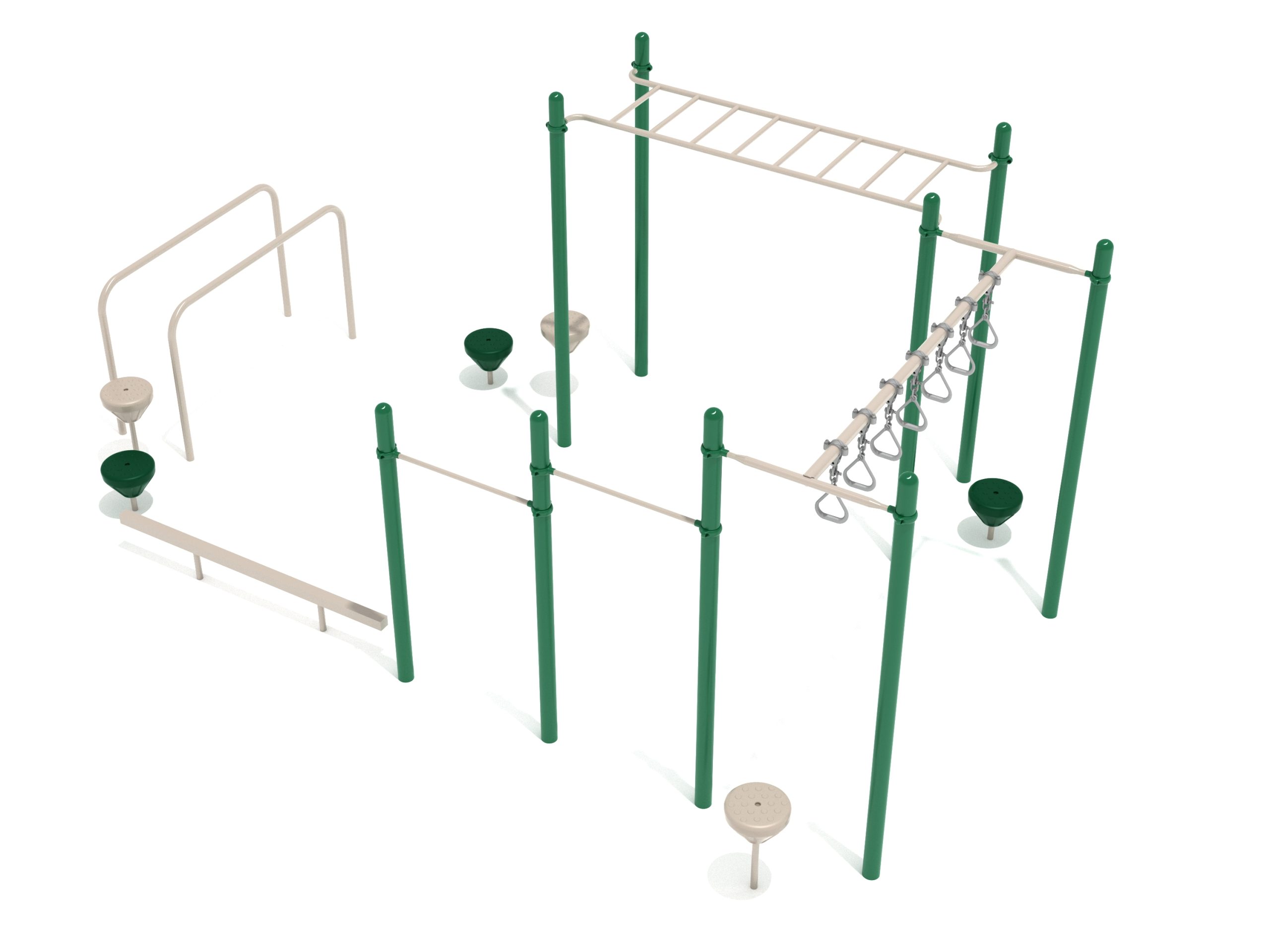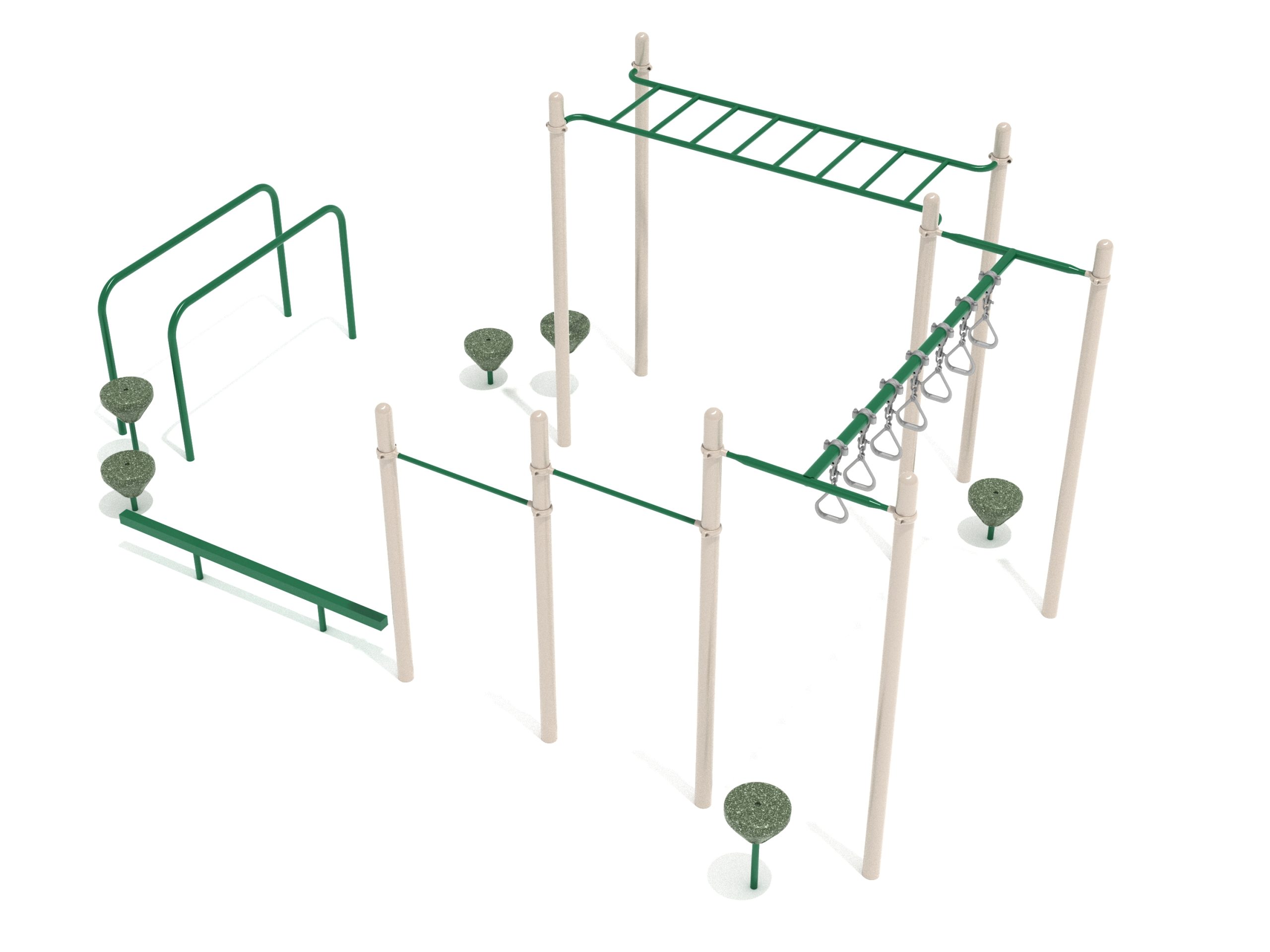 Alpharetta is less of a play system and more of a calisthenics course but for kids, of course. It has almost everything a kid needs to build their upper body strength. The course starts with two Parallel Bars that kids can use to practice headstands or work on their balance and coordination. Towards the end of the bars, kids can step on the Pebble Climber to reach the Balance beam. They can walk over it while maintaining their balance and eventually lead towards 2 Pull Up Bars of different heights. Kids can choose which Pull Up bar to use based on their height. Then comes the most challenging part of this course, the Overhead Staright Swinging Ring Ladder. Kids can think of themselves as commandos and swing their way across it to the Overhead Horizontal Ladder. They can rest for a little while and re-gather their energy to conquer this ladder and complete the course.