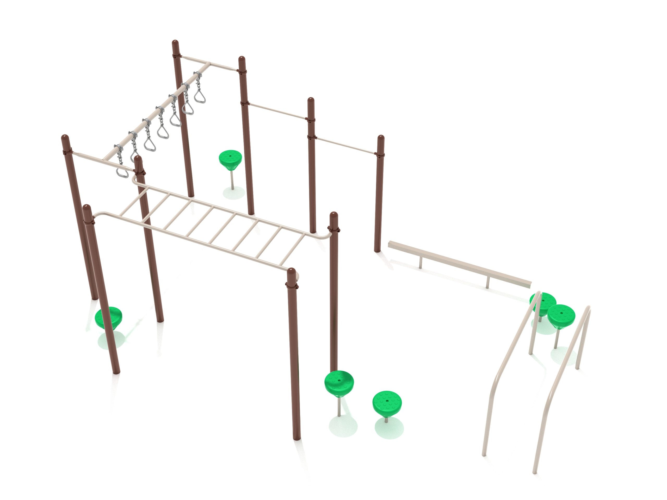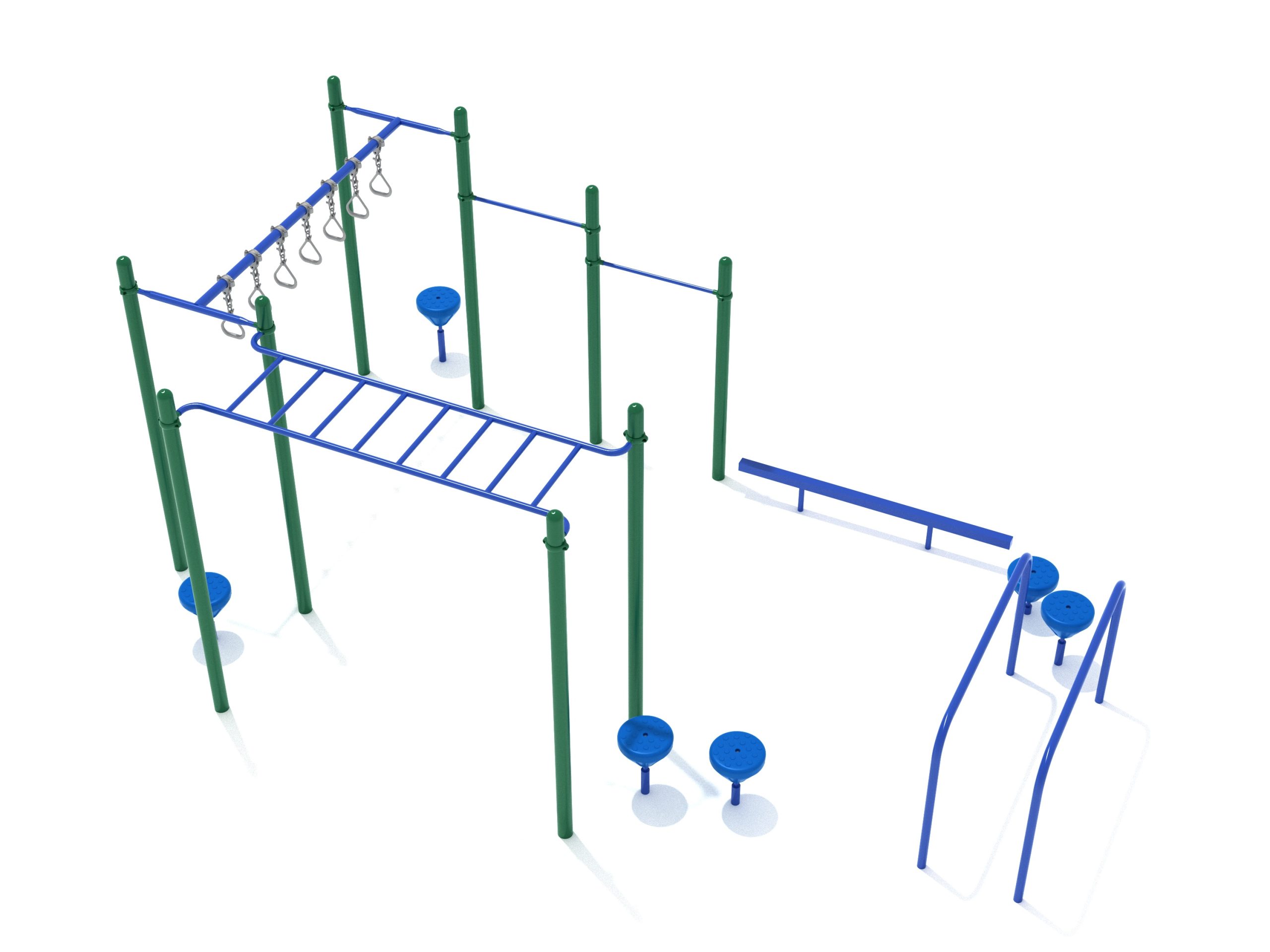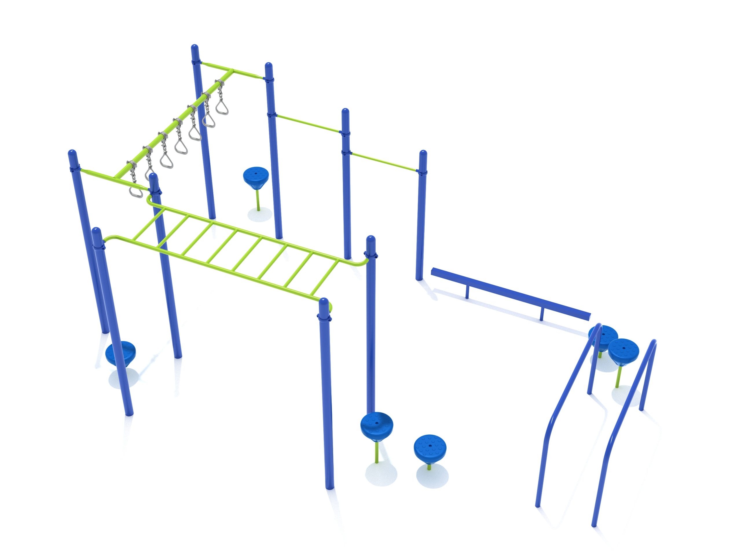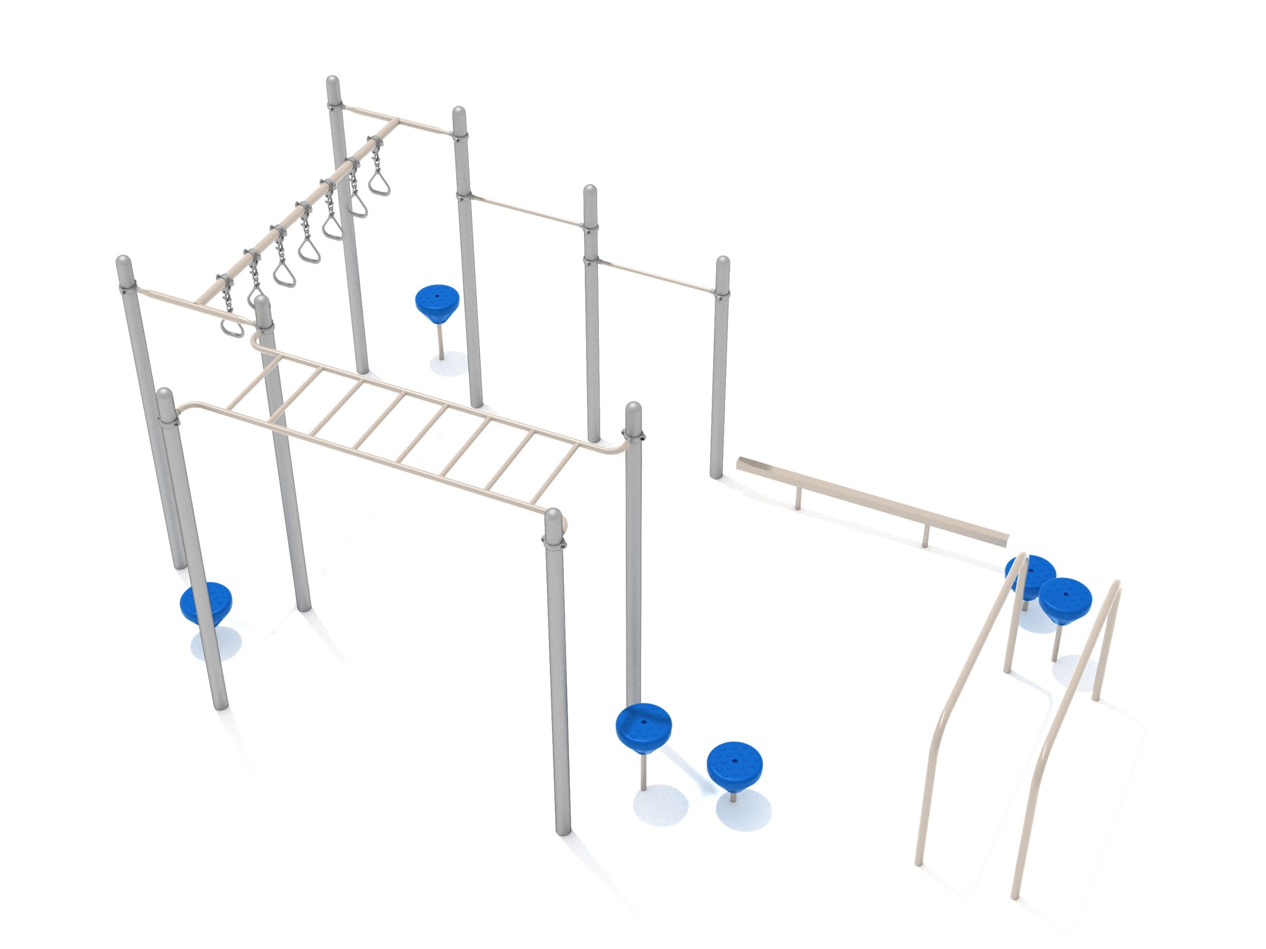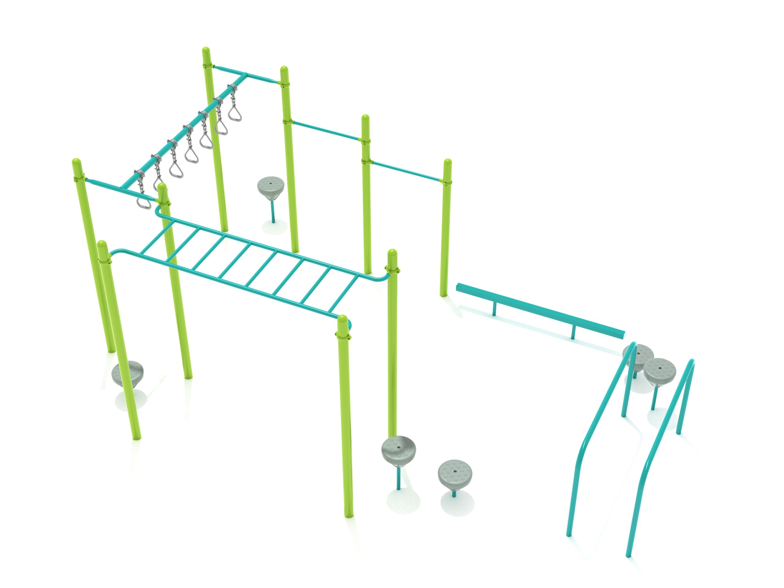 Alpharetta is less of a play system and more of a calisthenics course but for kids, of course. It has almost everything a kid needs to build their upper body strength. The course starts with two Parallel Bars that kids can use to practice headstands or work on their balance and coordination. Towards the end of the bars, kids can step on the Pebble Climber to reach the Balance beam. They can walk over it while maintaining their balance and eventually lead towards 2 Pull Up Bars of different heights. Kids can choose which Pull Up bar to use based on their height. Then comes the most challenging part of this course, the Overhead Staright Swinging Ring Ladder. Kids can think of themselves as commandos and swing their way across it to the Overhead Horizontal Ladder. They can rest for a little while and re-gather their energy to conquer this ladder and complete the course.