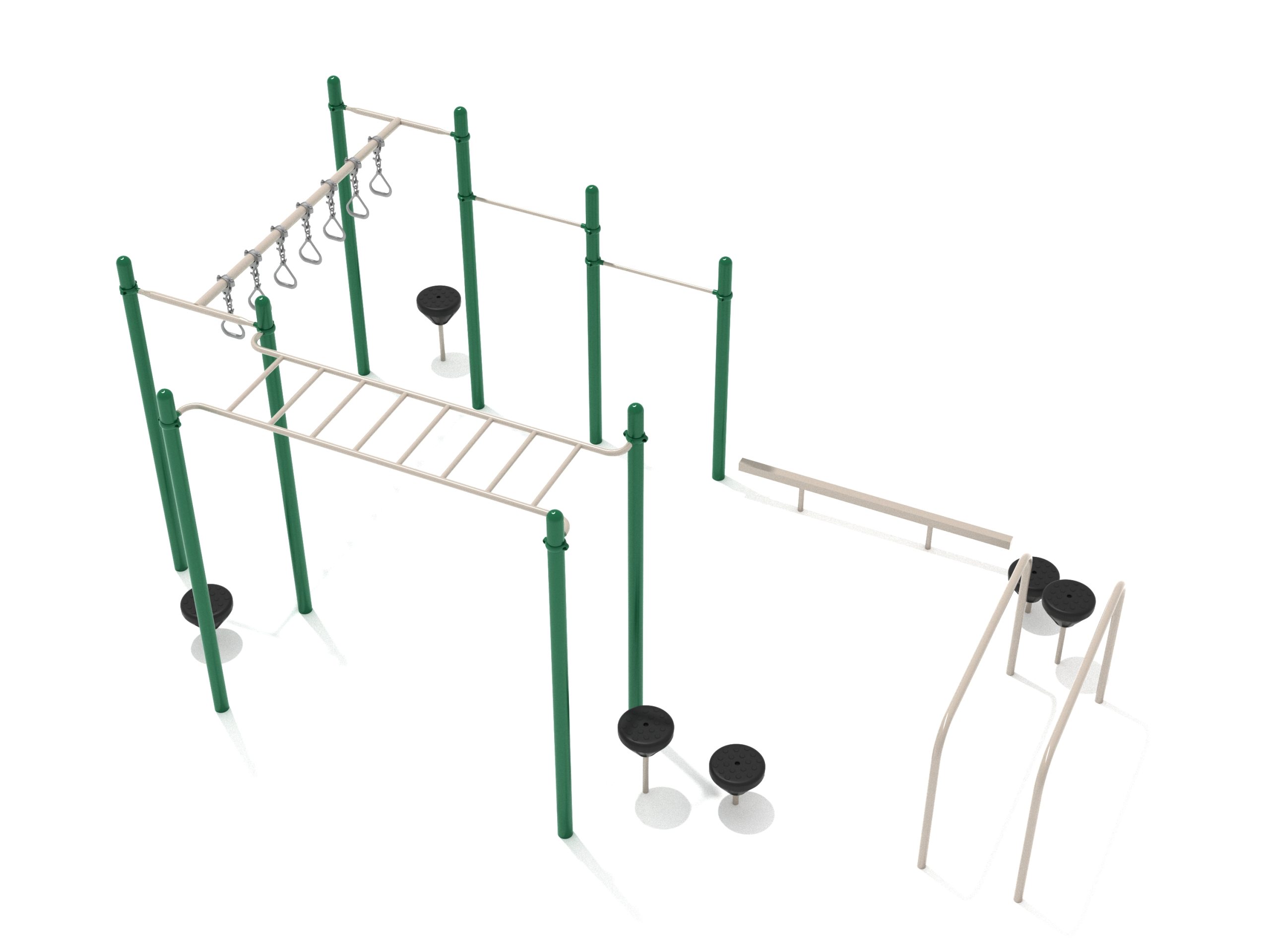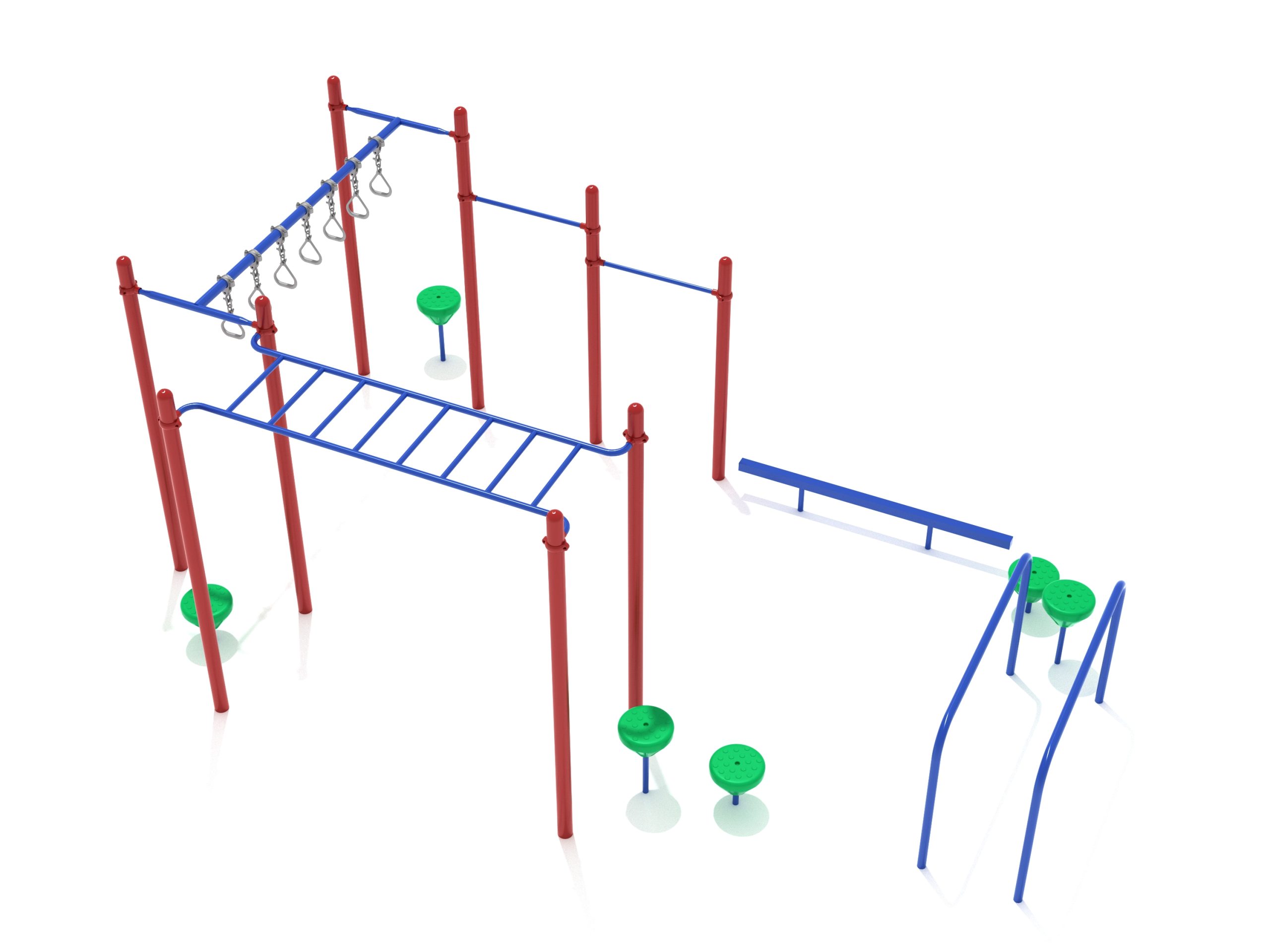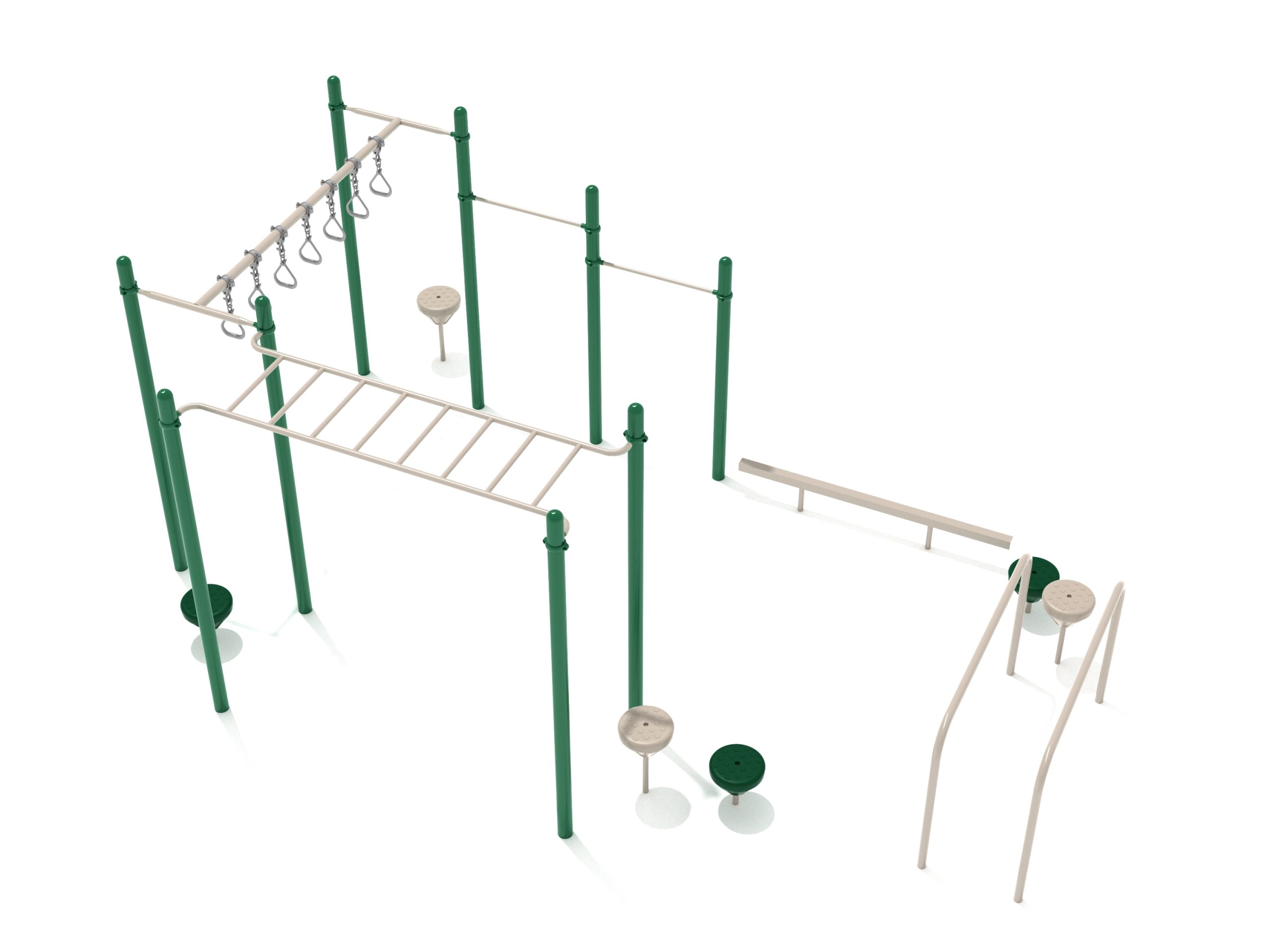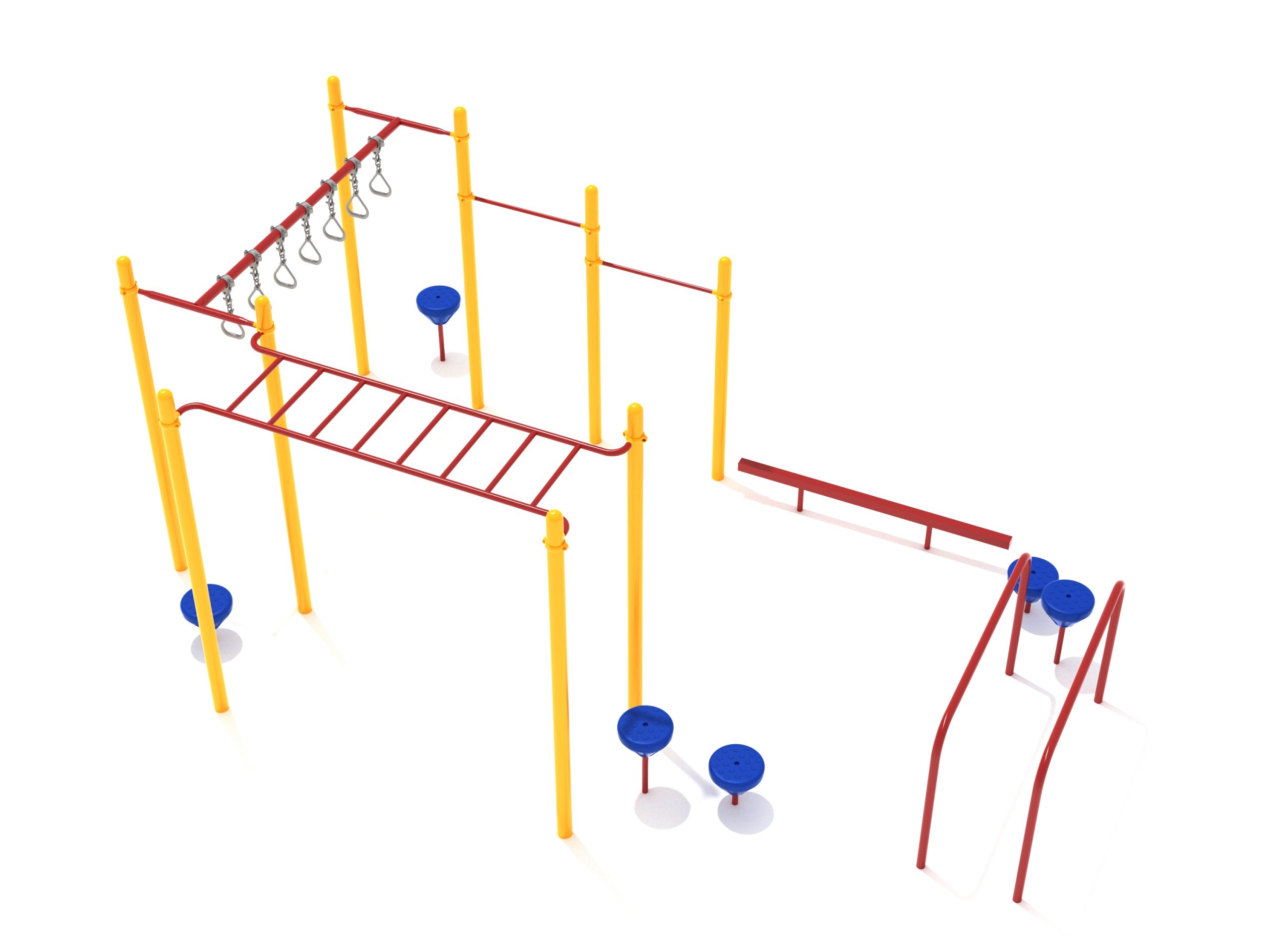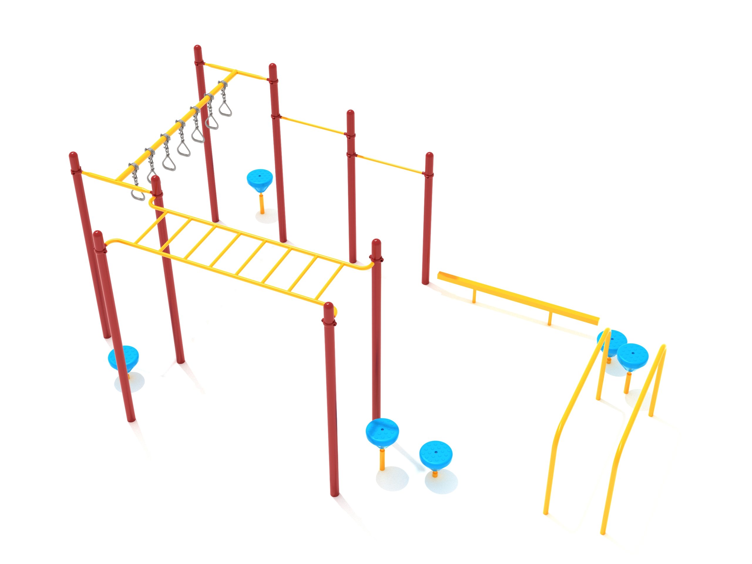 Alpharetta is less of a play system and more of a calisthenics course but for kids, of course. It has almost everything a kid needs to build their upper body strength. The course starts with two Parallel Bars that kids can use to practice headstands or work on their balance and coordination. Towards the end of the bars, kids can step on the Pebble Climber to reach the Balance beam. They can walk over it while maintaining their balance and eventually lead towards 2 Pull Up Bars of different heights. Kids can choose which Pull Up bar to use based on their height. Then comes the most challenging part of this course, the Overhead Staright Swinging Ring Ladder. Kids can think of themselves as commandos and swing their way across it to the Overhead Horizontal Ladder. They can rest for a little while and re-gather their energy to conquer this ladder and complete the course.