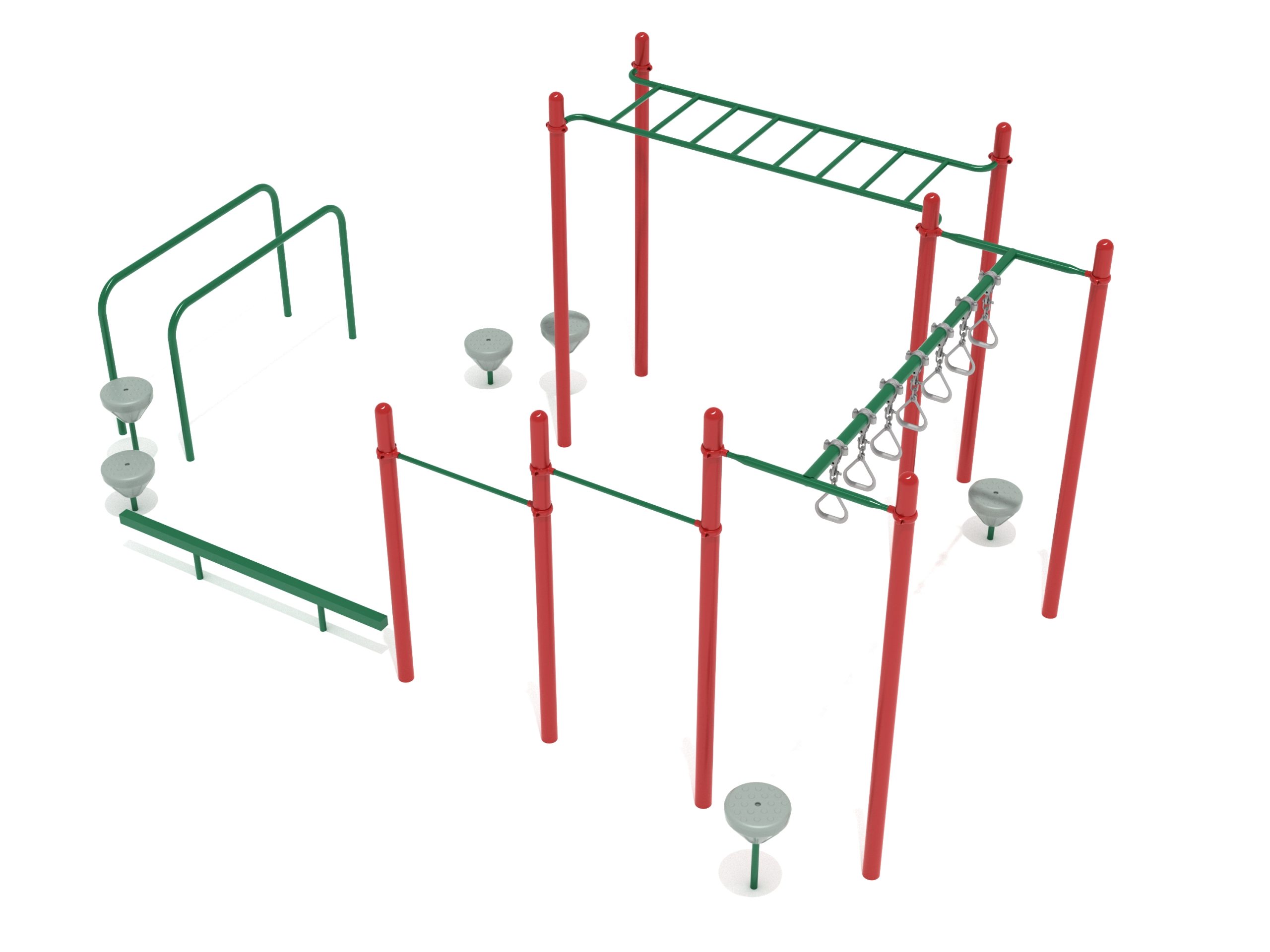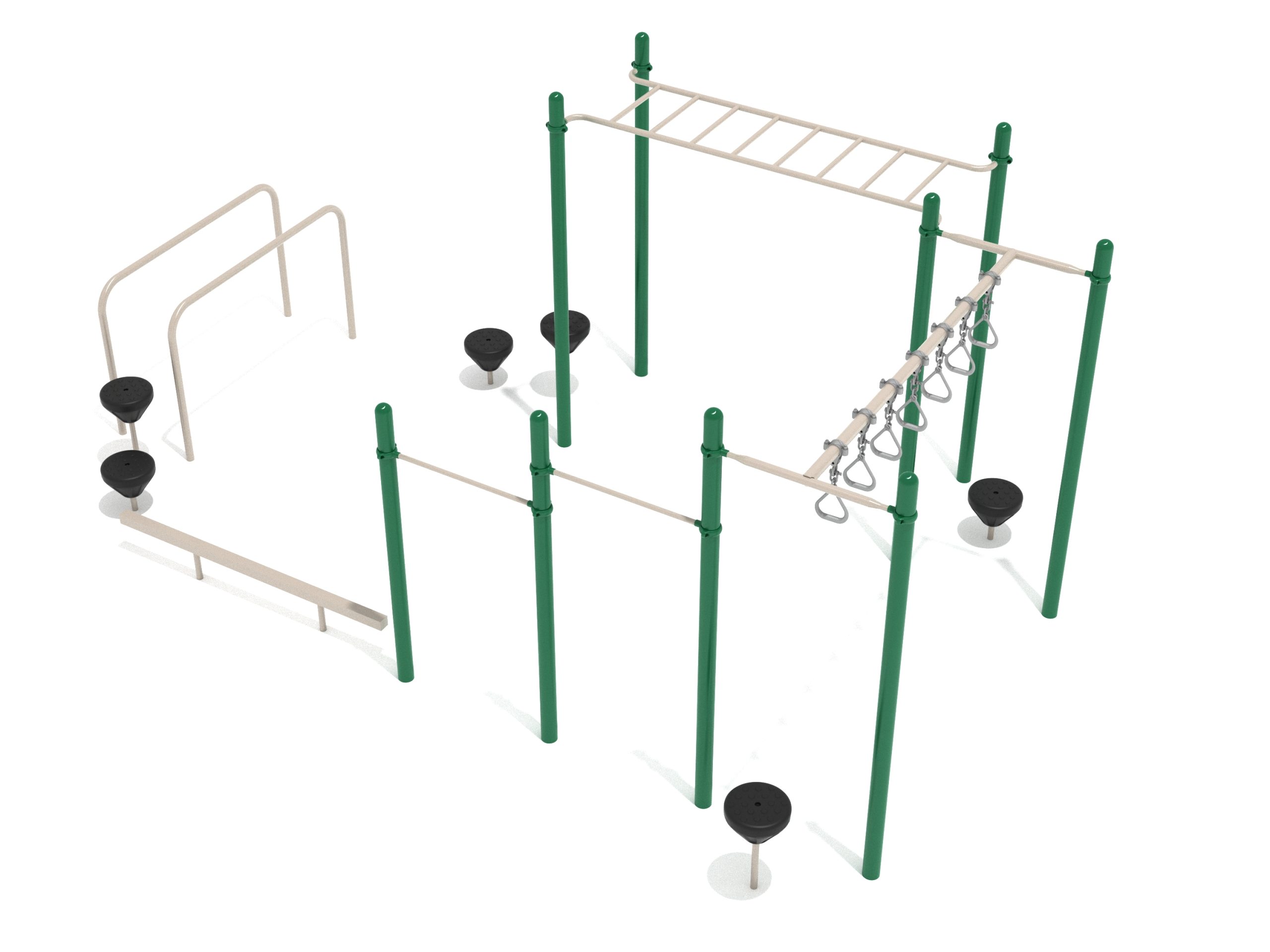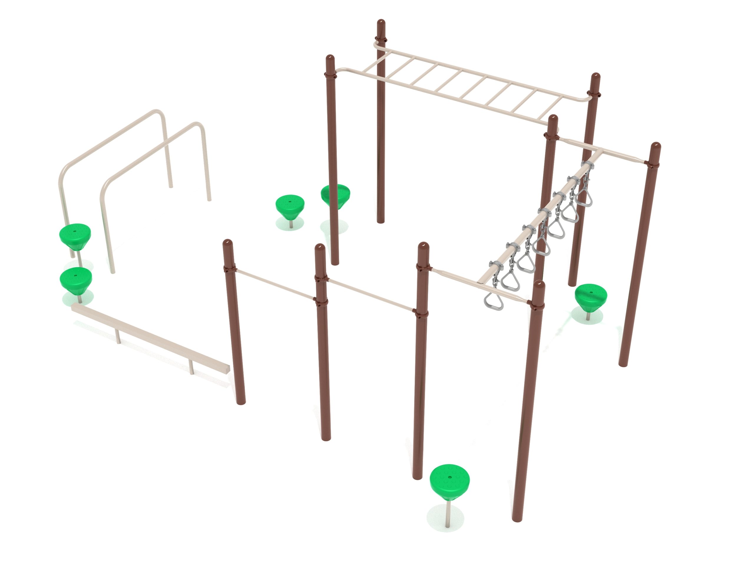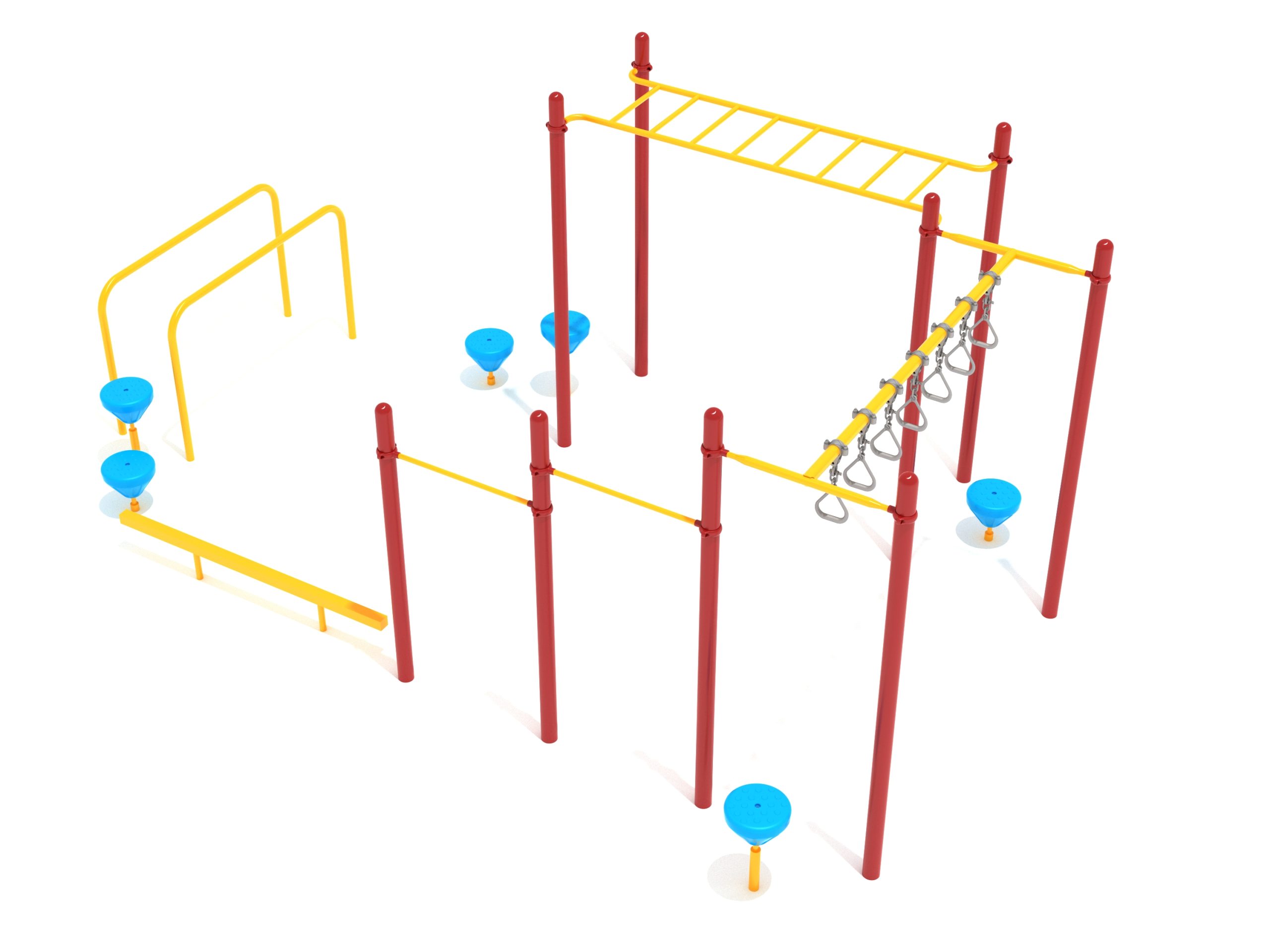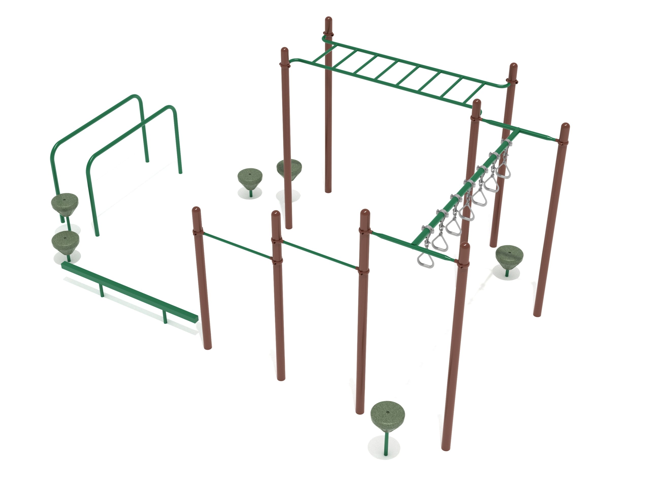 Alpharetta is less of a play system and more of a calisthenics course but for kids, of course. It has almost everything a kid needs to build their upper body strength. The course starts with two Parallel Bars that kids can use to practice headstands or work on their balance and coordination. Towards the end of the bars, kids can step on the Pebble Climber to reach the Balance beam. They can walk over it while maintaining their balance and eventually lead towards 2 Pull Up Bars of different heights. Kids can choose which Pull Up bar to use based on their height. Then comes the most challenging part of this course, the Overhead Staright Swinging Ring Ladder. Kids can think of themselves as commandos and swing their way across it to the Overhead Horizontal Ladder. They can rest for a little while and re-gather their energy to conquer this ladder and complete the course.