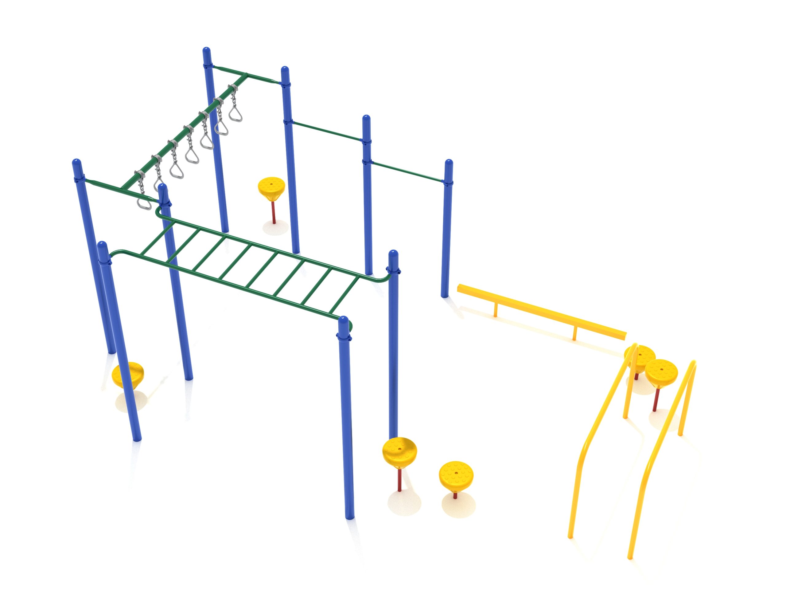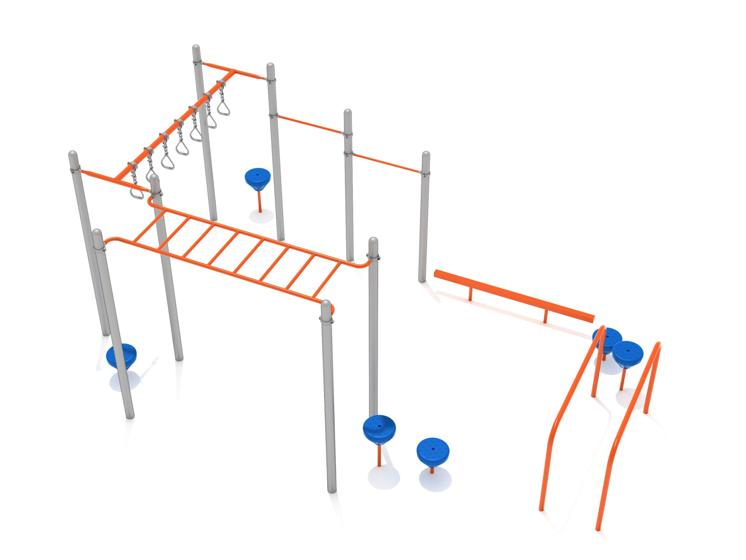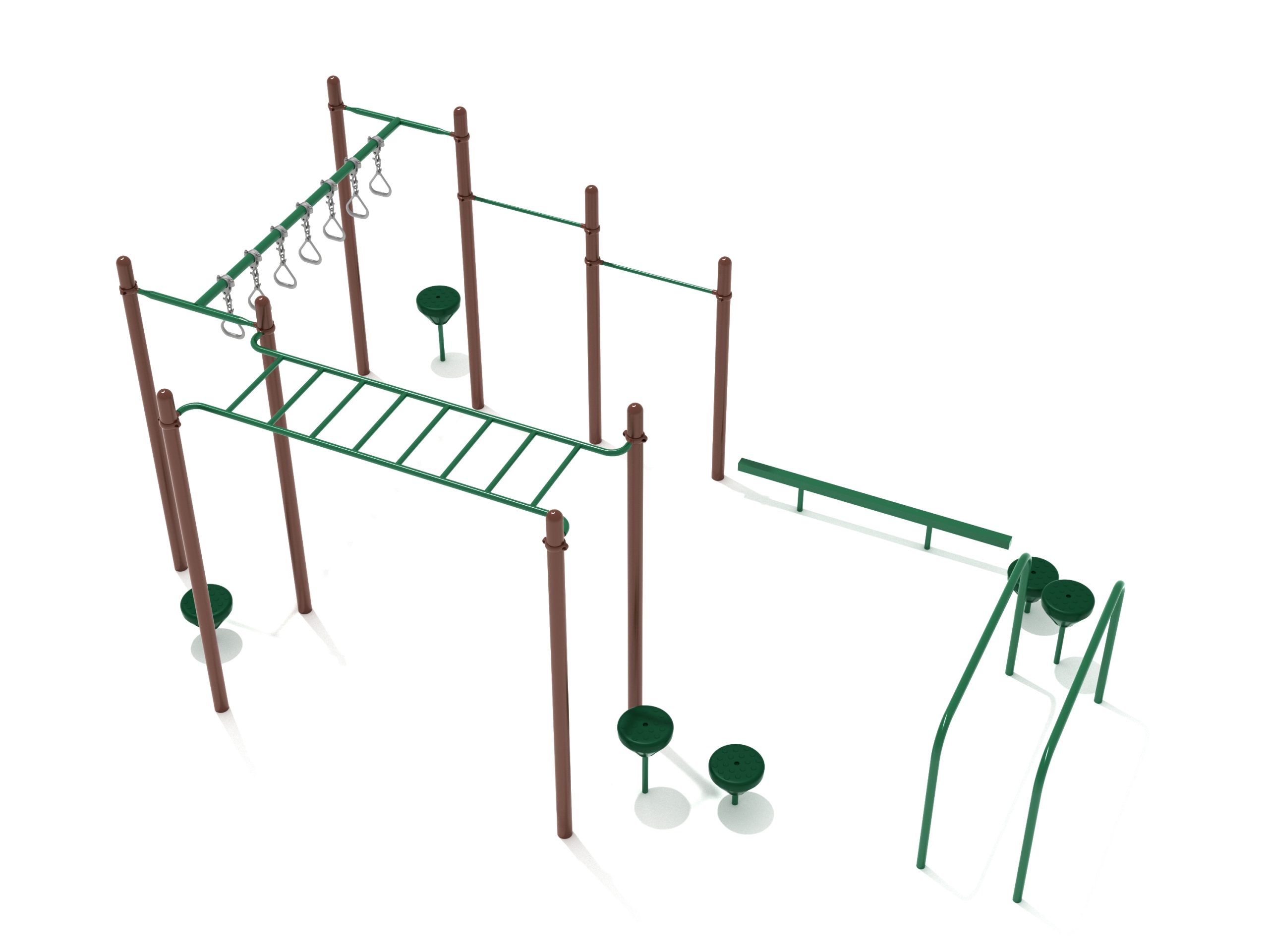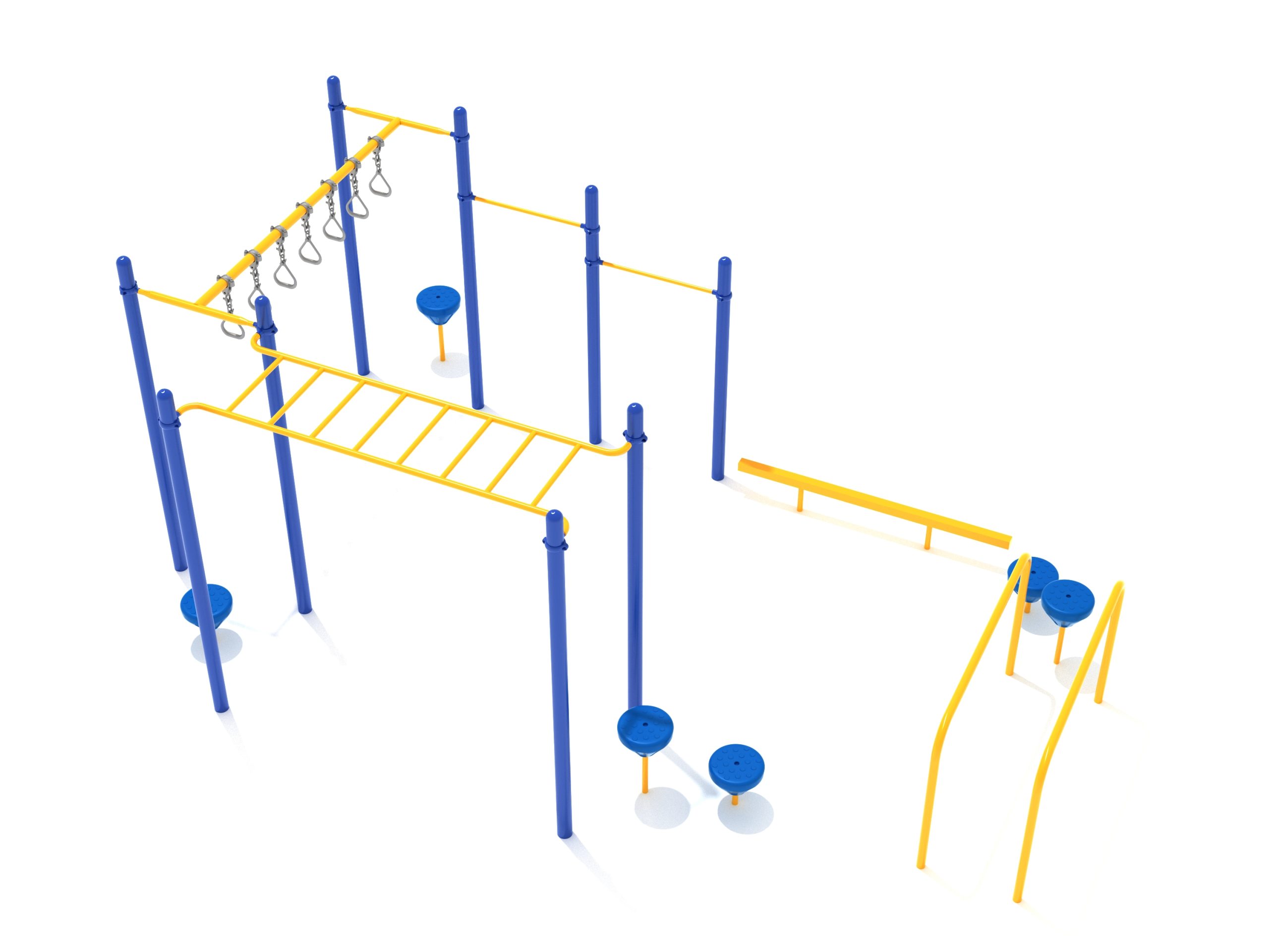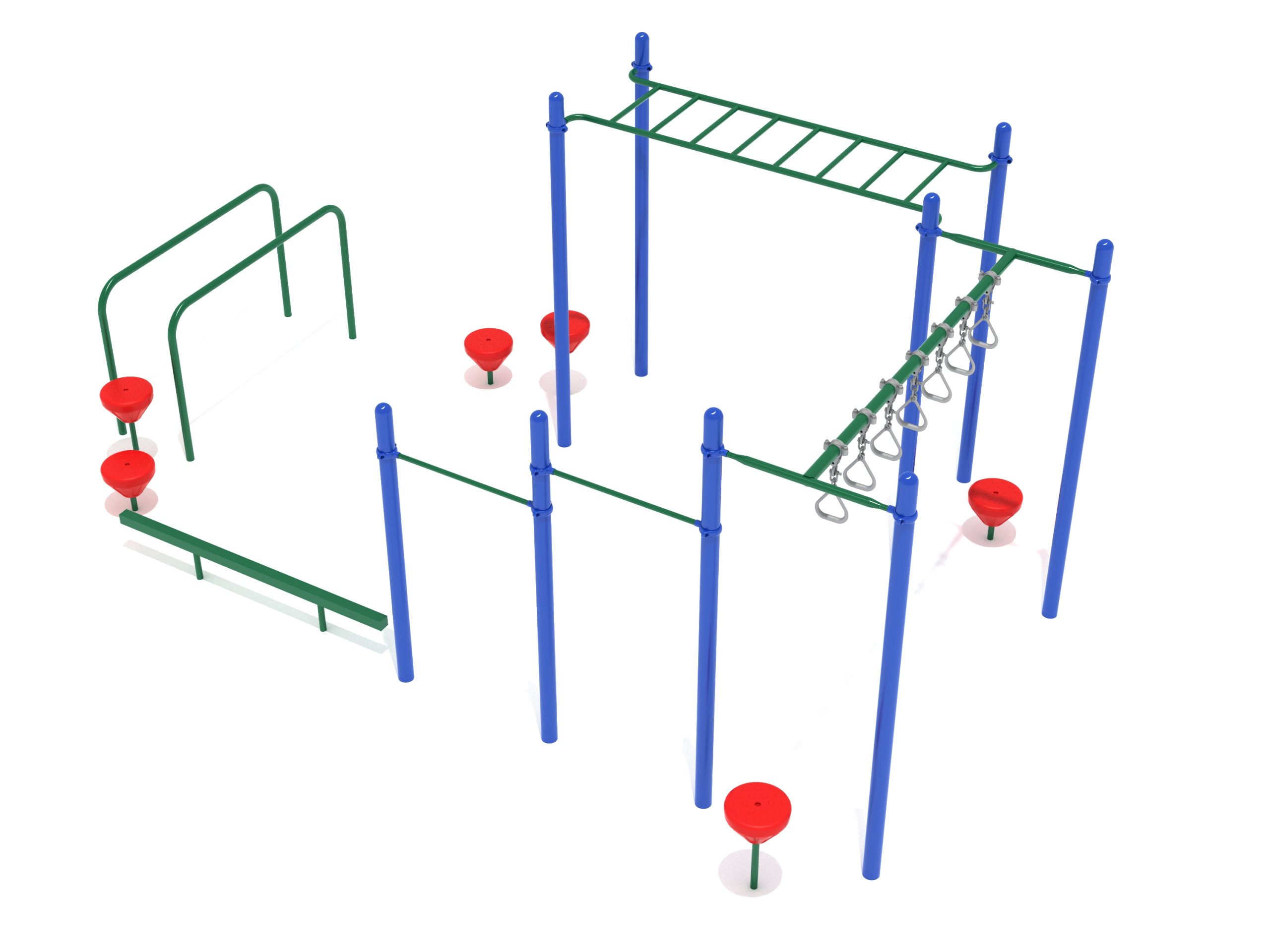 Alpharetta is less of a play system and more of a calisthenics course but for kids, of course. It has almost everything a kid needs to build their upper body strength. The course starts with two Parallel Bars that kids can use to practice headstands or work on their balance and coordination. Towards the end of the bars, kids can step on the Pebble Climber to reach the Balance beam. They can walk over it while maintaining their balance and eventually lead towards 2 Pull Up Bars of different heights. Kids can choose which Pull Up bar to use based on their height. Then comes the most challenging part of this course, the Overhead Staright Swinging Ring Ladder. Kids can think of themselves as commandos and swing their way across it to the Overhead Horizontal Ladder. They can rest for a little while and re-gather their energy to conquer this ladder and complete the course.