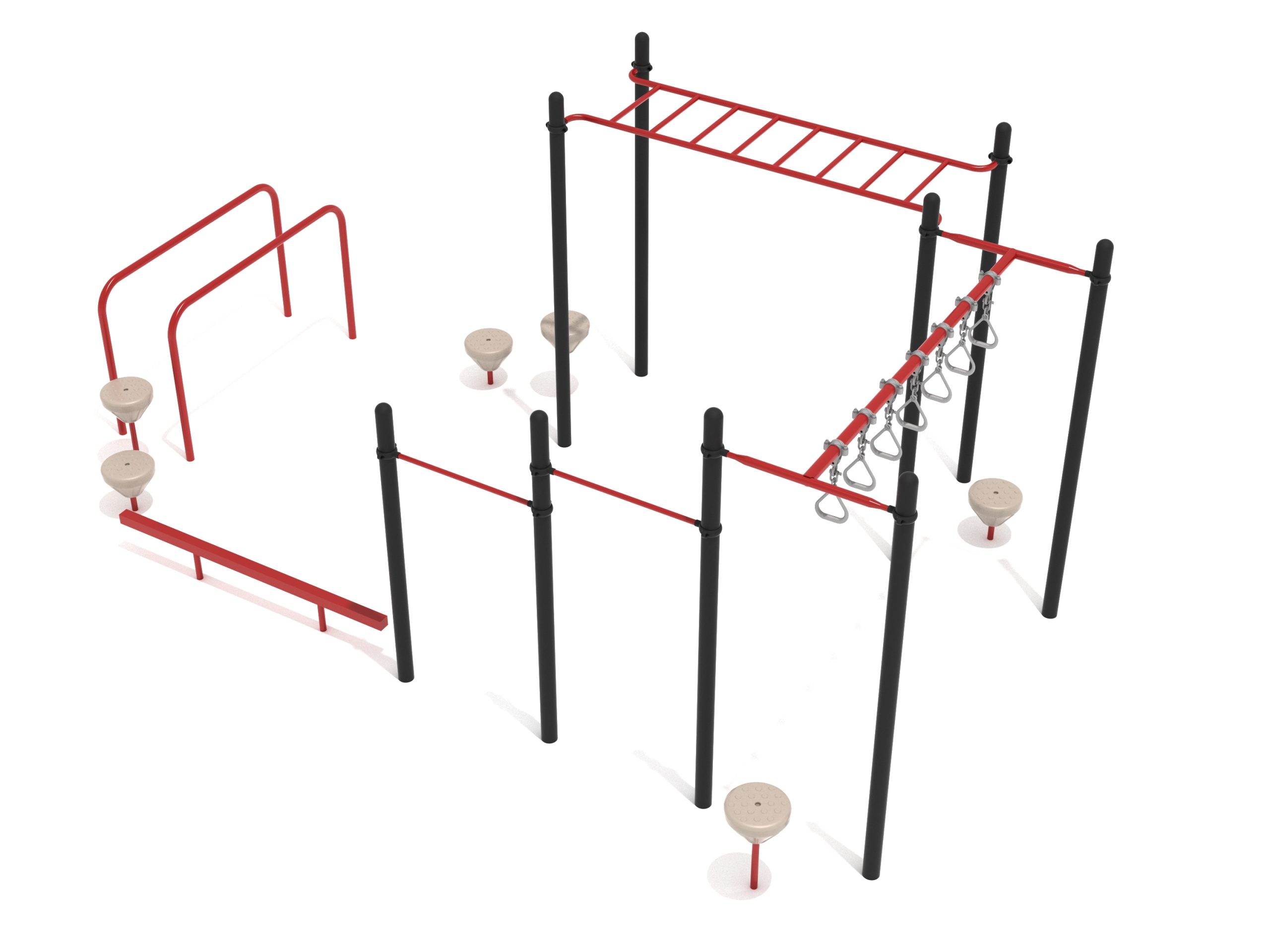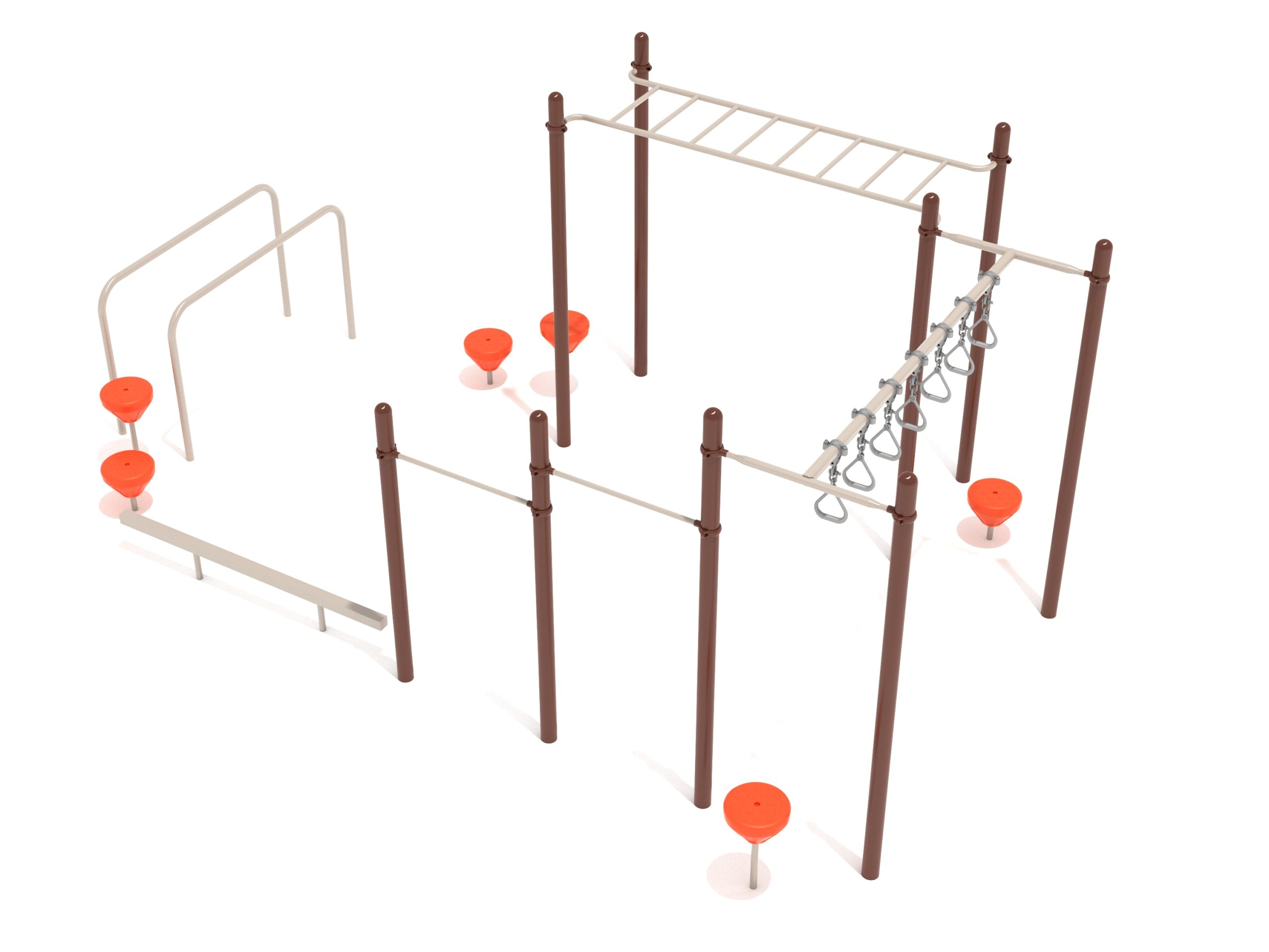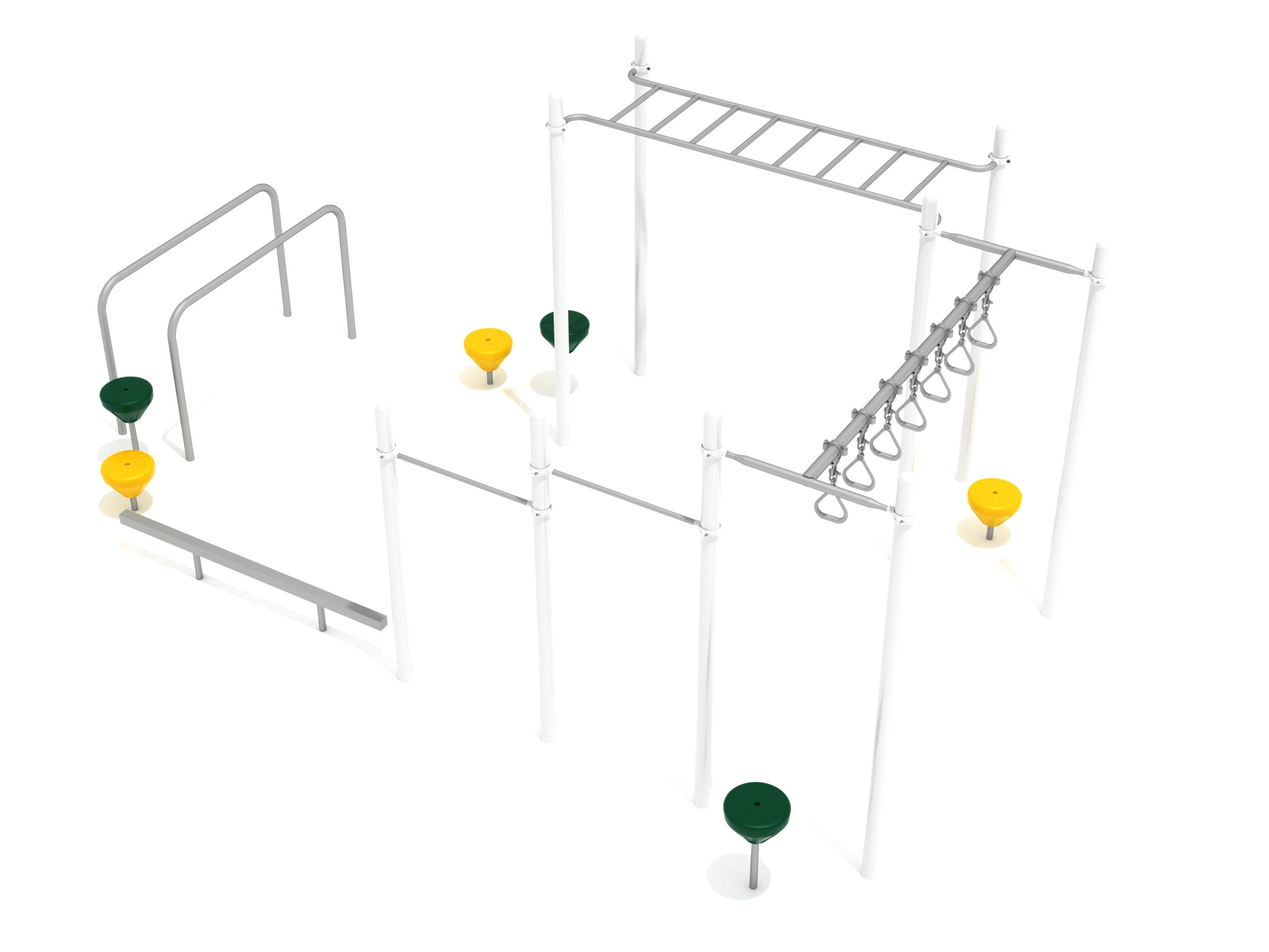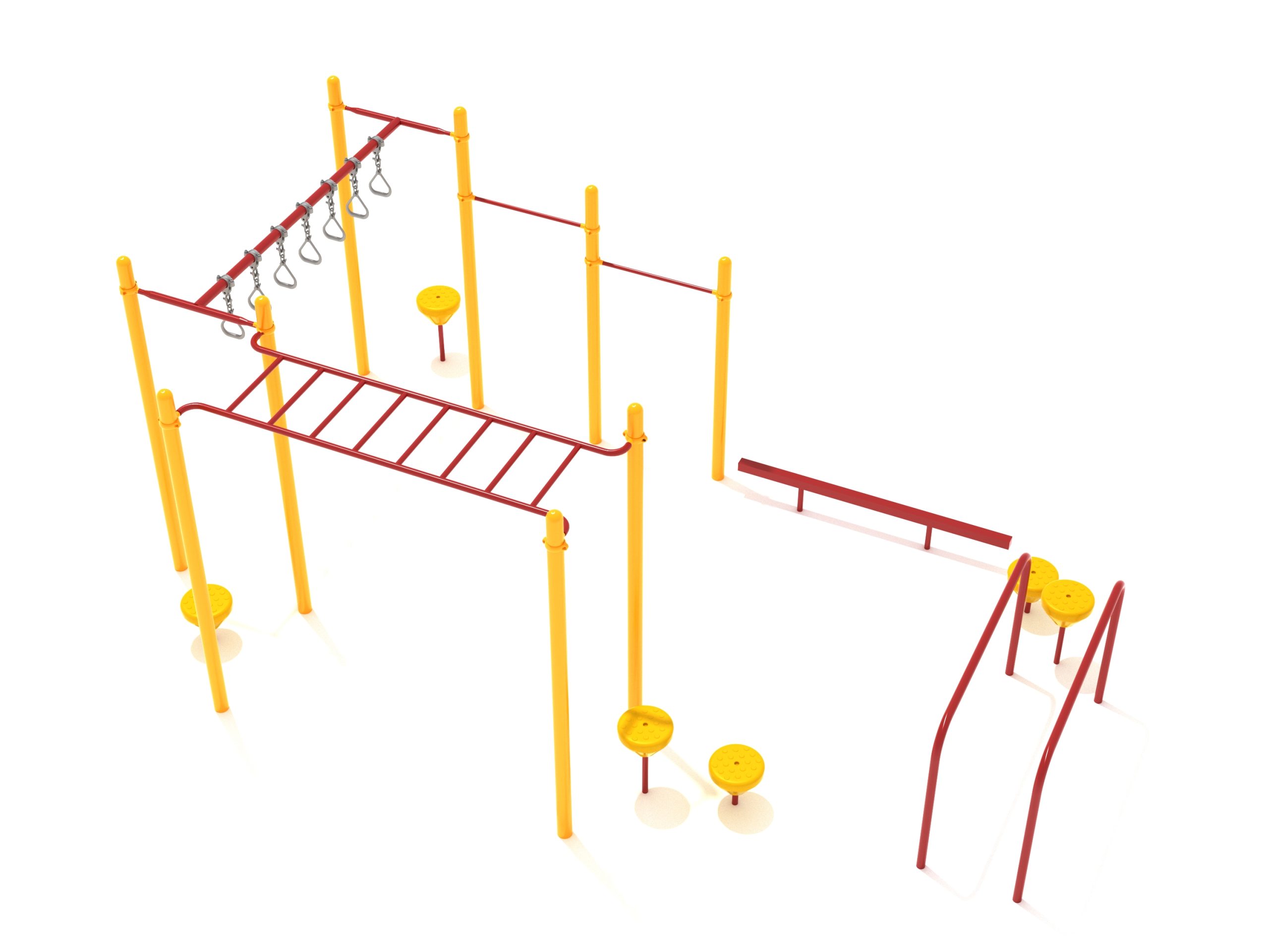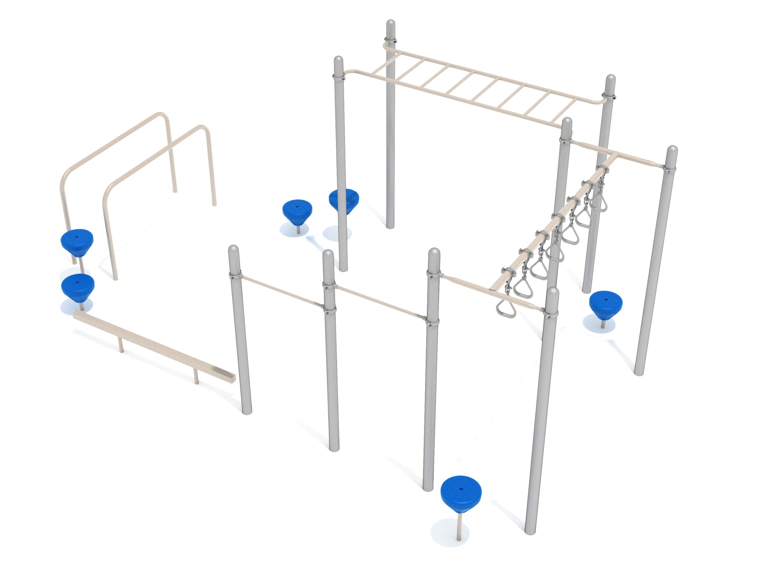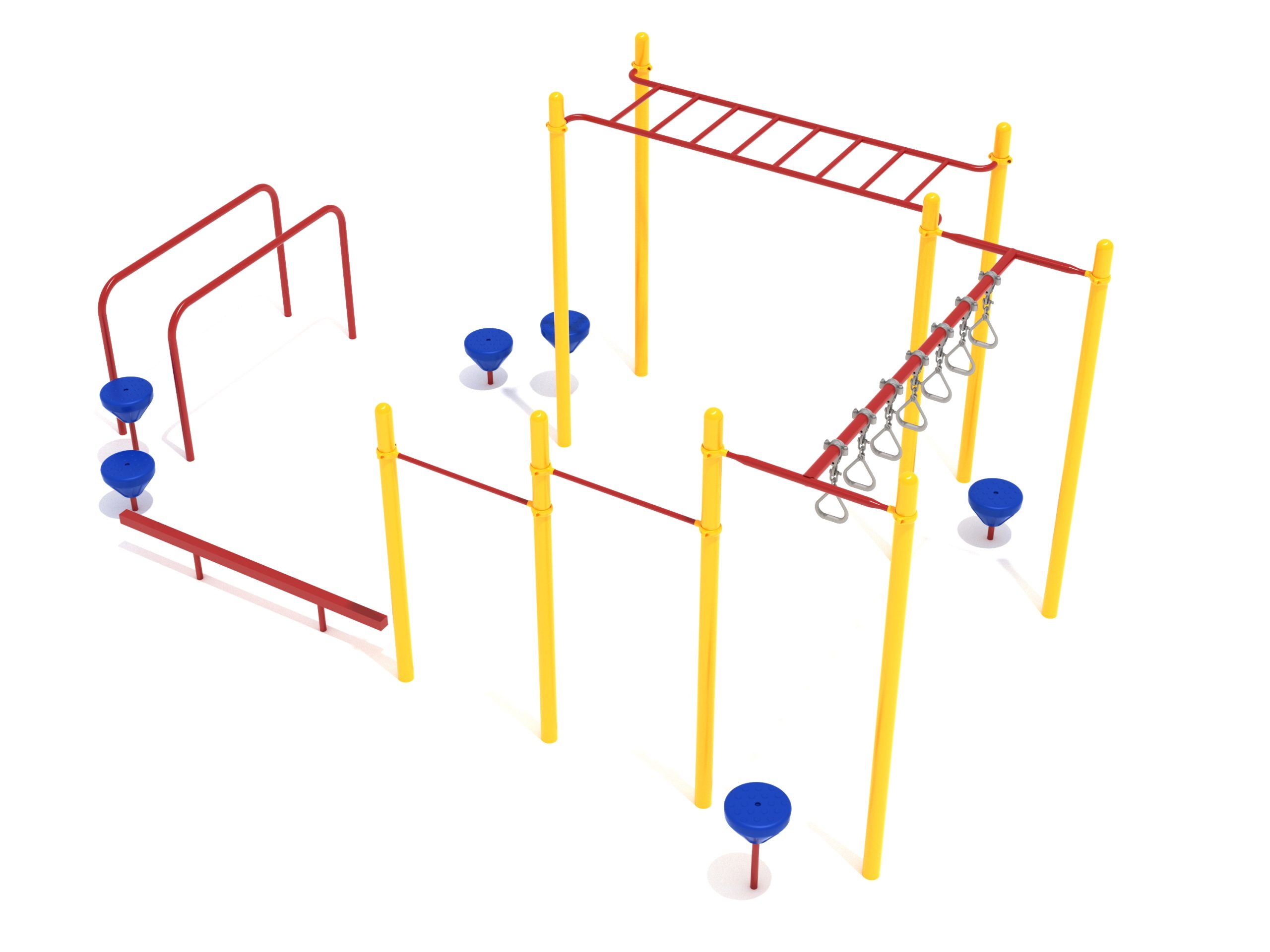 Alpharetta is less of a play system and more of a calisthenics course but for kids, of course. It has almost everything a kid needs to build their upper body strength. The course starts with two Parallel Bars that kids can use to practice headstands or work on their balance and coordination. Towards the end of the bars, kids can step on the Pebble Climber to reach the Balance beam. They can walk over it while maintaining their balance and eventually lead towards 2 Pull Up Bars of different heights. Kids can choose which Pull Up bar to use based on their height. Then comes the most challenging part of this course, the Overhead Staright Swinging Ring Ladder. Kids can think of themselves as commandos and swing their way across it to the Overhead Horizontal Ladder. They can rest for a little while and re-gather their energy to conquer this ladder and complete the course.