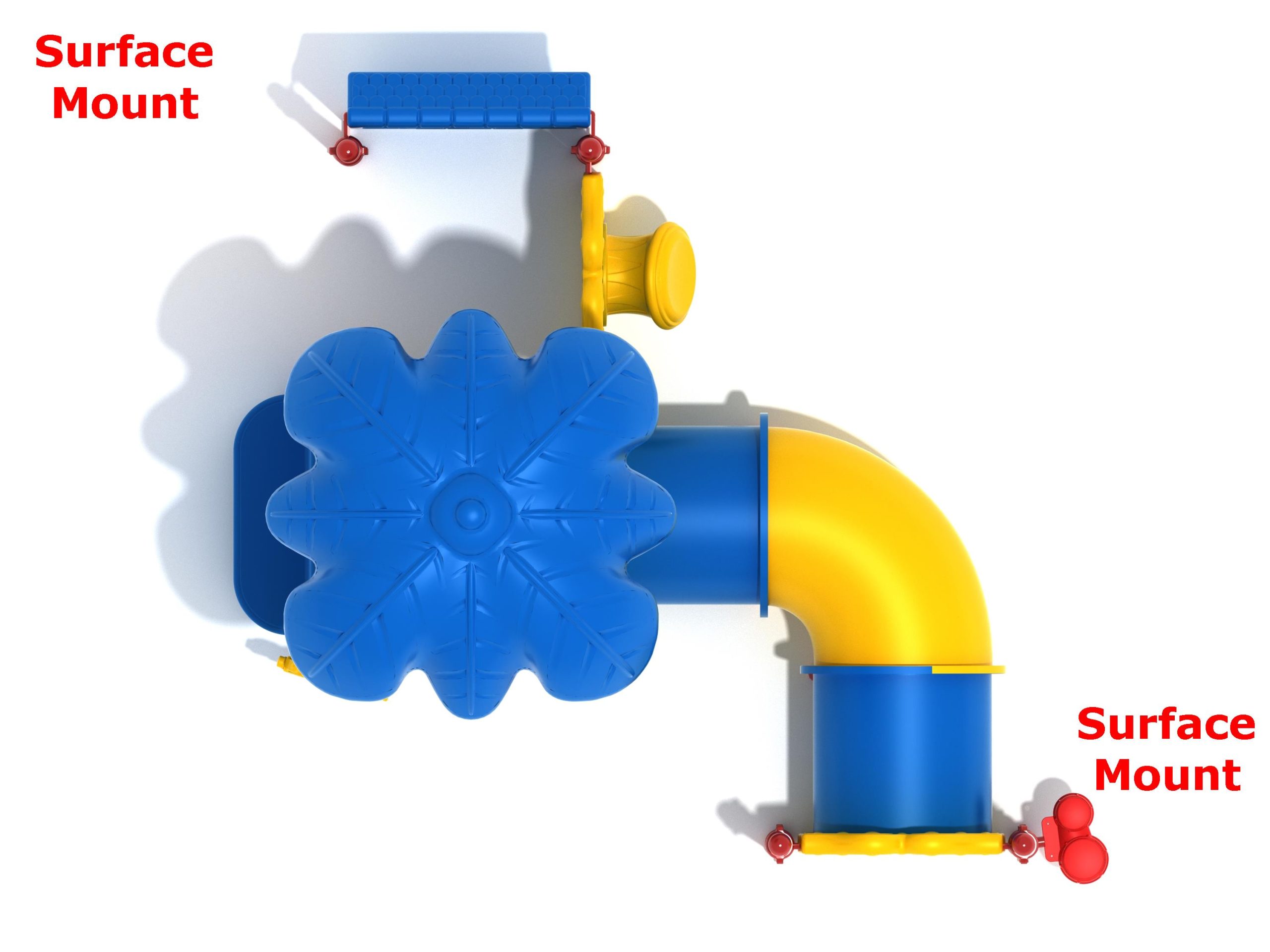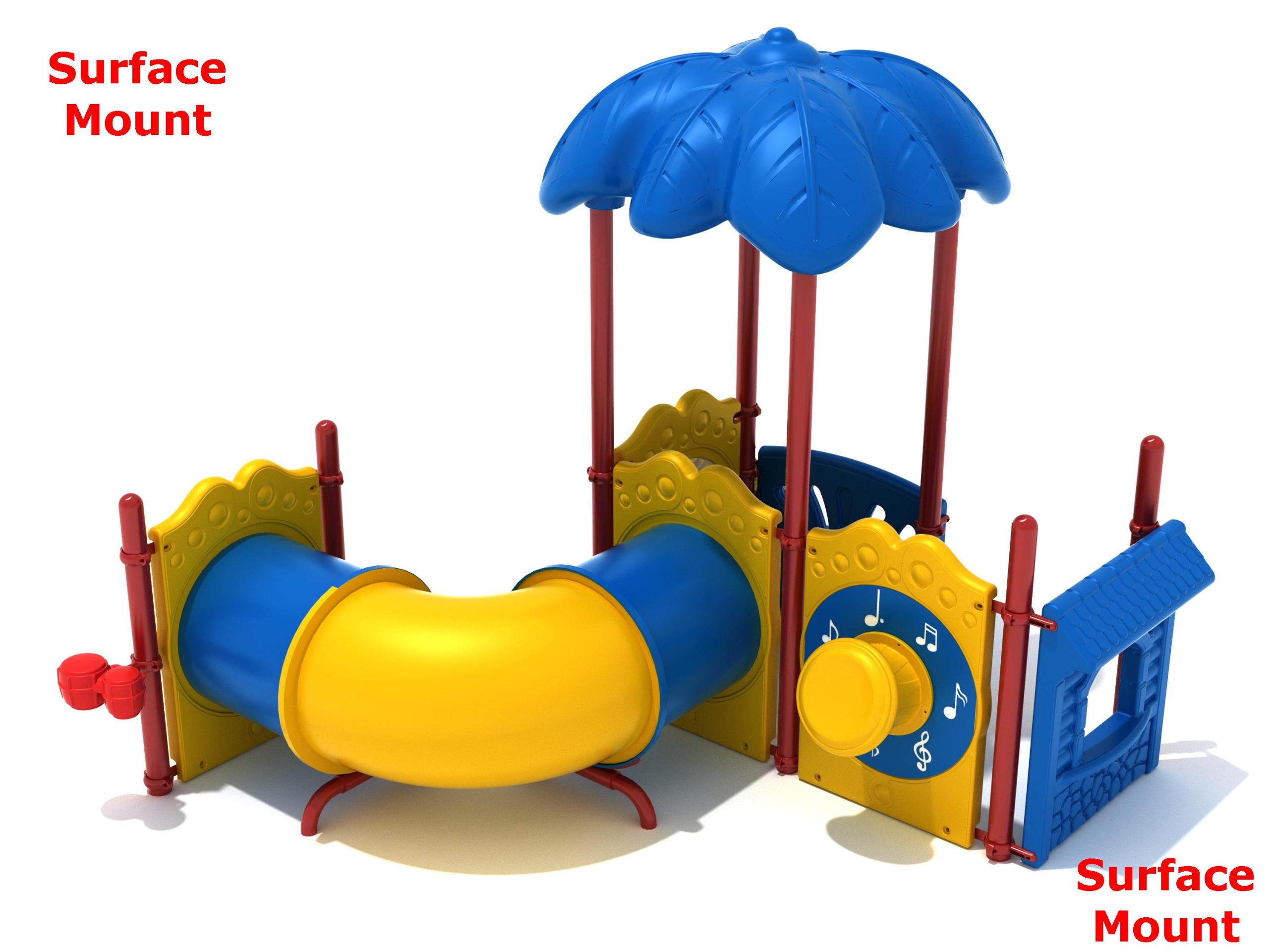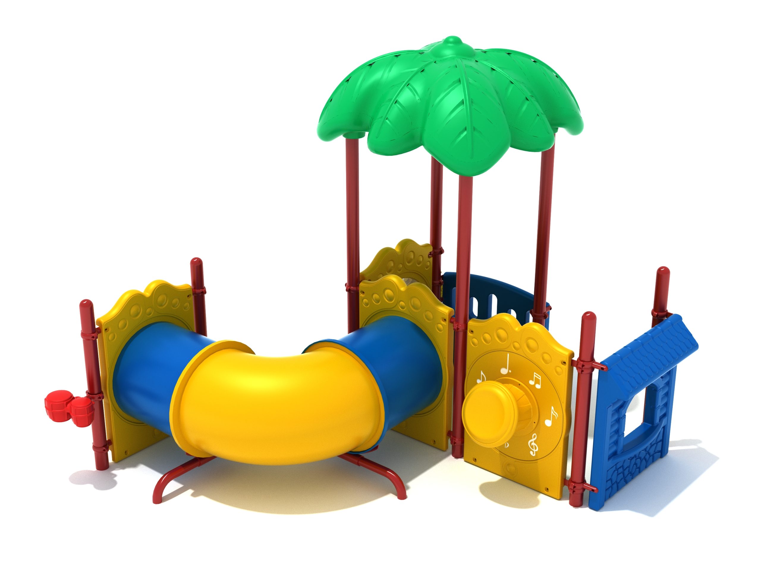 The bold look of the compact designed Asheville play system is sure to draw children in to play. What really stands out when you first see the structure is the large palm leaf roof. This roof not only shades children during play, but it also give the unit a fun, beach feel. Kids will love crawling through the 90 degree crawl tube to end up under the roof. To encourage children to use their imaginations, a ship’s wheel and a storefront panel are included. A drum panel brings music to play time and a bench panel provides a place to sit and relax. The Asheville play structure is designed for children ages 2 to 12 years old and is ADA accessible. When purchasing a structure it is important to not forget about choosing the right safety surfacing for the unit. Loose-fill options and poured rubber surfacing are great choices to help prevent injury during play time.