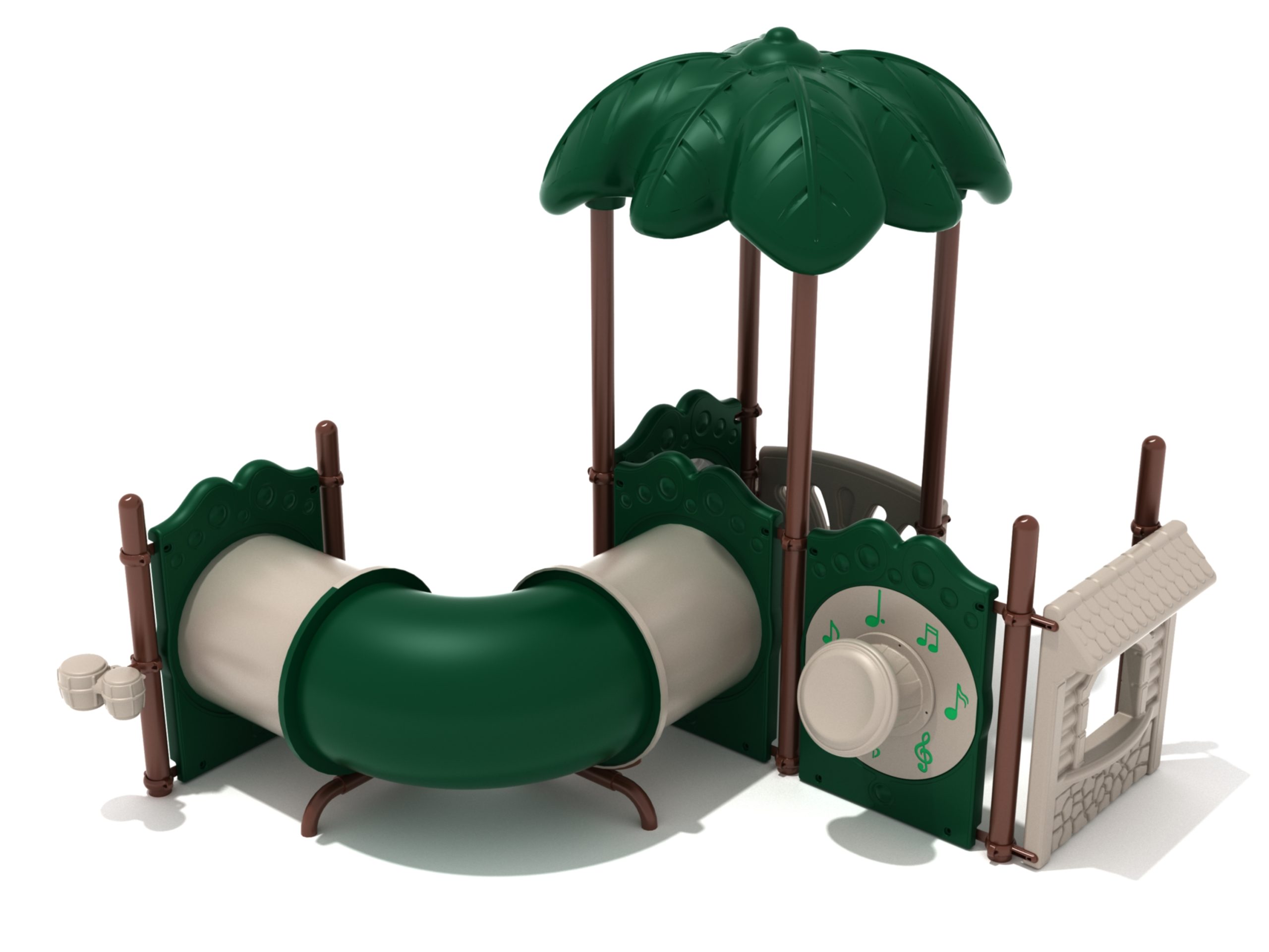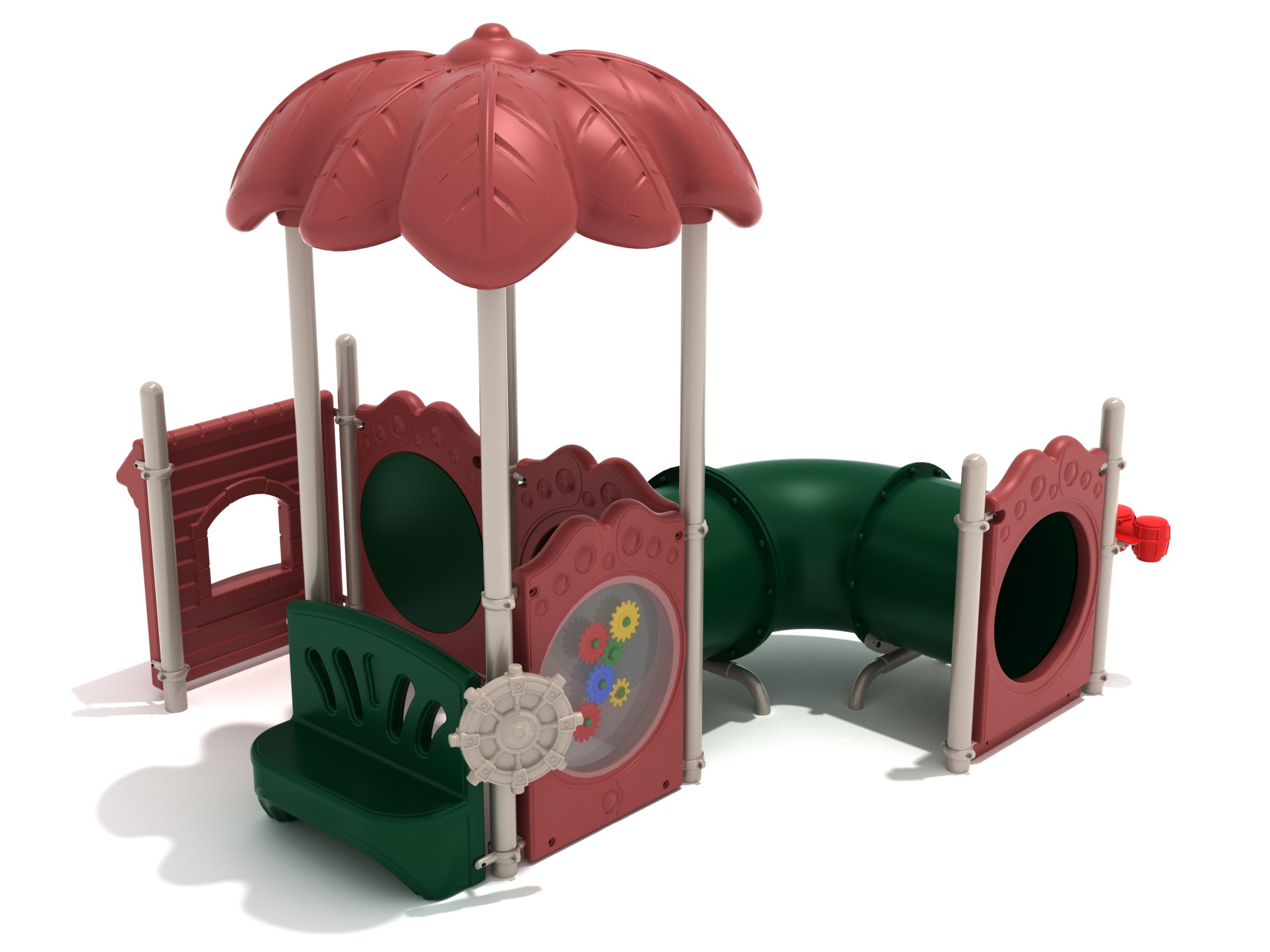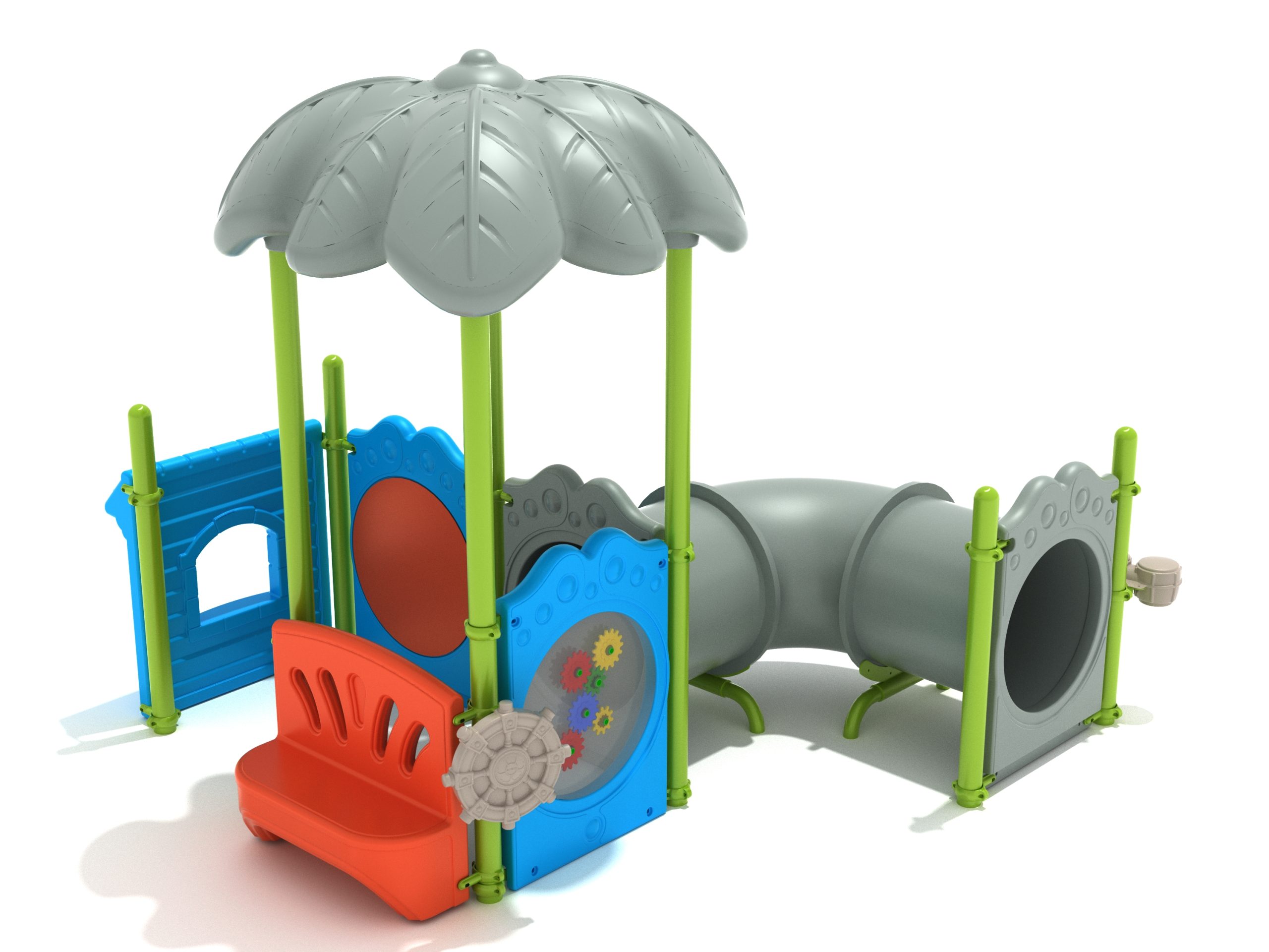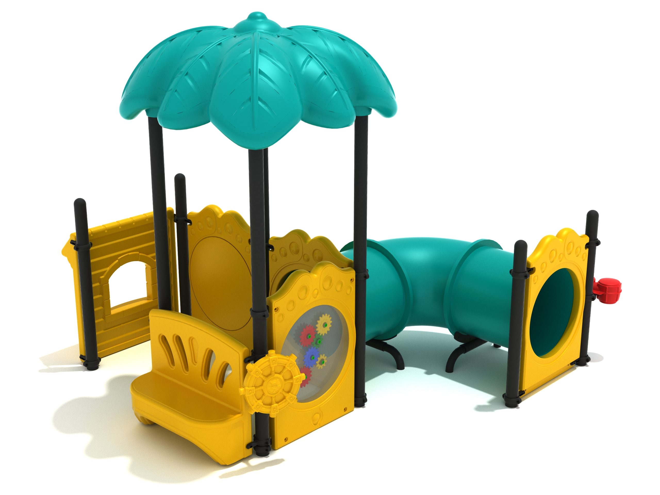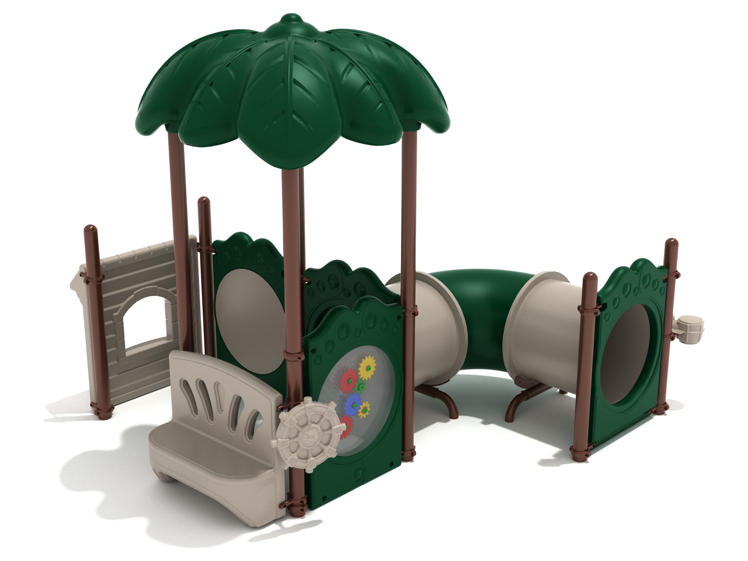 Ideal for daycare centers, preschool environments or even a public park for infants, Asheville has a small footprint with a variety of things to experience. All of the fun takes place beneath a quirky Leaf Roof which not only adds a playful aesthetic but also protects little ones from both sun and rain. There’s a Bench Panel which can be used for reading or just sitting with a friend and developing communication skills, and a Gear Panel to get young minds thinking about mechanisms and problem-solving. The Curved Crawl Tube stirs creative thought as children can crawl through into a cave of treasures or an unexplored wilderness. There are many tactile features to enjoy on the Asheville play set including a set of Bongos which make a distinctive sound and a large Drum Panel which they’ll enjoy banging with their hands. By using the Store Panel children can develop creativity as they buy and sell products, and a Ship’s Wheel carries on the adventure for young and adventurous sailors.