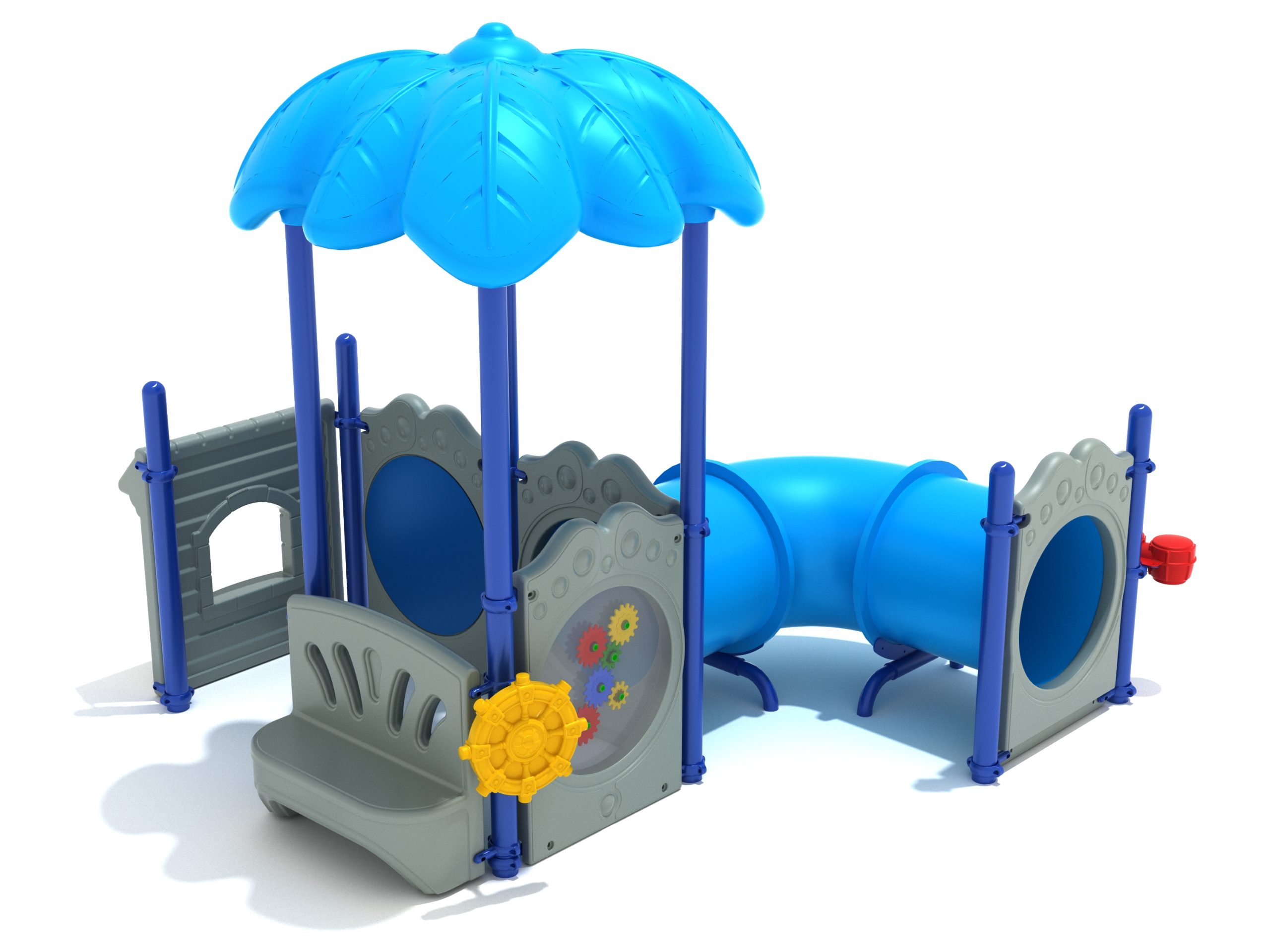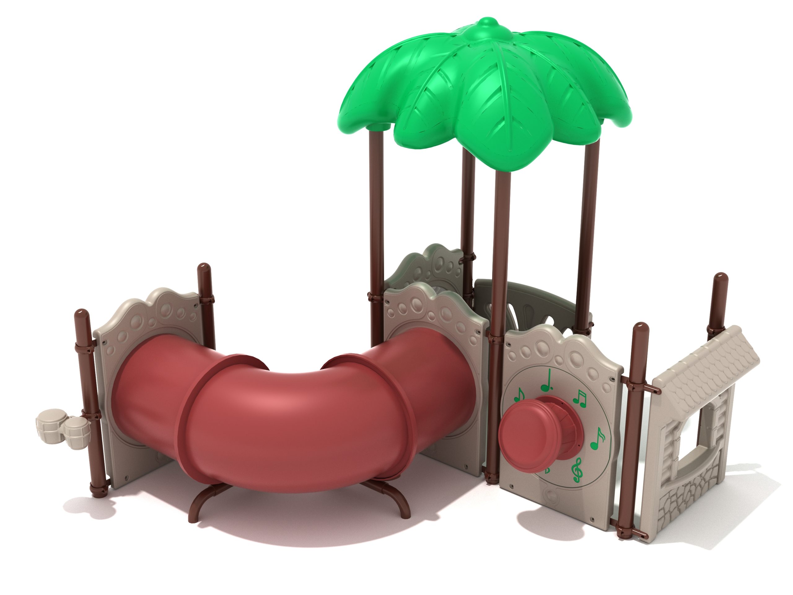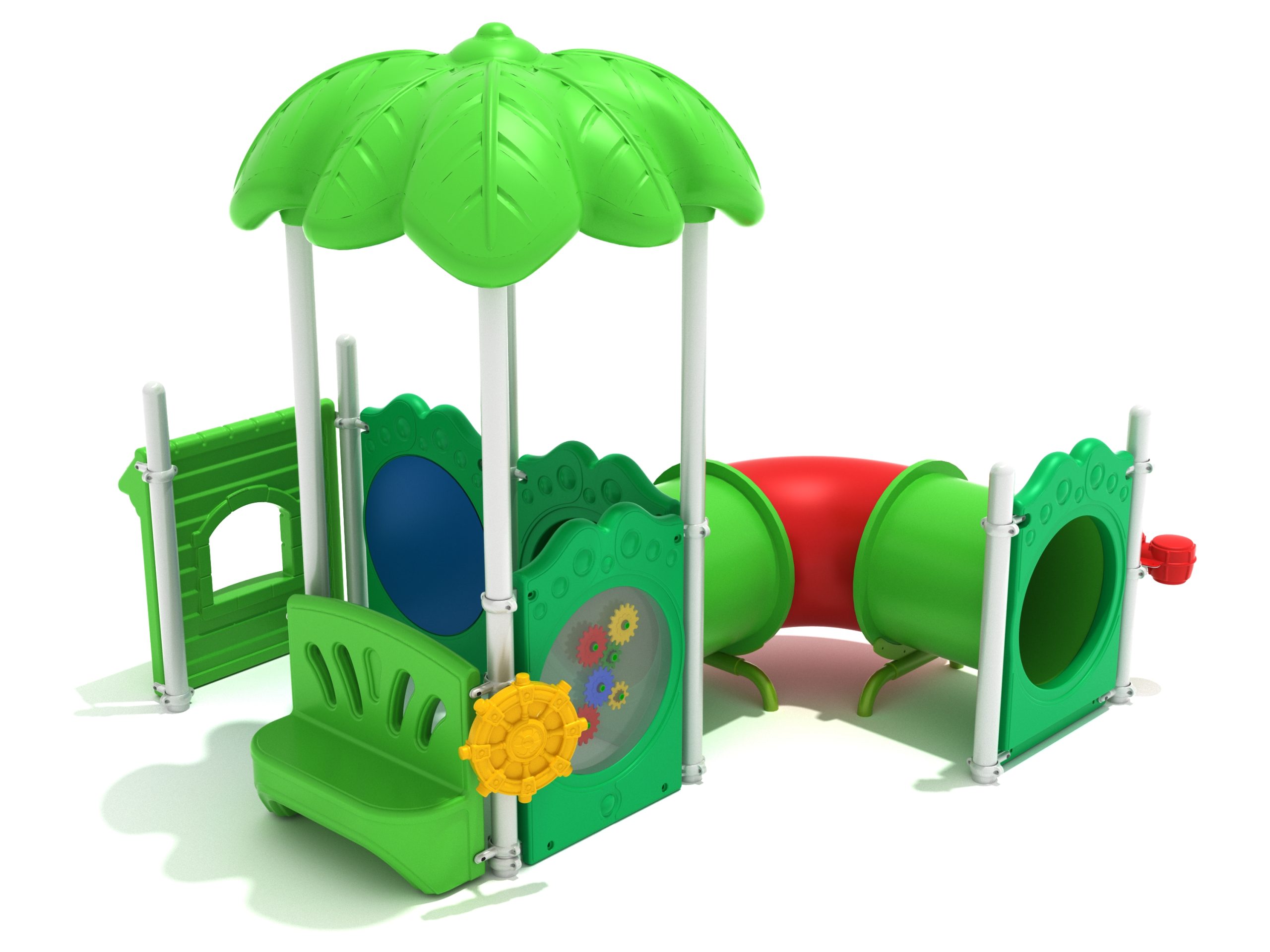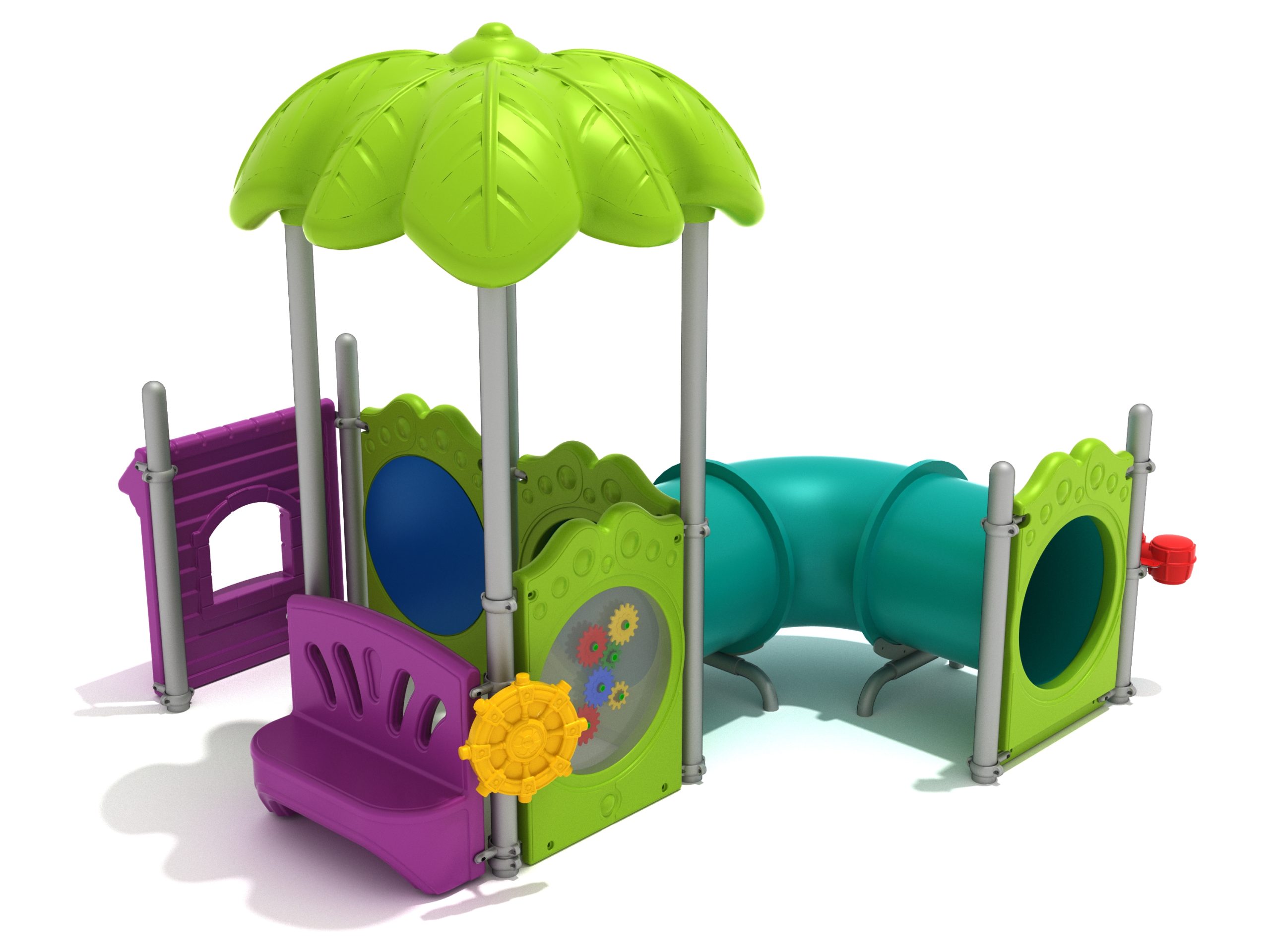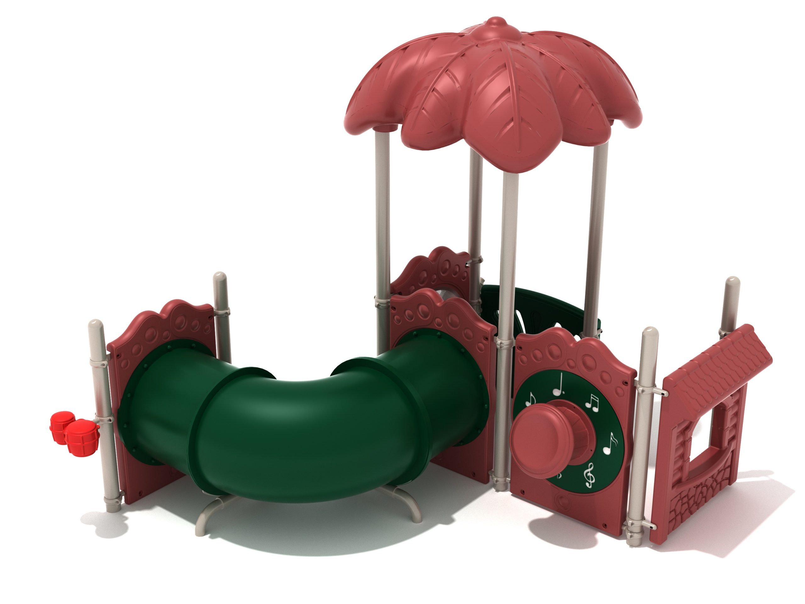 Ideal for daycare centers, preschool environments or even a public park for infants, Asheville has a small footprint with a variety of things to experience. All of the fun takes place beneath a quirky Leaf Roof which not only adds a playful aesthetic but also protects little ones from both sun and rain. There’s a Bench Panel which can be used for reading or just sitting with a friend and developing communication skills, and a Gear Panel to get young minds thinking about mechanisms and problem-solving. The Curved Crawl Tube stirs creative thought as children can crawl through into a cave of treasures or an unexplored wilderness. There are many tactile features to enjoy on the Asheville play set including a set of Bongos which make a distinctive sound and a large Drum Panel which they’ll enjoy banging with their hands. By using the Store Panel children can develop creativity as they buy and sell products, and a Ship’s Wheel carries on the adventure for young and adventurous sailors.