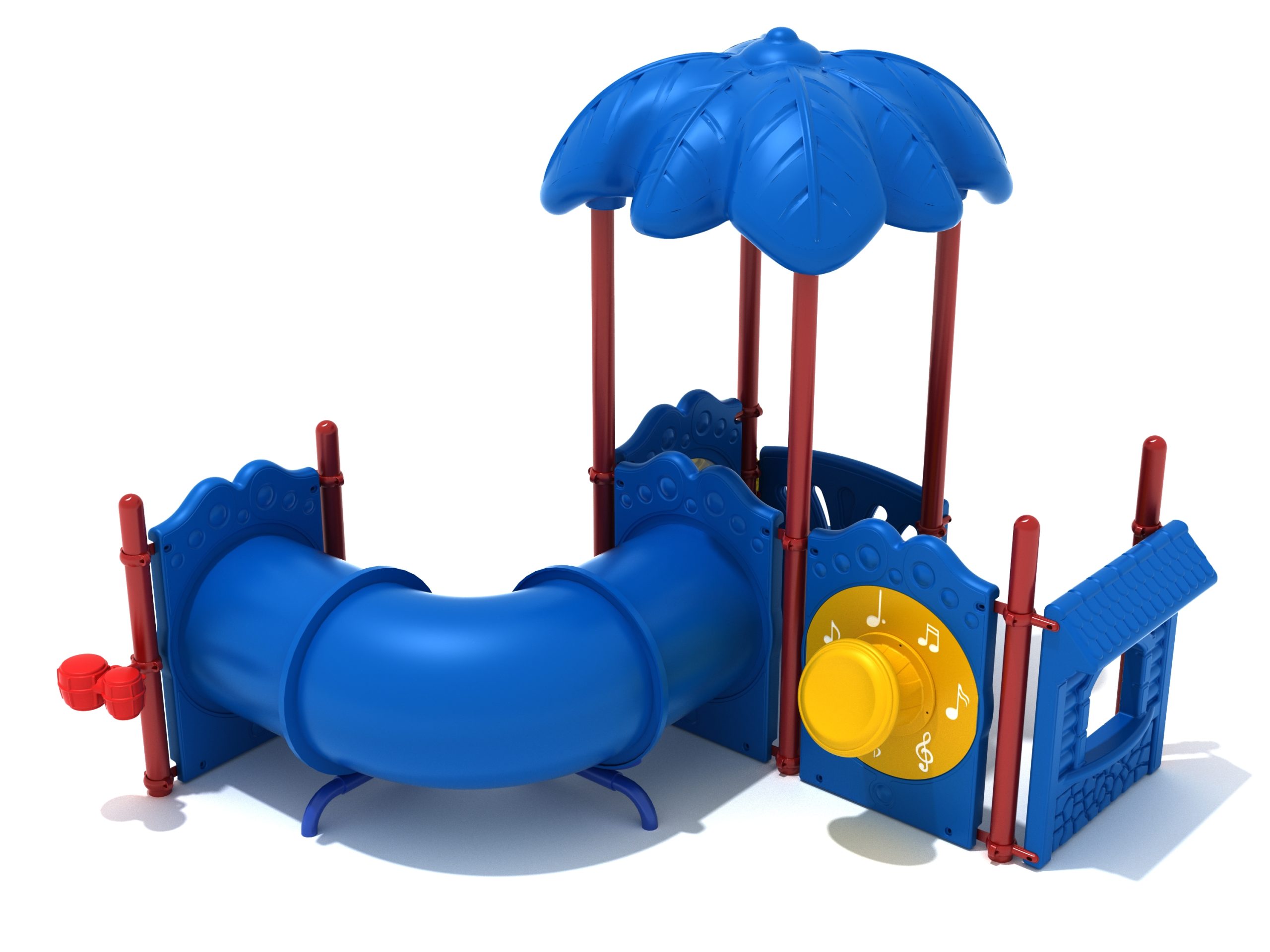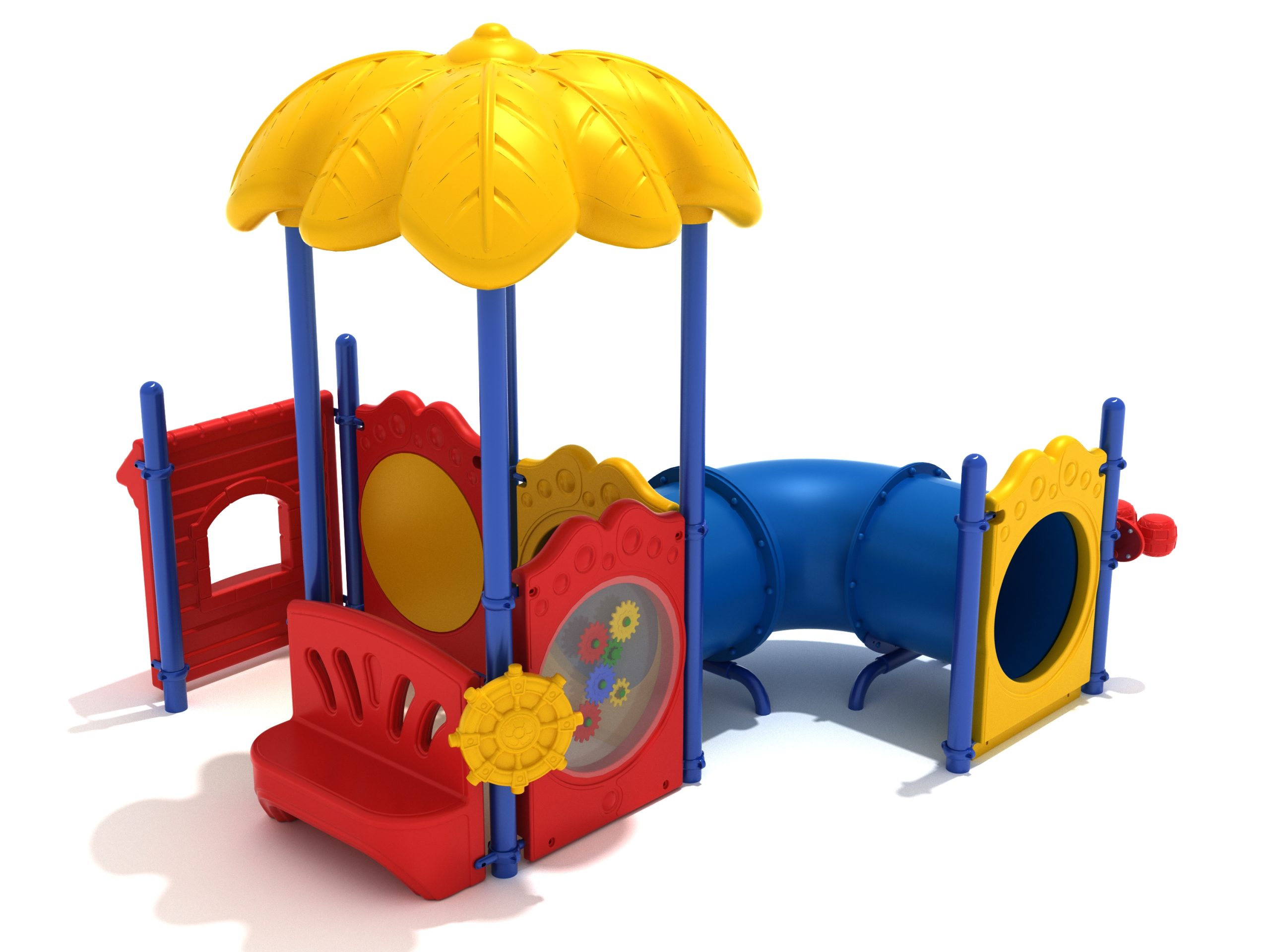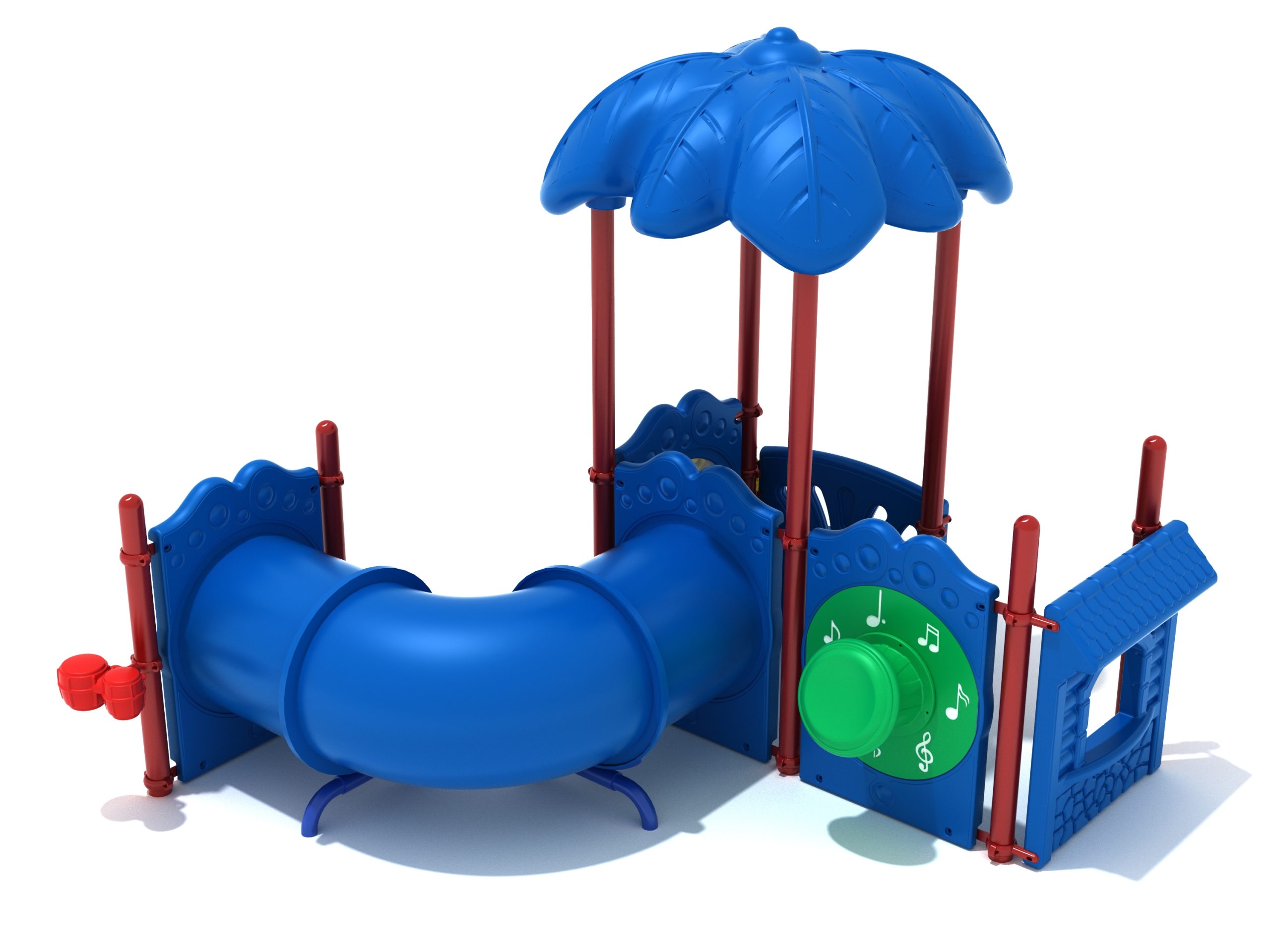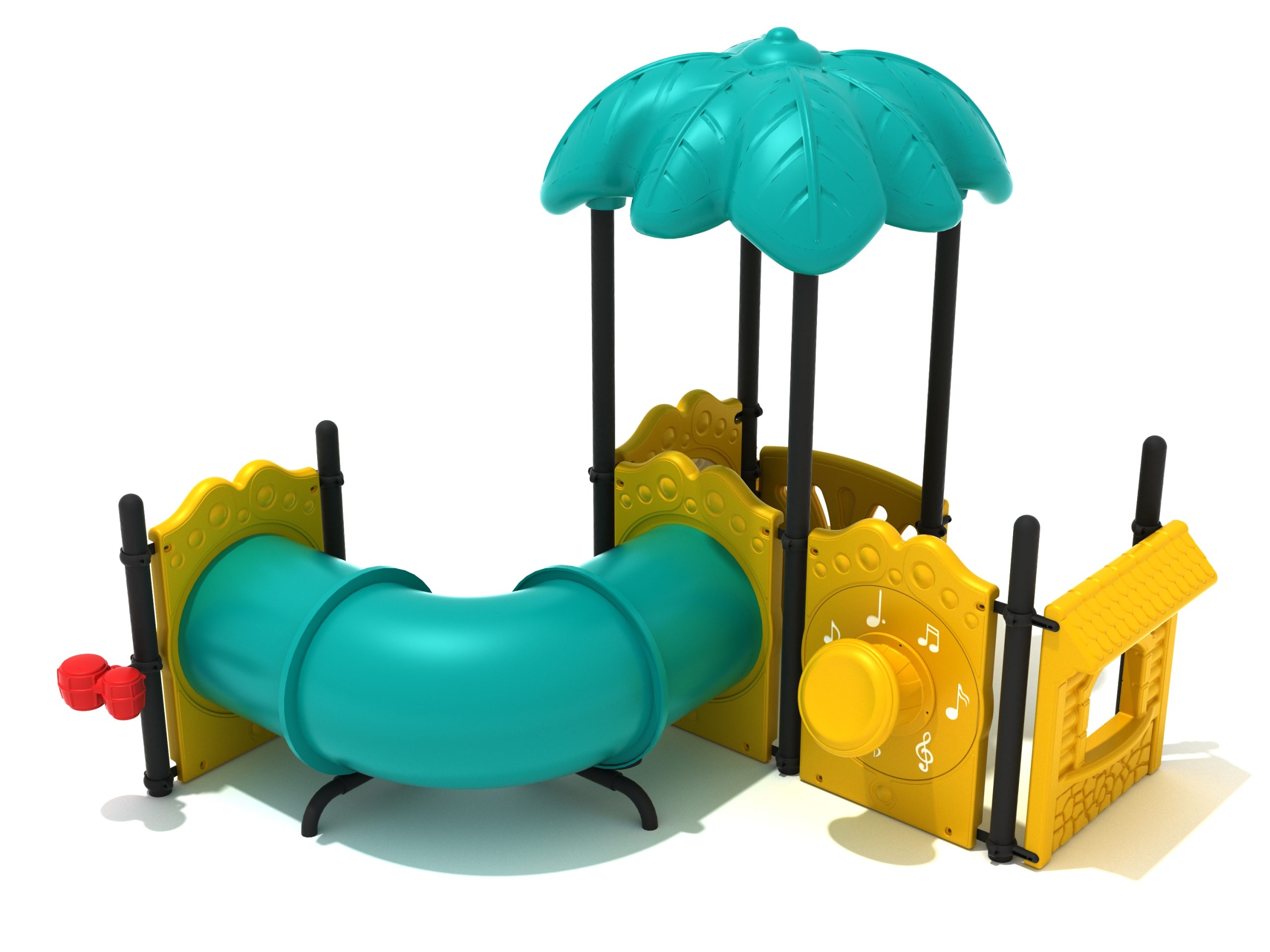 Ideal for daycare centers, preschool environments or even a public park for infants, Asheville has a small footprint with a variety of things to experience. All of the fun takes place beneath a quirky Leaf Roof which not only adds a playful aesthetic but also protects little ones from both sun and rain. There’s a Bench Panel which can be used for reading or just sitting with a friend and developing communication skills, and a Gear Panel to get young minds thinking about mechanisms and problem-solving. The Curved Crawl Tube stirs creative thought as children can crawl through into a cave of treasures or an unexplored wilderness. There are many tactile features to enjoy on the Asheville play set including a set of Bongos which make a distinctive sound and a large Drum Panel which they’ll enjoy banging with their hands. By using the Store Panel children can develop creativity as they buy and sell products, and a Ship’s Wheel carries on the adventure for young and adventurous sailors.