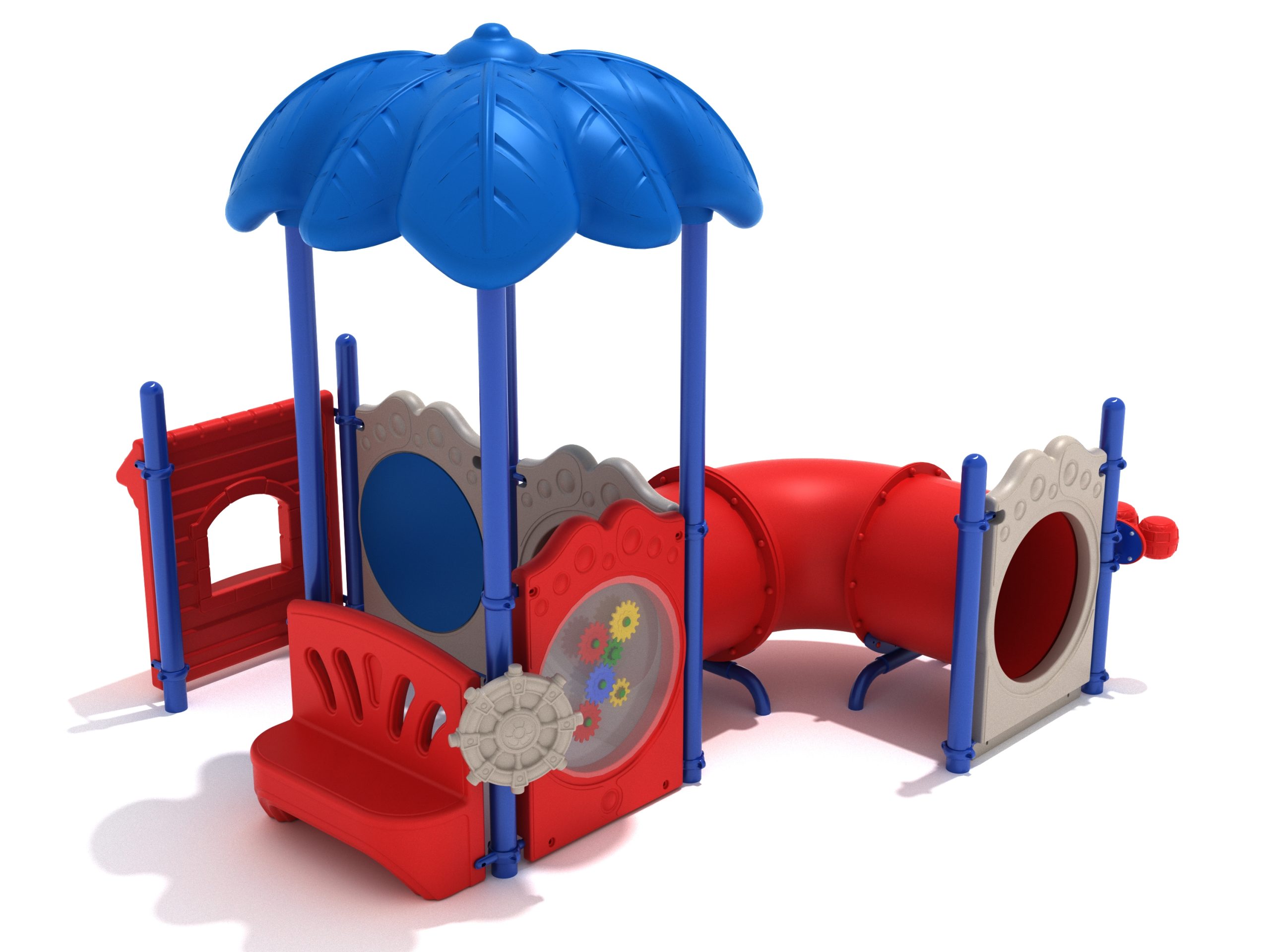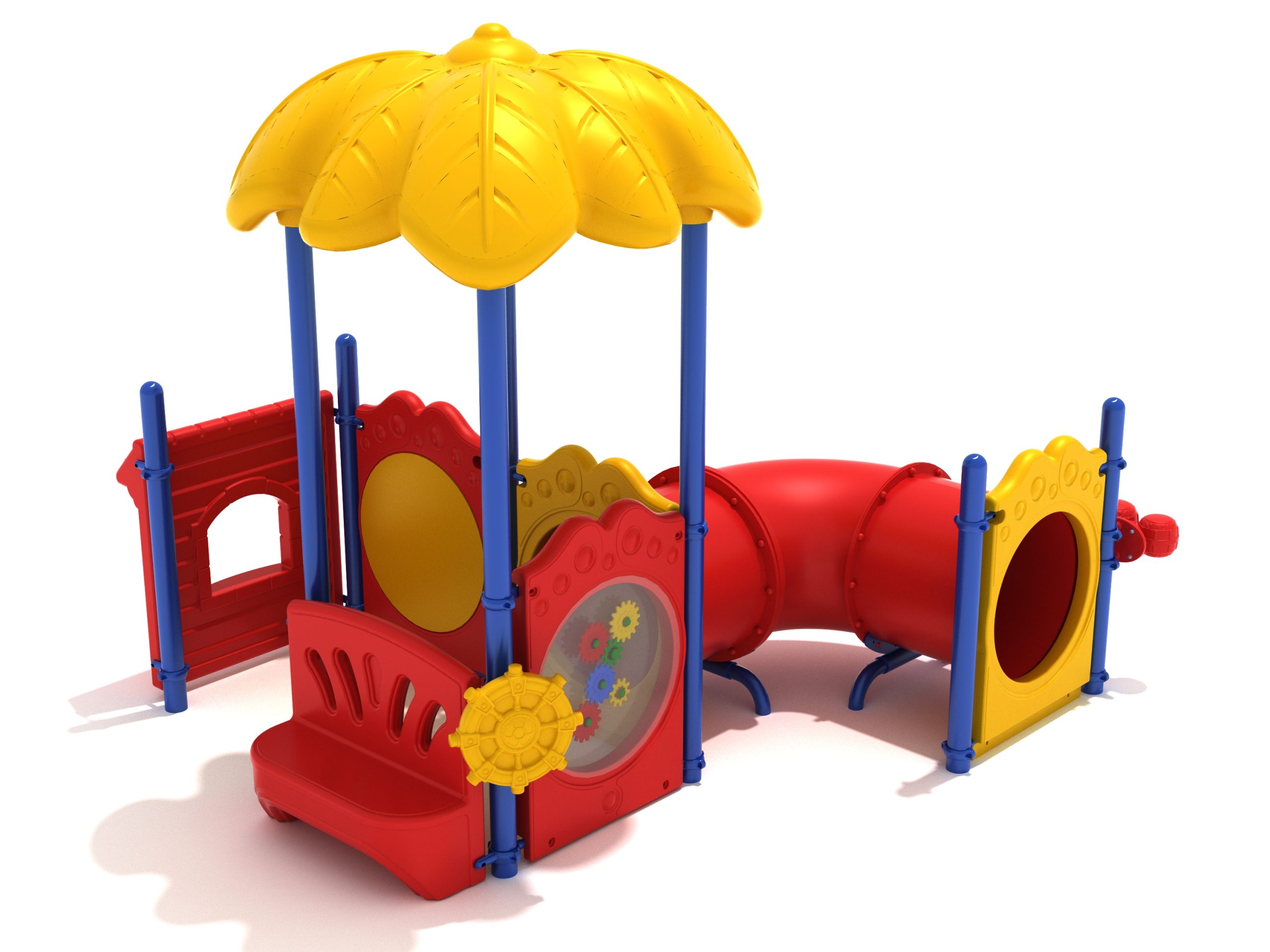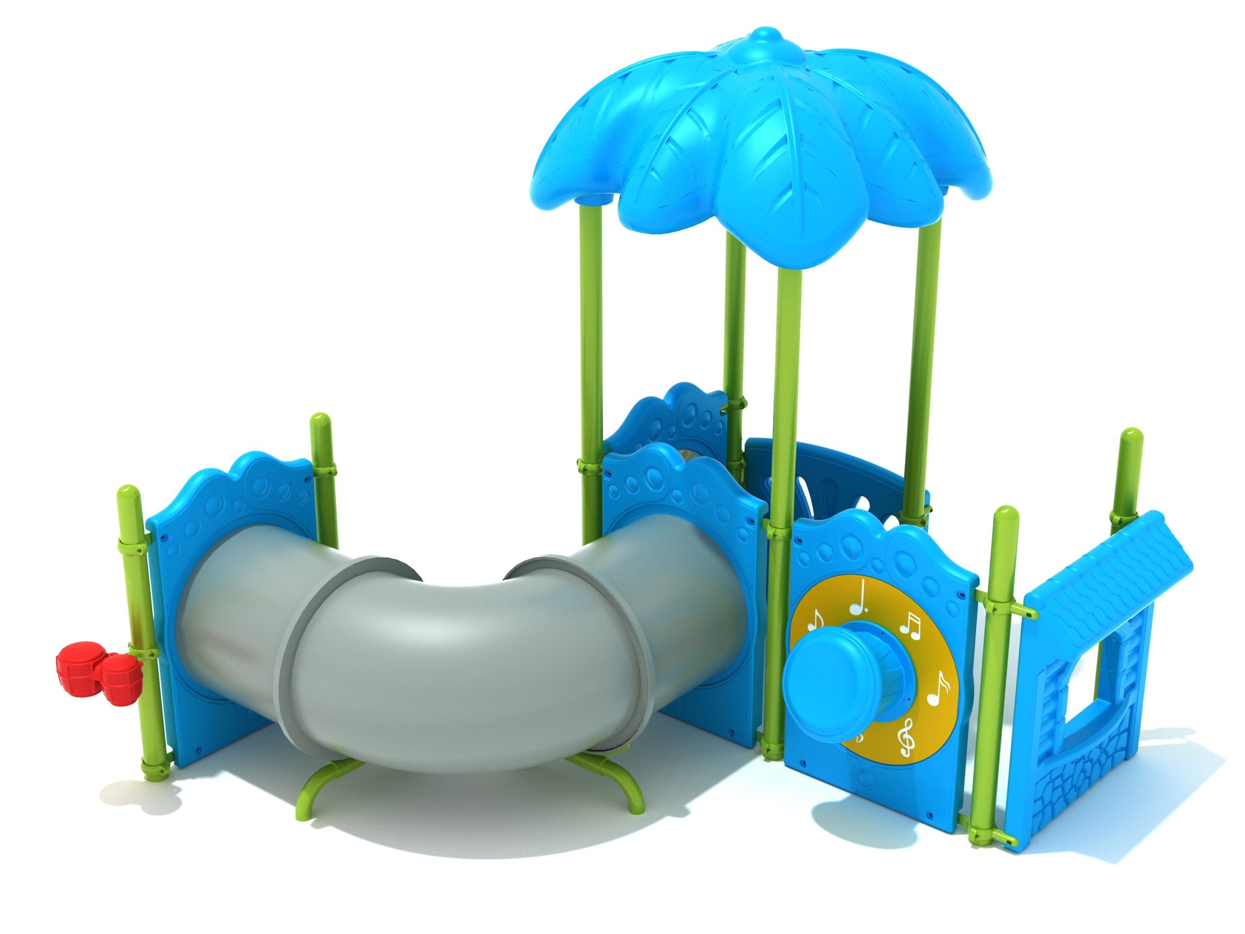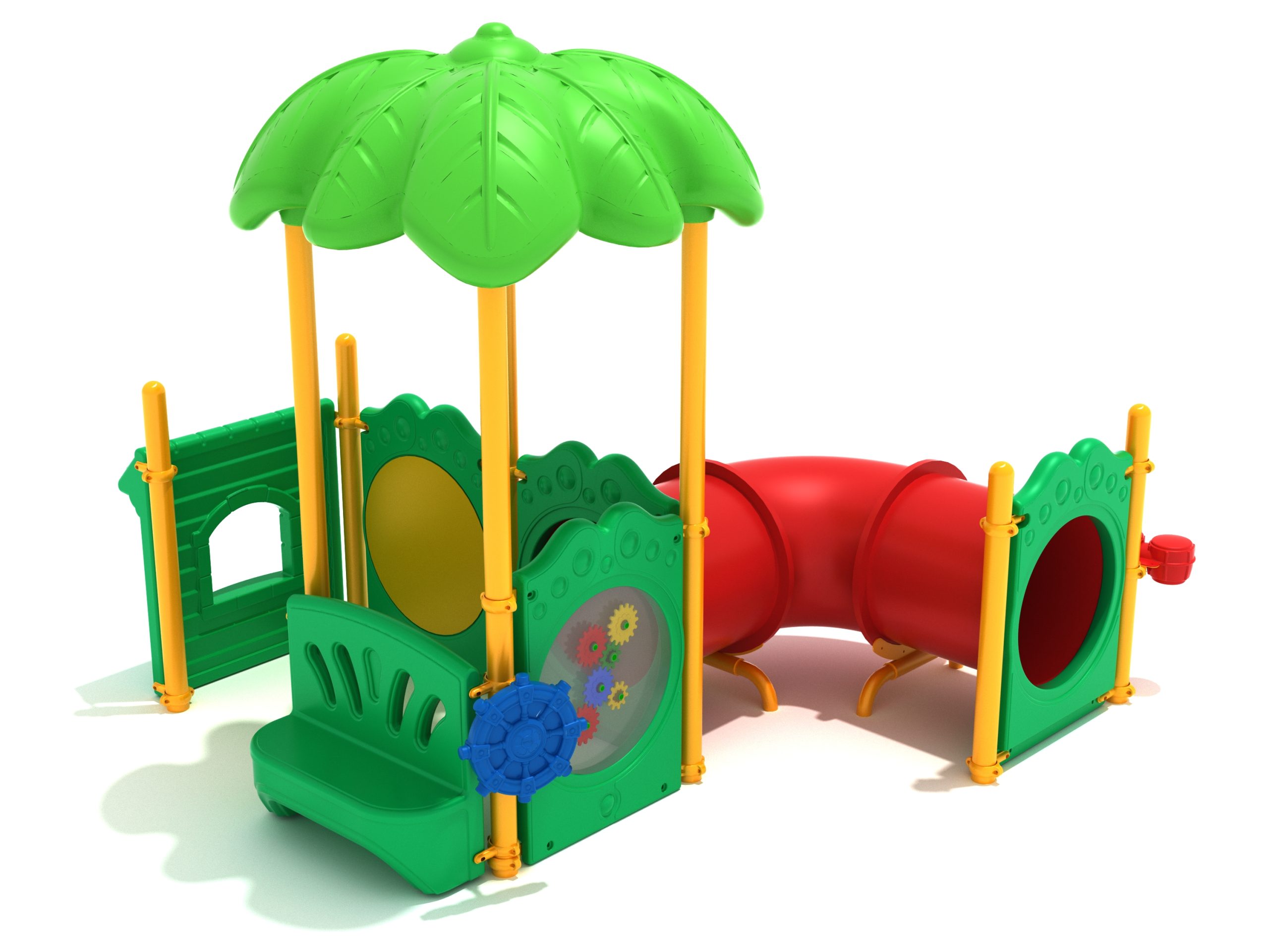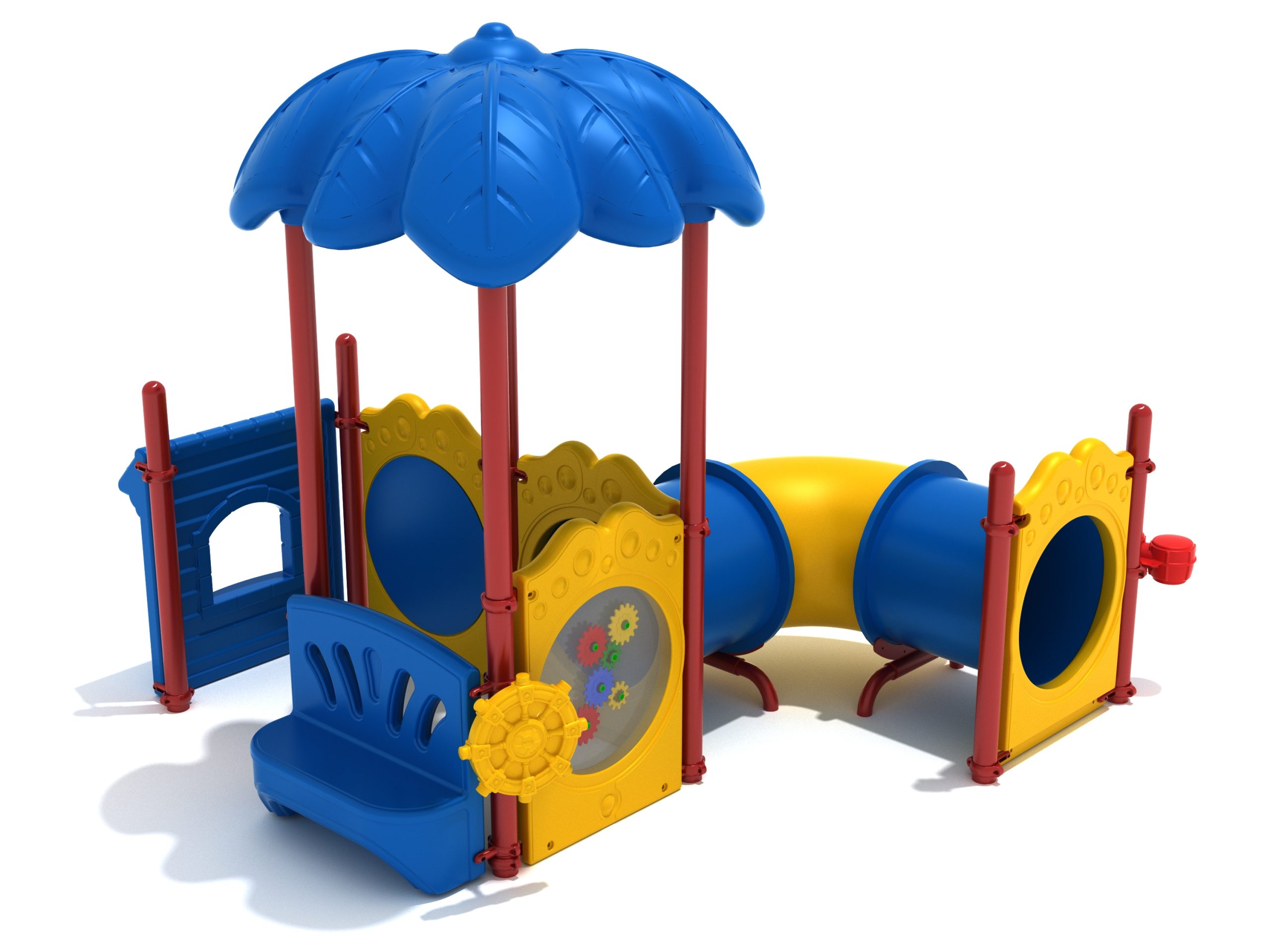 Ideal for daycare centers, preschool environments or even a public park for infants, Asheville has a small footprint with a variety of things to experience. All of the fun takes place beneath a quirky Leaf Roof which not only adds a playful aesthetic but also protects little ones from both sun and rain. There’s a Bench Panel which can be used for reading or just sitting with a friend and developing communication skills, and a Gear Panel to get young minds thinking about mechanisms and problem-solving. The Curved Crawl Tube stirs creative thought as children can crawl through into a cave of treasures or an unexplored wilderness. There are many tactile features to enjoy on the Asheville play set including a set of Bongos which make a distinctive sound and a large Drum Panel which they’ll enjoy banging with their hands. By using the Store Panel children can develop creativity as they buy and sell products, and a Ship’s Wheel carries on the adventure for young and adventurous sailors.