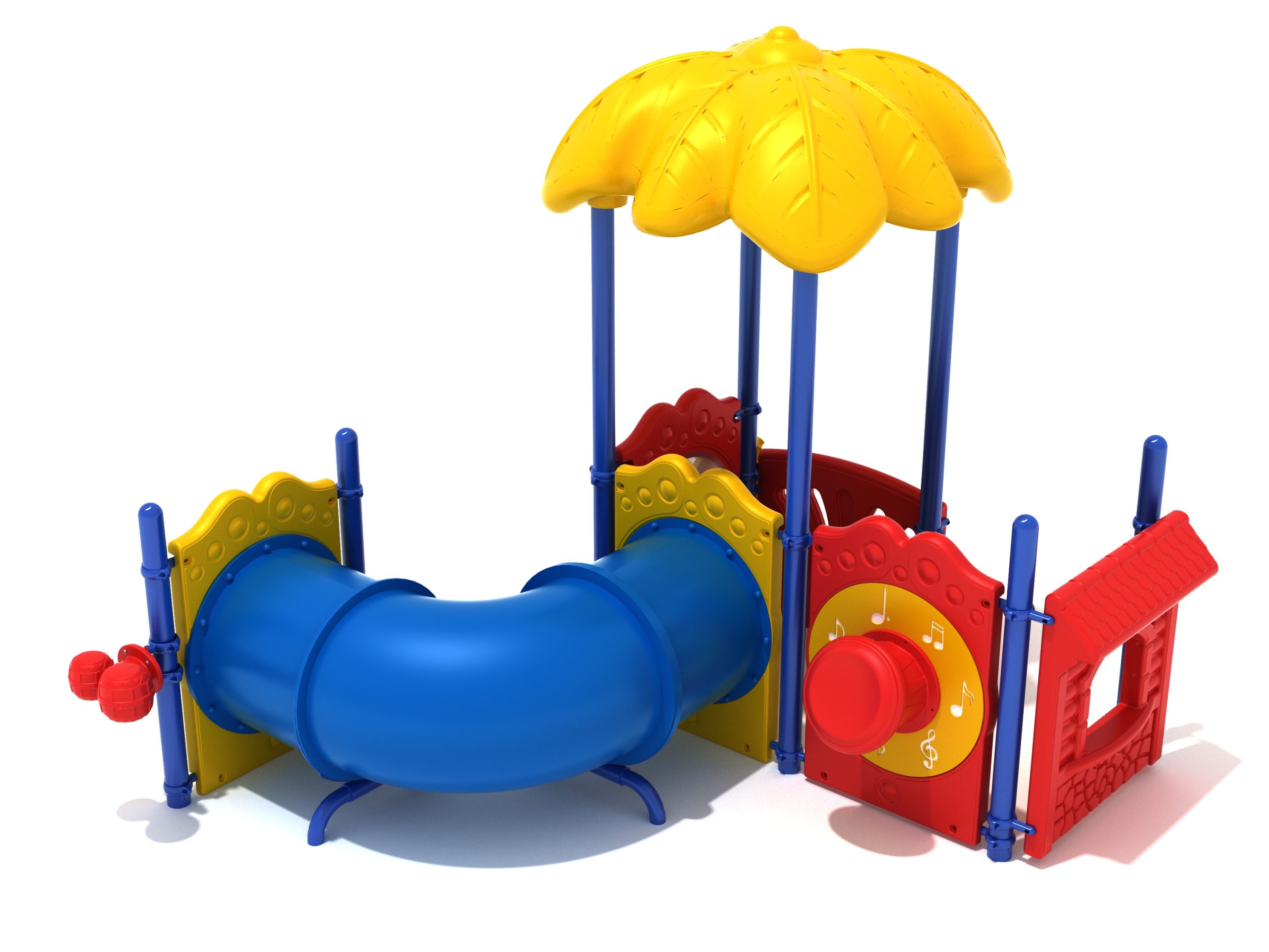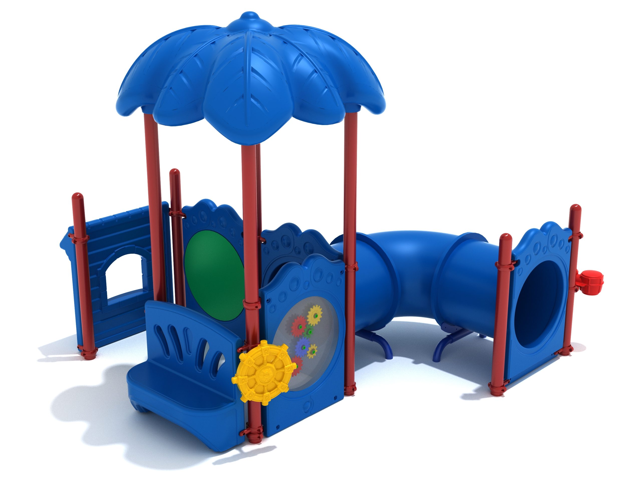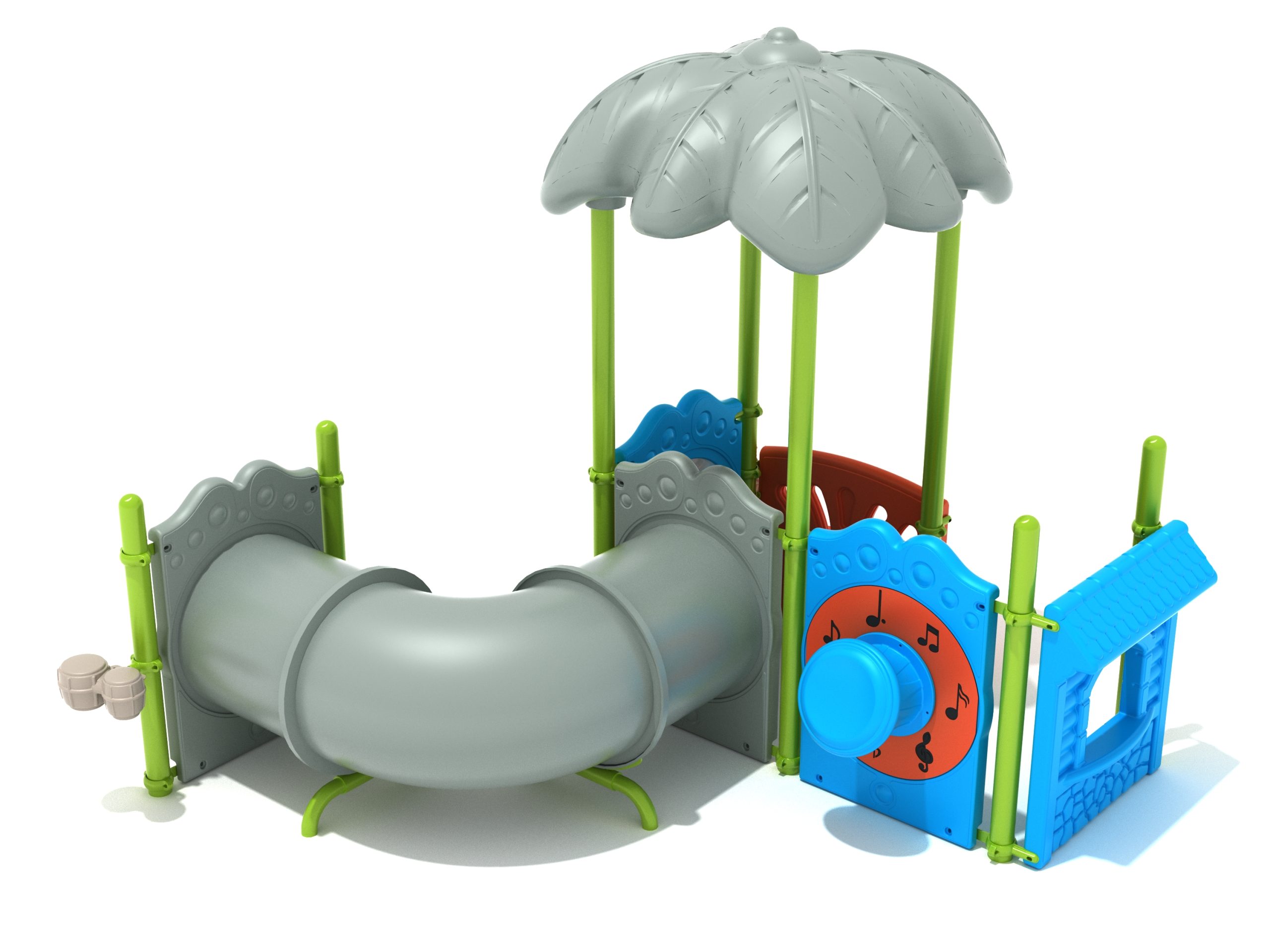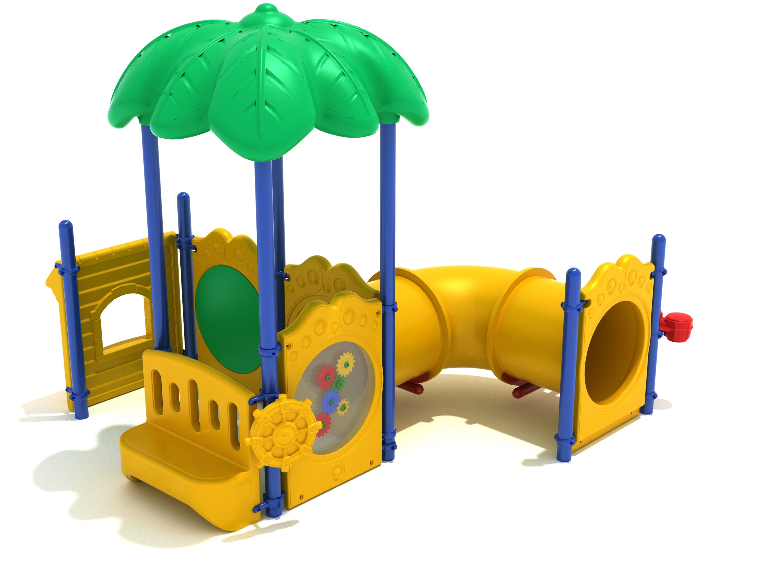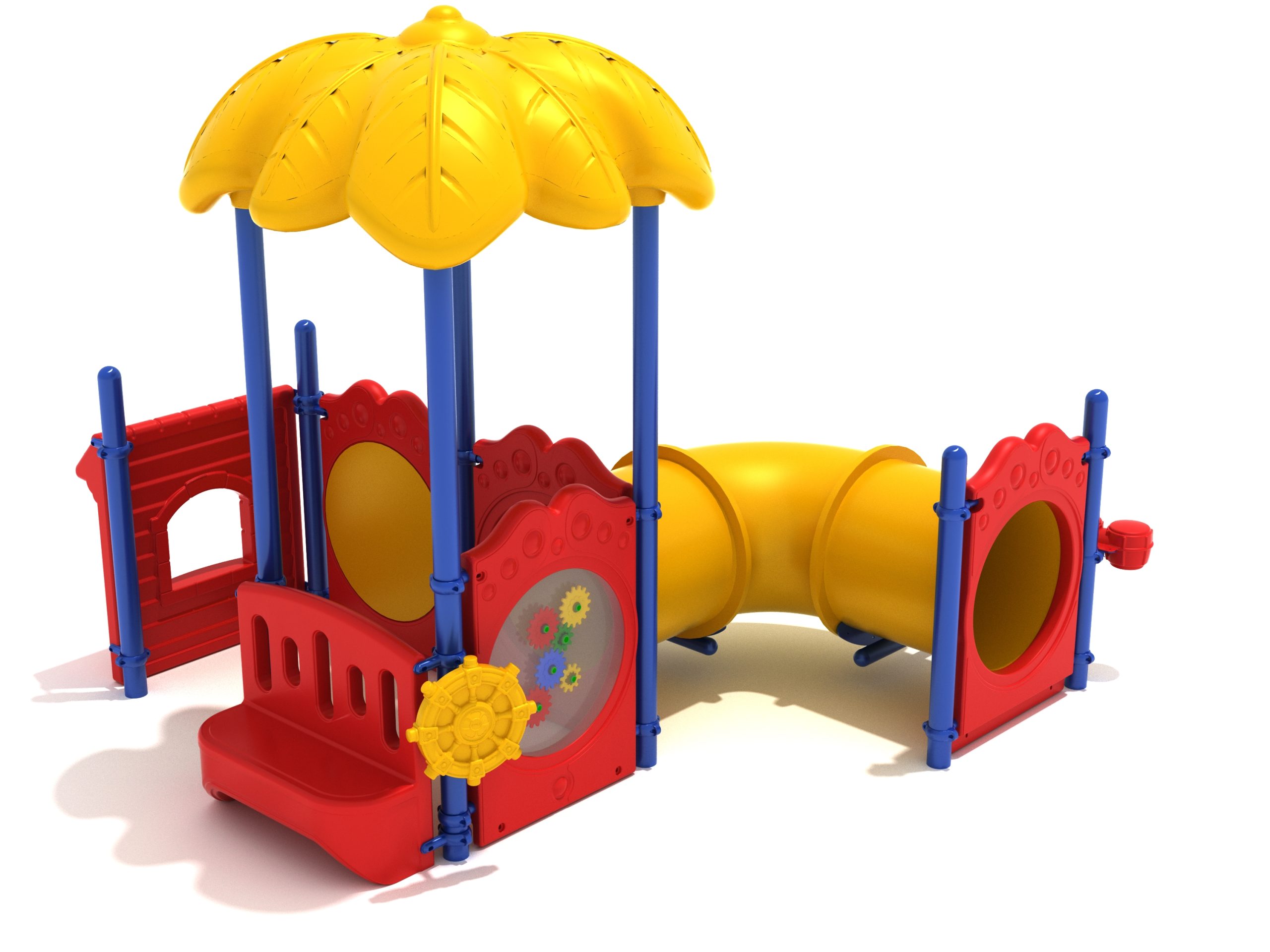 Ideal for daycare centers, preschool environments or even a public park for infants, Asheville has a small footprint with a variety of things to experience. All of the fun takes place beneath a quirky Leaf Roof which not only adds a playful aesthetic but also protects little ones from both sun and rain. There’s a Bench Panel which can be used for reading or just sitting with a friend and developing communication skills, and a Gear Panel to get young minds thinking about mechanisms and problem-solving. The Curved Crawl Tube stirs creative thought as children can crawl through into a cave of treasures or an unexplored wilderness. There are many tactile features to enjoy on the Asheville play set including a set of Bongos which make a distinctive sound and a large Drum Panel which they’ll enjoy banging with their hands. By using the Store Panel children can develop creativity as they buy and sell products, and a Ship’s Wheel carries on the adventure for young and adventurous sailors.