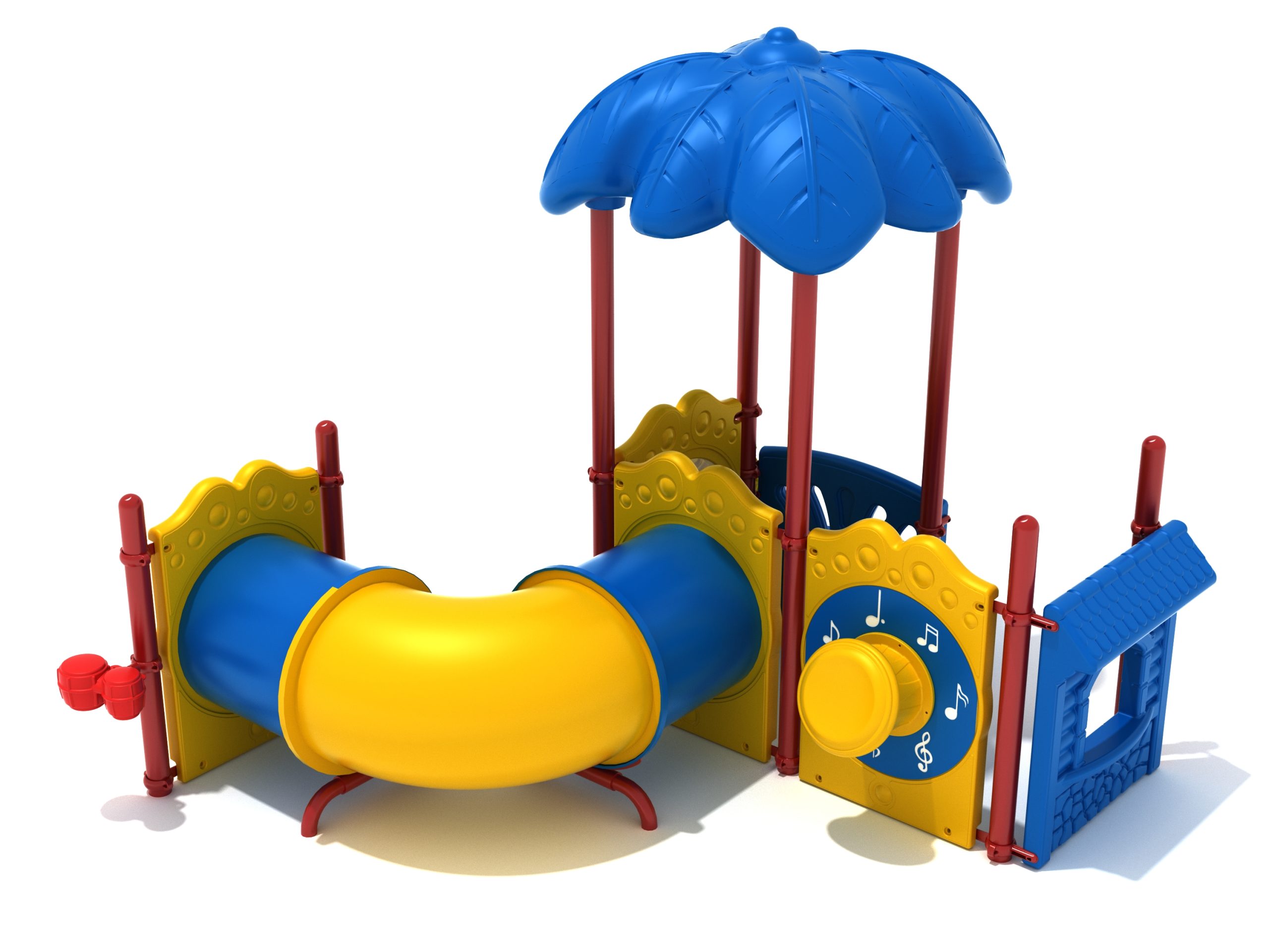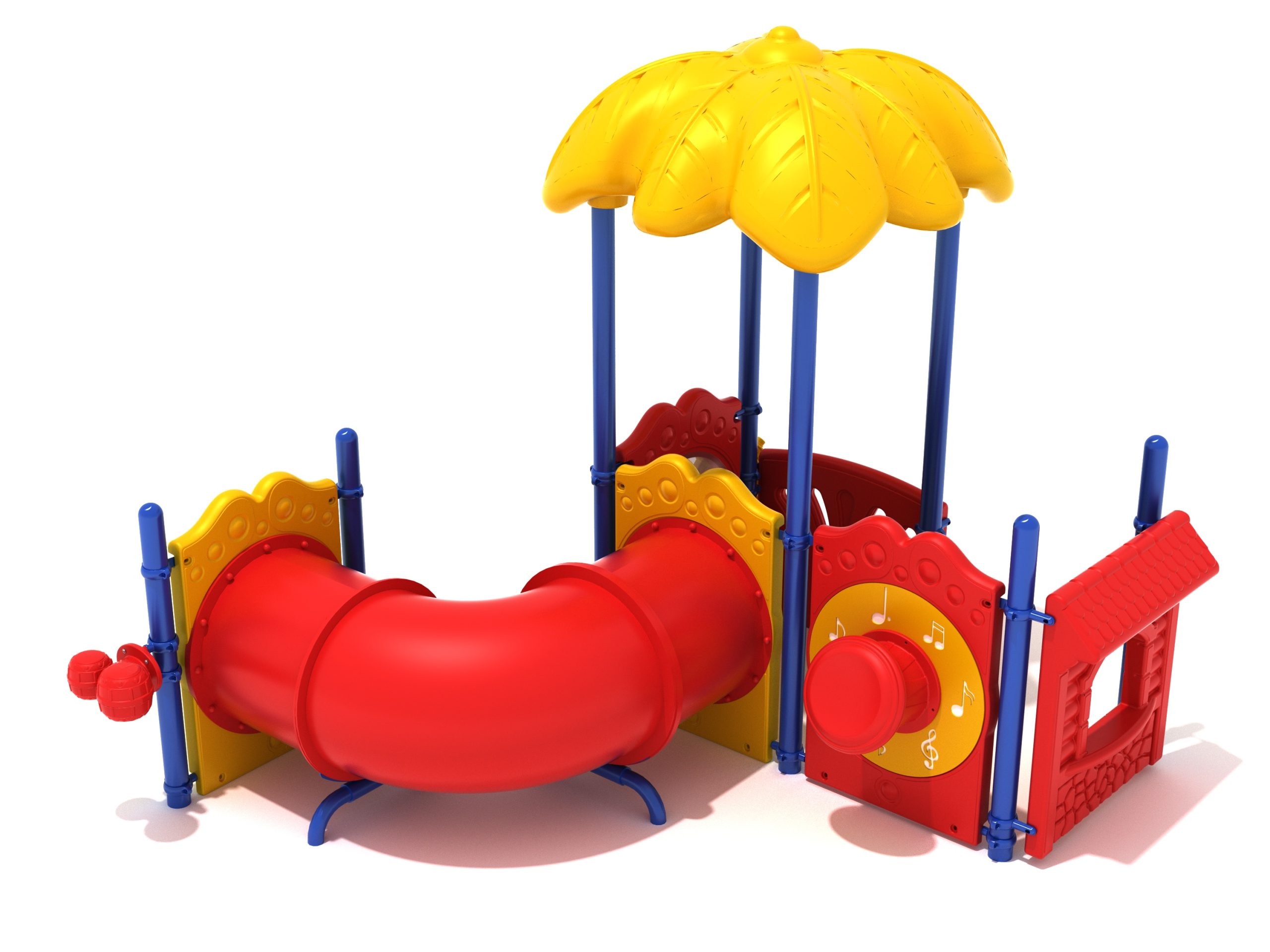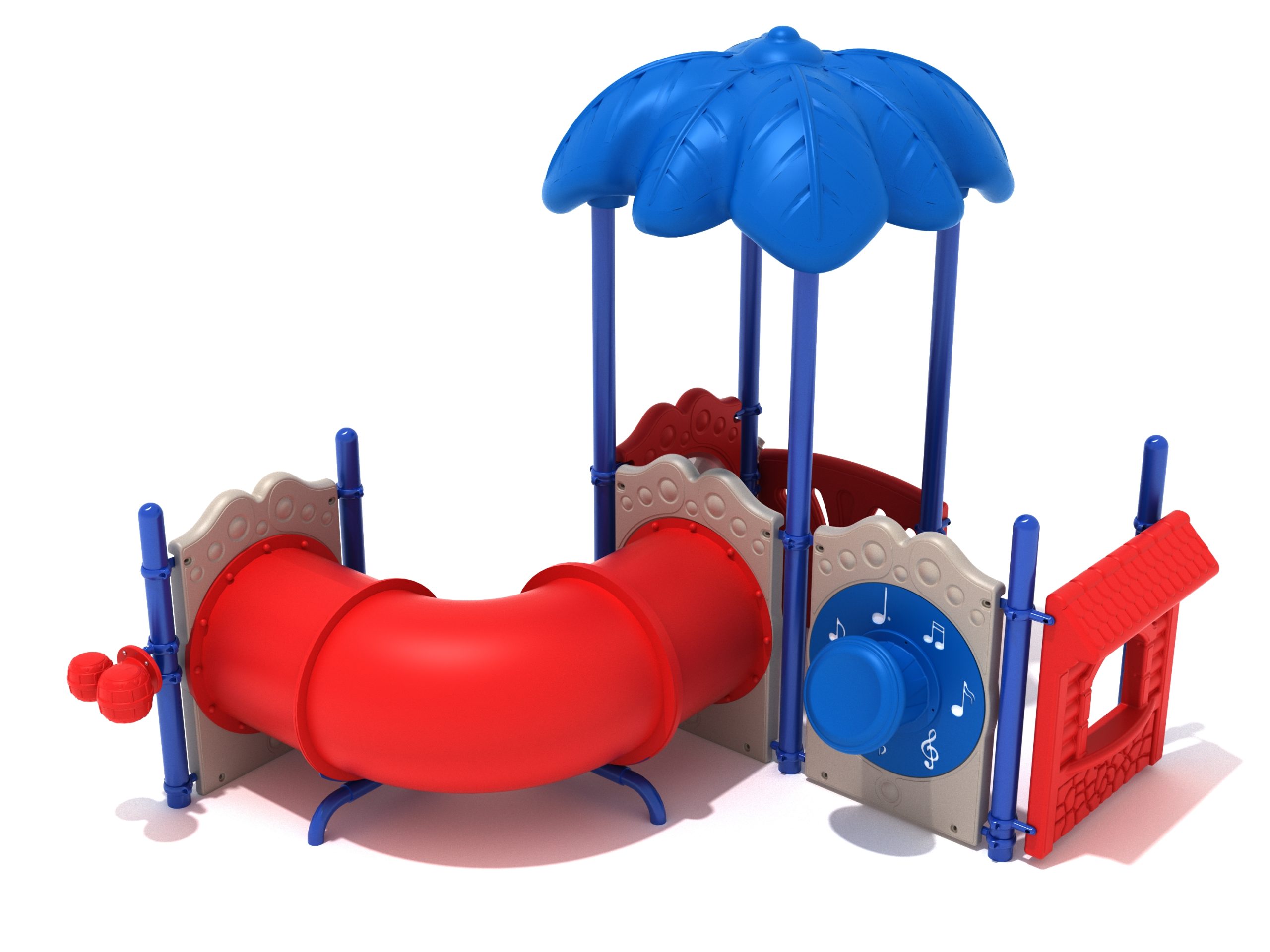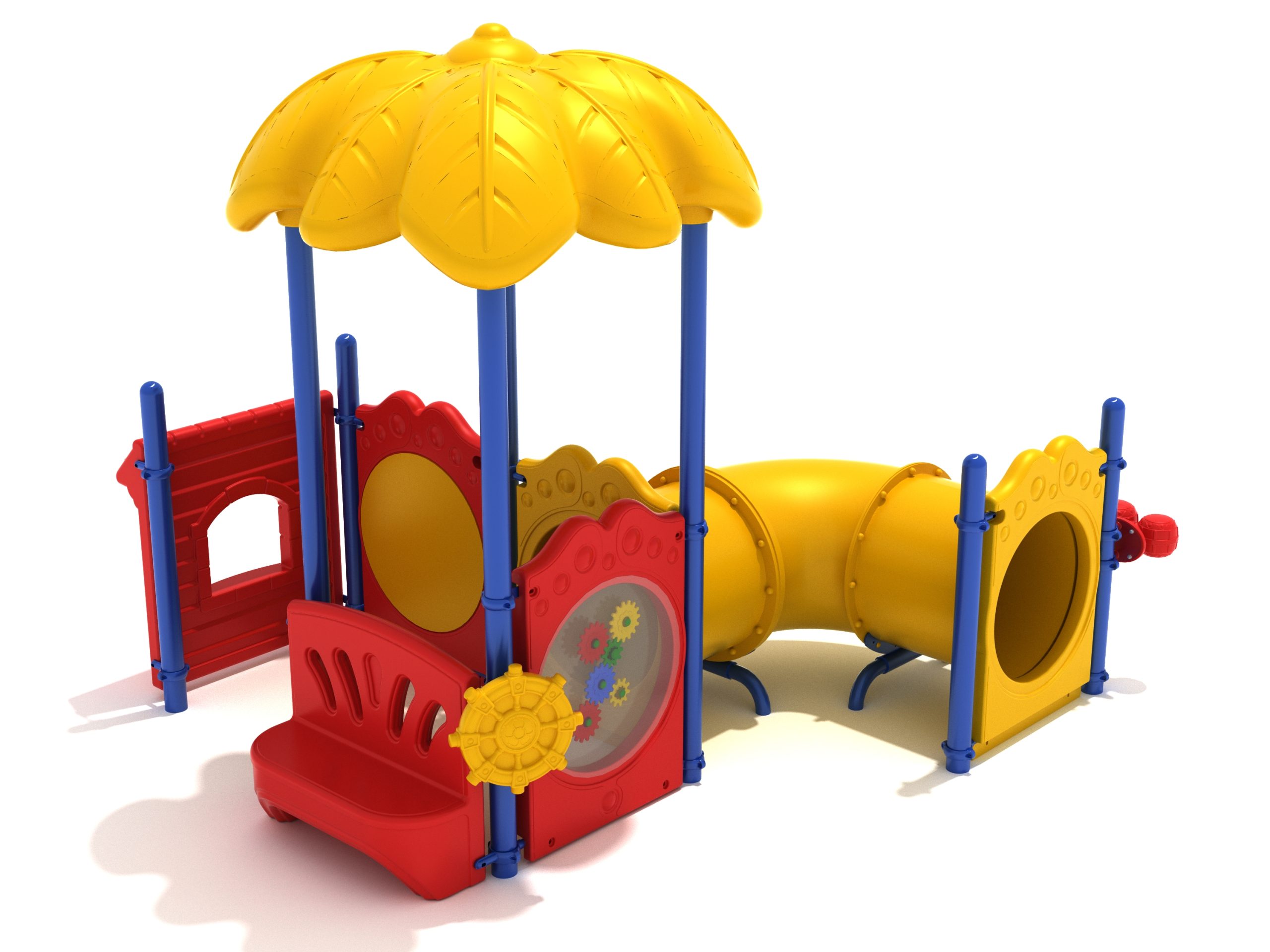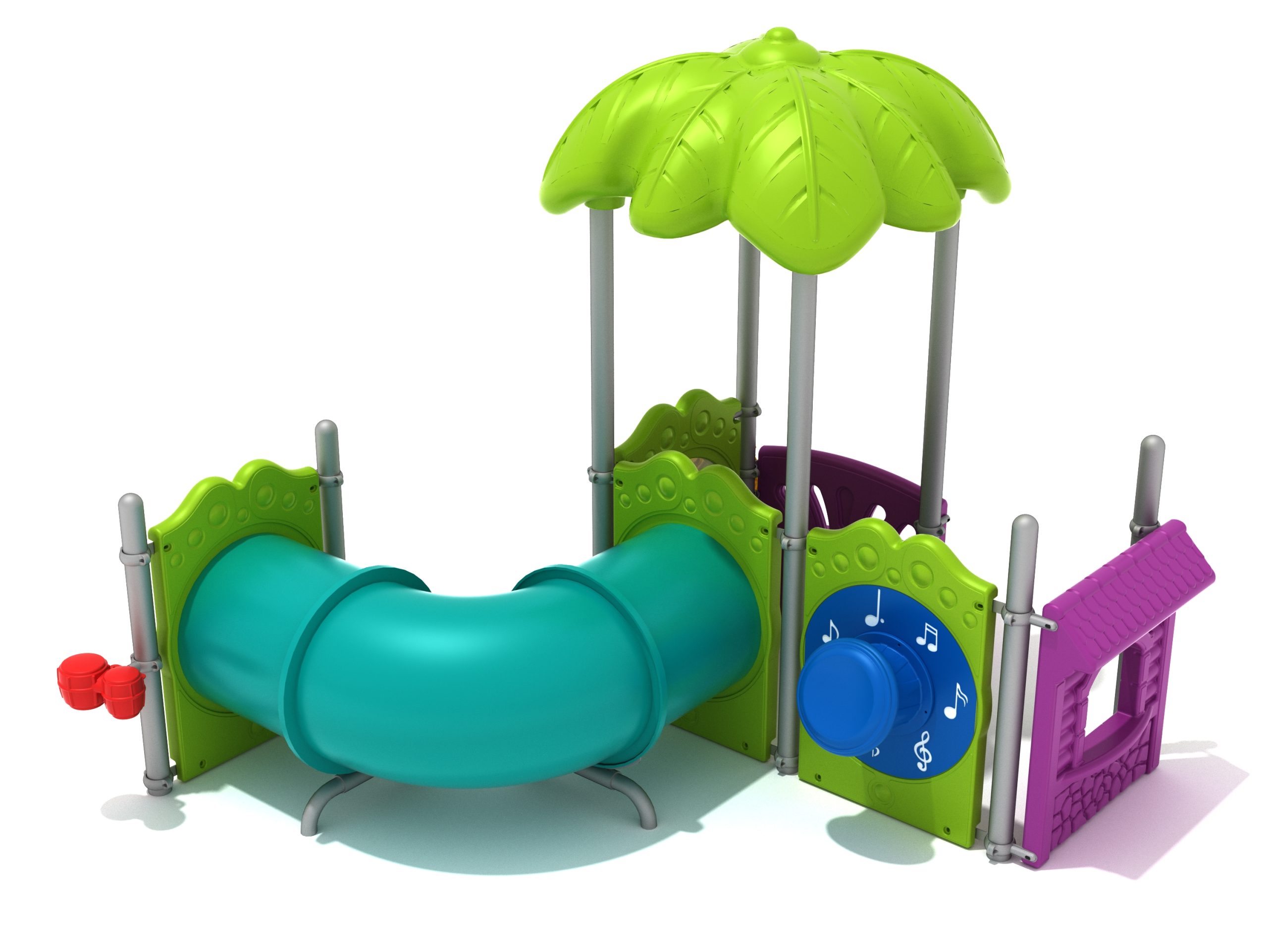 Ideal for daycare centers, preschool environments or even a public park for infants, Asheville has a small footprint with a variety of things to experience. All of the fun takes place beneath a quirky Leaf Roof which not only adds a playful aesthetic but also protects little ones from both sun and rain. There’s a Bench Panel which can be used for reading or just sitting with a friend and developing communication skills, and a Gear Panel to get young minds thinking about mechanisms and problem-solving. The Curved Crawl Tube stirs creative thought as children can crawl through into a cave of treasures or an unexplored wilderness. There are many tactile features to enjoy on the Asheville play set including a set of Bongos which make a distinctive sound and a large Drum Panel which they’ll enjoy banging with their hands. By using the Store Panel children can develop creativity as they buy and sell products, and a Ship’s Wheel carries on the adventure for young and adventurous sailors.