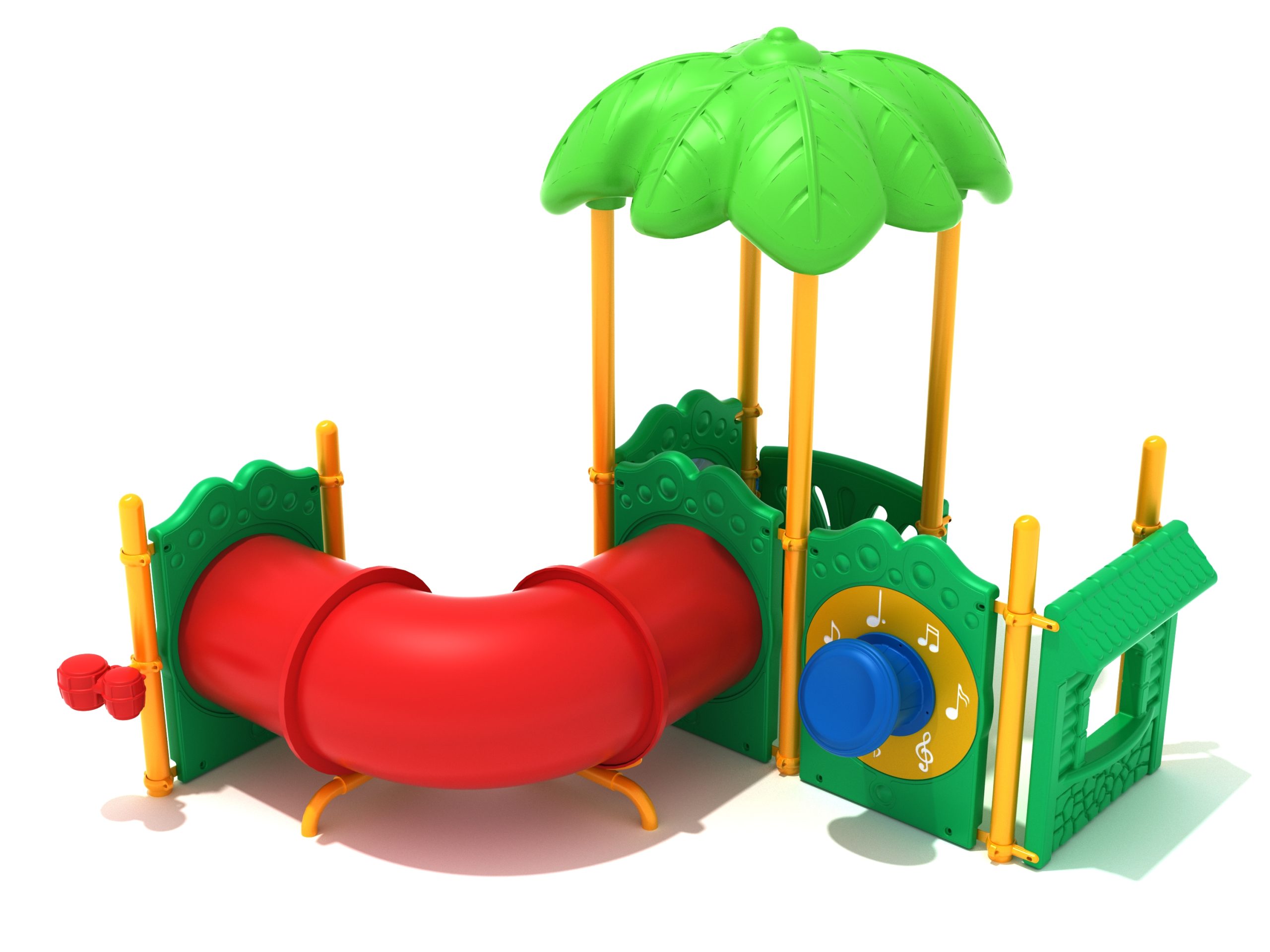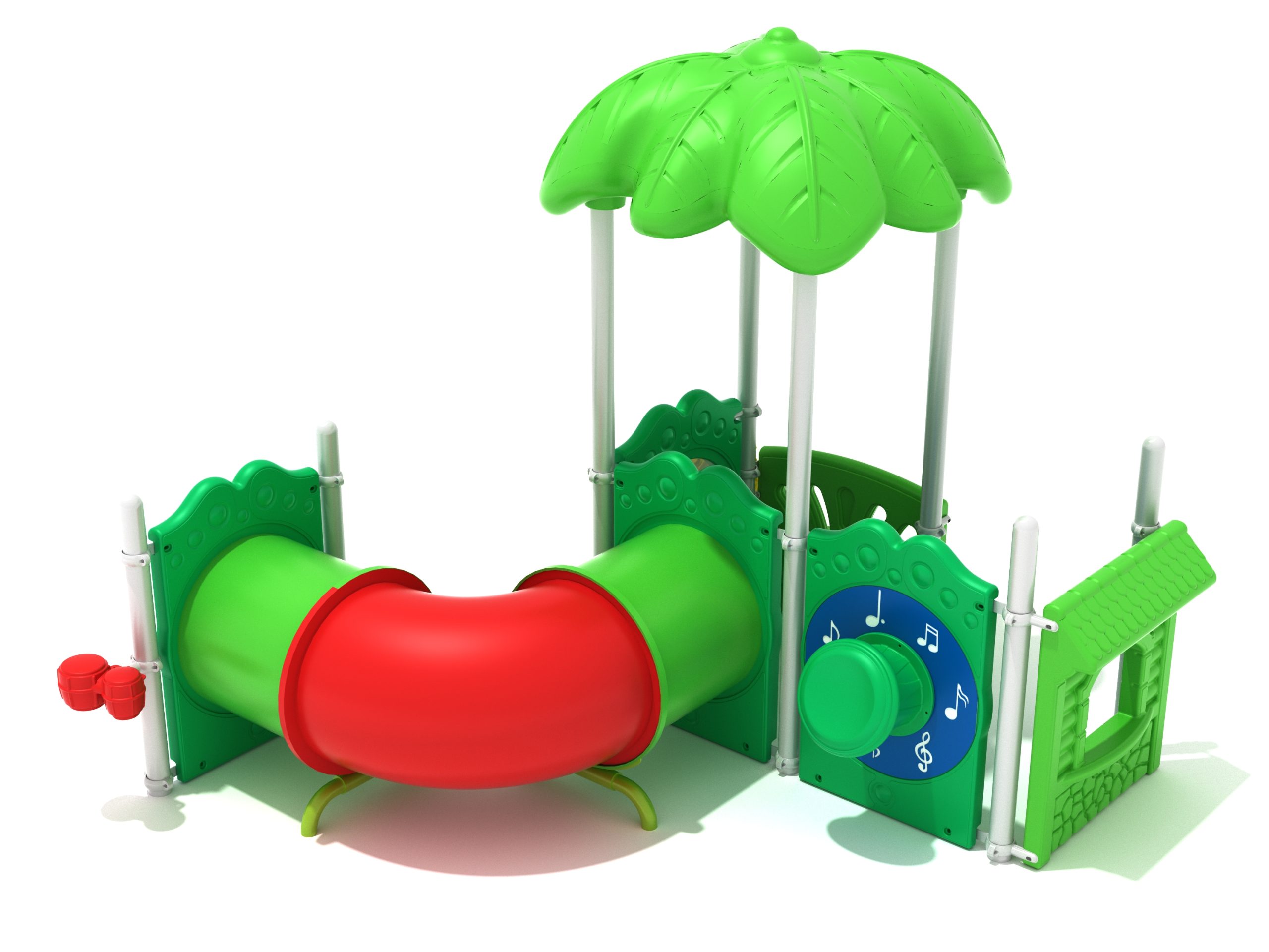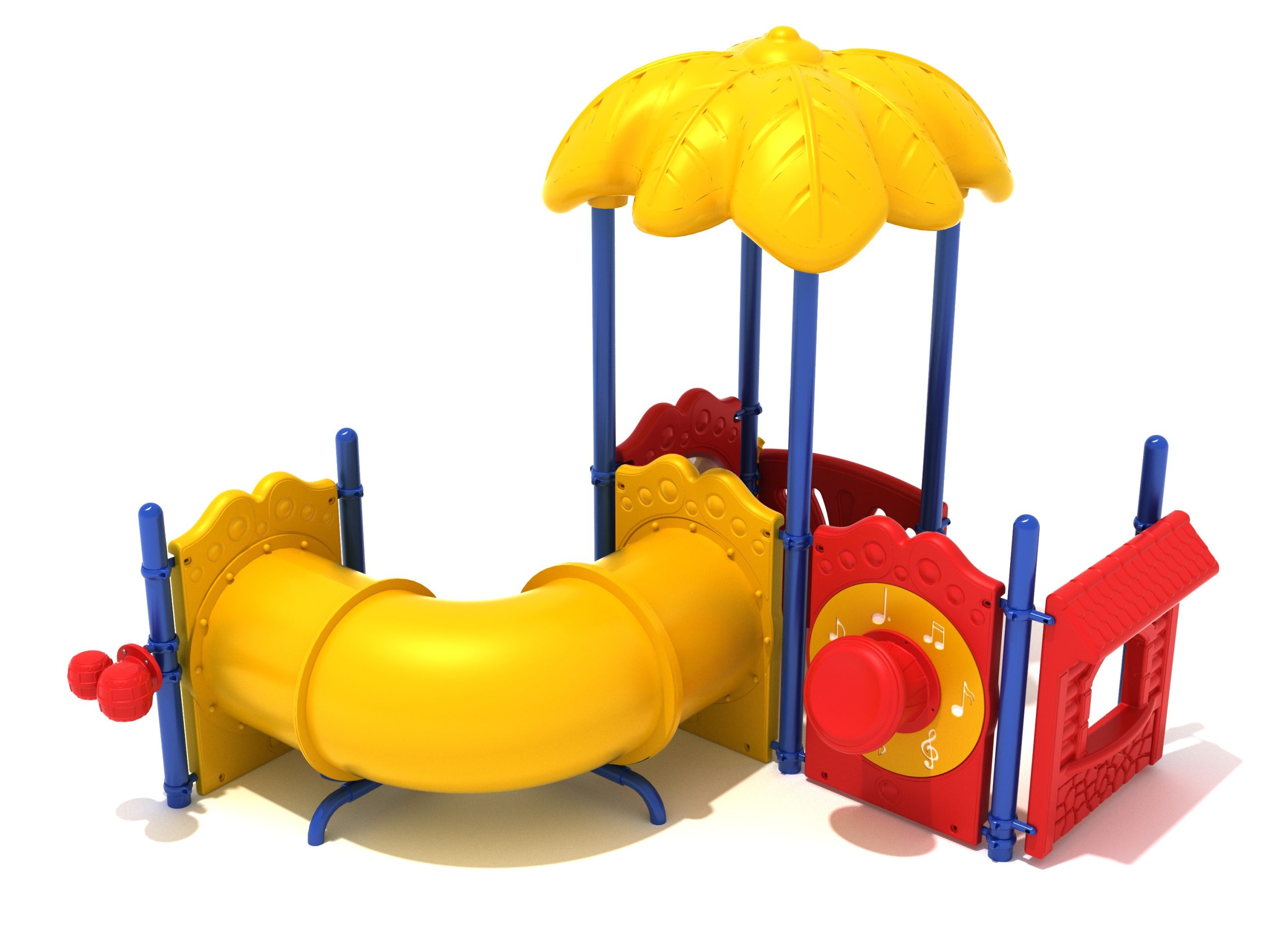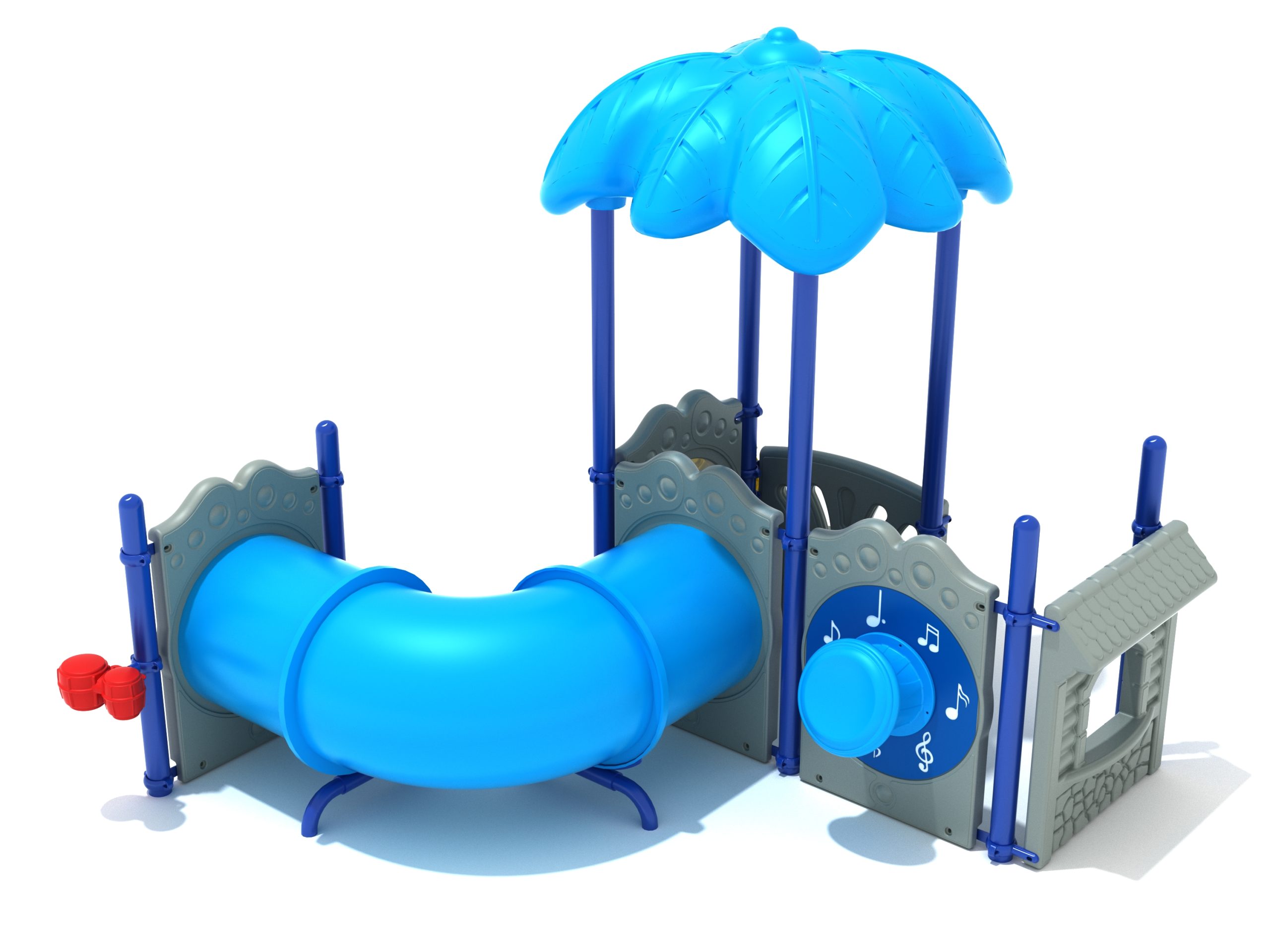 Ideal for daycare centers, preschool environments or even a public park for infants, Asheville has a small footprint with a variety of things to experience. All of the fun takes place beneath a quirky Leaf Roof which not only adds a playful aesthetic but also protects little ones from both sun and rain. There’s a Bench Panel which can be used for reading or just sitting with a friend and developing communication skills, and a Gear Panel to get young minds thinking about mechanisms and problem-solving. The Curved Crawl Tube stirs creative thought as children can crawl through into a cave of treasures or an unexplored wilderness. There are many tactile features to enjoy on the Asheville play set including a set of Bongos which make a distinctive sound and a large Drum Panel which they’ll enjoy banging with their hands. By using the Store Panel children can develop creativity as they buy and sell products, and a Ship’s Wheel carries on the adventure for young and adventurous sailors.