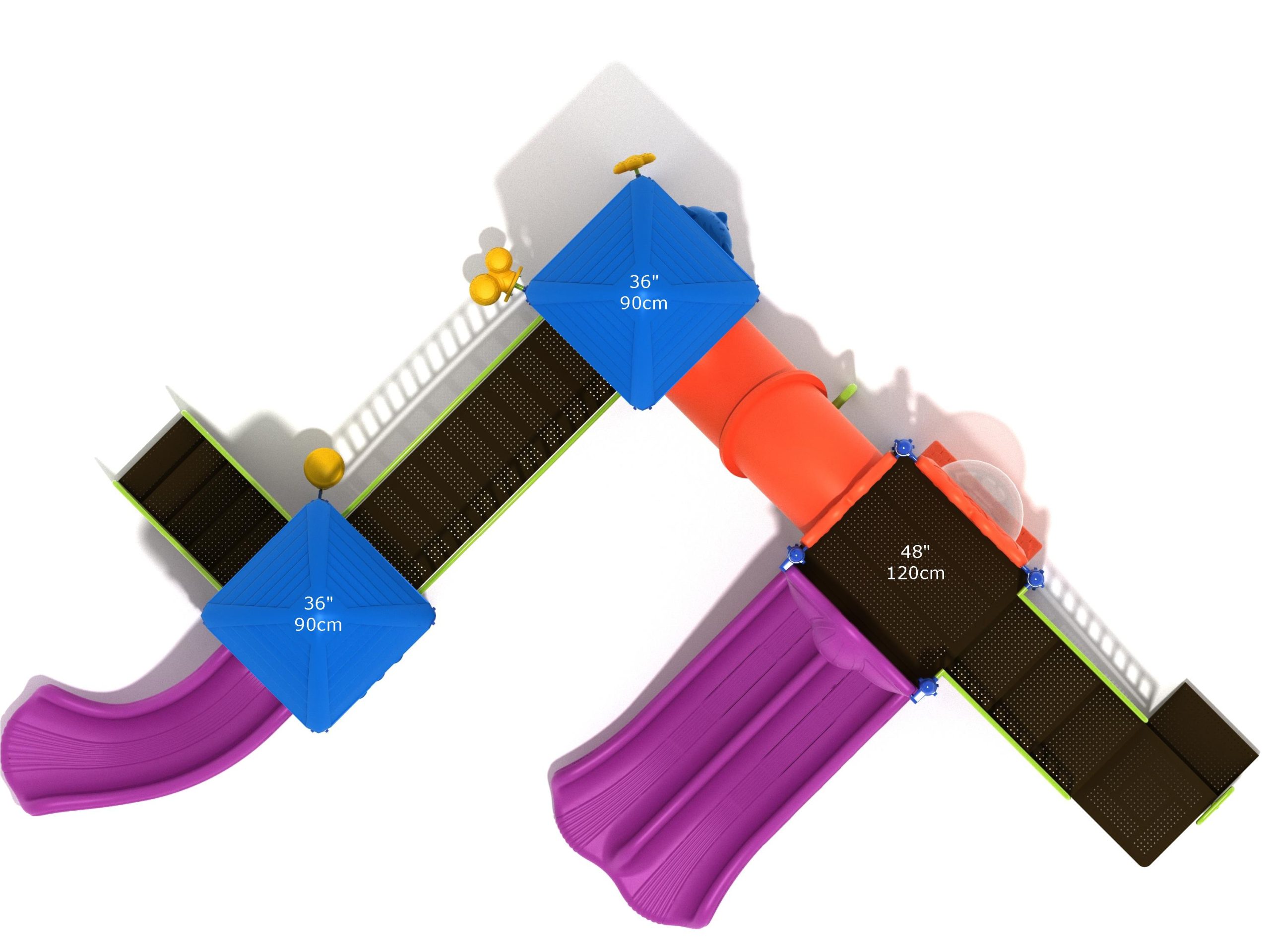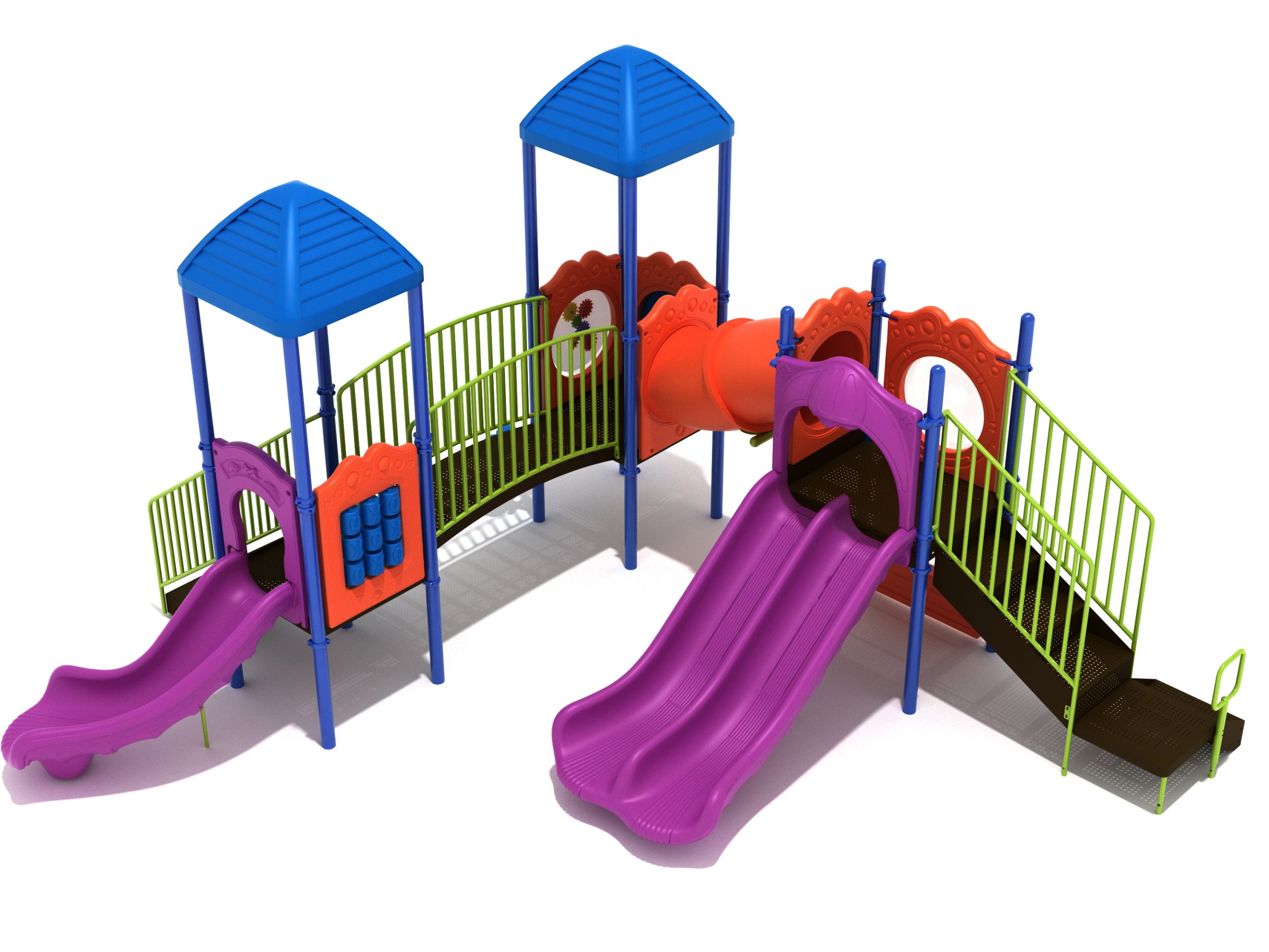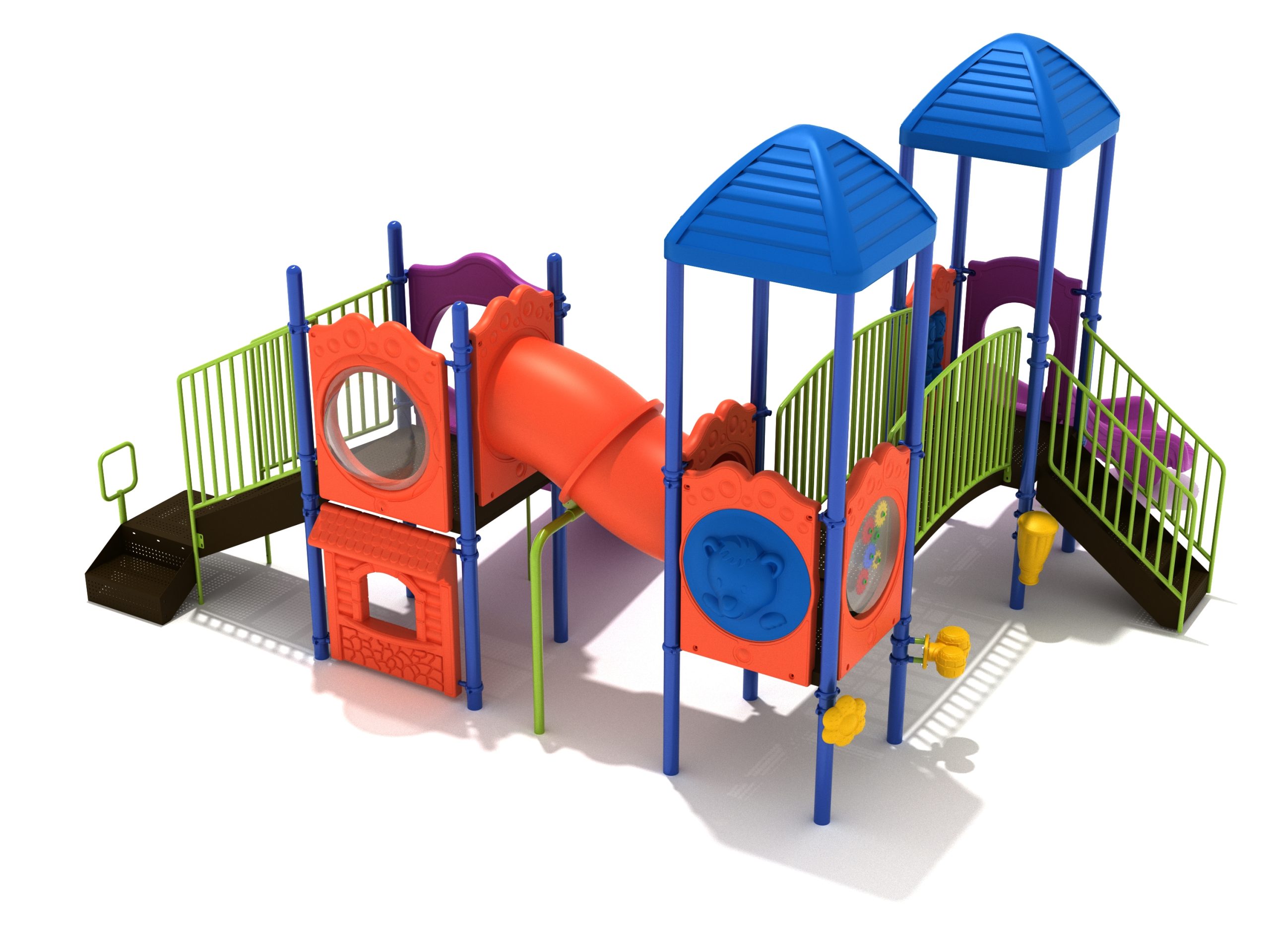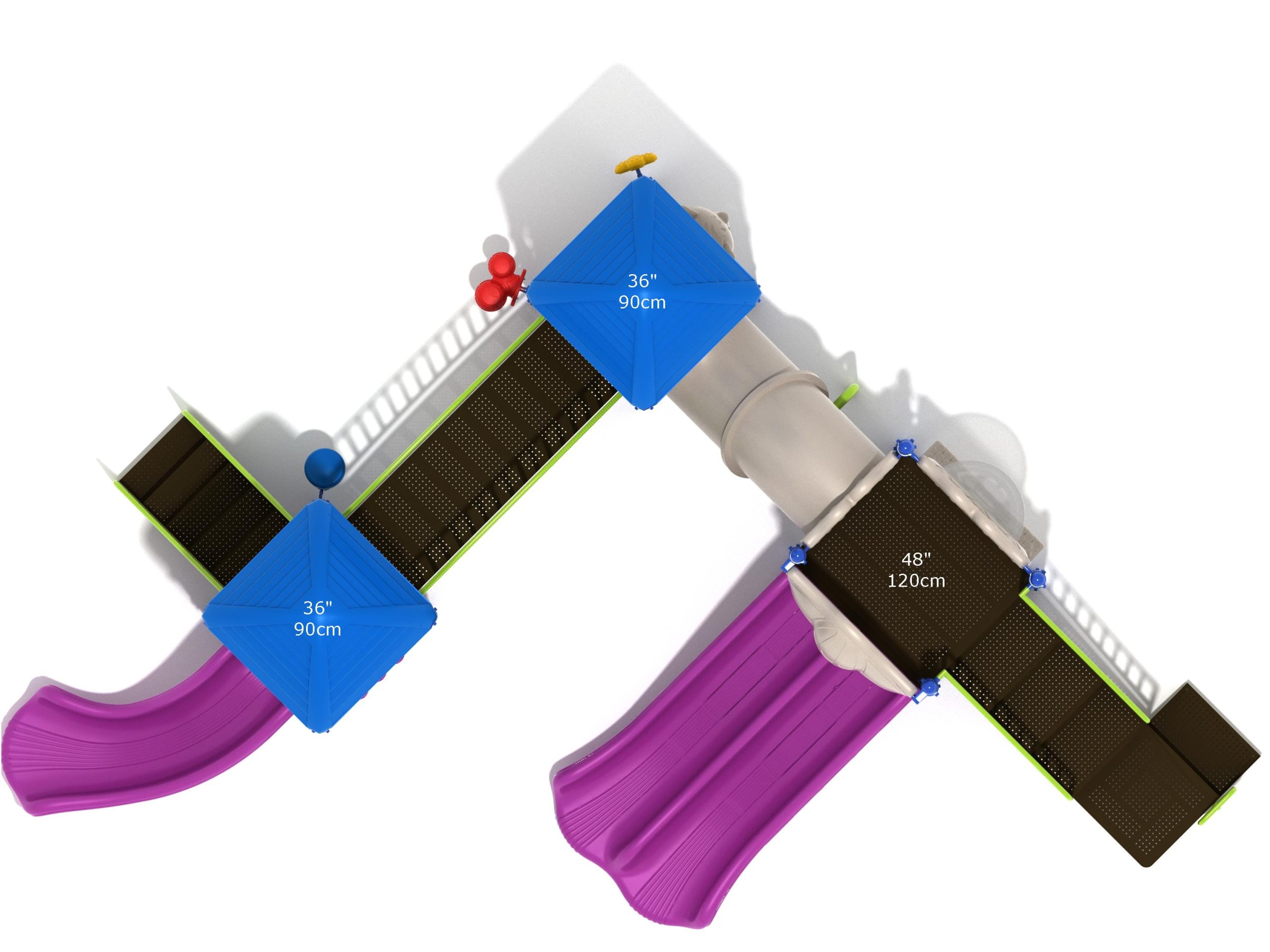 With both a Right Turn Slide for a sloped descent and a Double Slide so friends can enjoy the structure together, the Ashland is built for some serious fun. A small Arch Bridge and an Incline Tube Bridge add to the experience and promote the use of different muscles to clamber through. Multiple panels on the structure encourage creative play through interaction and children will get excited to play storekeeper and customer with the Store Panel. Role playing at a young age is a key way children learn about the world. Whether it’s the Gear Panel where children can be a mechanic on a spaceship or the Bubble Panel where children can look out on an undersea adventure or blast off to space in a rocketship, these simple additions are highly beneficial for development. Larger kids will benefit from the space and freedom to run around on the Ashland, and younger children will like the musical elements on the ground level such as the Single Drum, Bongos and Rain Wheel to add sound to the play experience.