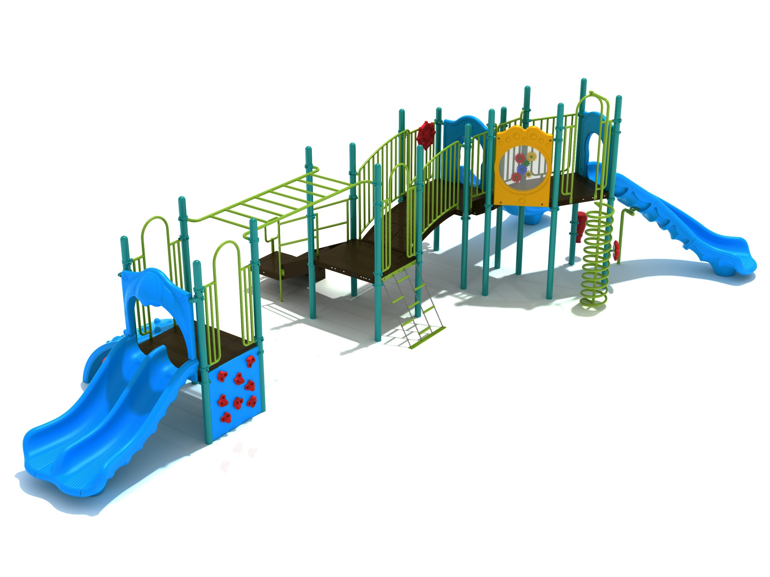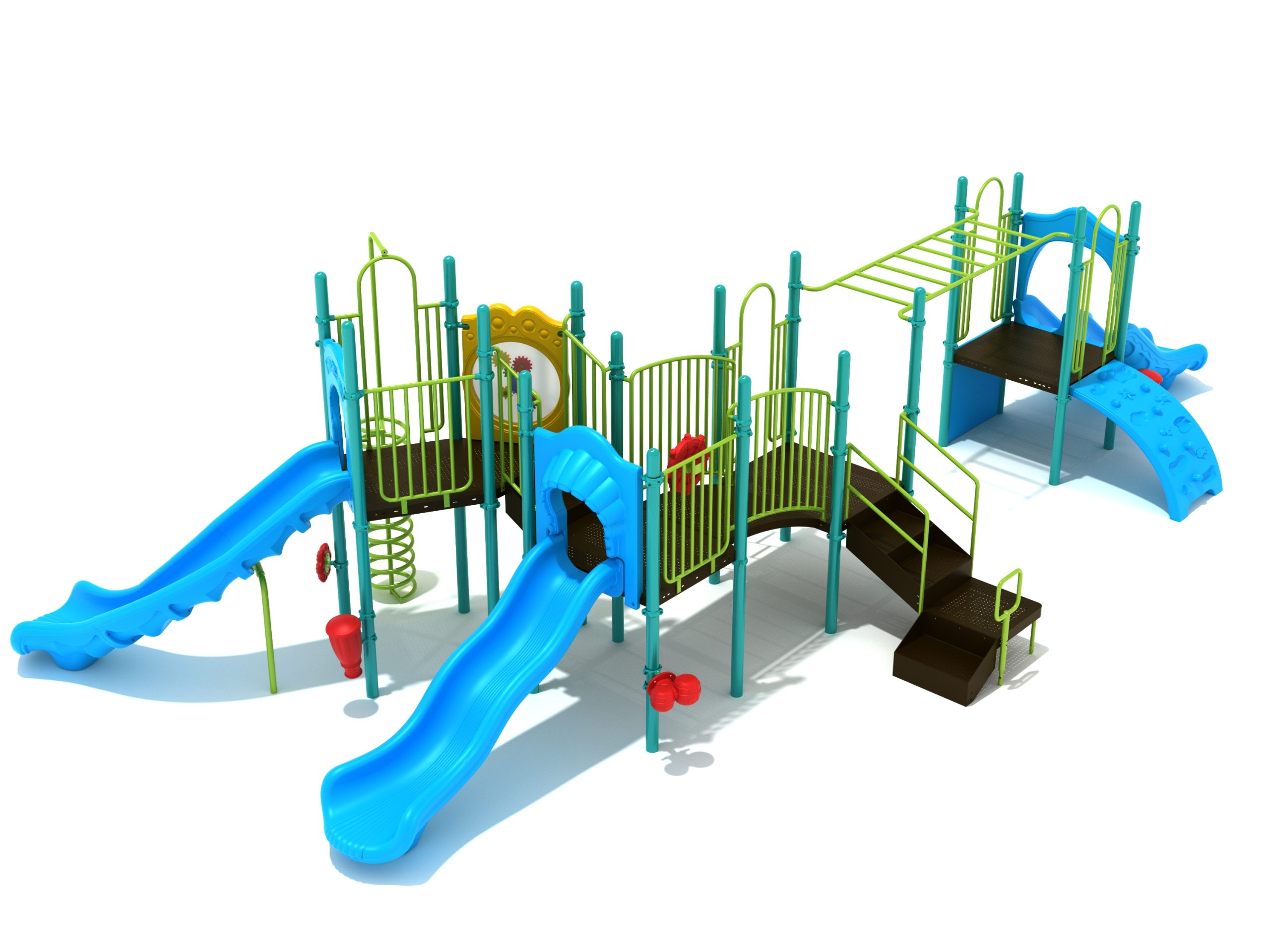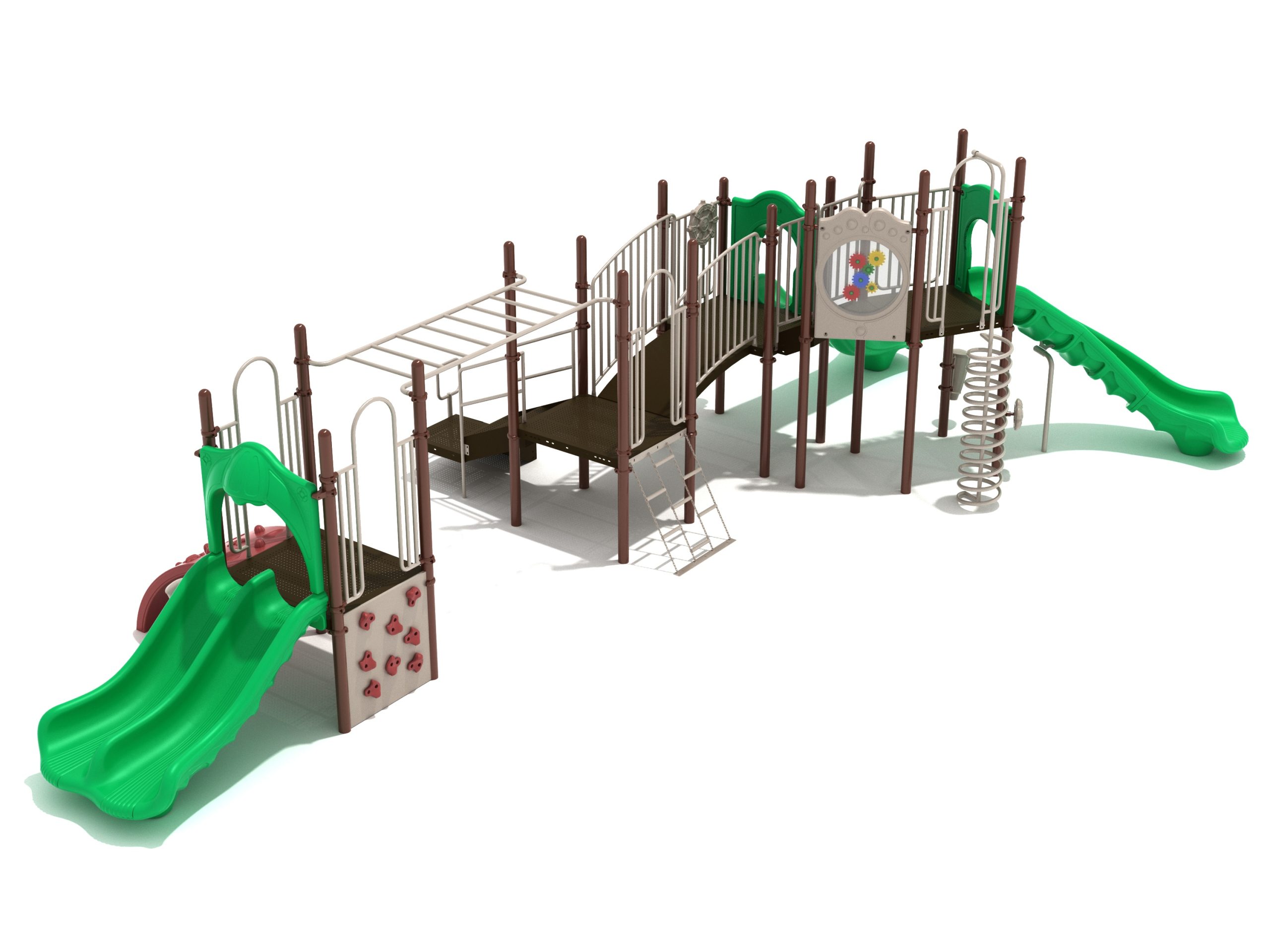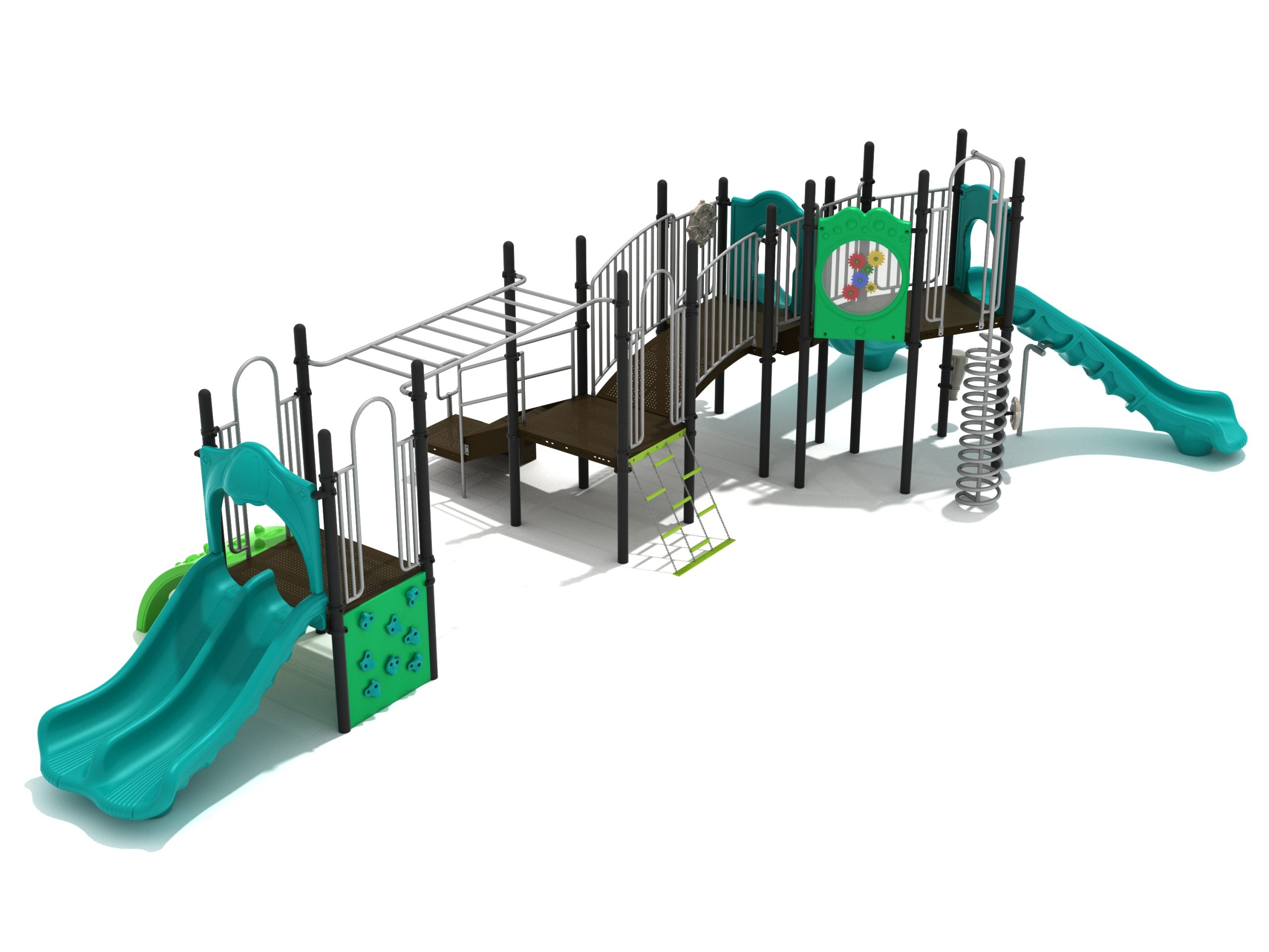 The Bayou Vista play system lets children explore different exciting features. Its thoughtful design accommodates 50 kids with a fall height of 60”. With 4 slides and different climbers, it offers an exciting array of activities designed to keep kids engaged. The Spiral Climber and the Sea Creature Climber though challenging, promote physical fitness among kids. It also has obstacles like the flexible Chain Climber and a demanding Vertical PE Rock Climbing Wall to keep kids active while they’re having a good time with their pals. These climbers provide excellent opportunities for exercise by engaging both arms & legs. Another key feature is an Overhead Straight-Rung Horizontal Ladder that challenges children to strengthen their upper body strength while swinging across. While on the deck, kids can also play around with the Gear Panel and afterward slide their way down using the slide of their liking. The Bayou Vista combines fitness with fun. That’s why it is a suitable pick for busy playgrounds.