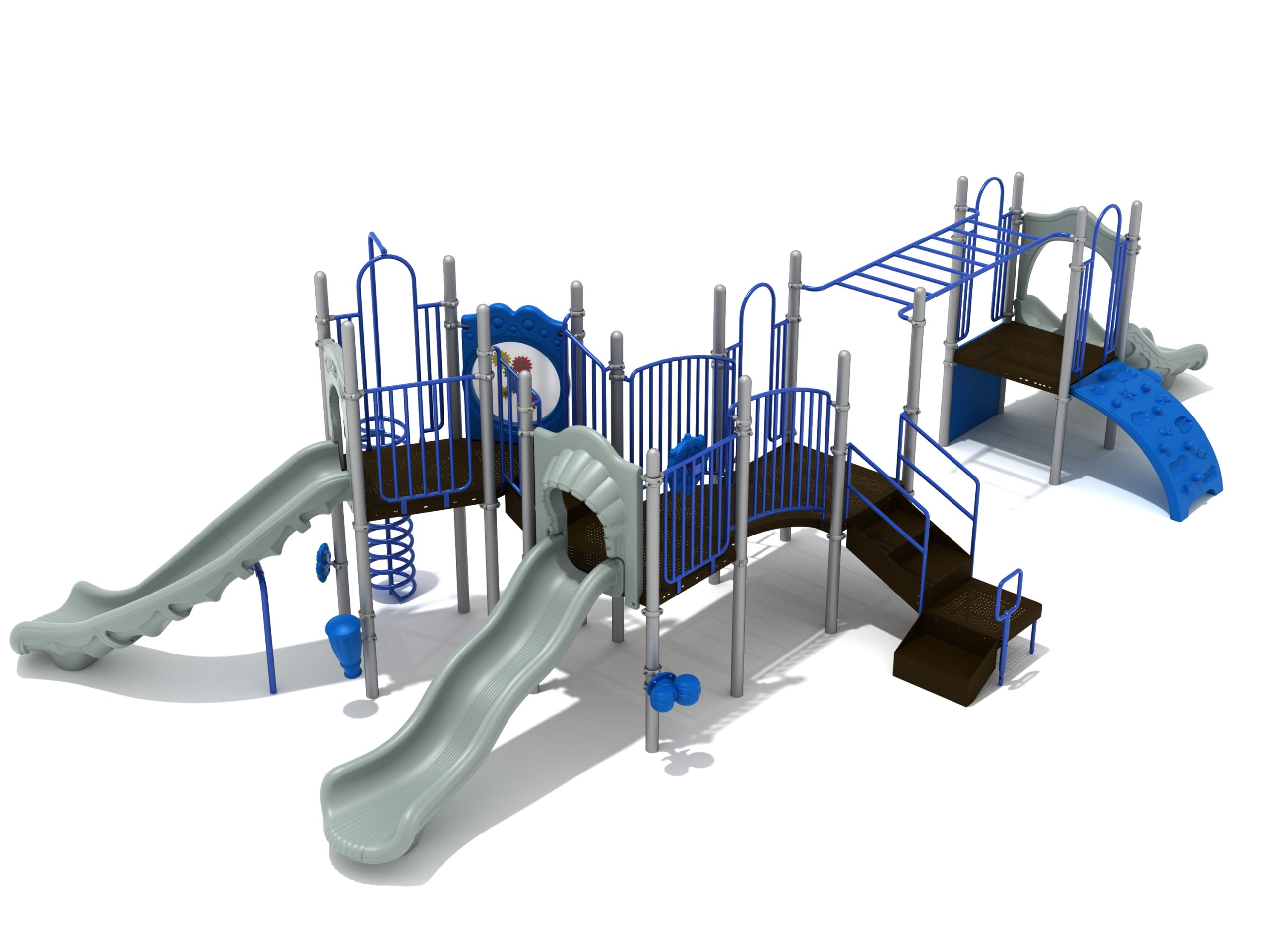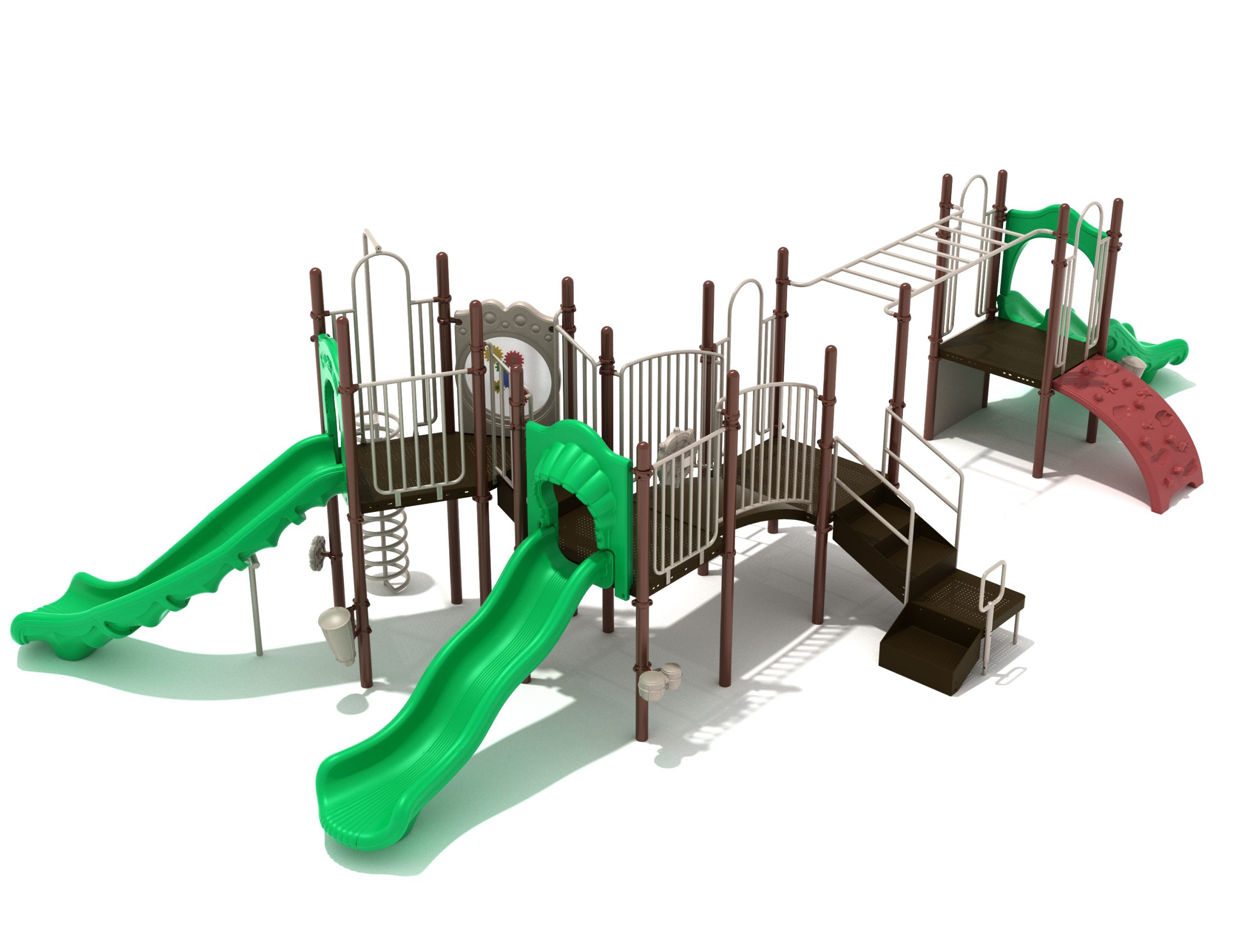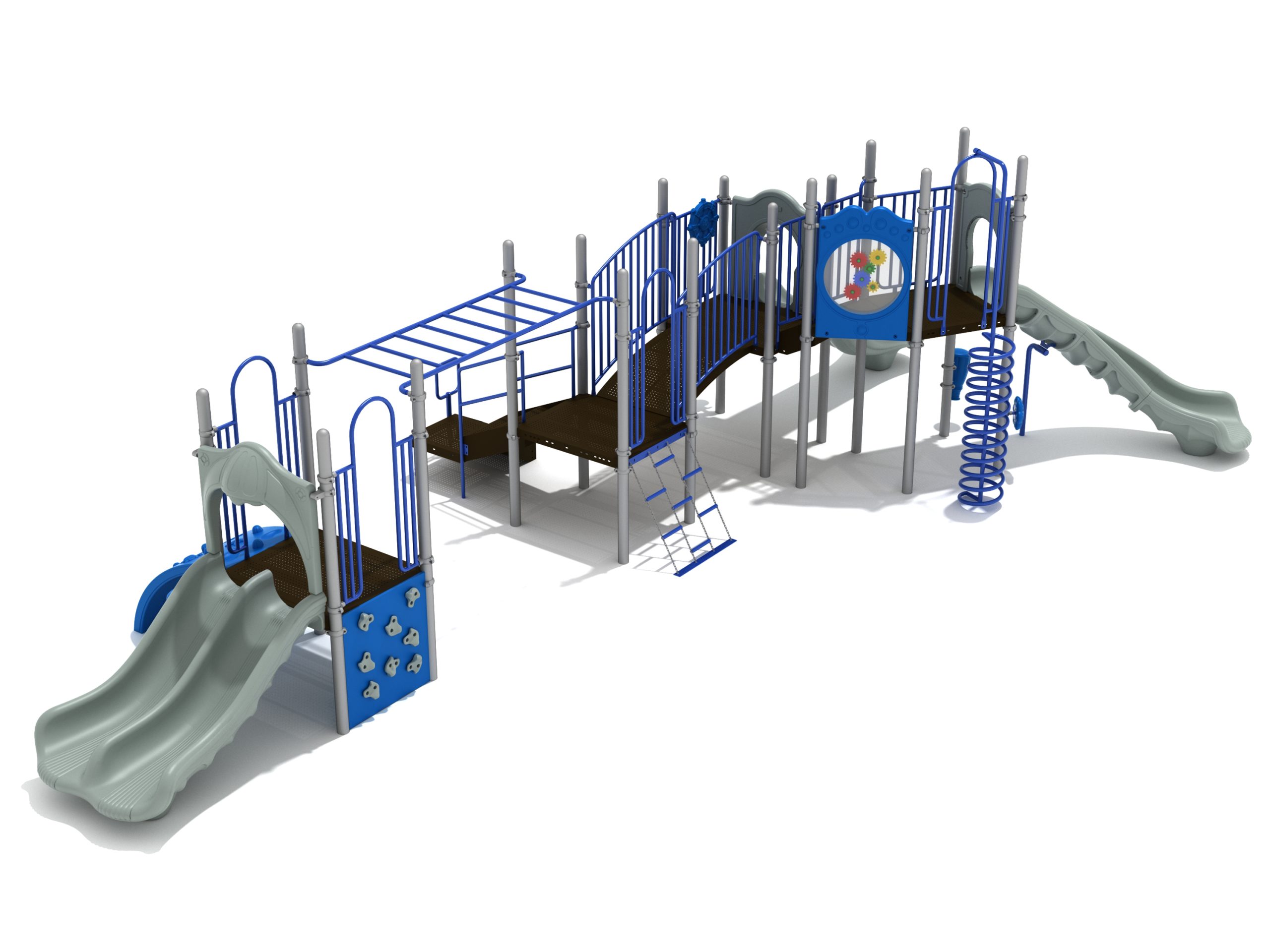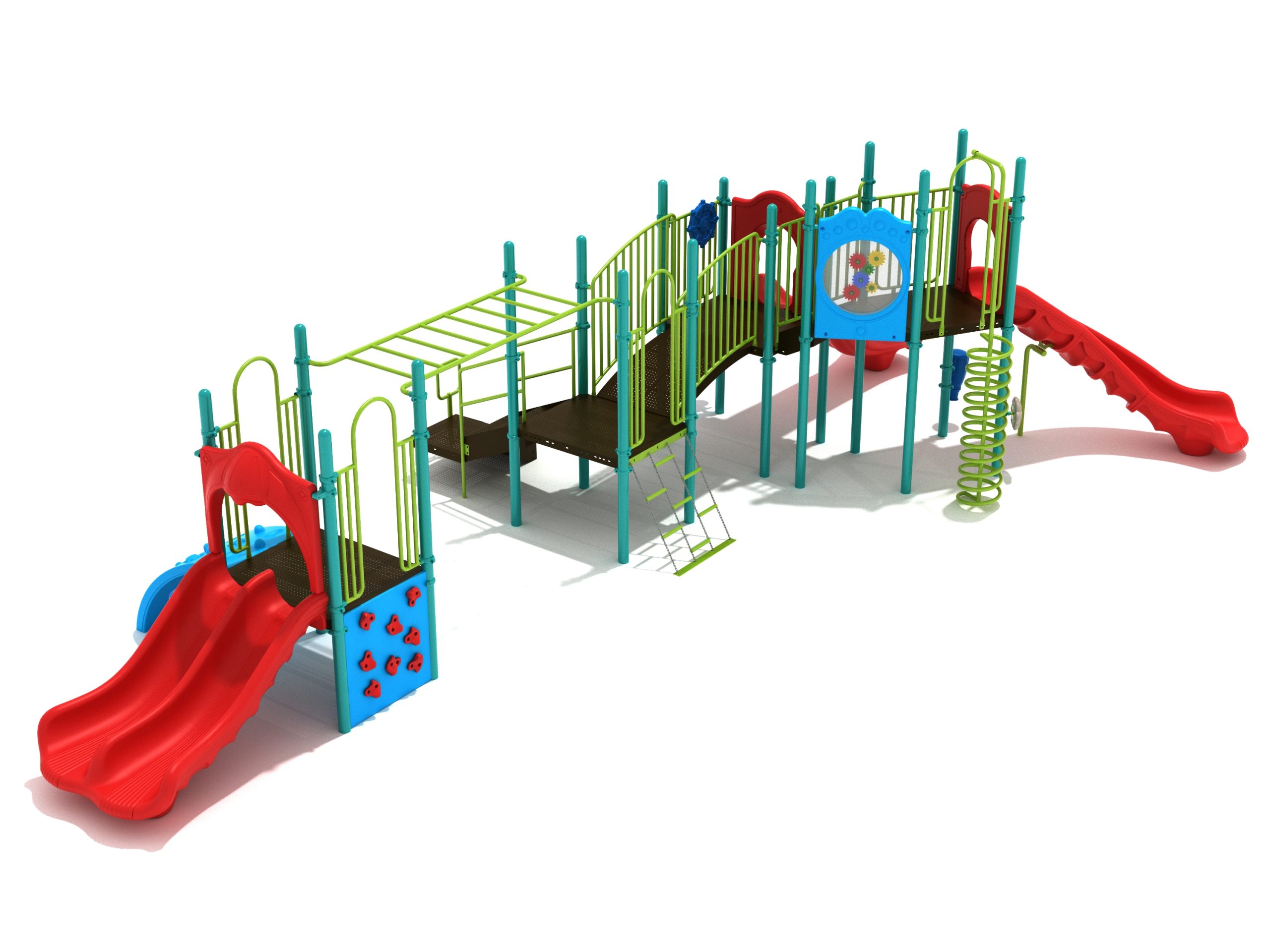 The Bayou Vista play system lets children explore different exciting features. Its thoughtful design accommodates 50 kids with a fall height of 60”. With 4 slides and different climbers, it offers an exciting array of activities designed to keep kids engaged. The Spiral Climber and the Sea Creature Climber though challenging, promote physical fitness among kids. It also has obstacles like the flexible Chain Climber and a demanding Vertical PE Rock Climbing Wall to keep kids active while they’re having a good time with their pals. These climbers provide excellent opportunities for exercise by engaging both arms & legs. Another key feature is an Overhead Straight-Rung Horizontal Ladder that challenges children to strengthen their upper body strength while swinging across. While on the deck, kids can also play around with the Gear Panel and afterward slide their way down using the slide of their liking. The Bayou Vista combines fitness with fun. That’s why it is a suitable pick for busy playgrounds.