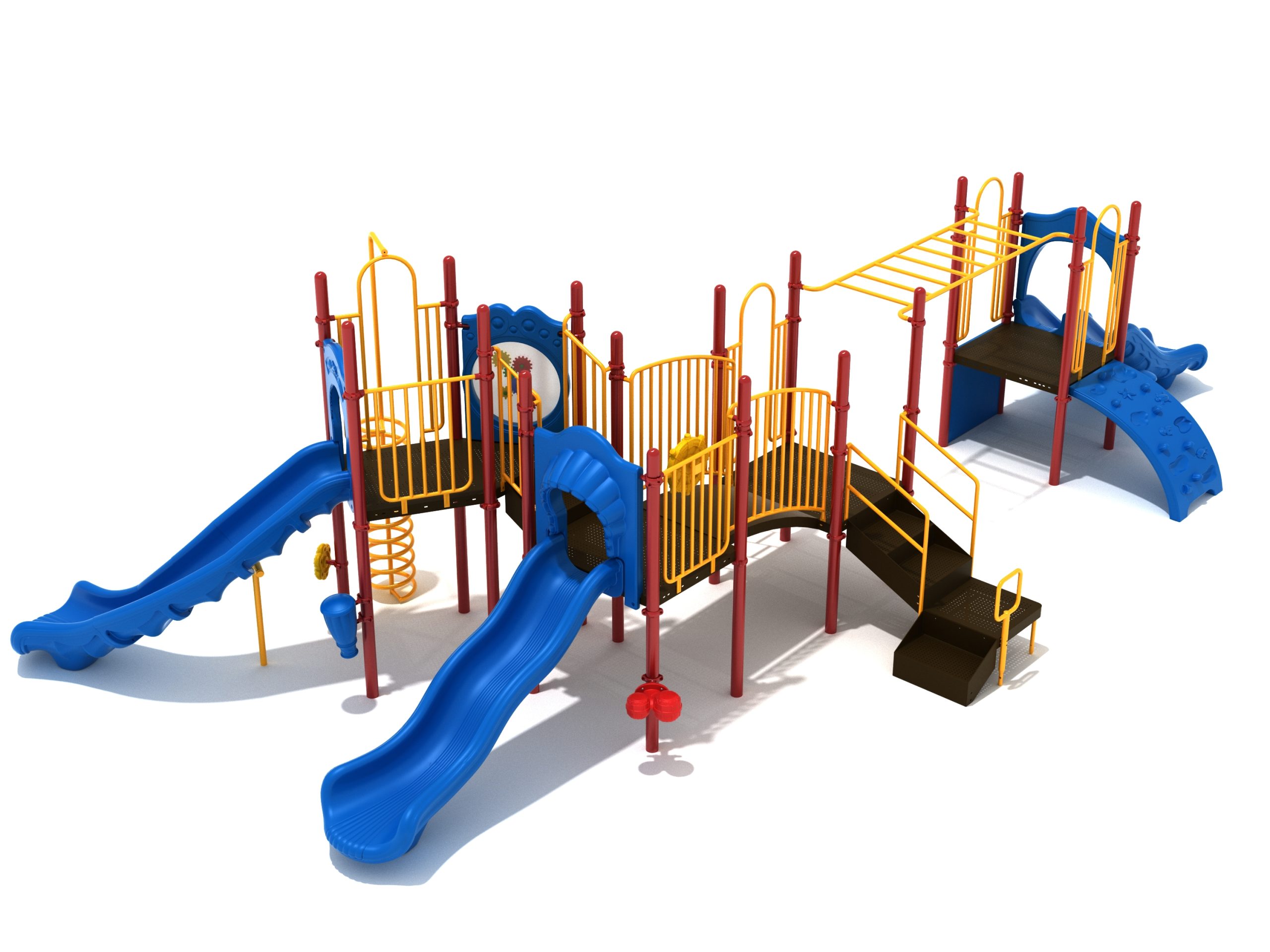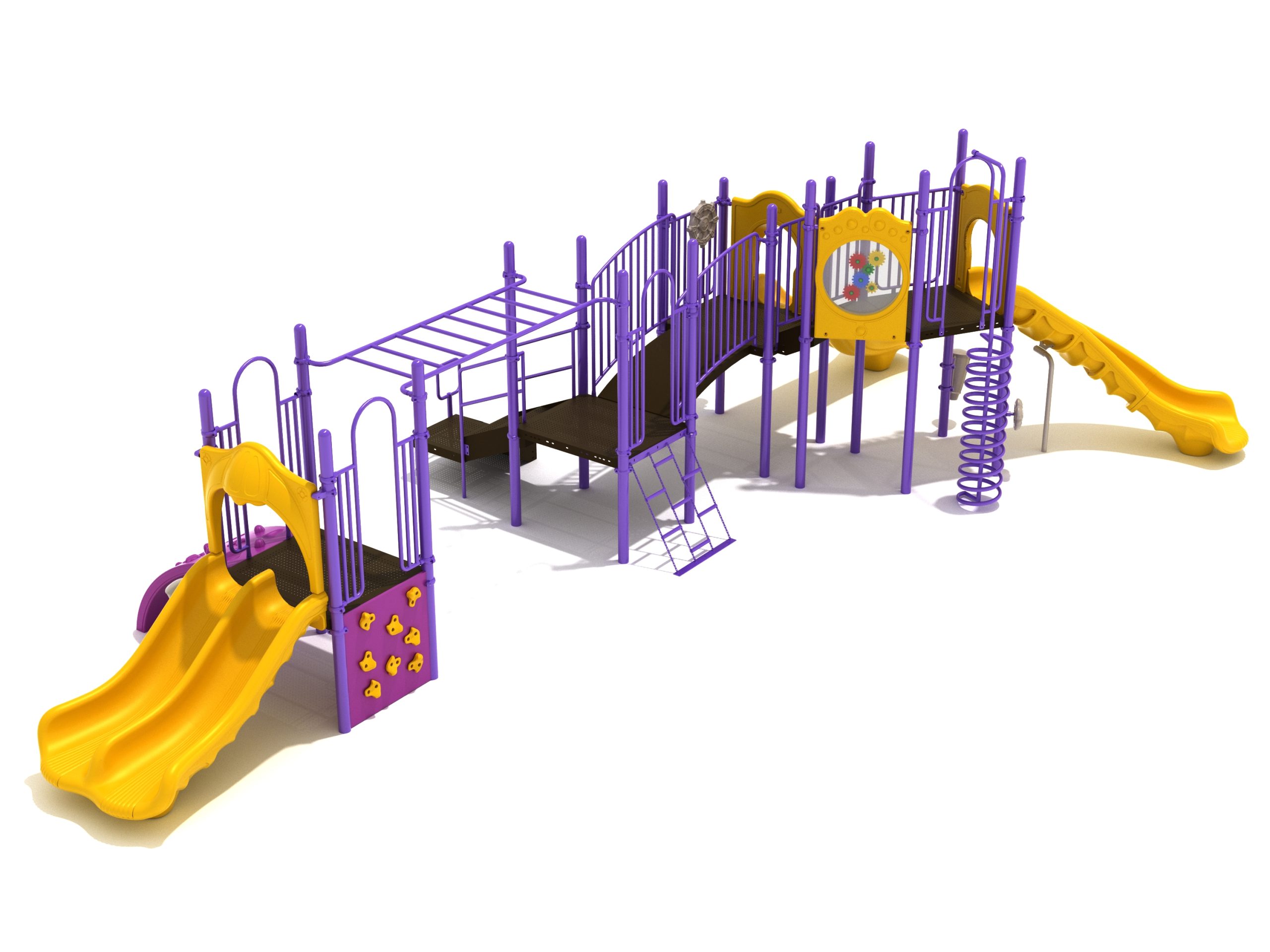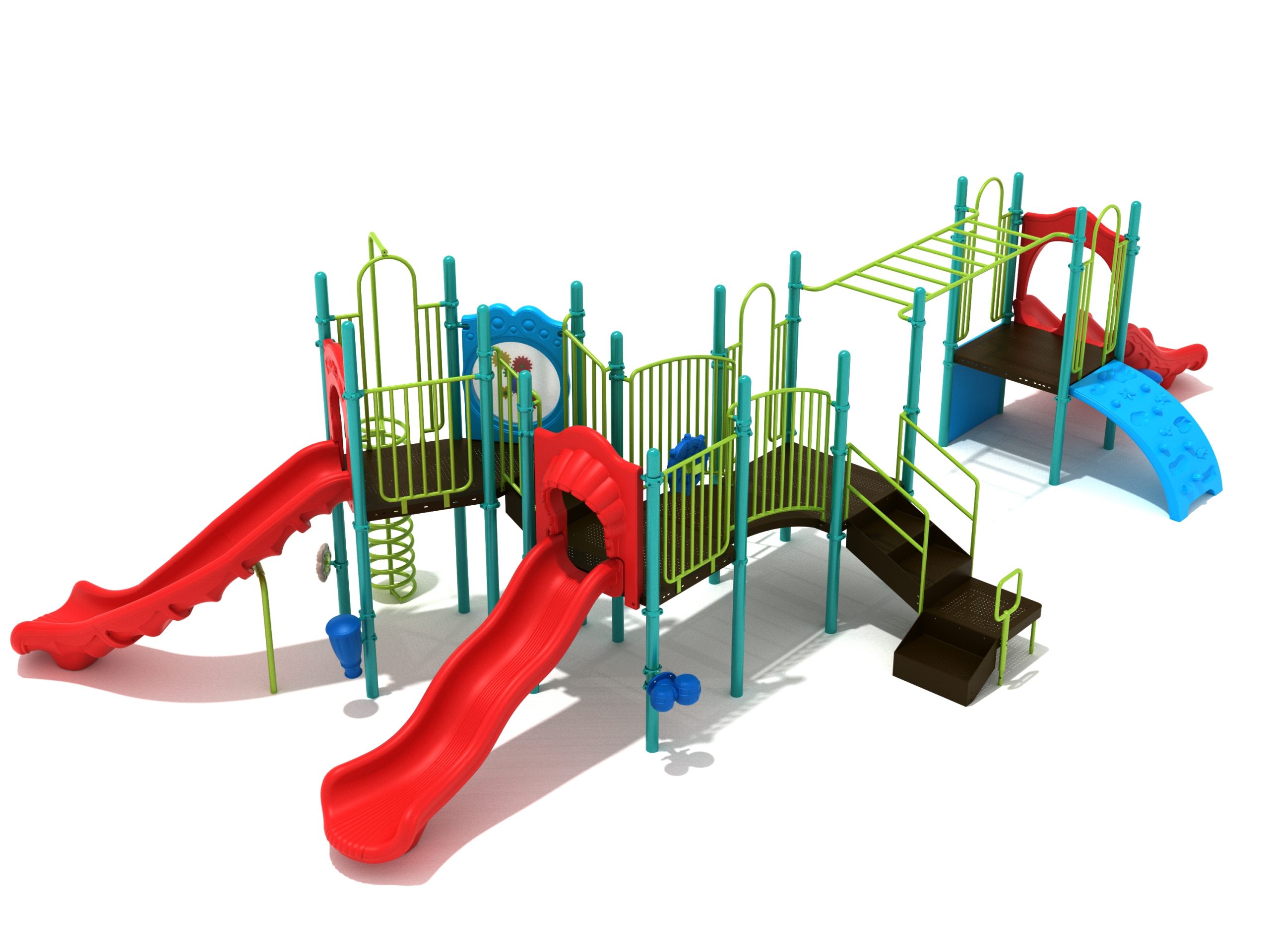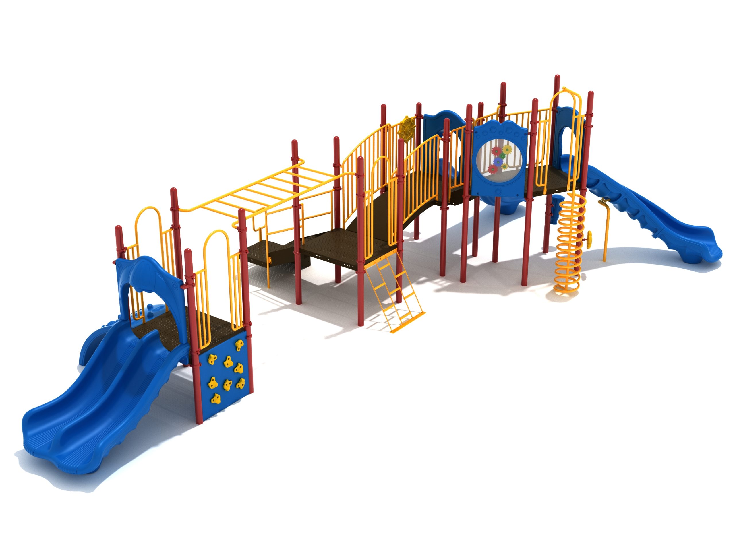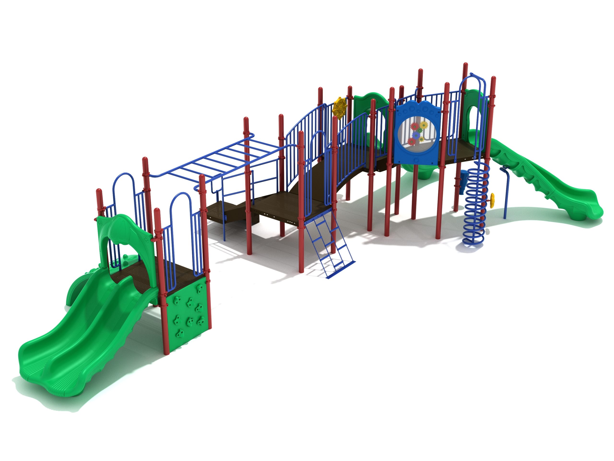 The Bayou Vista play system lets children explore different exciting features. Its thoughtful design accommodates 50 kids with a fall height of 60”. With 4 slides and different climbers, it offers an exciting array of activities designed to keep kids engaged. The Spiral Climber and the Sea Creature Climber though challenging, promote physical fitness among kids. It also has obstacles like the flexible Chain Climber and a demanding Vertical PE Rock Climbing Wall to keep kids active while they’re having a good time with their pals. These climbers provide excellent opportunities for exercise by engaging both arms & legs. Another key feature is an Overhead Straight-Rung Horizontal Ladder that challenges children to strengthen their upper body strength while swinging across. While on the deck, kids can also play around with the Gear Panel and afterward slide their way down using the slide of their liking. The Bayou Vista combines fitness with fun. That’s why it is a suitable pick for busy playgrounds.