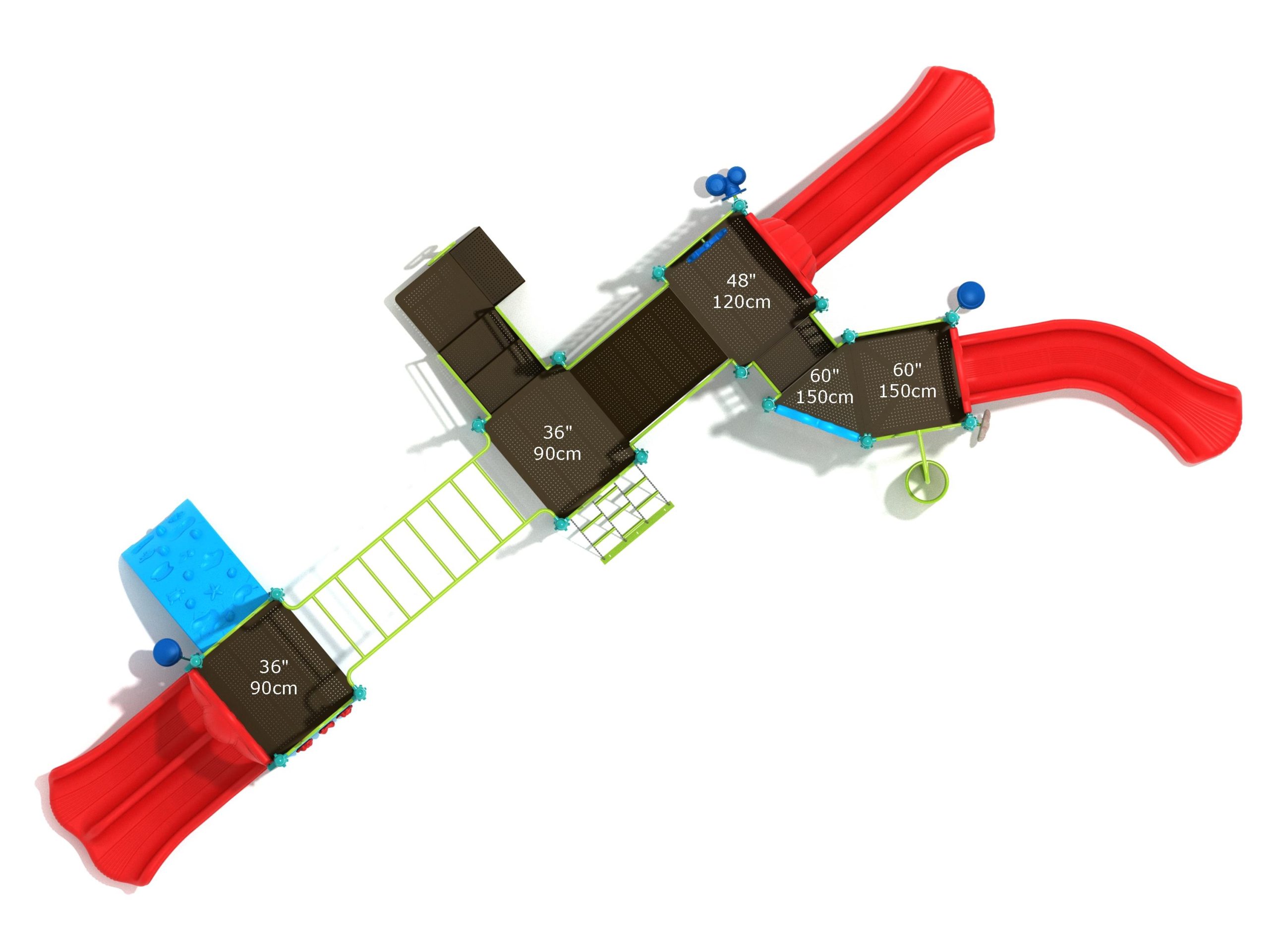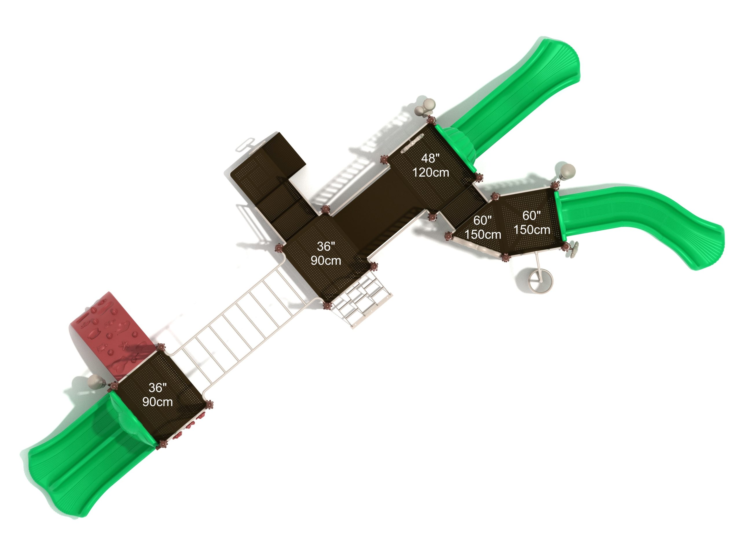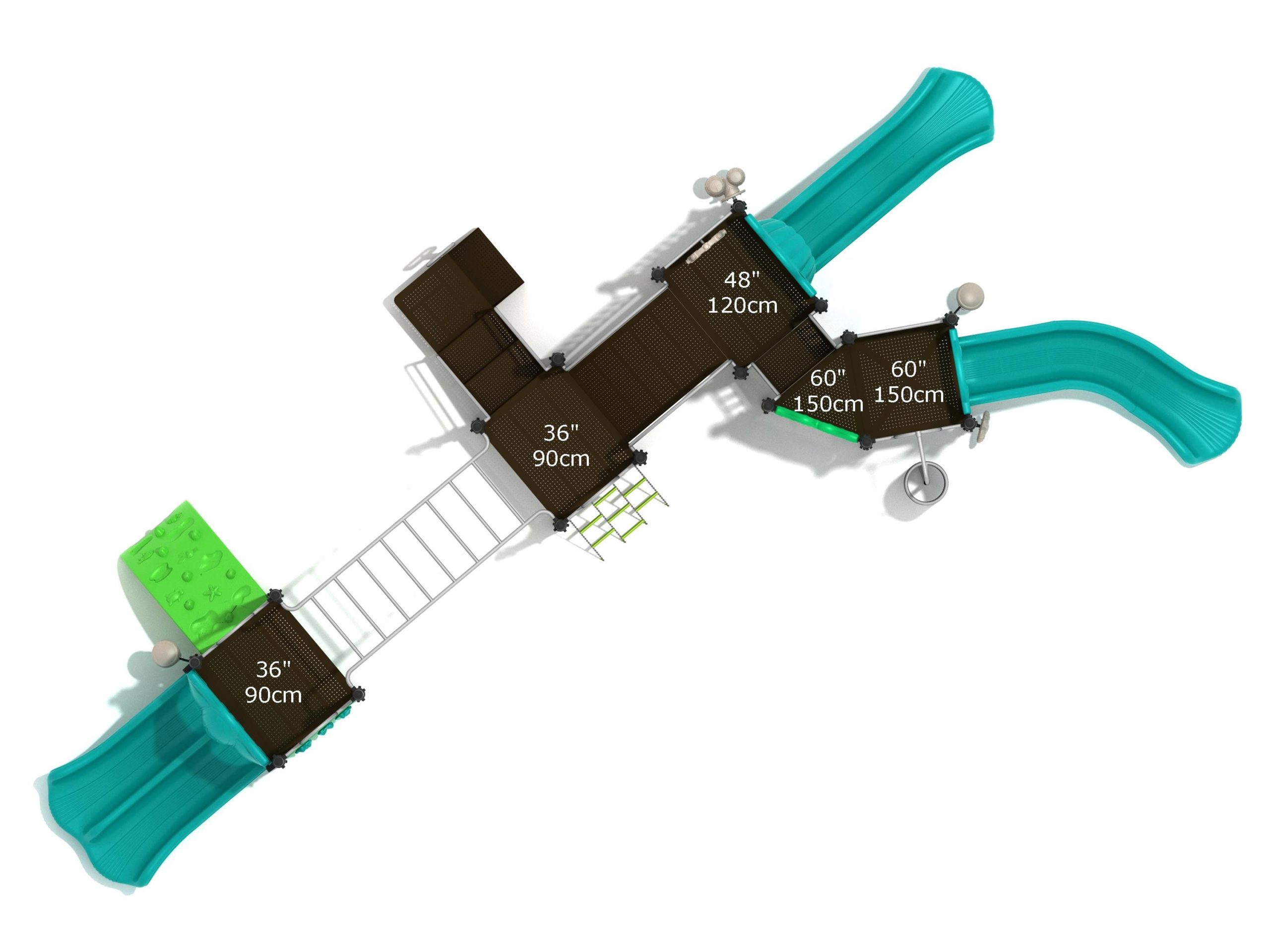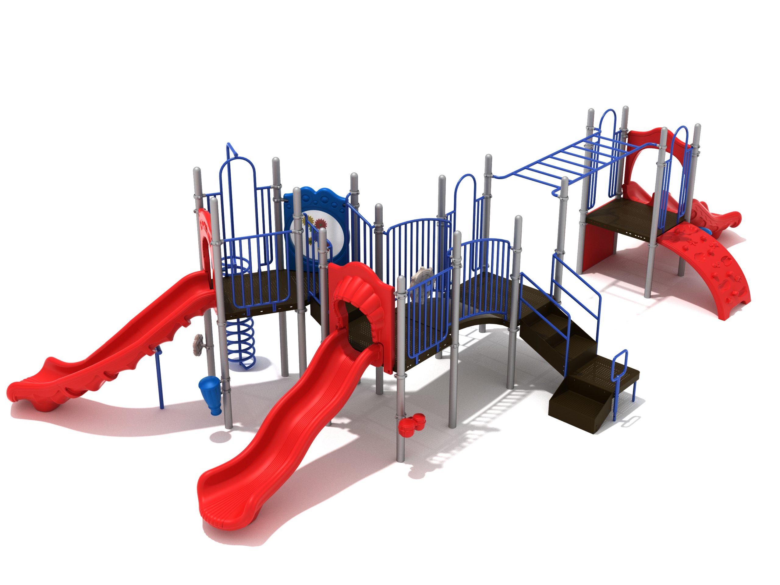 The Bayou Vista play system lets children explore different exciting features. Its thoughtful design accommodates 50 kids with a fall height of 60”. With 4 slides and different climbers, it offers an exciting array of activities designed to keep kids engaged. The Spiral Climber and the Sea Creature Climber though challenging, promote physical fitness among kids. It also has obstacles like the flexible Chain Climber and a demanding Vertical PE Rock Climbing Wall to keep kids active while they’re having a good time with their pals. These climbers provide excellent opportunities for exercise by engaging both arms & legs. Another key feature is an Overhead Straight-Rung Horizontal Ladder that challenges children to strengthen their upper body strength while swinging across. While on the deck, kids can also play around with the Gear Panel and afterward slide their way down using the slide of their liking. The Bayou Vista combines fitness with fun. That’s why it is a suitable pick for busy playgrounds.