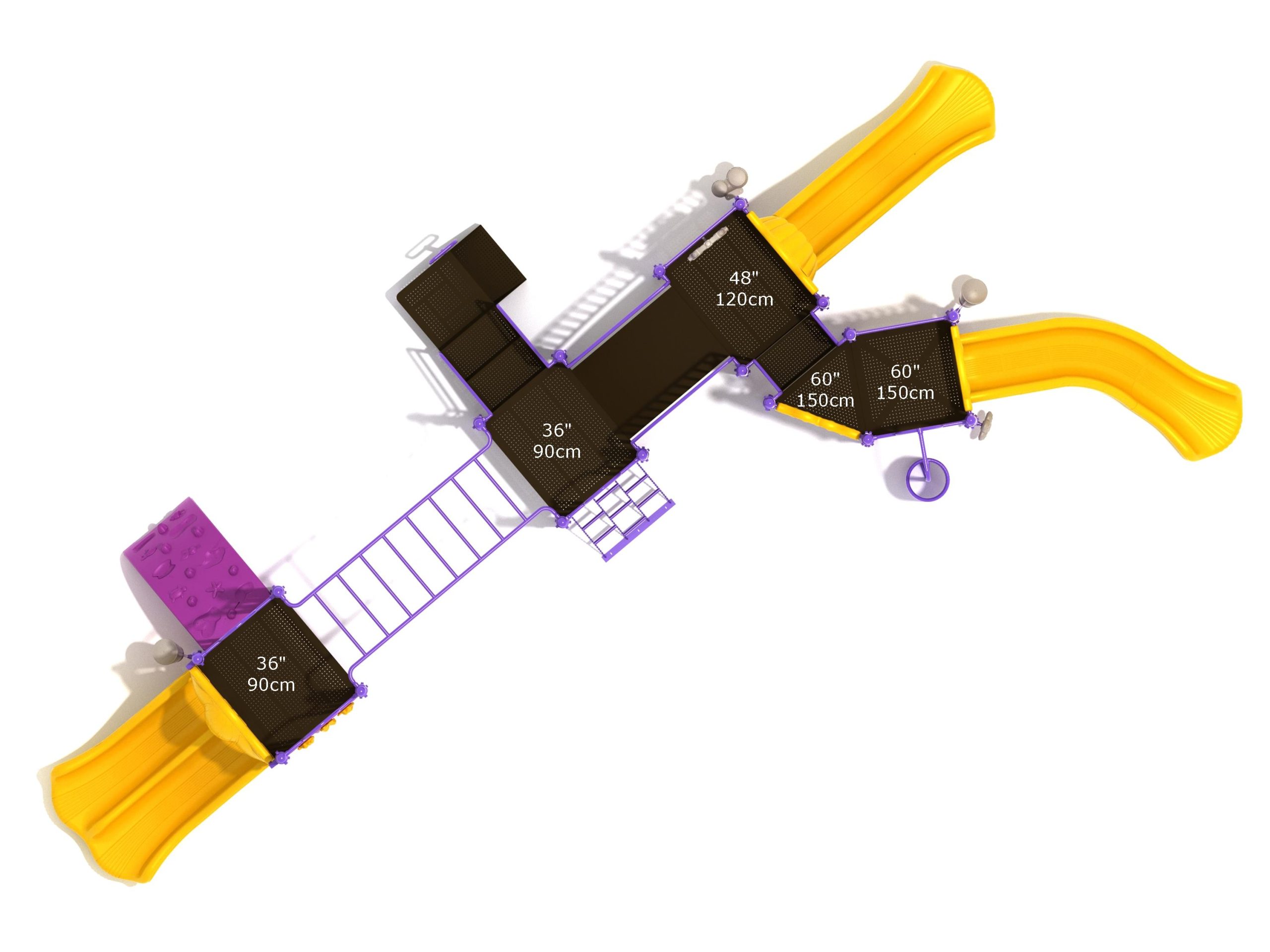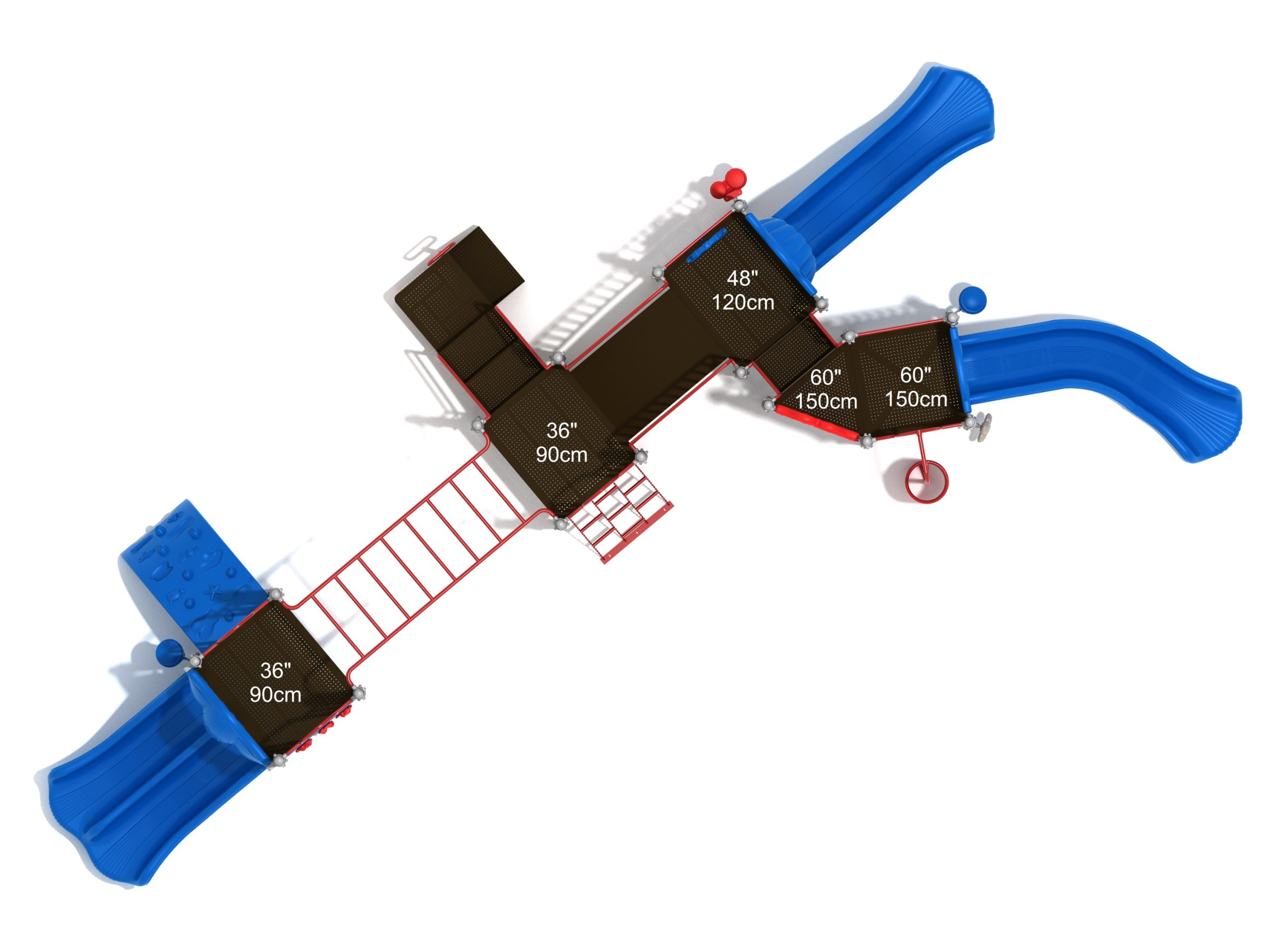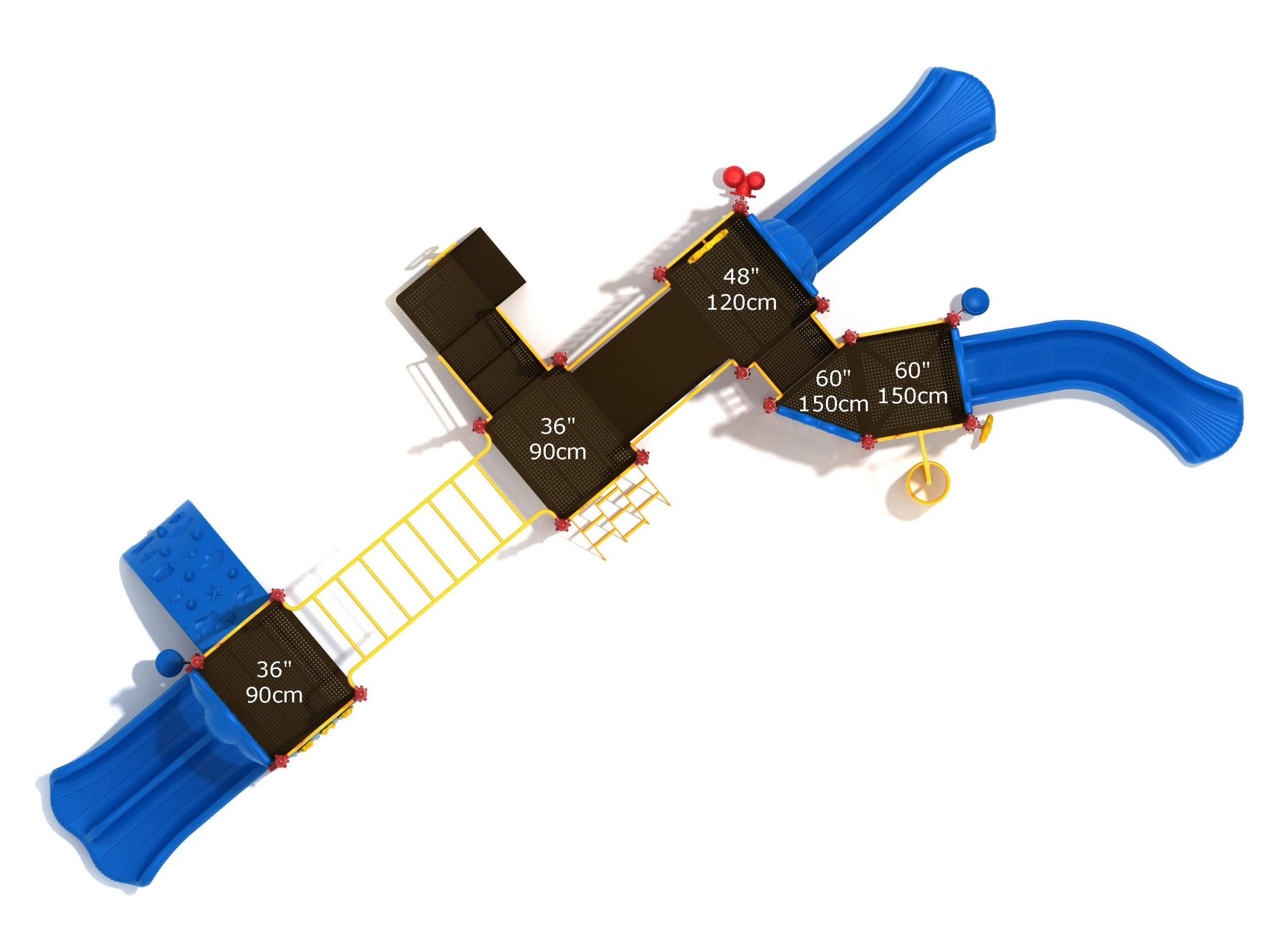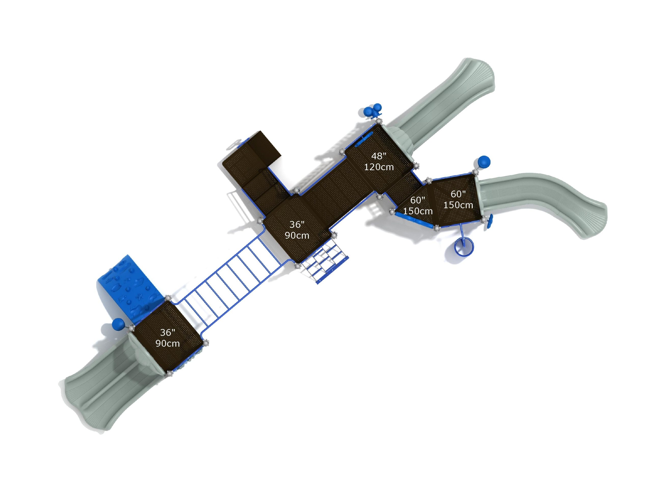 The Bayou Vista play system lets children explore different exciting features. Its thoughtful design accommodates 50 kids with a fall height of 60”. With 4 slides and different climbers, it offers an exciting array of activities designed to keep kids engaged. The Spiral Climber and the Sea Creature Climber though challenging, promote physical fitness among kids. It also has obstacles like the flexible Chain Climber and a demanding Vertical PE Rock Climbing Wall to keep kids active while they’re having a good time with their pals. These climbers provide excellent opportunities for exercise by engaging both arms & legs. Another key feature is an Overhead Straight-Rung Horizontal Ladder that challenges children to strengthen their upper body strength while swinging across. While on the deck, kids can also play around with the Gear Panel and afterward slide their way down using the slide of their liking. The Bayou Vista combines fitness with fun. That’s why it is a suitable pick for busy playgrounds.