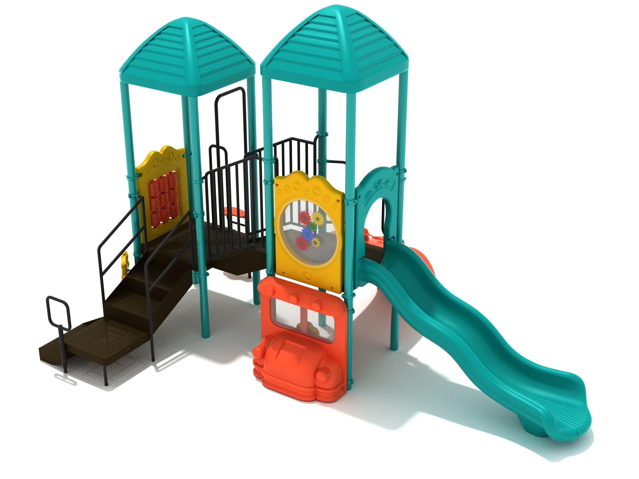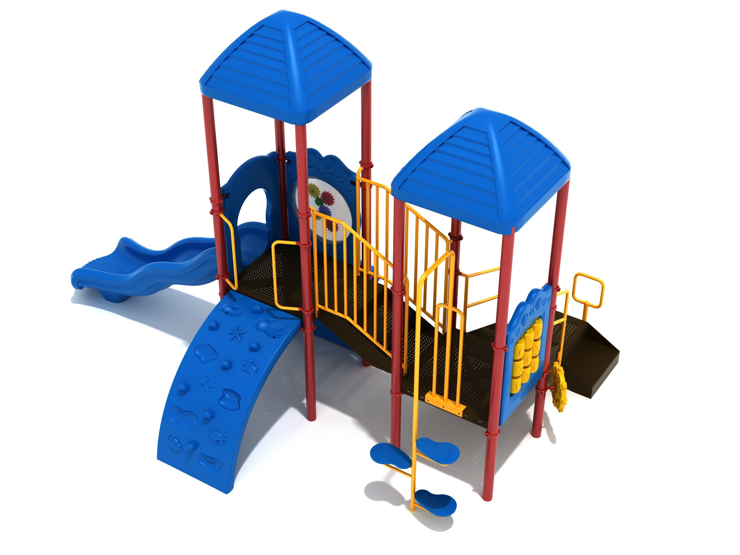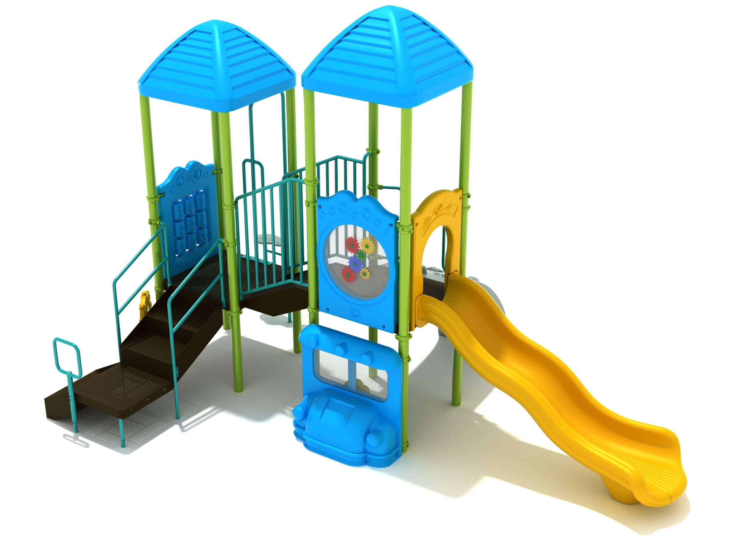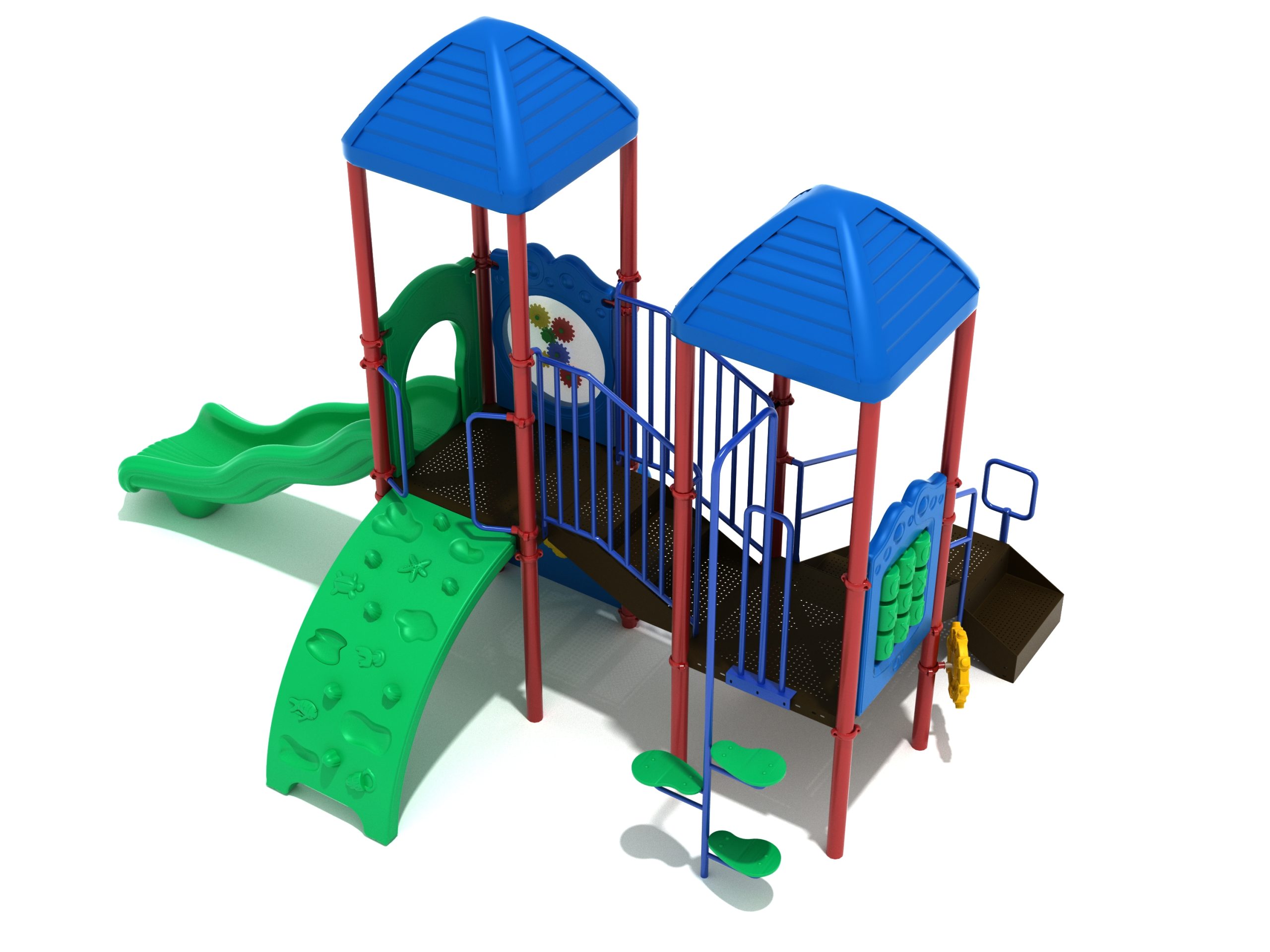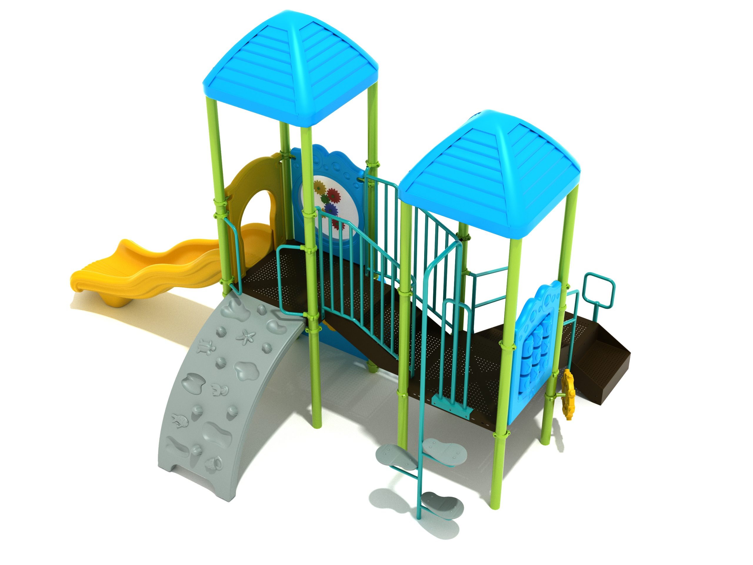 The Bellevue play structure has a little bit of everything to provide a fun and engaging play time for children. Three activity panels are included to boost cognitive development through logic and imagination. The panels included are a tic tac toe panel, gear panel, and a car panel. Ascending the structure is just as easy as climbing the sea creature climber, pea pod climber, or the simple transfer station. These fun climbers add exercise to play time and can greatly benefit the physical development of kids. A wave slide provides a quick exit back to the ground. A ship’s wheel is post-mounted at ground level as well. Two line roofs shade the decks of the structure, protecting children from the sun as they play. The Bellevue structure is designed for children ages 2 to 12 years and is ADA compliant. Be sure to use a loose-fill safety surface or a poured rubber surface to help prevent injury.