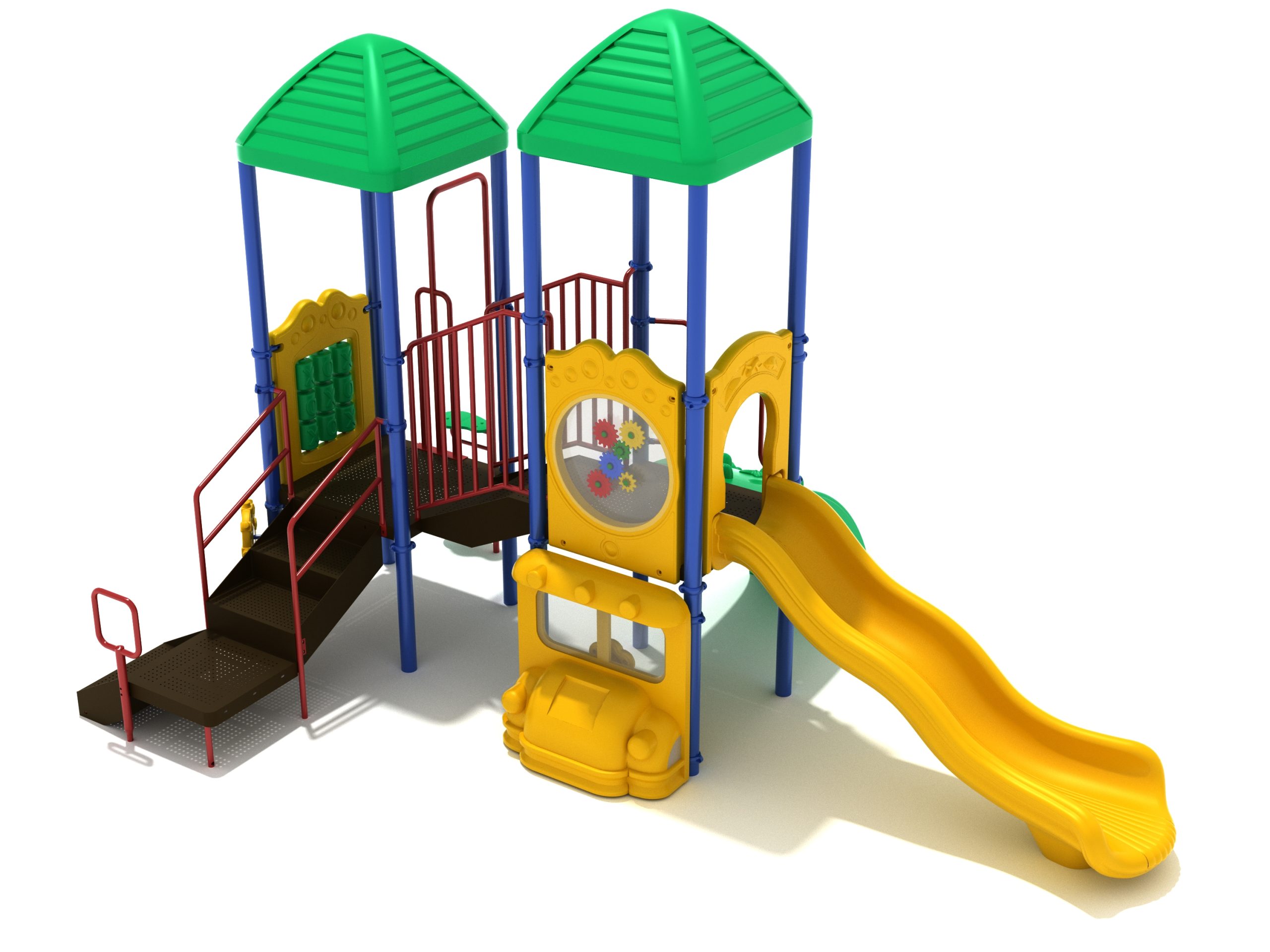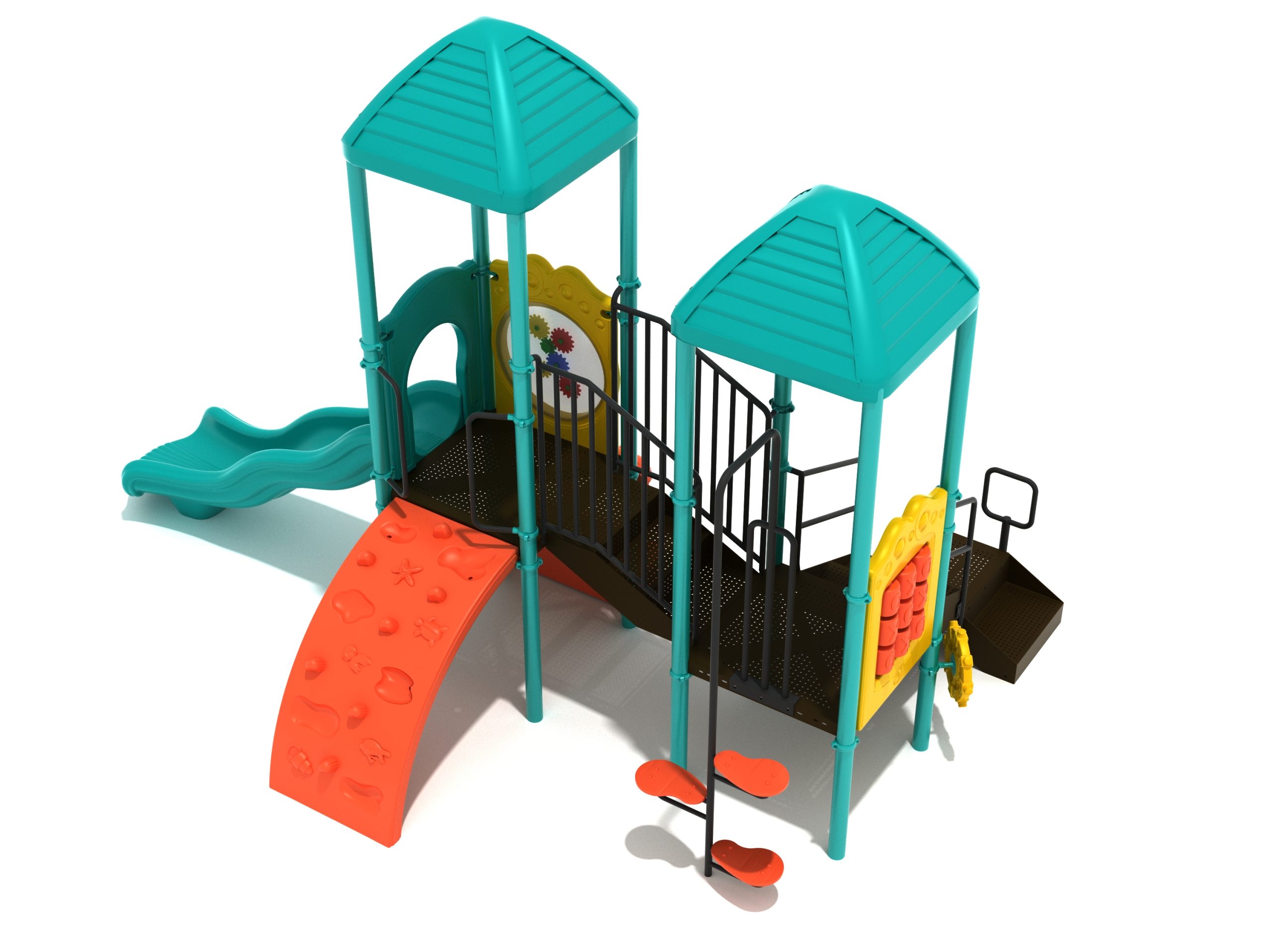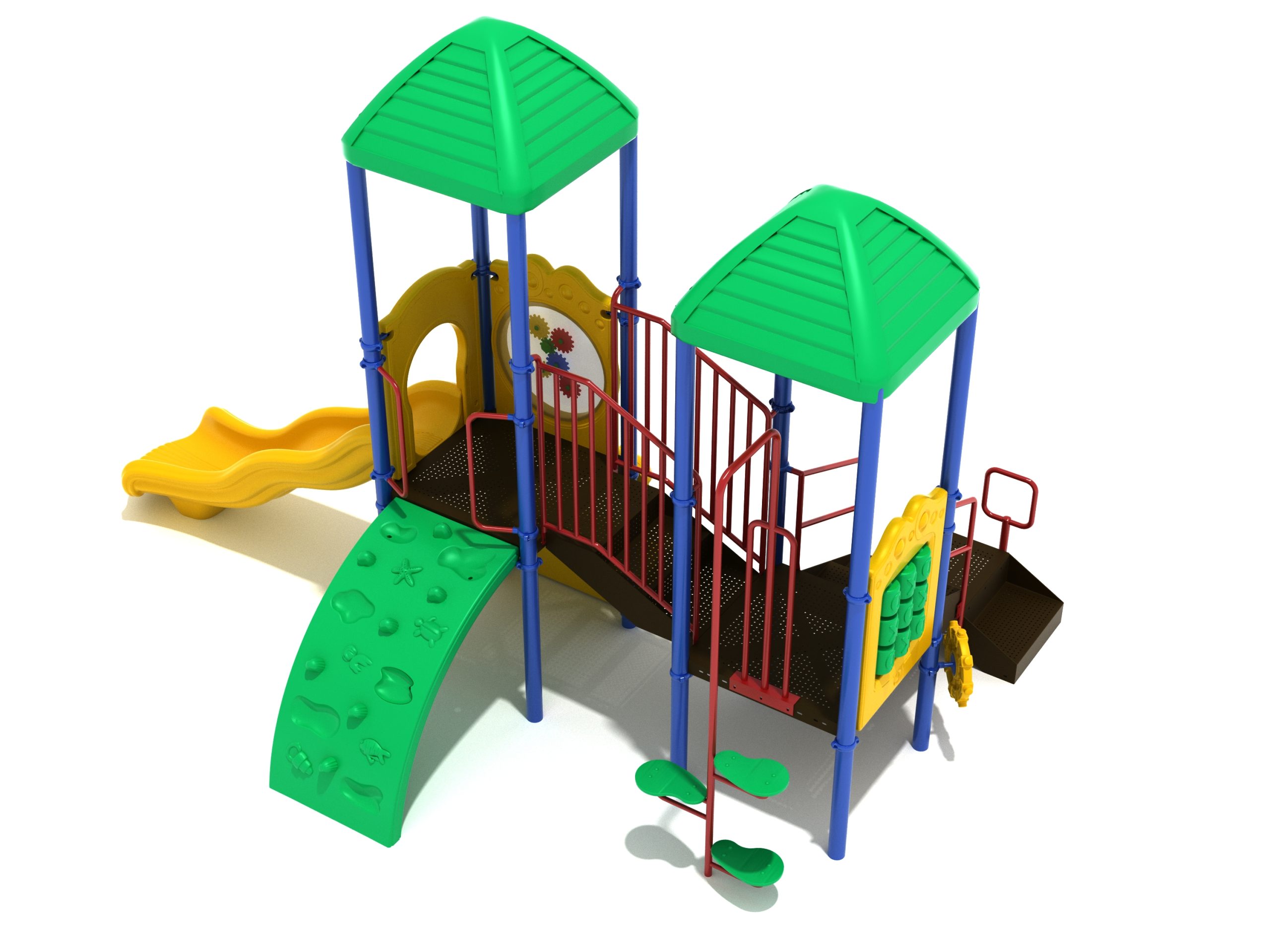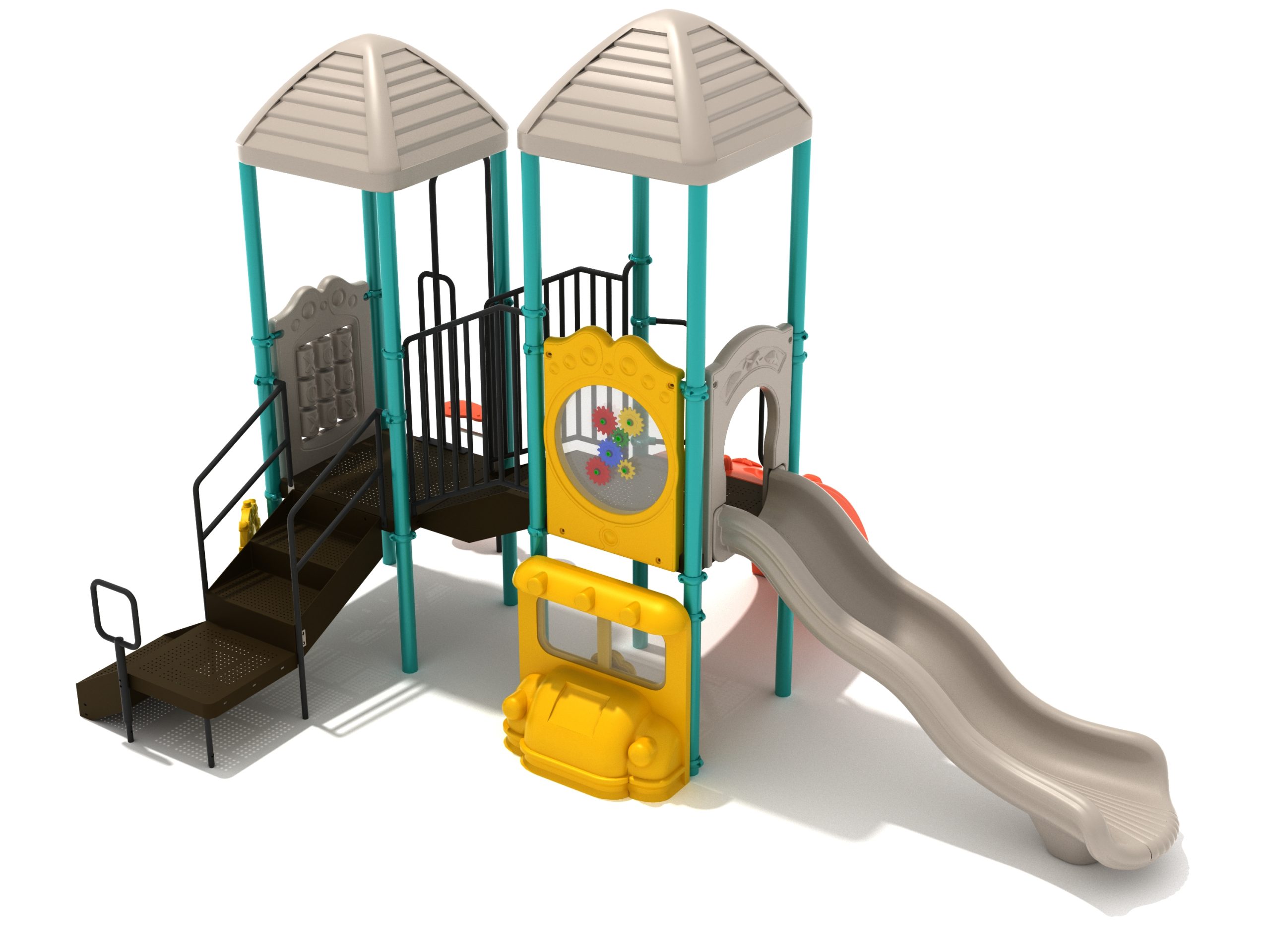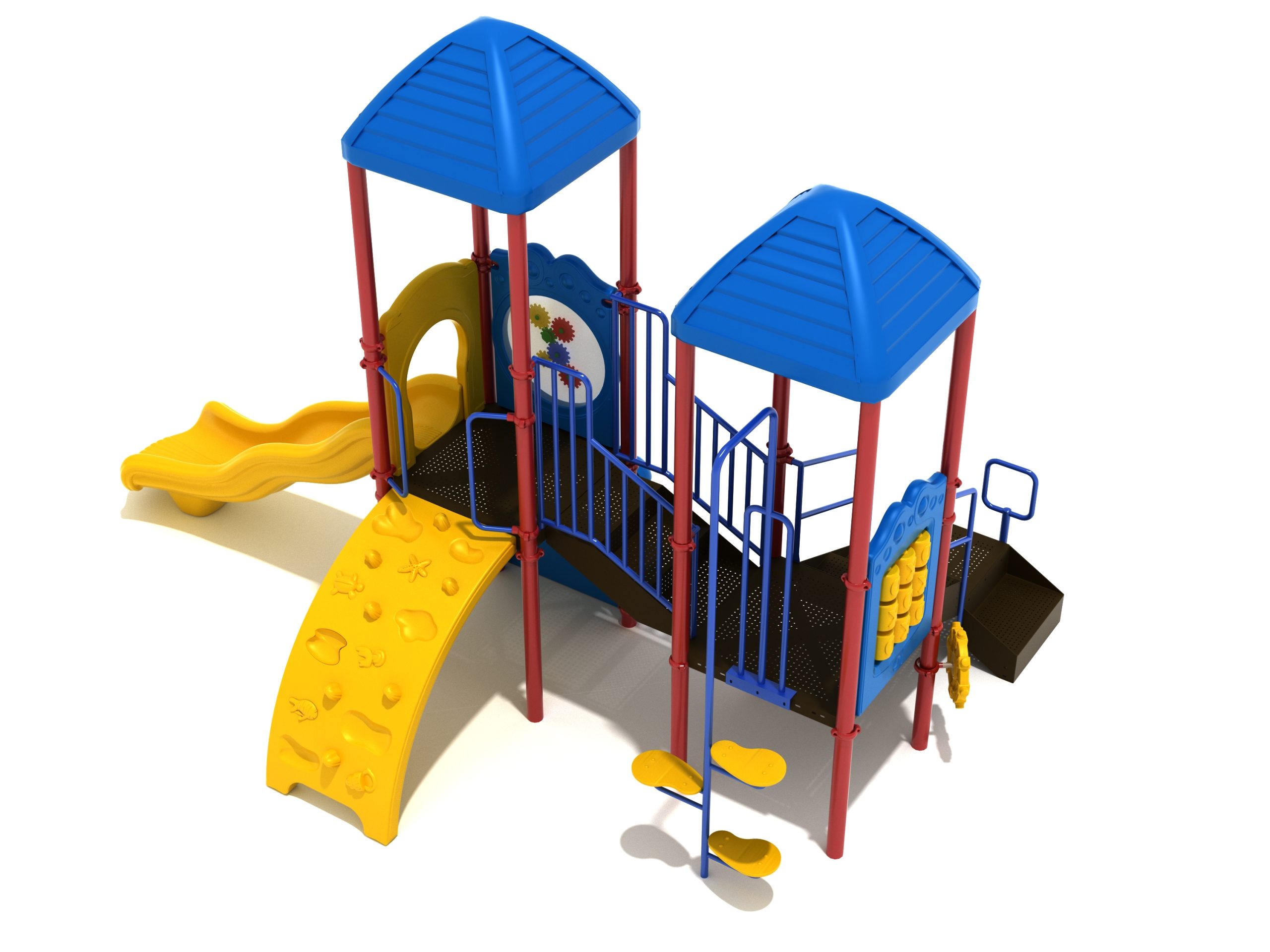 The Bellevue play structure has a little bit of everything to provide a fun and engaging play time for children. Three activity panels are included to boost cognitive development through logic and imagination. The panels included are a tic tac toe panel, gear panel, and a car panel. Ascending the structure is just as easy as climbing the sea creature climber, pea pod climber, or the simple transfer station. These fun climbers add exercise to play time and can greatly benefit the physical development of kids. A wave slide provides a quick exit back to the ground. A ship’s wheel is post-mounted at ground level as well. Two line roofs shade the decks of the structure, protecting children from the sun as they play. The Bellevue structure is designed for children ages 2 to 12 years and is ADA compliant. Be sure to use a loose-fill safety surface or a poured rubber surface to help prevent injury.