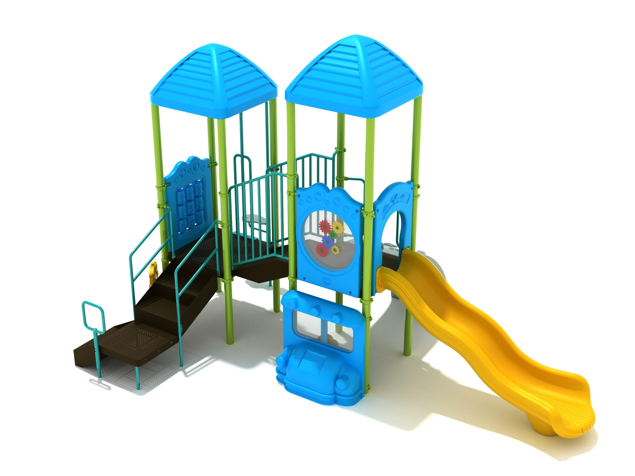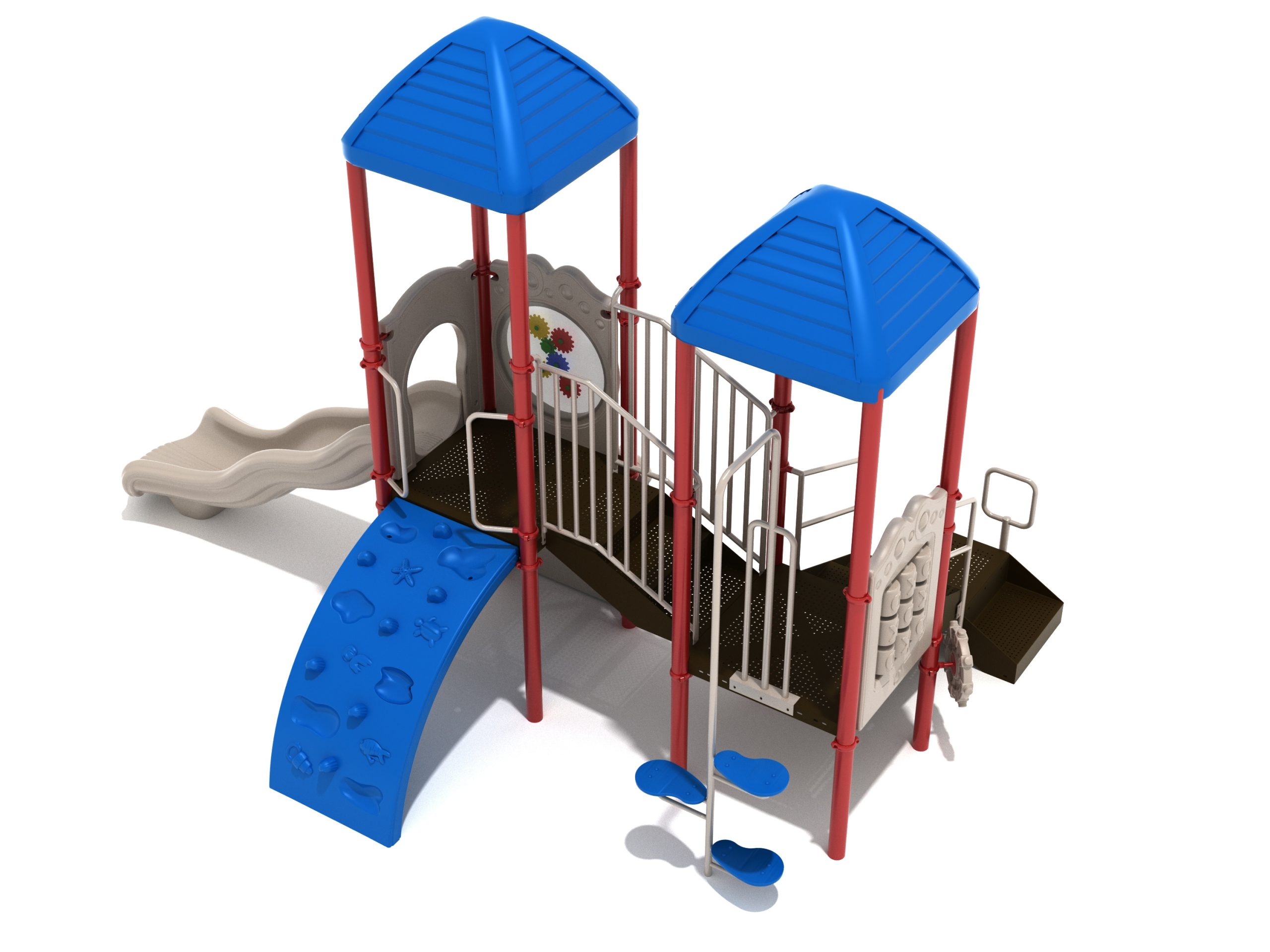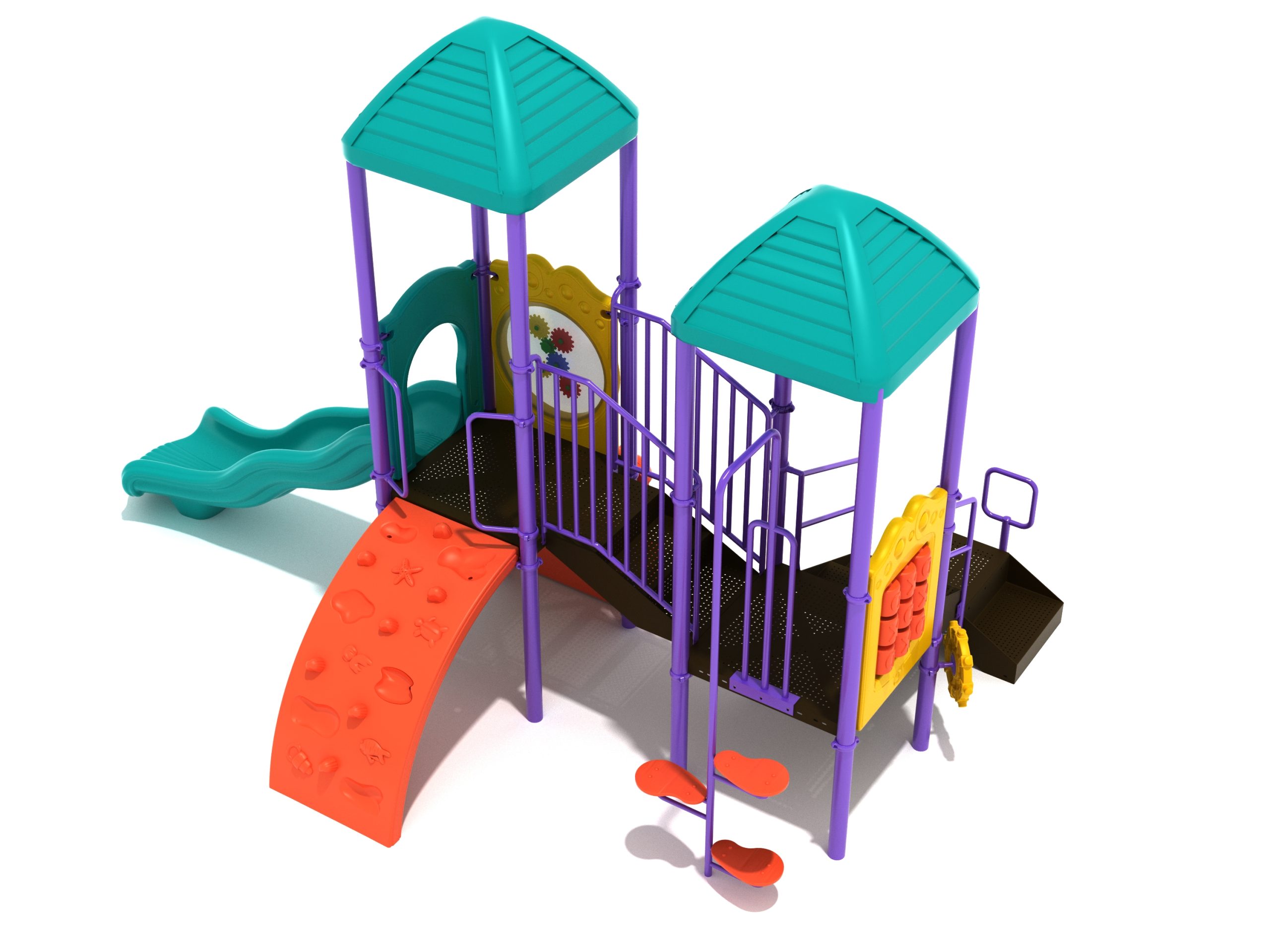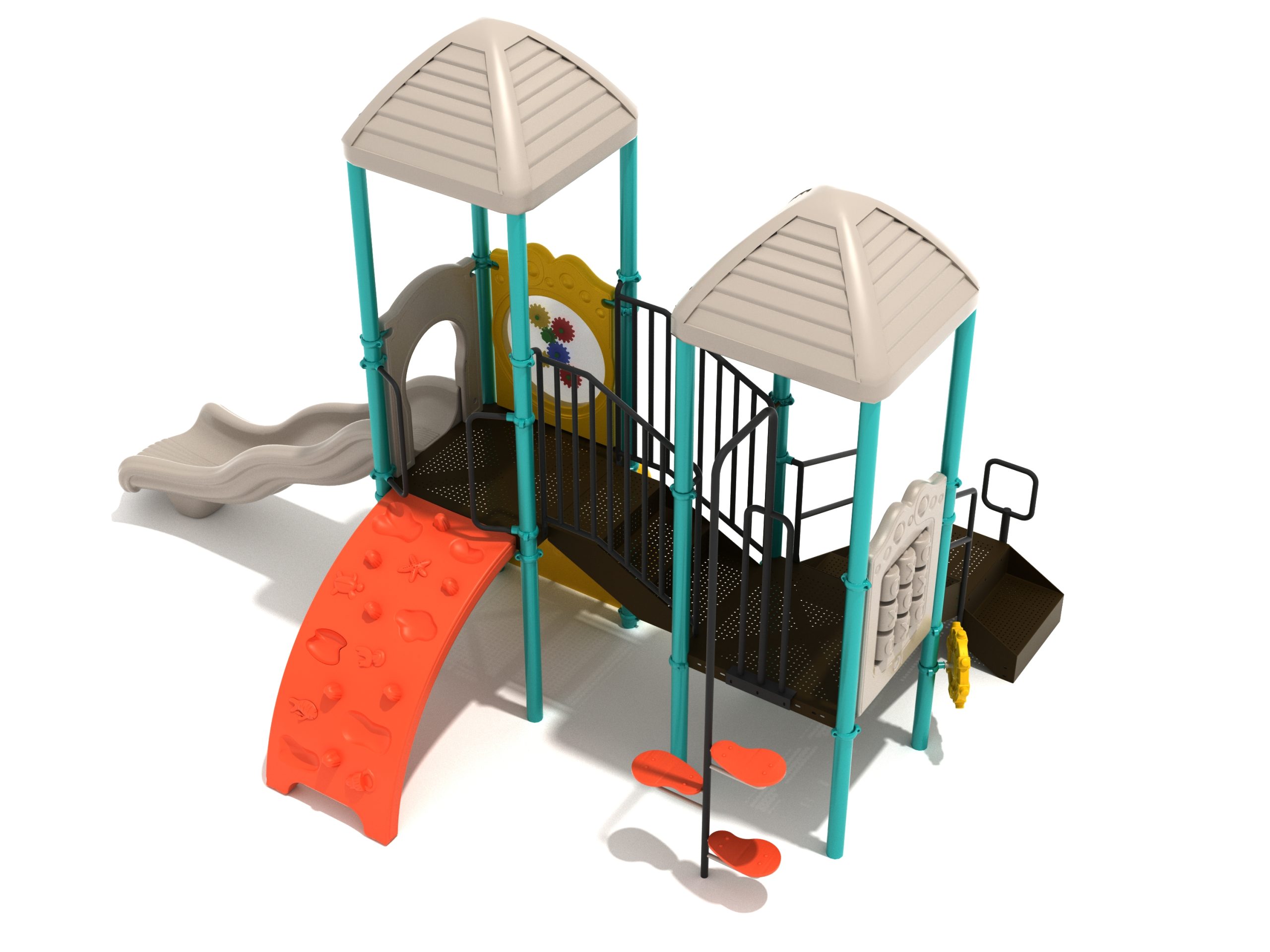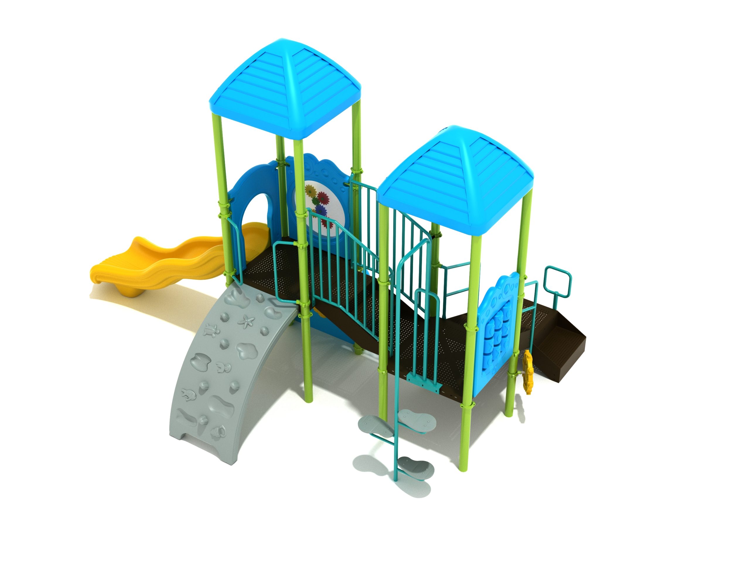 The Bellevue play structure has a little bit of everything to provide a fun and engaging play time for children. Three activity panels are included to boost cognitive development through logic and imagination. The panels included are a tic tac toe panel, gear panel, and a car panel. Ascending the structure is just as easy as climbing the sea creature climber, pea pod climber, or the simple transfer station. These fun climbers add exercise to play time and can greatly benefit the physical development of kids. A wave slide provides a quick exit back to the ground. A ship’s wheel is post-mounted at ground level as well. Two line roofs shade the decks of the structure, protecting children from the sun as they play. The Bellevue structure is designed for children ages 2 to 12 years and is ADA compliant. Be sure to use a loose-fill safety surface or a poured rubber surface to help prevent injury.