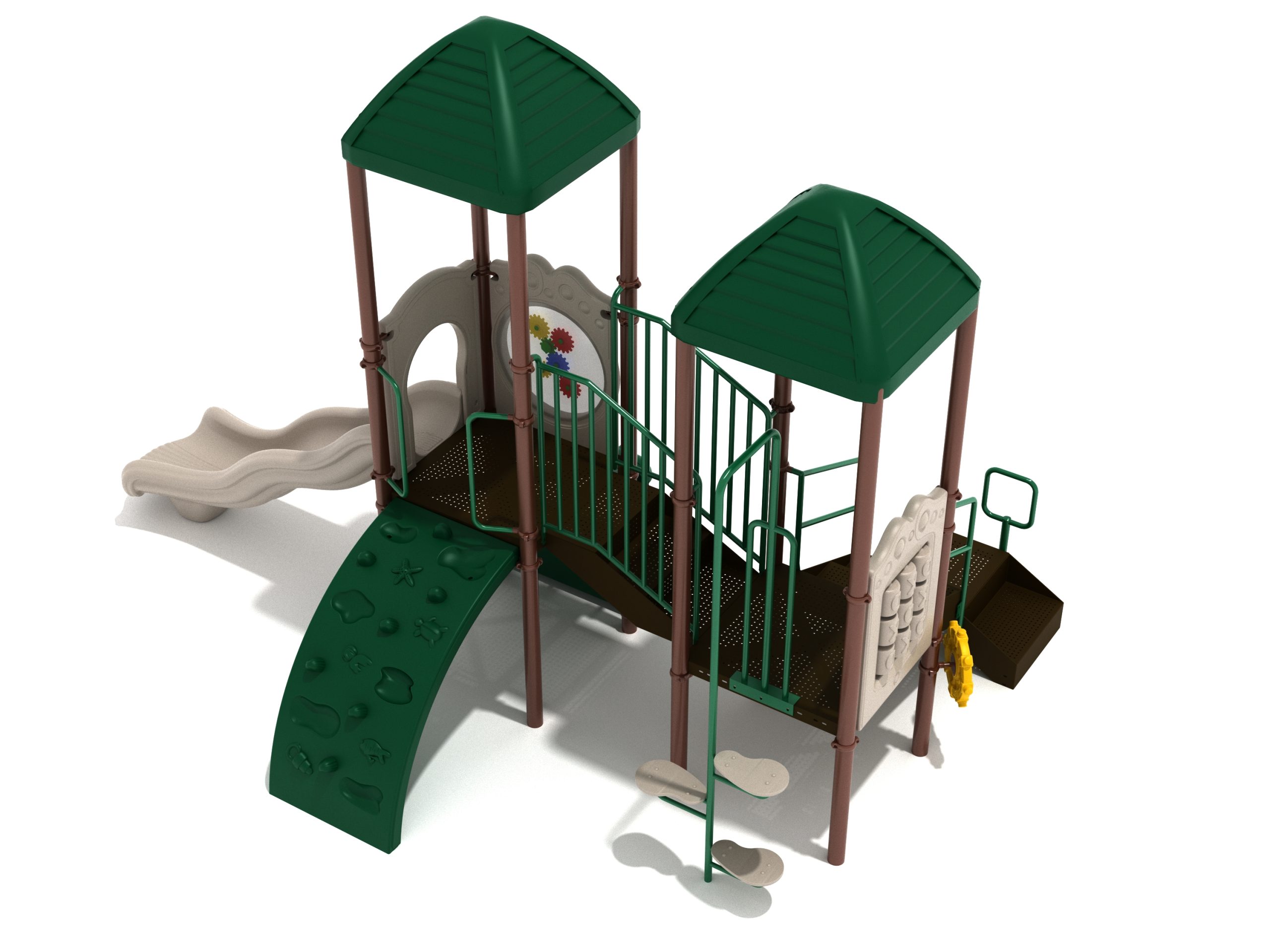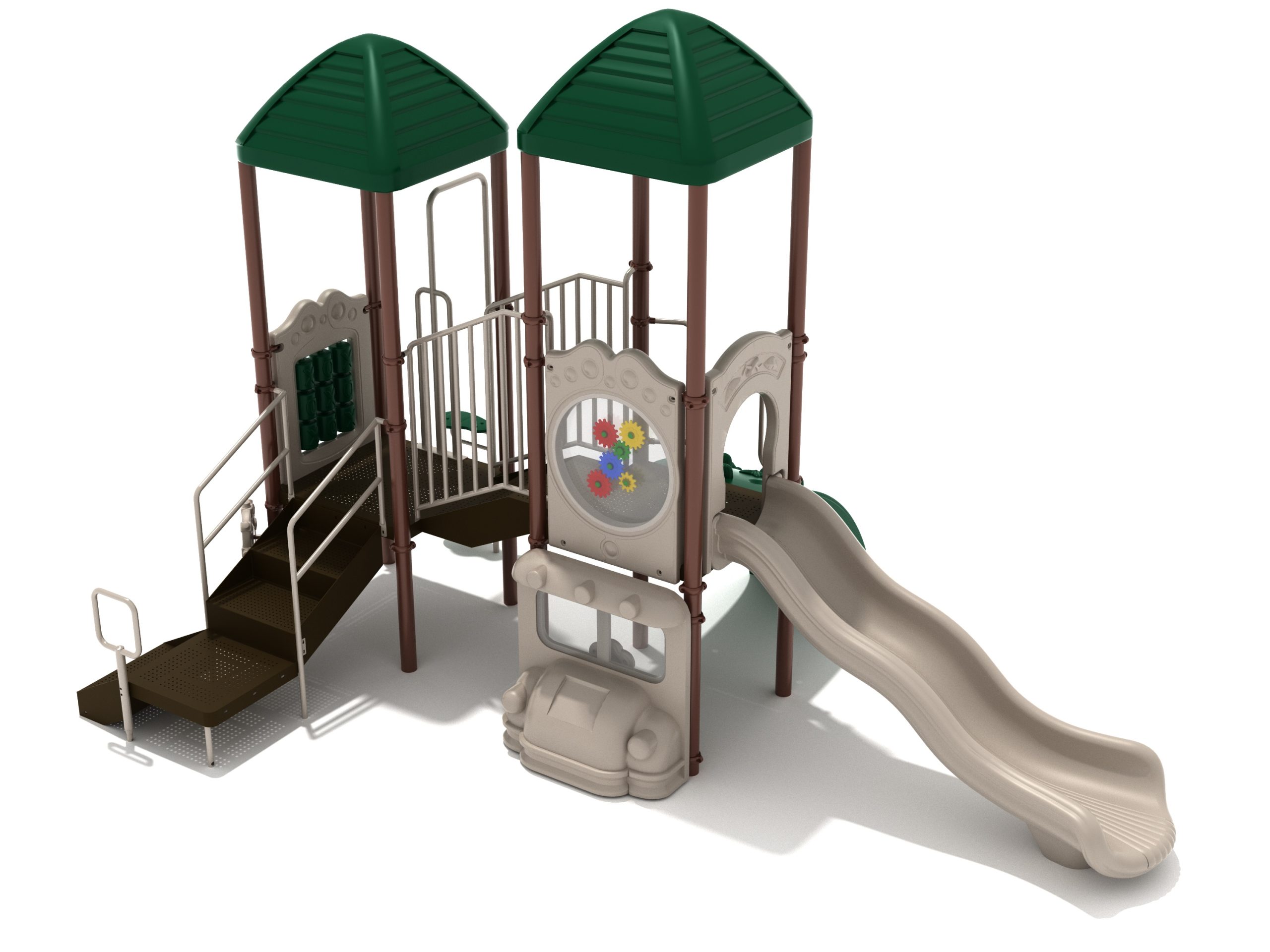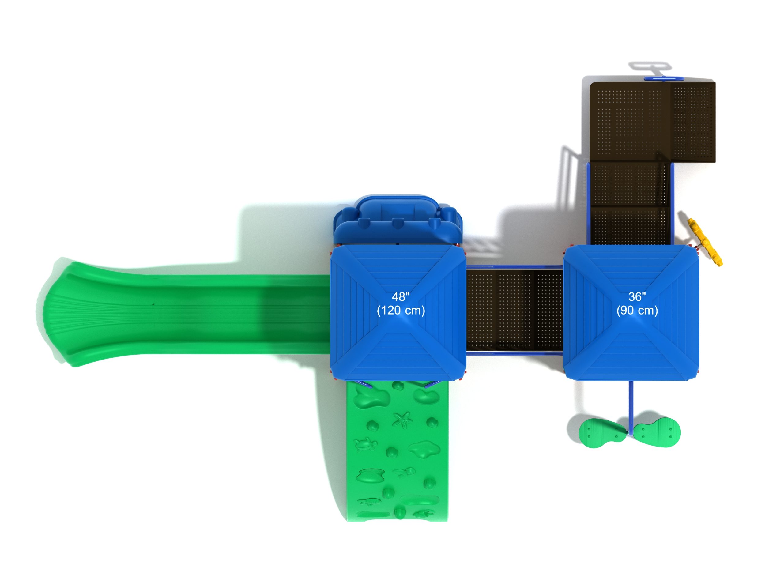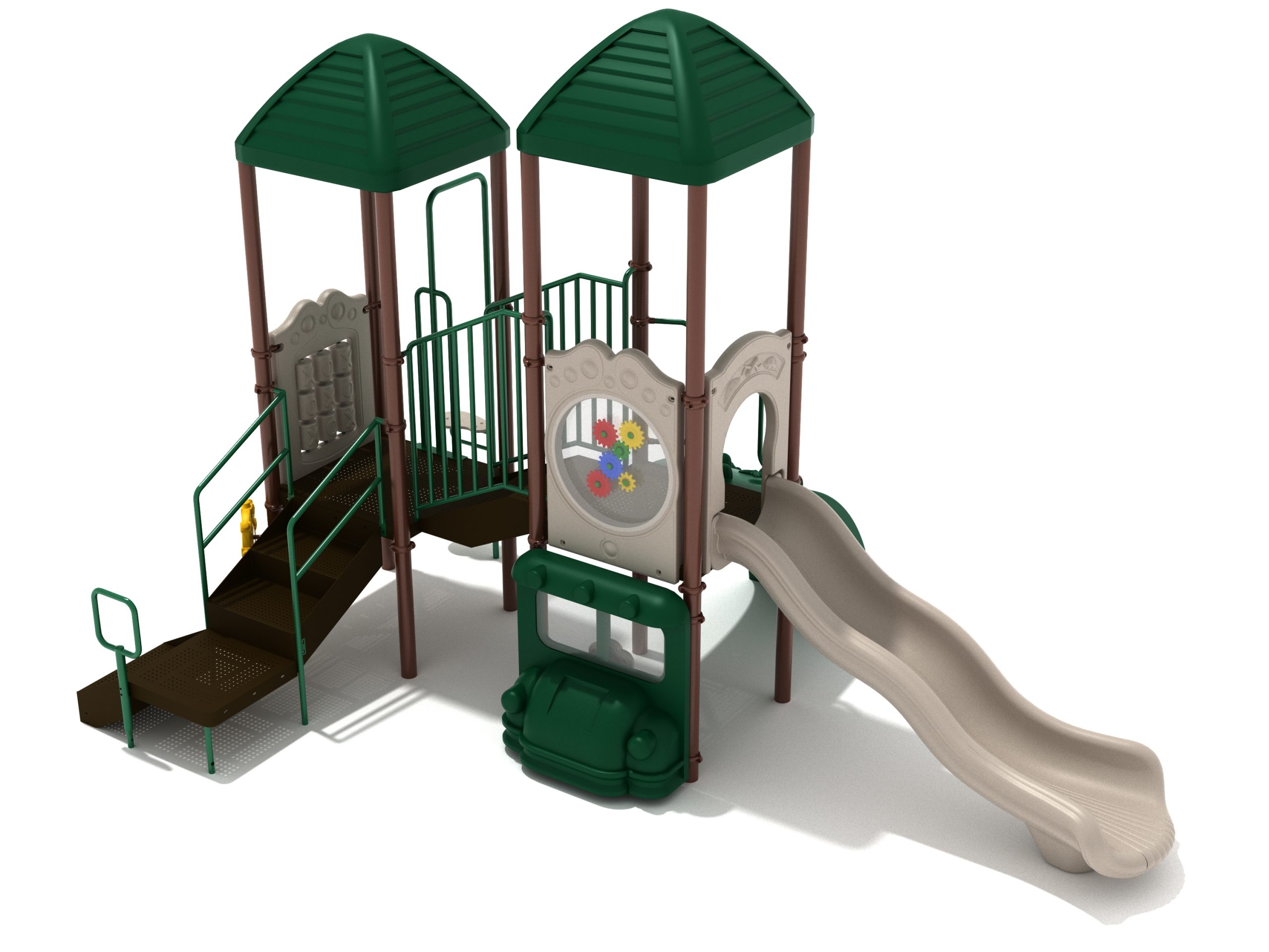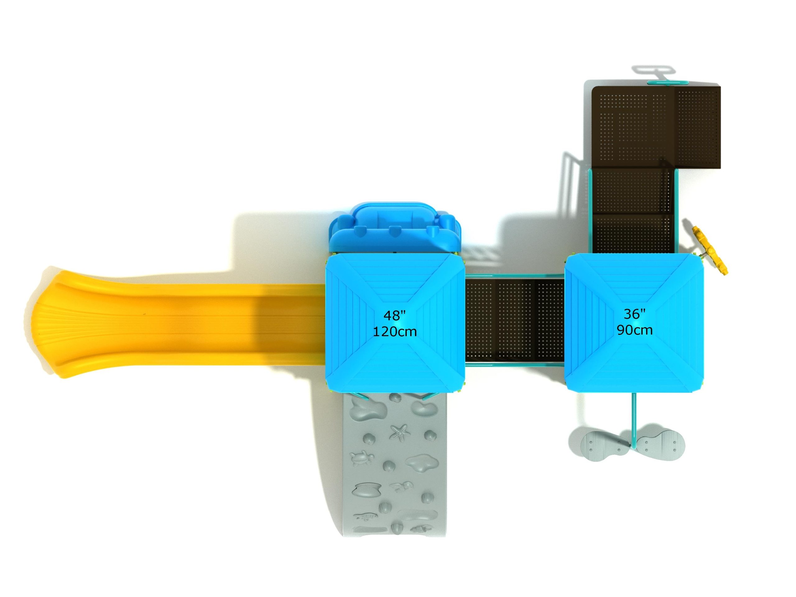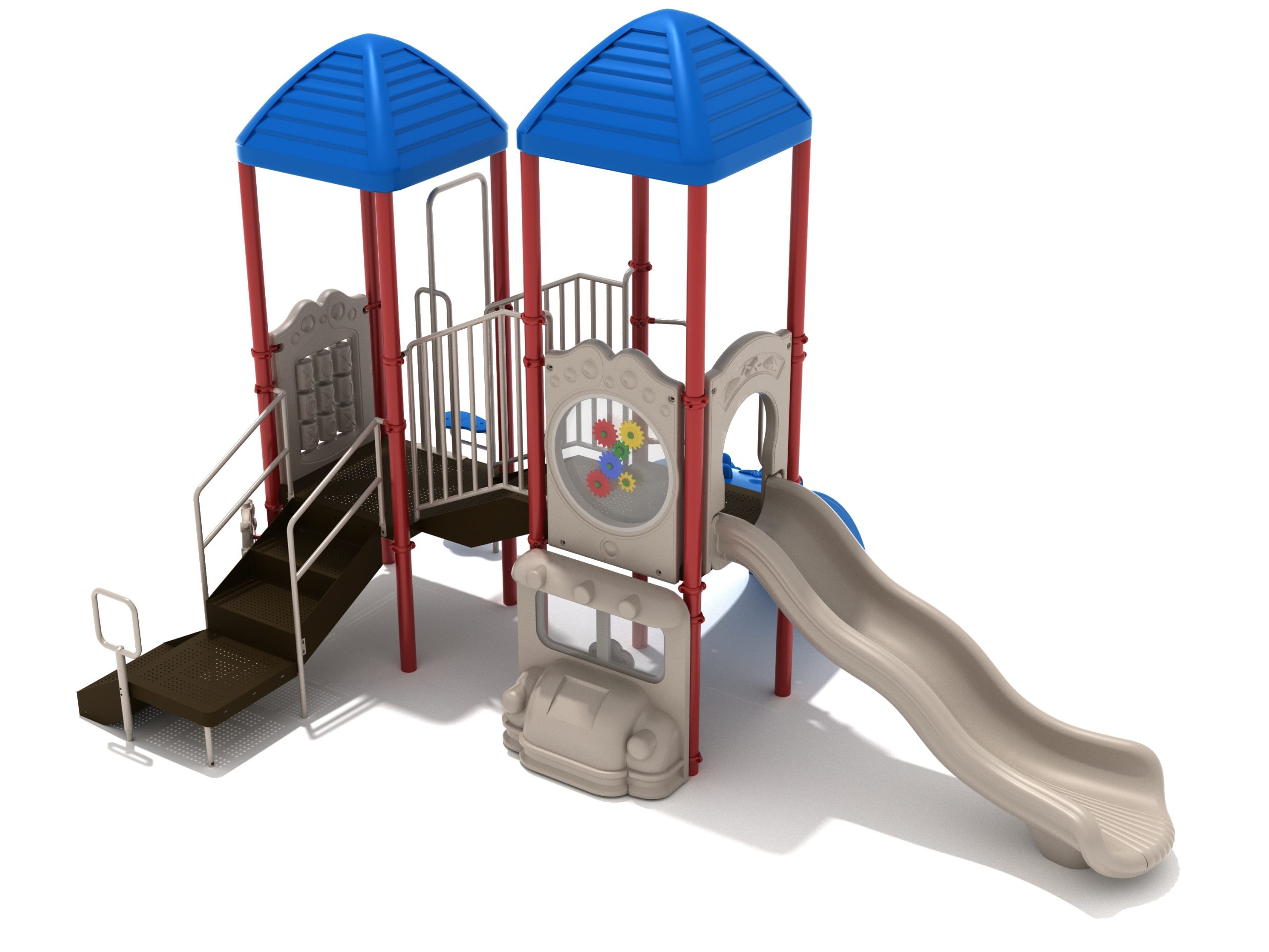The Bellevue play structure has a little bit of everything to provide a fun and engaging play time for children. Three activity panels are included to boost cognitive development through logic and imagination. The panels included are a tic tac toe panel, gear panel, and a car panel. Ascending the structure is just as easy as climbing the sea creature climber, pea pod climber, or the simple transfer station. These fun climbers add exercise to play time and can greatly benefit the physical development of kids. A wave slide provides a quick exit back to the ground. A ship’s wheel is post-mounted at ground level as well. Two line roofs shade the decks of the structure, protecting children from the sun as they play. The Bellevue structure is designed for children ages 2 to 12 years and is ADA compliant. Be sure to use a loose-fill safety surface or a poured rubber surface to help prevent injury.
