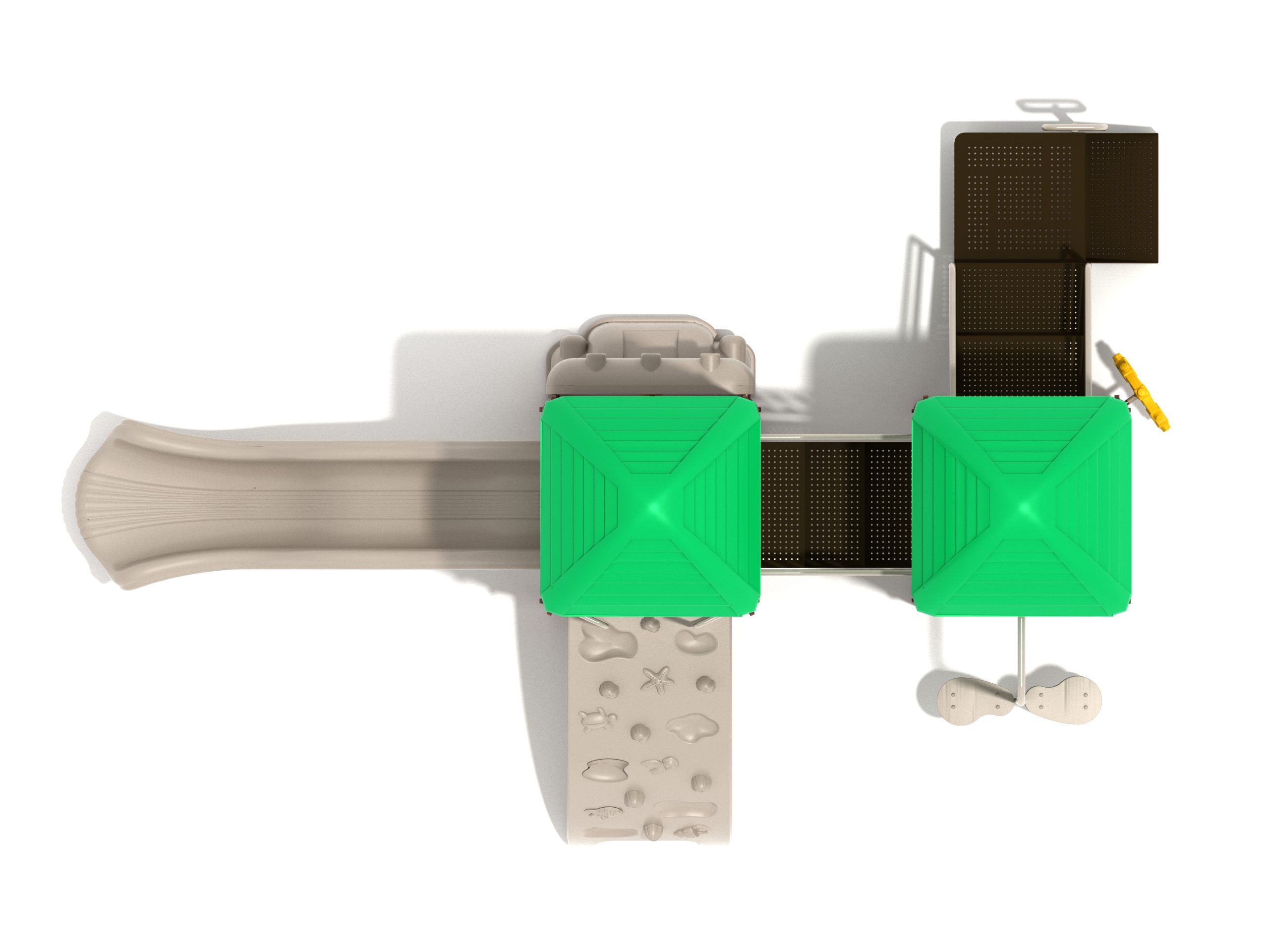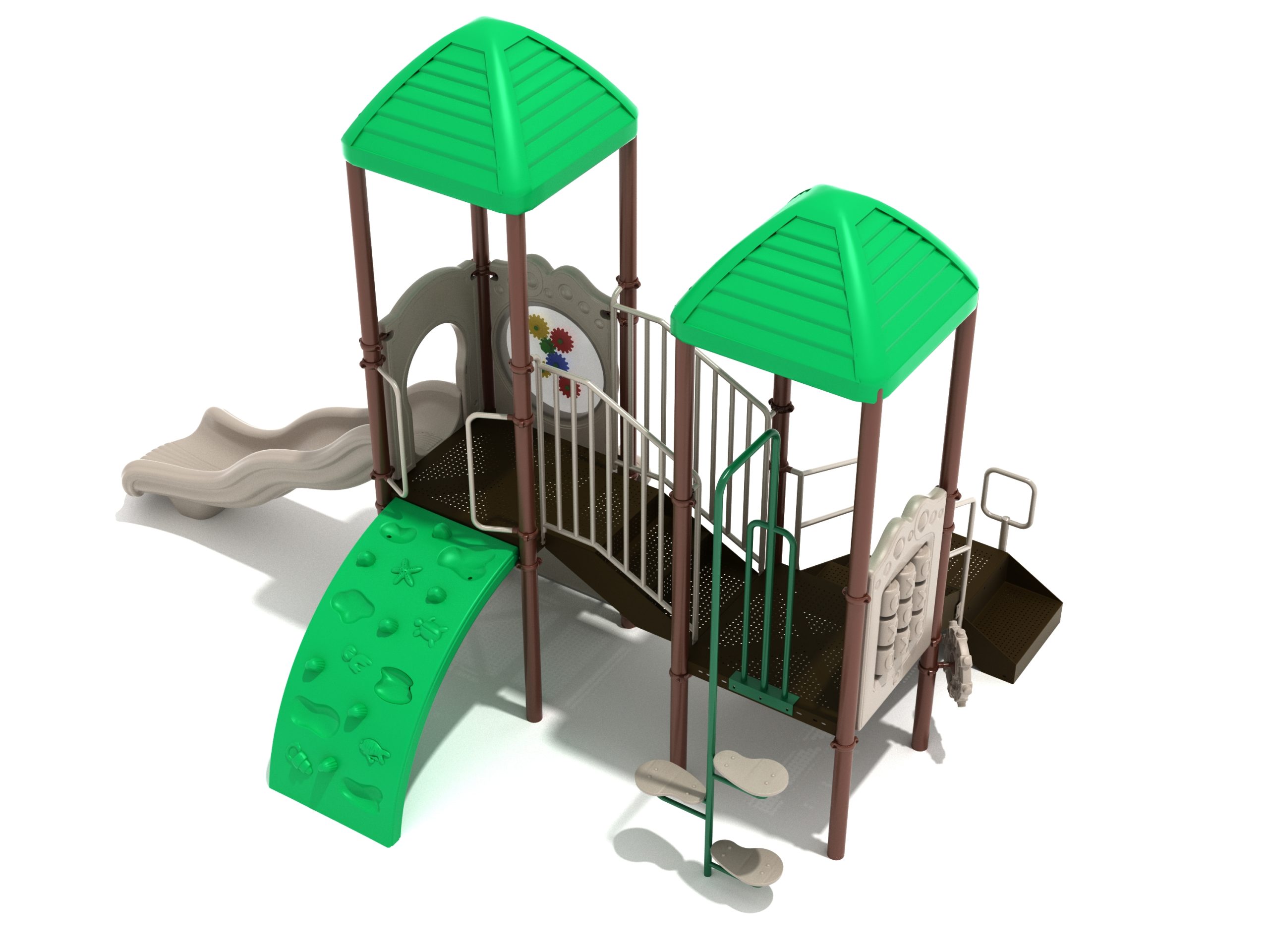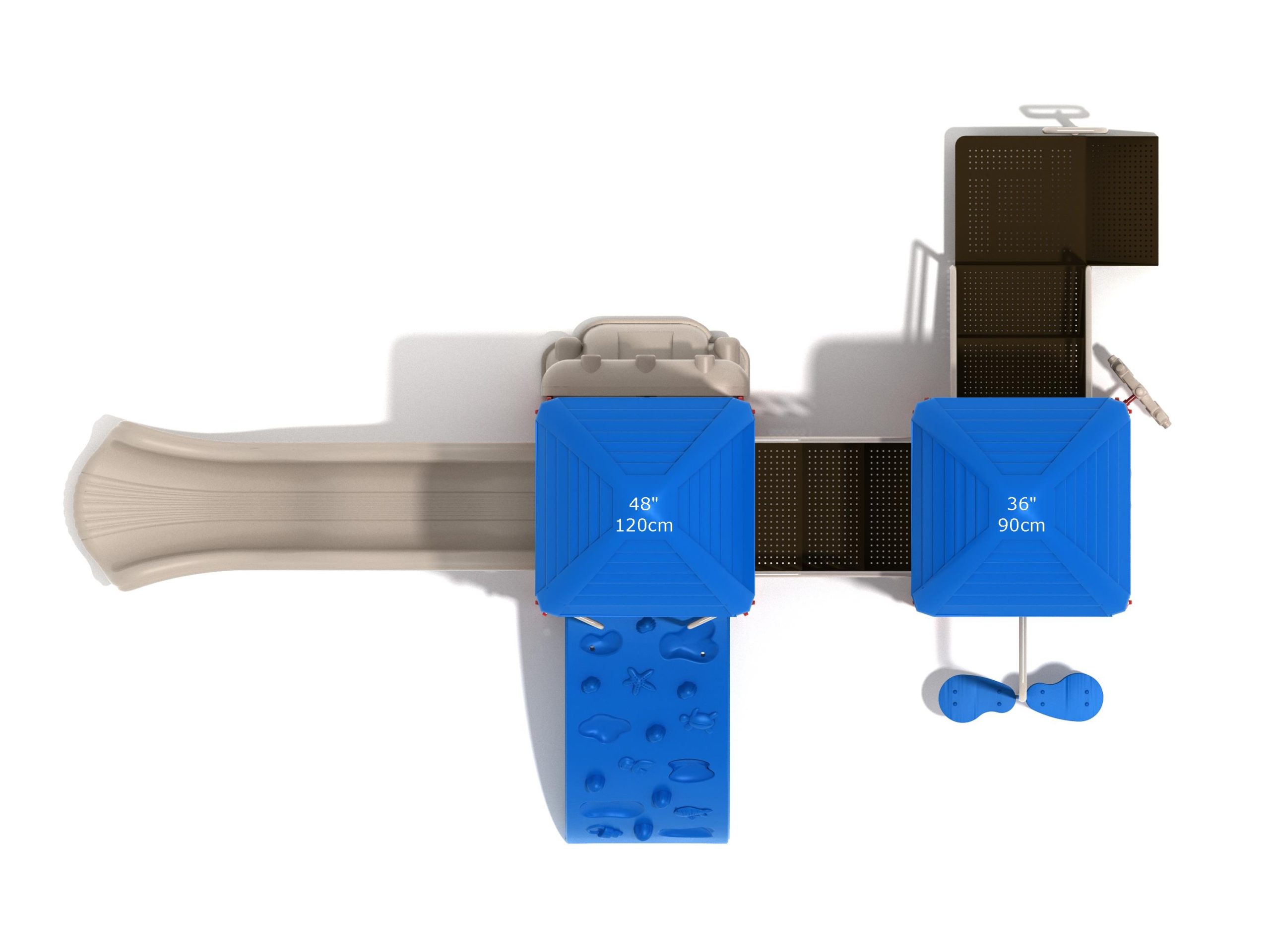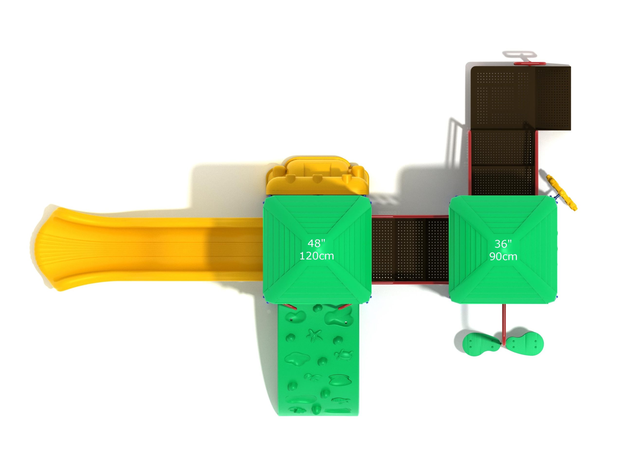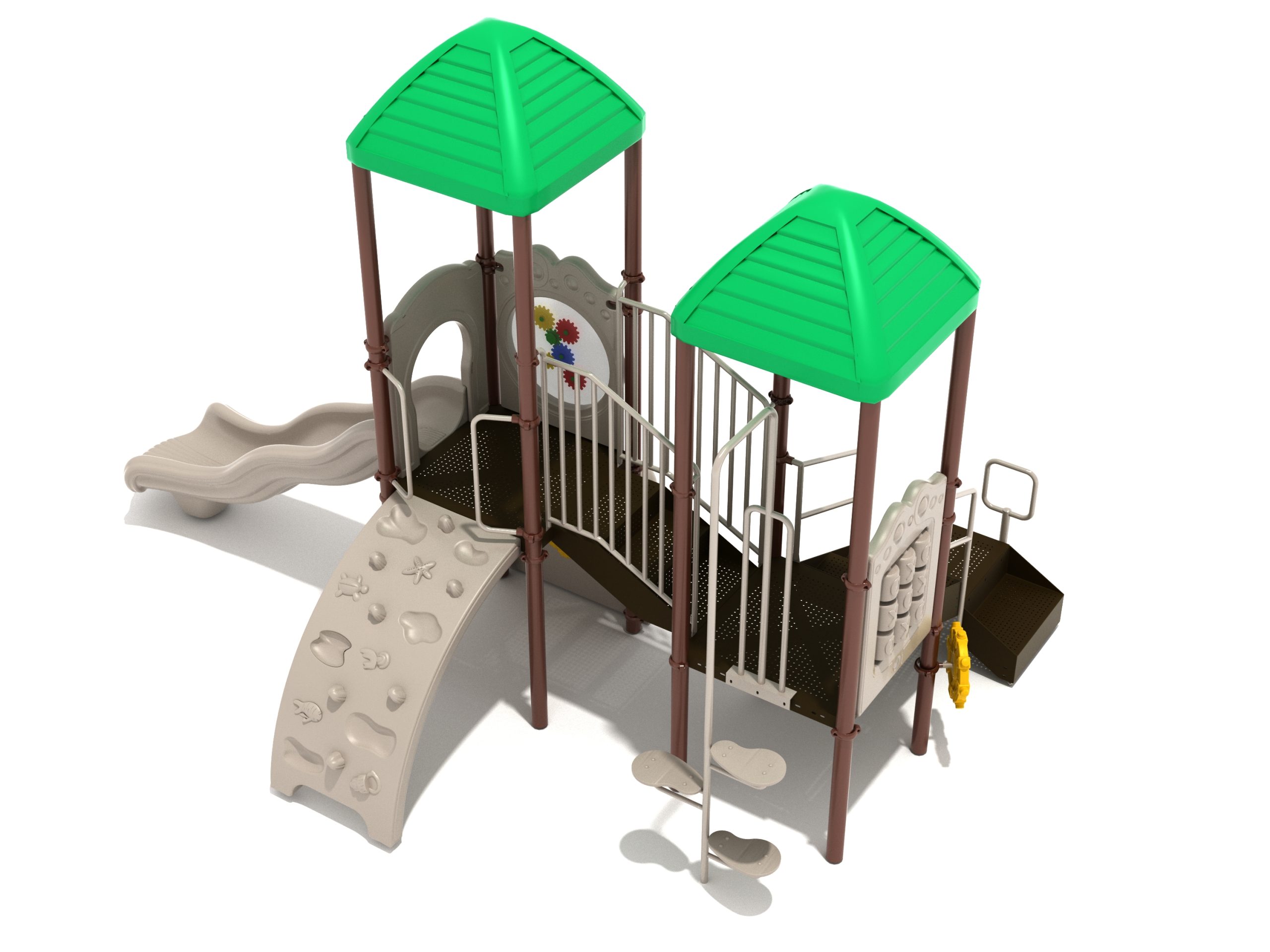 The Bellevue play structure has a little bit of everything to provide a fun and engaging play time for children. Three activity panels are included to boost cognitive development through logic and imagination. The panels included are a tic tac toe panel, gear panel, and a car panel. Ascending the structure is just as easy as climbing the sea creature climber, pea pod climber, or the simple transfer station. These fun climbers add exercise to play time and can greatly benefit the physical development of kids. A wave slide provides a quick exit back to the ground. A ship’s wheel is post-mounted at ground level as well. Two line roofs shade the decks of the structure, protecting children from the sun as they play. The Bellevue structure is designed for children ages 2 to 12 years and is ADA compliant. Be sure to use a loose-fill safety surface or a poured rubber surface to help prevent injury.