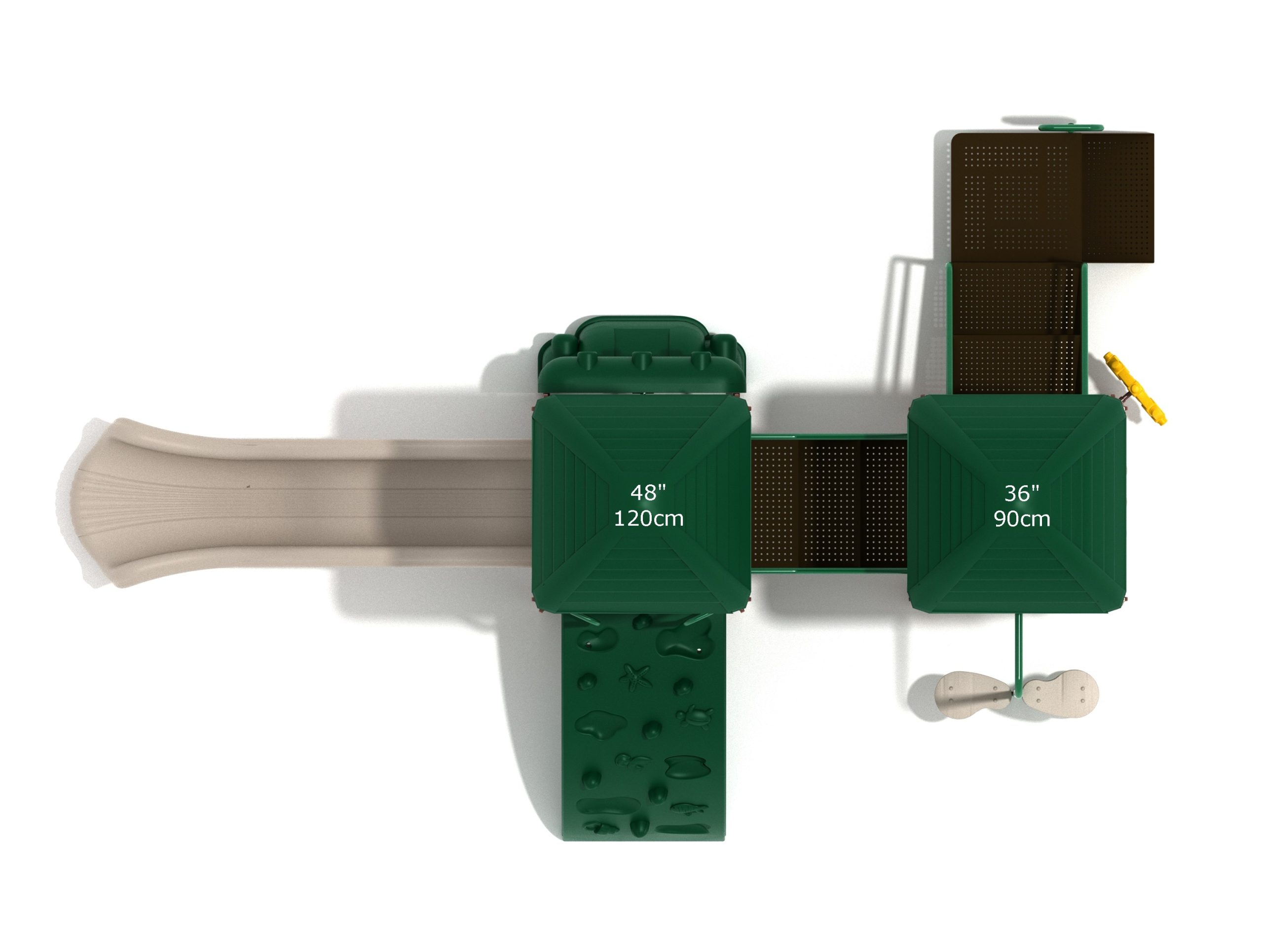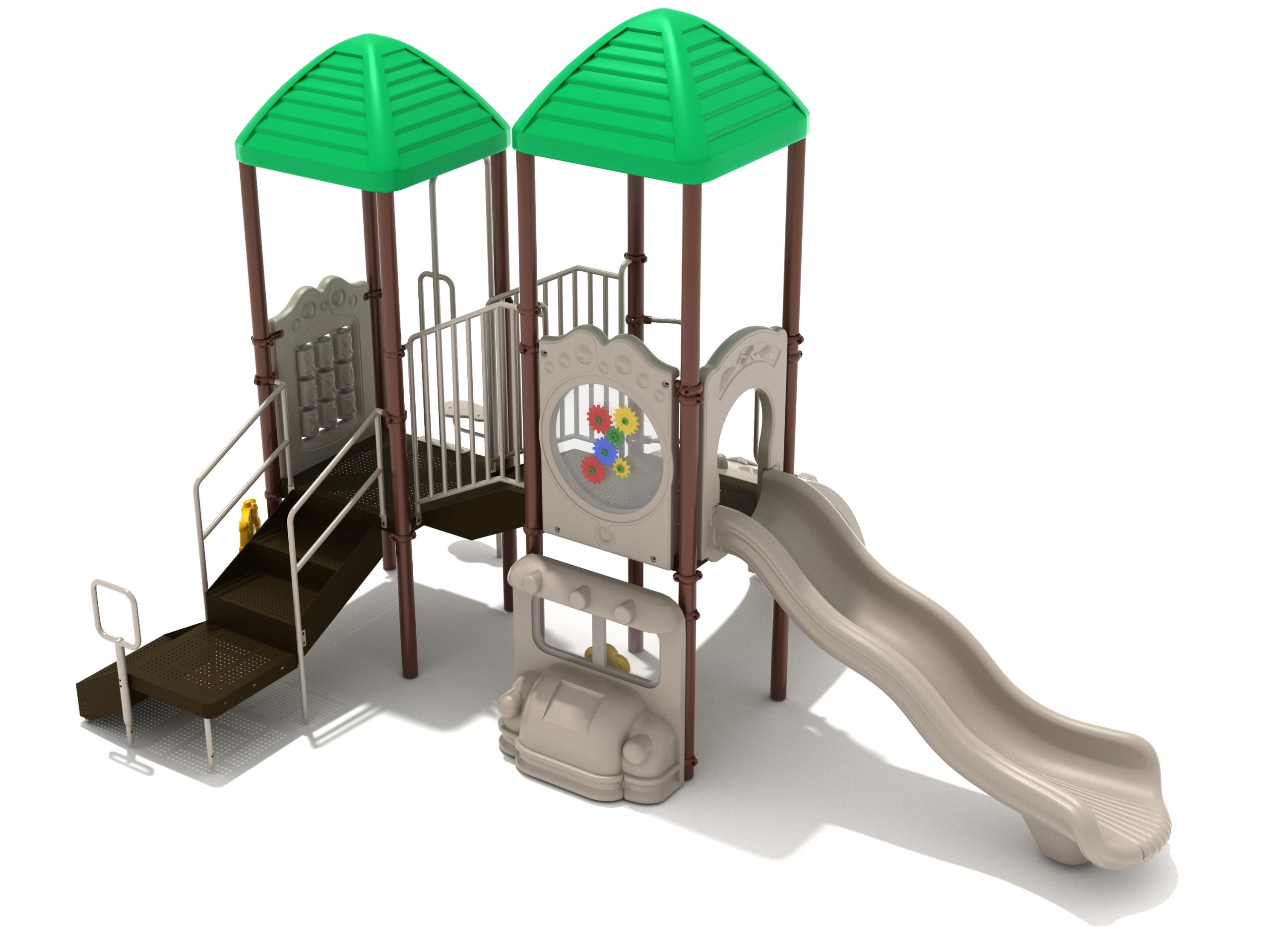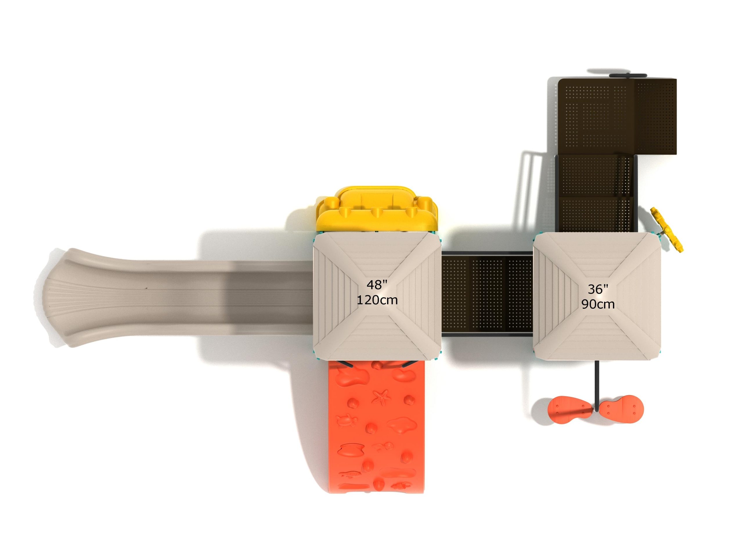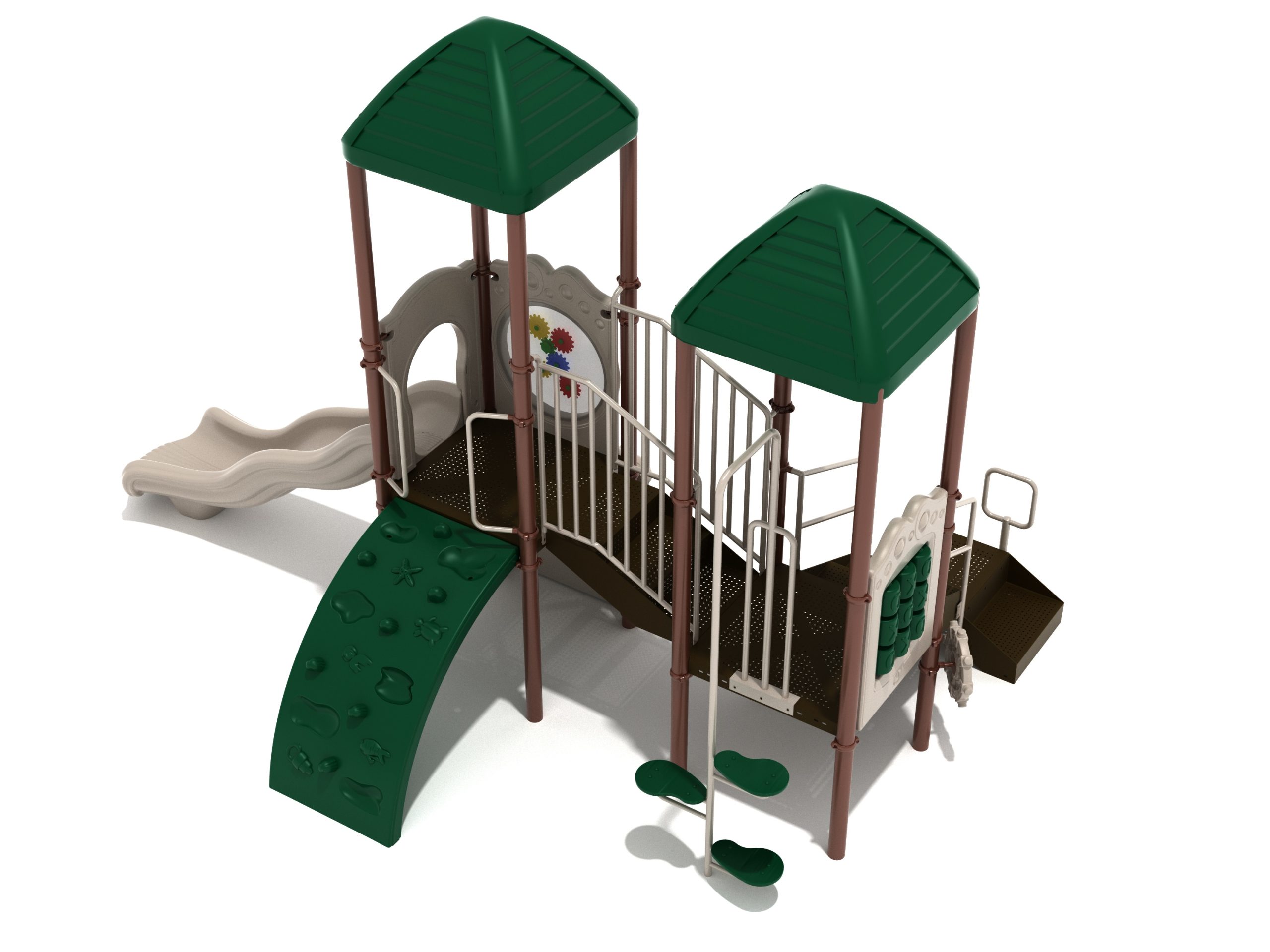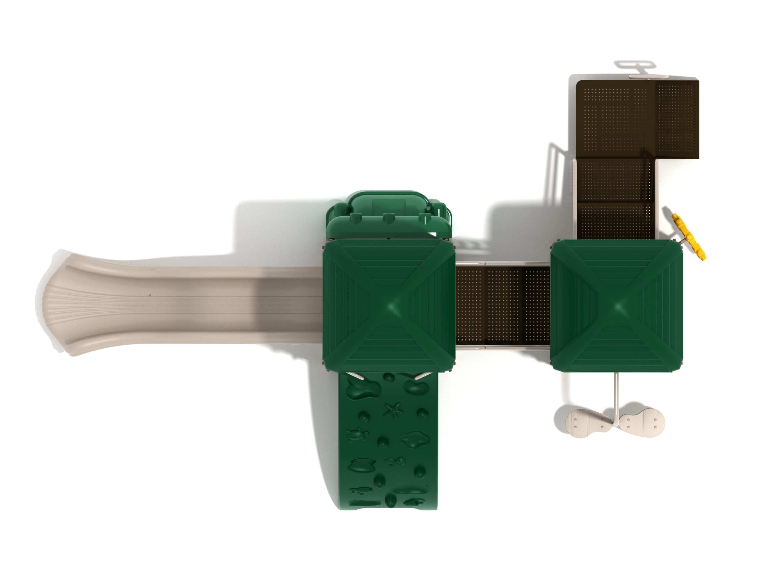 The Bellevue play structure has a little bit of everything to provide a fun and engaging play time for children. Three activity panels are included to boost cognitive development through logic and imagination. The panels included are a tic tac toe panel, gear panel, and a car panel. Ascending the structure is just as easy as climbing the sea creature climber, pea pod climber, or the simple transfer station. These fun climbers add exercise to play time and can greatly benefit the physical development of kids. A wave slide provides a quick exit back to the ground. A ship’s wheel is post-mounted at ground level as well. Two line roofs shade the decks of the structure, protecting children from the sun as they play. The Bellevue structure is designed for children ages 2 to 12 years and is ADA compliant. Be sure to use a loose-fill safety surface or a poured rubber surface to help prevent injury.