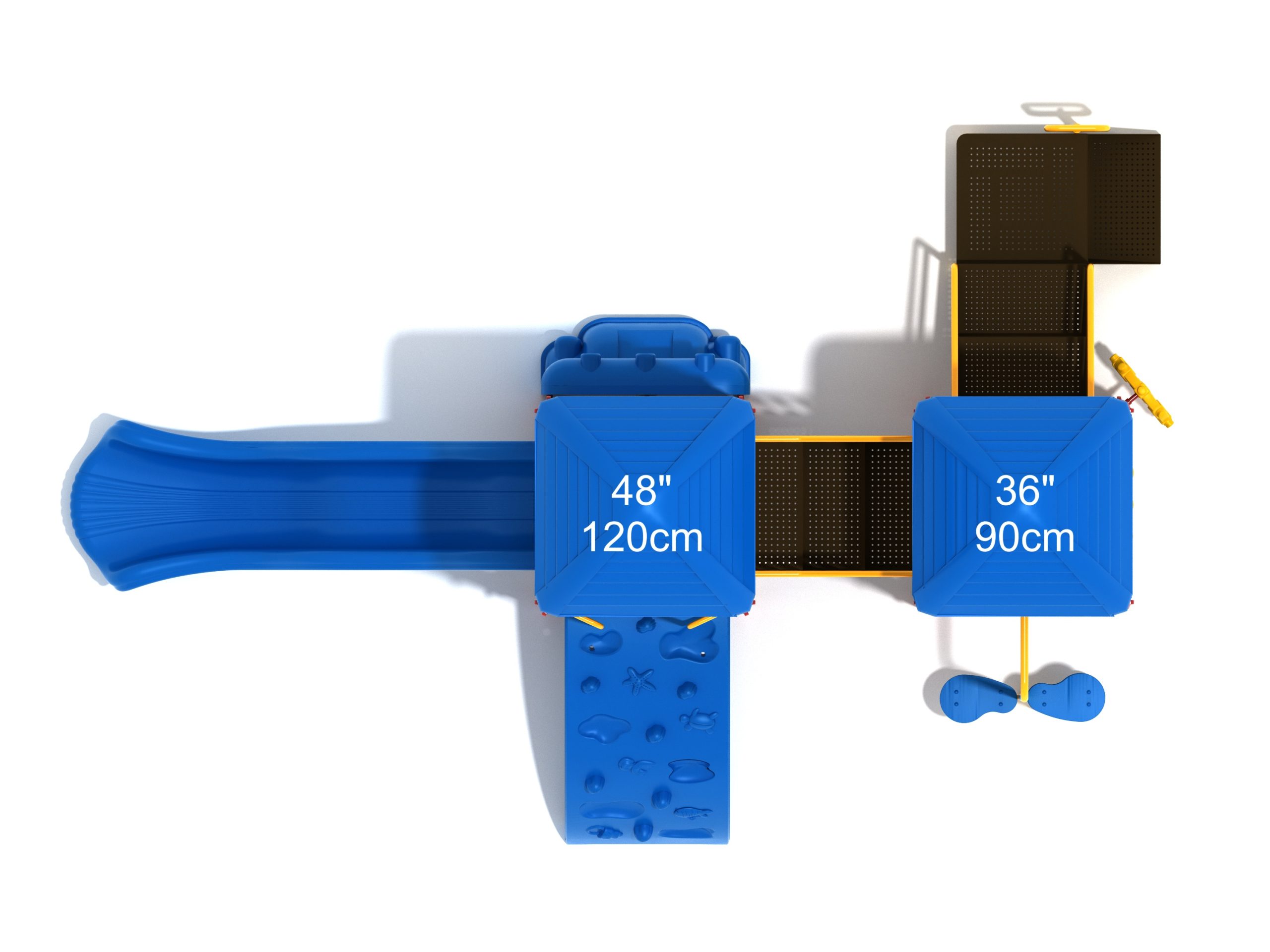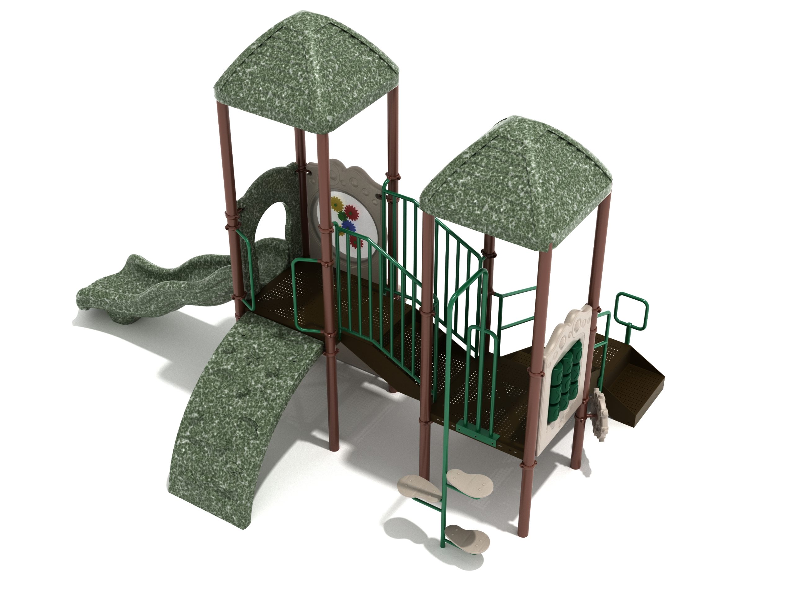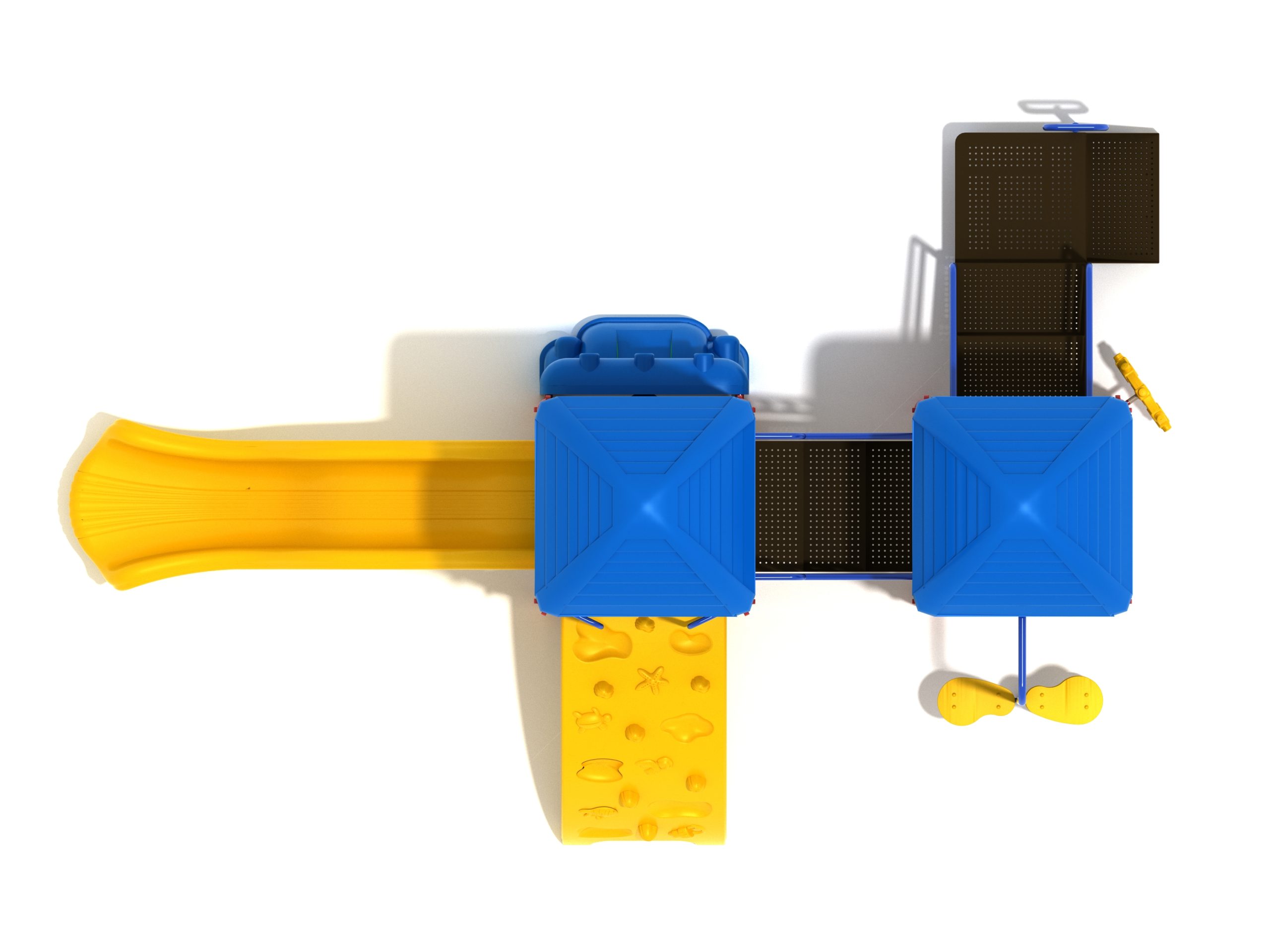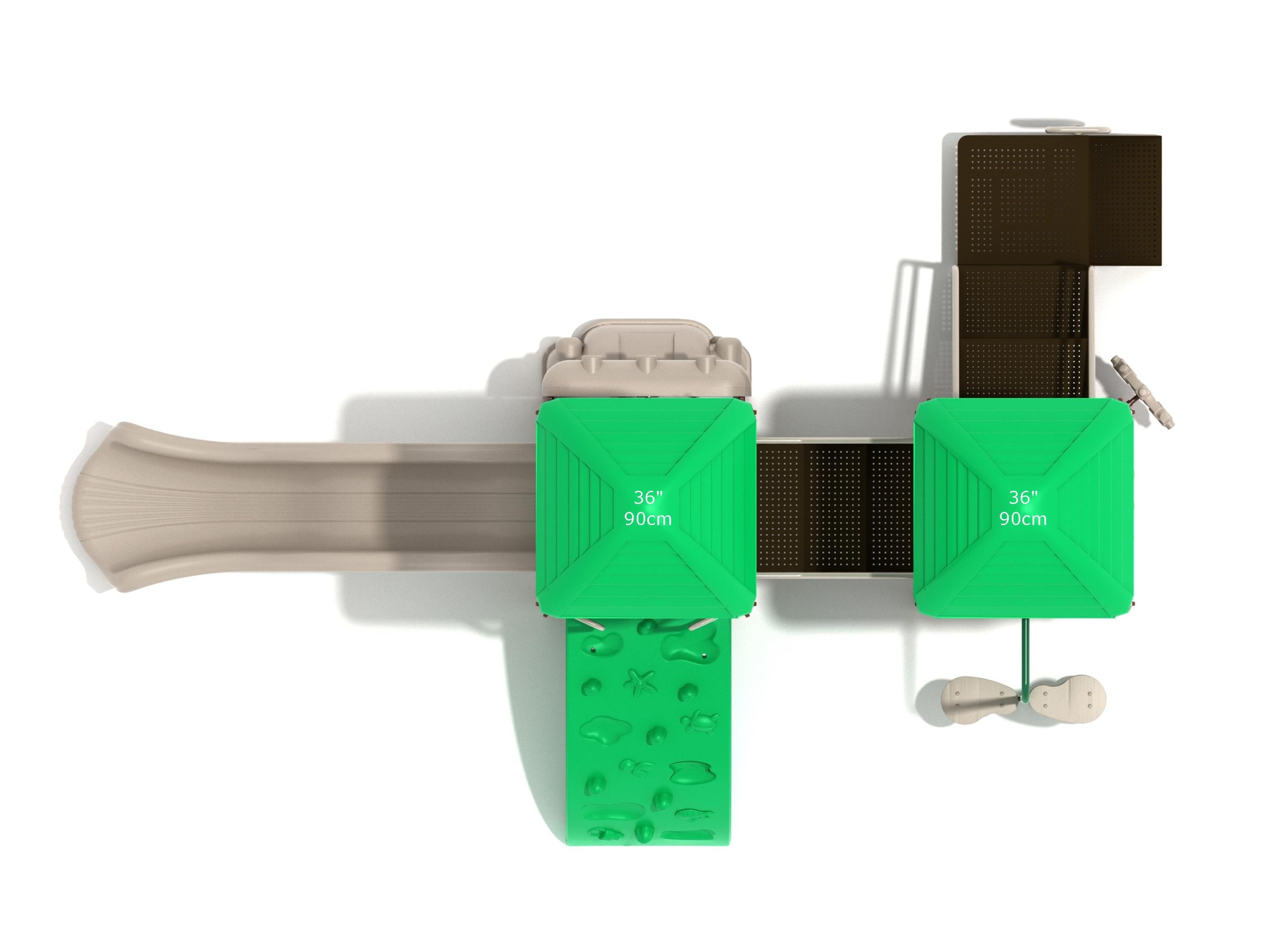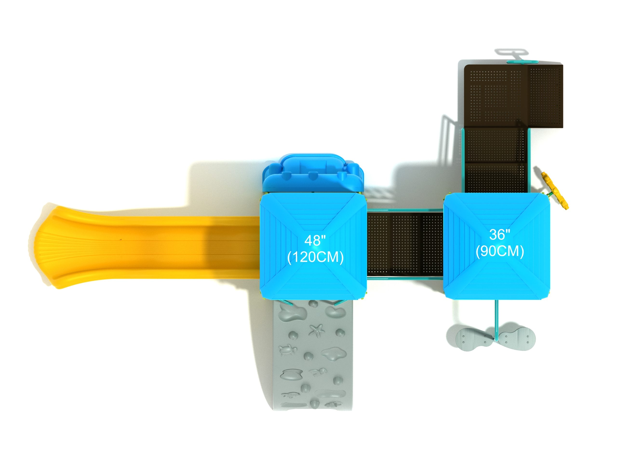 The Bellevue play structure has a little bit of everything to provide a fun and engaging play time for children. Three activity panels are included to boost cognitive development through logic and imagination. The panels included are a tic tac toe panel, gear panel, and a car panel. Ascending the structure is just as easy as climbing the sea creature climber, pea pod climber, or the simple transfer station. These fun climbers add exercise to play time and can greatly benefit the physical development of kids. A wave slide provides a quick exit back to the ground. A ship’s wheel is post-mounted at ground level as well. Two line roofs shade the decks of the structure, protecting children from the sun as they play. The Bellevue structure is designed for children ages 2 to 12 years and is ADA compliant. Be sure to use a loose-fill safety surface or a poured rubber surface to help prevent injury.