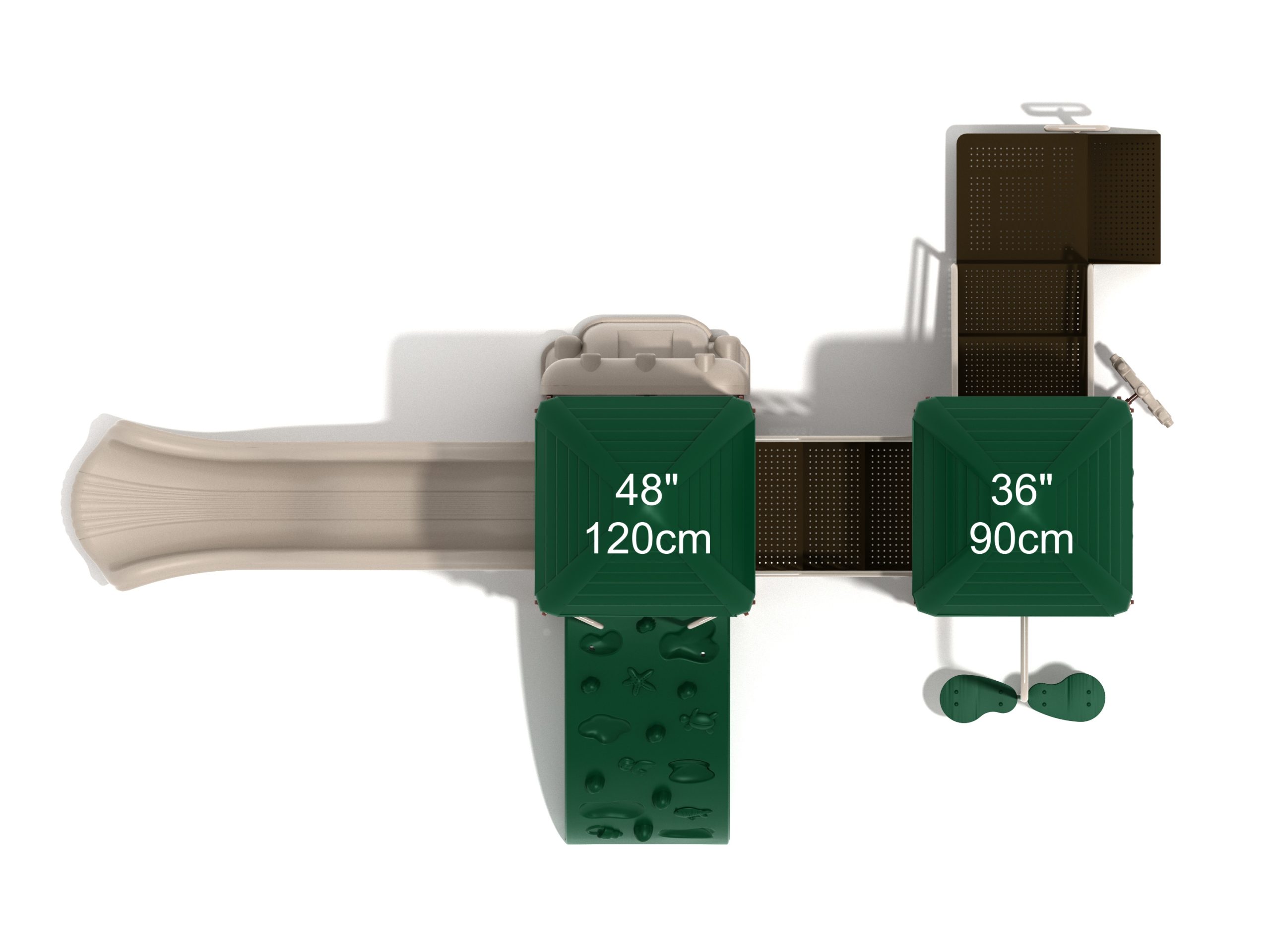 This play structure is designed to unleash the imagination of children and provide them with lots of physical activity and motor skill development too. The Bellevue has two Line Roofs to house the exciting play features underneath and children can stay dry in rainy weather and in the shade during hot days. The Pea Pod Climber features alternating steps children can work their way up as if they were scaling a massive beanstalk to reach the clouds above. The Car Panel gives children the ability to take the driver’s seat and ferry passengers to and fro, complemented by a mechanical interactive Gear Panel directly above and a Tic Tac Toe Panel to improve cognitive skills. For more of a nautical adventure, children can take command of the waves either by climbing the exciting Sea Creature Climber or by standing at the helm and using the Ship’s Wheel to take friends on a high seas journey. There’s also a large Wave Slide to make children feel like they’re bumping their way down a cascading waterfall.