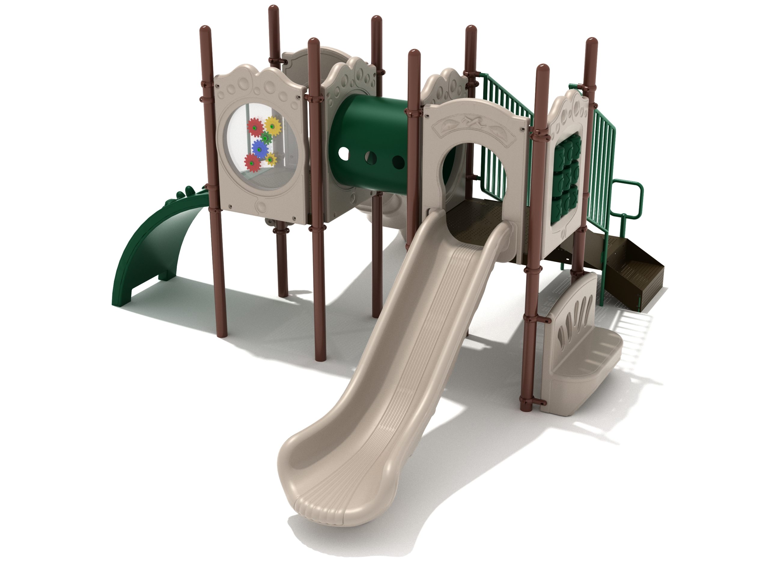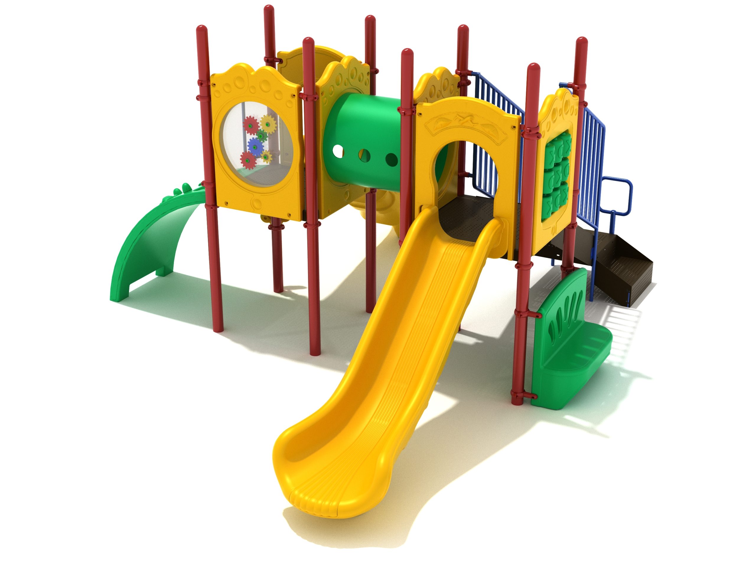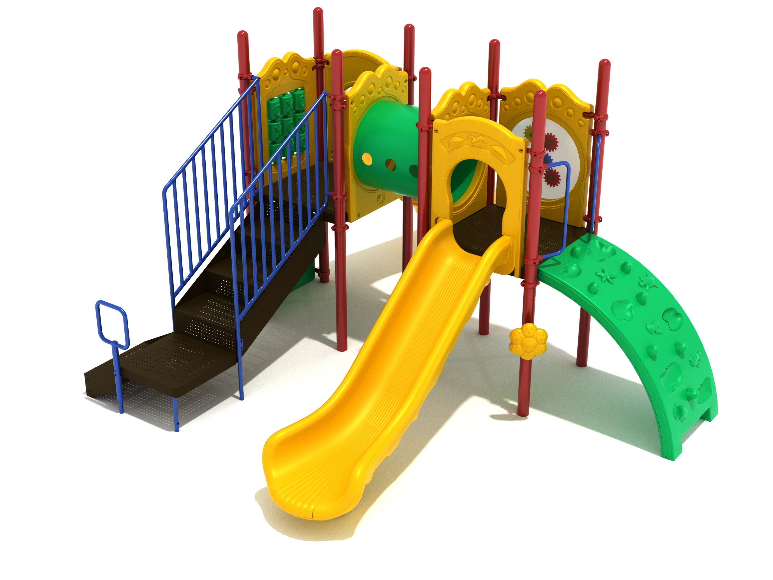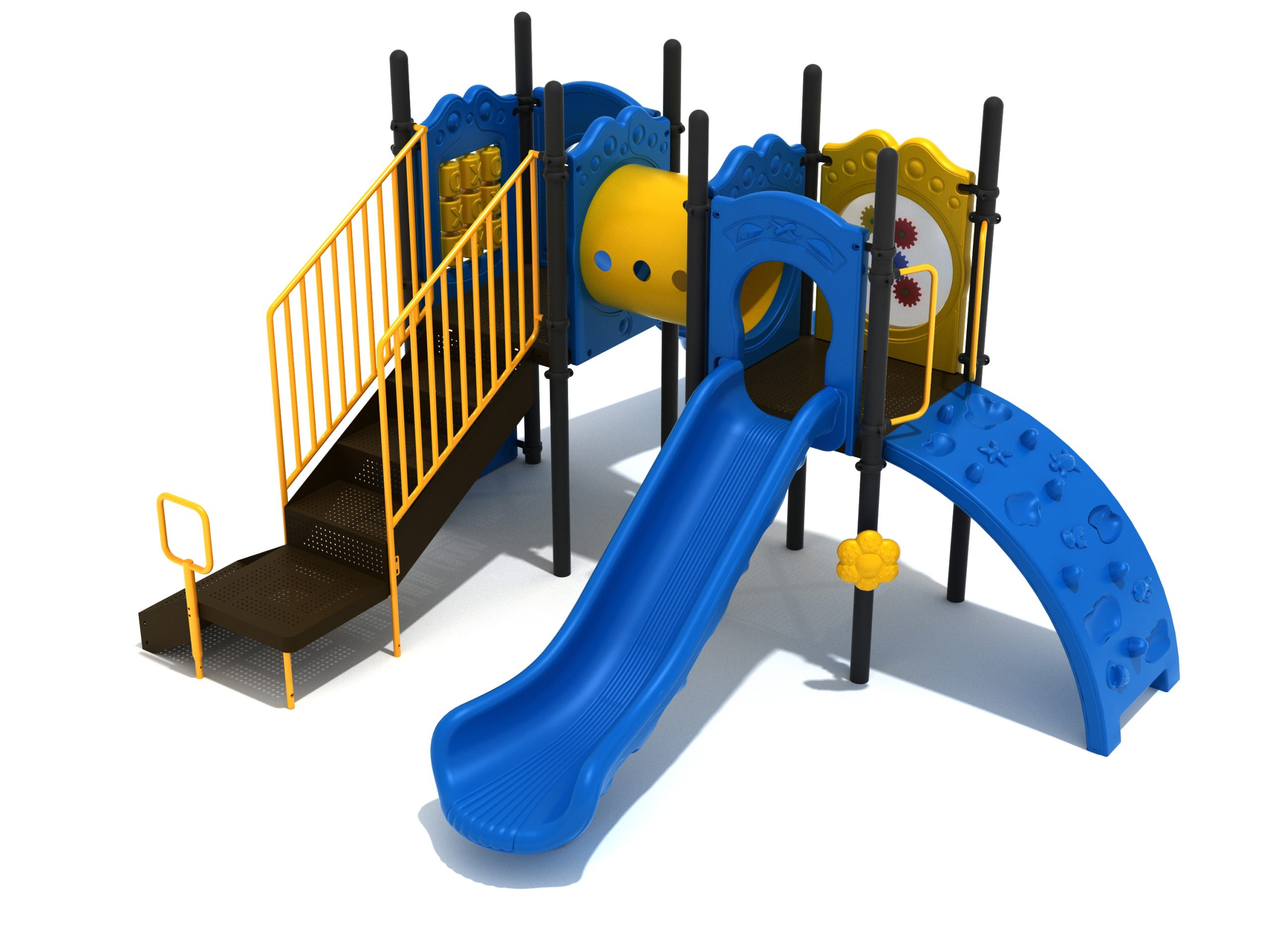 Finding a high quality, affordable playground that also offers a ton of fun does not have to be hard! The Berkeley playground structure is a great choice for your playground as it offers a little bit of something for every child. Designed for the 2 to 12 year age range, this unit features two straight slides. A tube bridge connects the two main decks together and peepholes allow kids to look out on the playground as they crawl across. A sea creature climber provides a challenging way for kids to ascend the unit. A transfer station is included on this structure. Kids can enjoy the sounds of the rain wheel or have a rest on the bench panel. A tic tac toe panel and a gear panel are included to boost logic skills. The Berkeley play system is an ADA compliant unit. Be sure to check out options for safety surfaces. Having the proper surfacing helps to prevent injury.