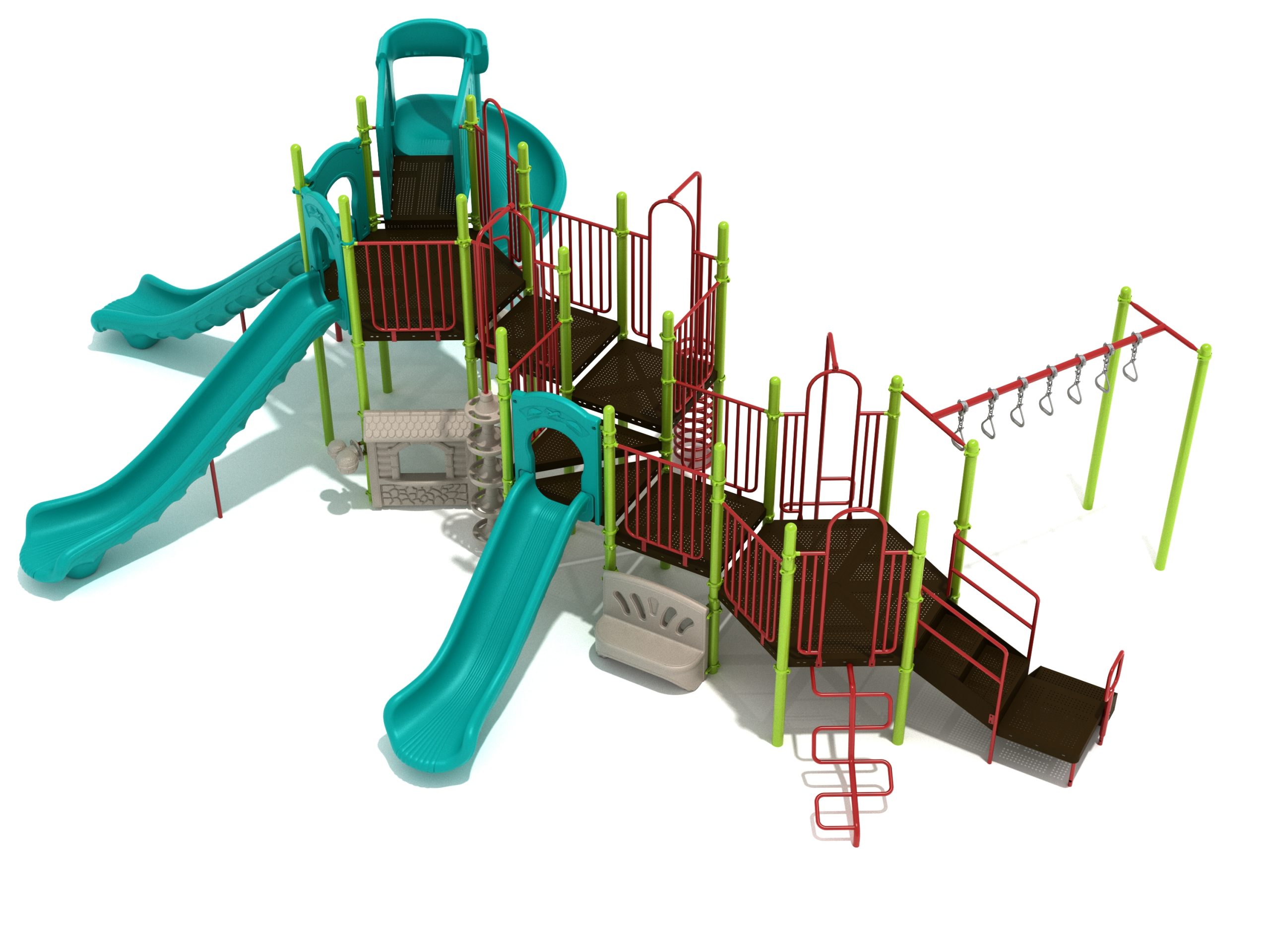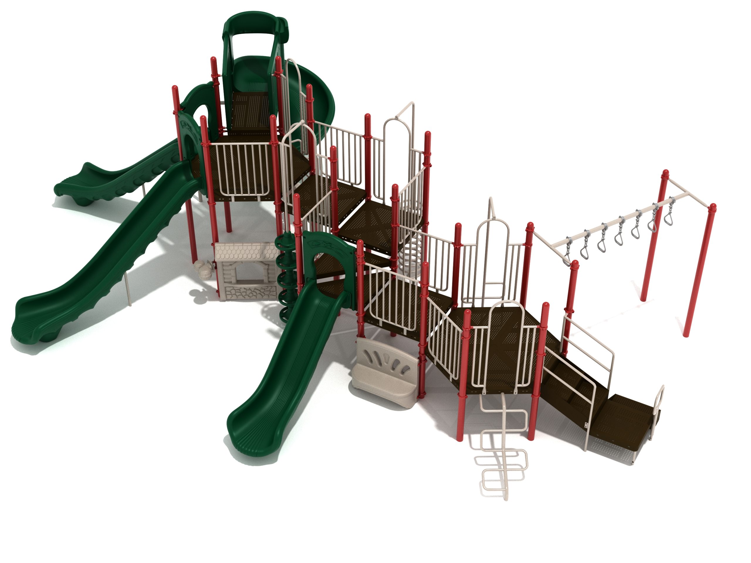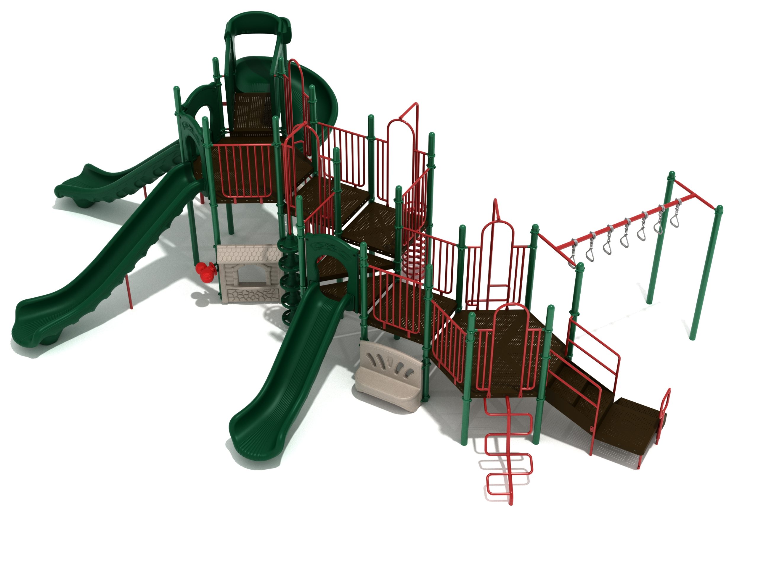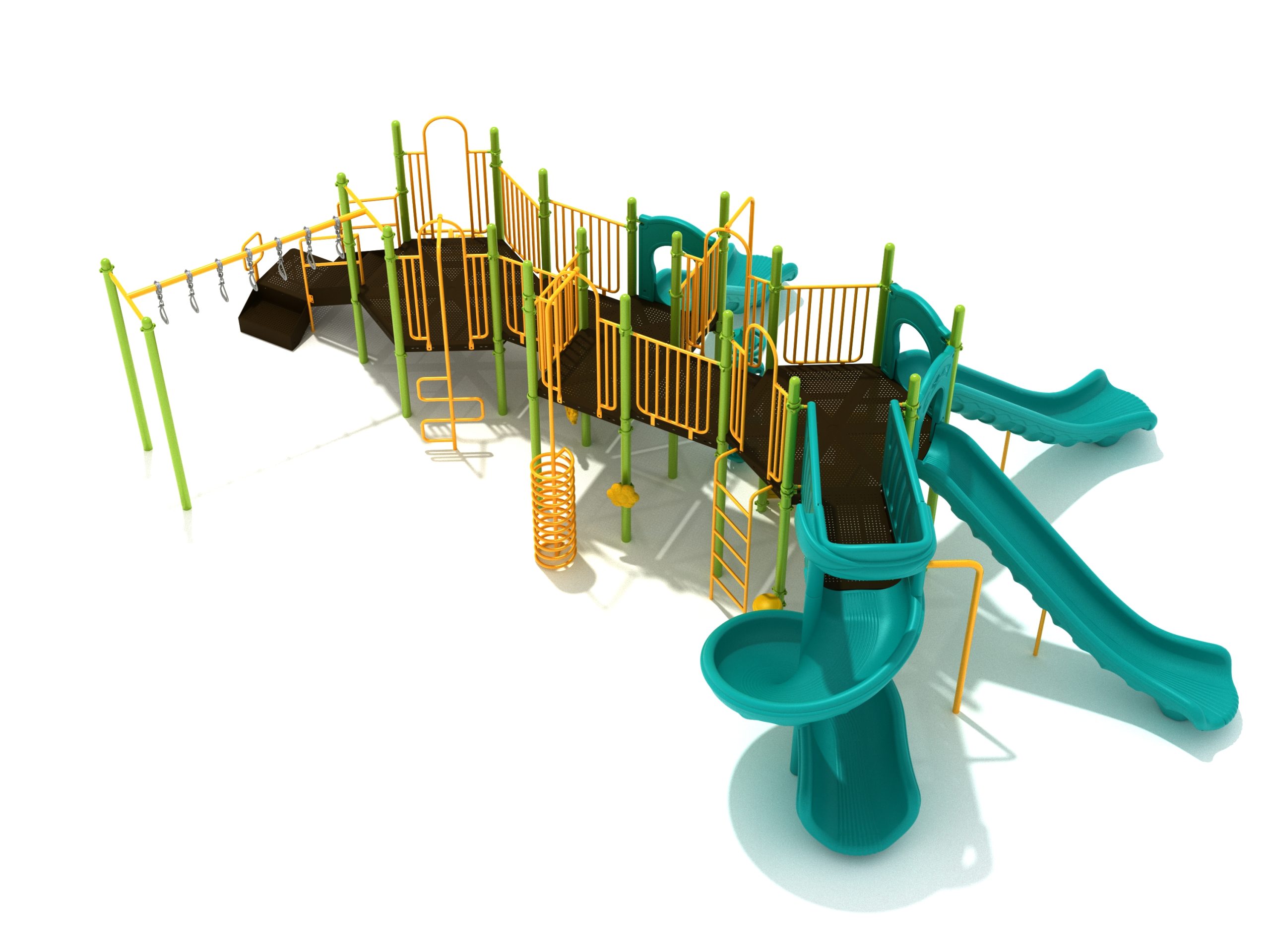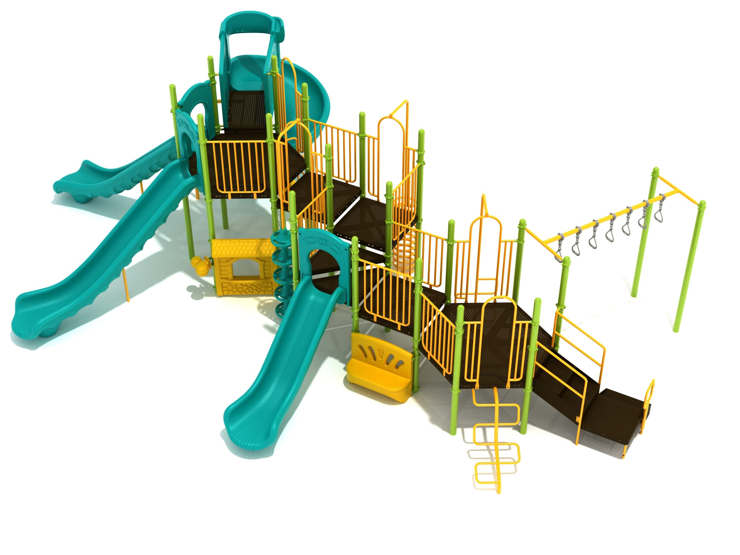 This massive play structure has multiple slides, activities, and amenities that’ll attract kids from afar! It is like a castle with mazes consisting of eye-pleasing surprises for young explorers. It can easily support huge crowds of kids, as many as 87 kids at once. It features two Snake Climbers and a Swinging Ring Ladder for entry. There are 2 hub areas for kids to be kids and have the time of their lives! Safe dismount areas reduce the risk of collisions. Also, Broken Arrow has ground-level features like the Store and Bench Panels for kids to chill, relax, and do a little socializing. There are 2 hub areas that lead to friendly competition that may take the shape of kids recreating Robin Hood-like adventures. The Spiral Slide and two Straight Slides offer thrilling sliding fun that kids might want to try over and over. The overall layout & variety of games support active play. Broken Arrow helps kids develop their motor skills while enjoying themselves in a safe environment.