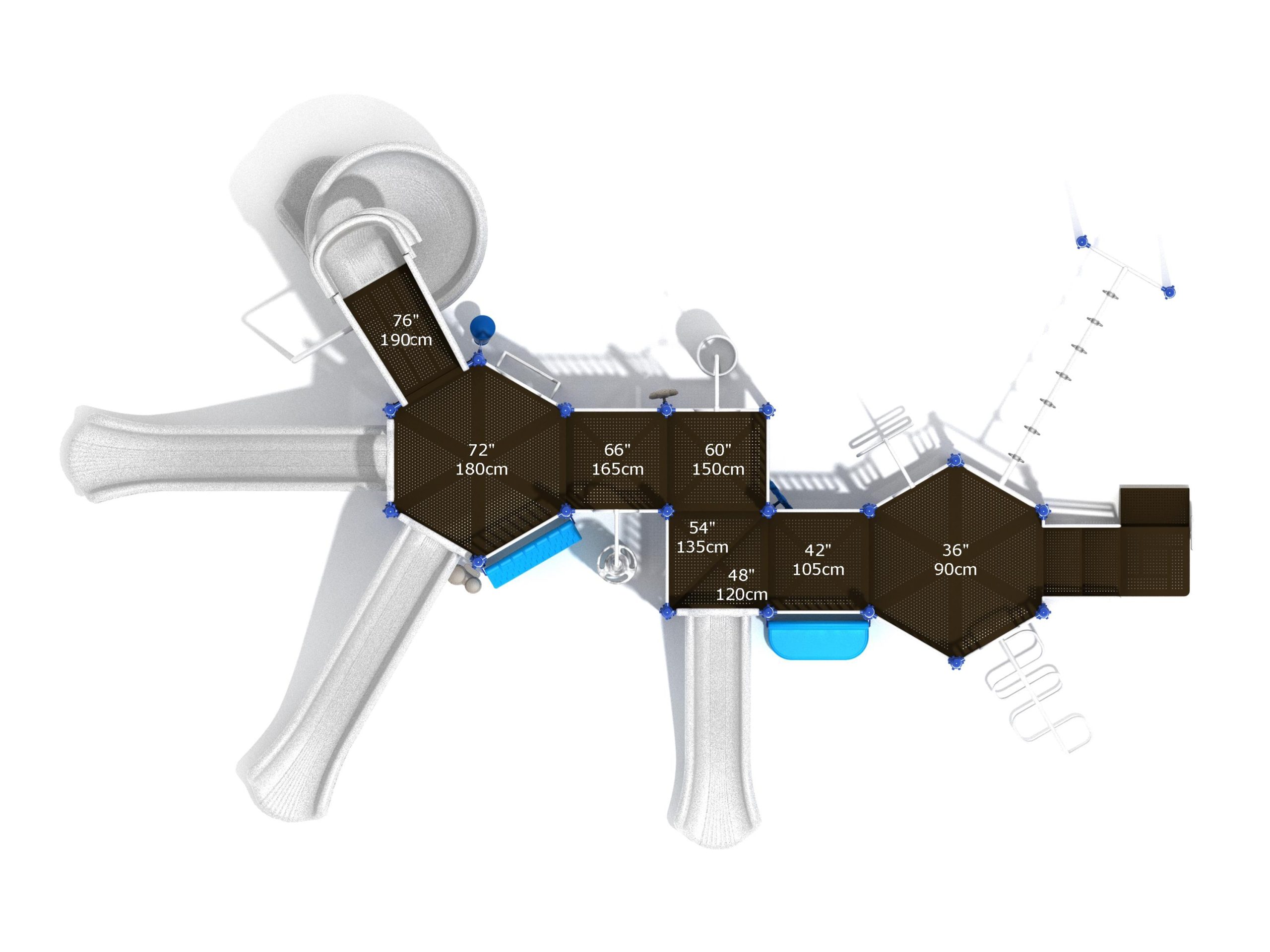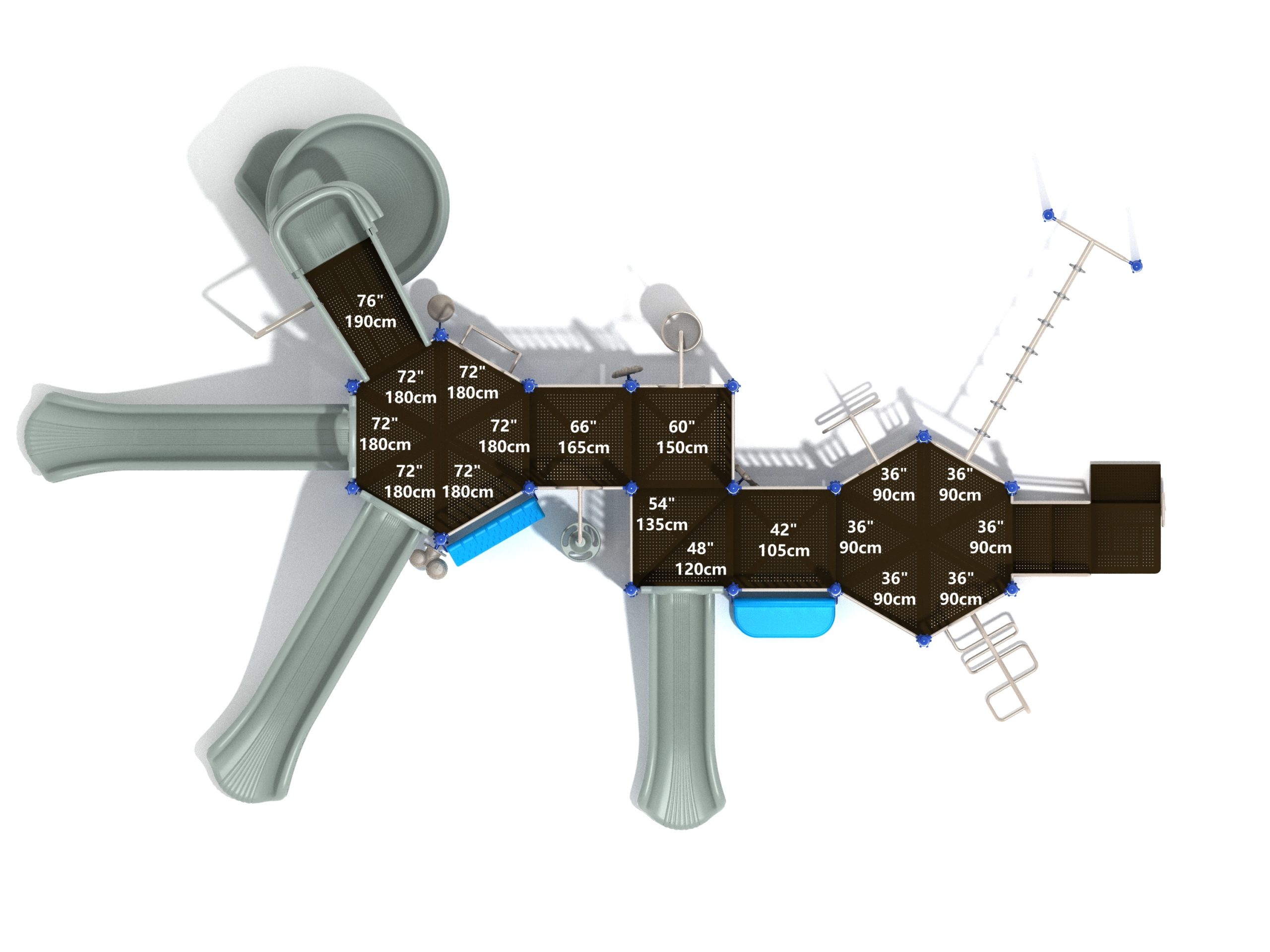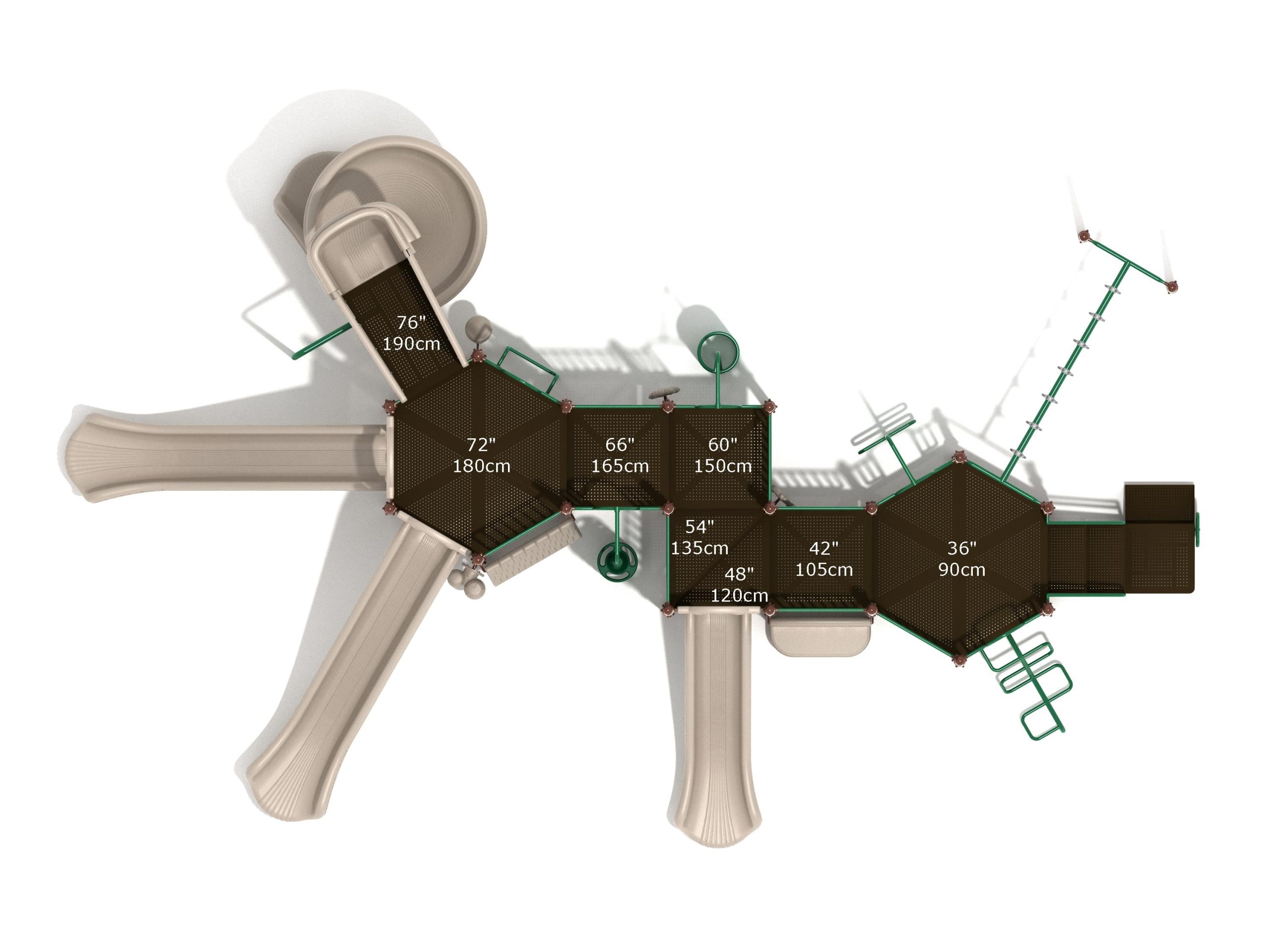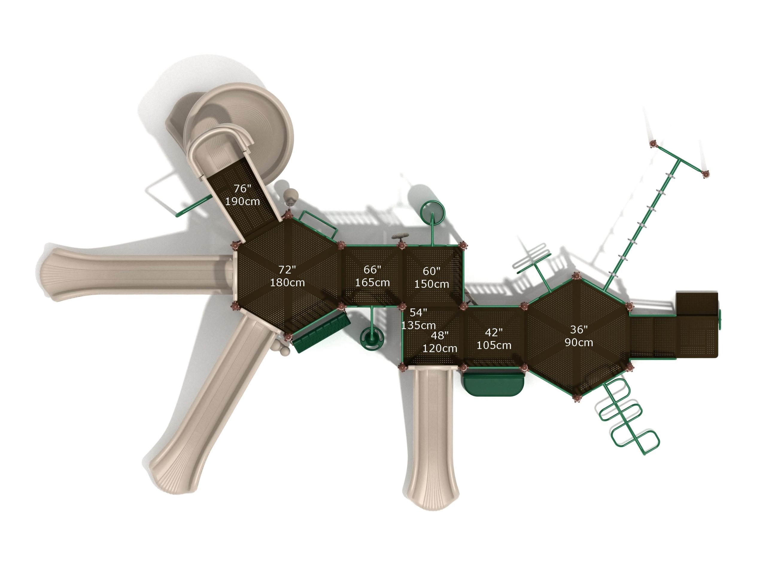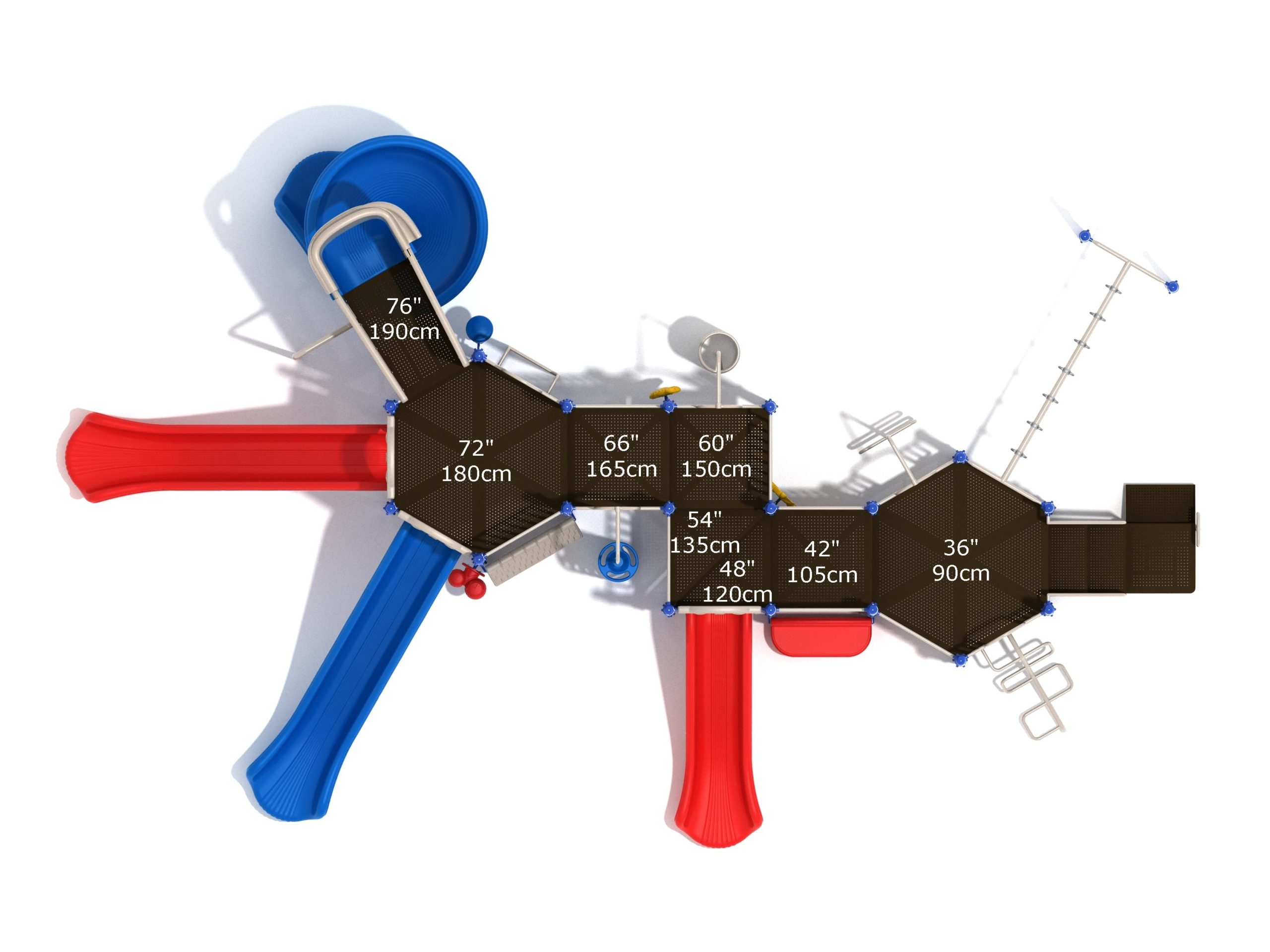 This massive play structure has multiple slides, activities, and amenities that’ll attract kids from afar! It is like a castle with mazes consisting of eye-pleasing surprises for young explorers. It can easily support huge crowds of kids, as many as 87 kids at once. It features two Snake Climbers and a Swinging Ring Ladder for entry. There are 2 hub areas for kids to be kids and have the time of their lives! Safe dismount areas reduce the risk of collisions. Also, Broken Arrow has ground-level features like the Store and Bench Panels for kids to chill, relax, and do a little socializing. There are 2 hub areas that lead to friendly competition that may take the shape of kids recreating Robin Hood-like adventures. The Spiral Slide and two Straight Slides offer thrilling sliding fun that kids might want to try over and over. The overall layout & variety of games support active play. Broken Arrow helps kids develop their motor skills while enjoying themselves in a safe environment.