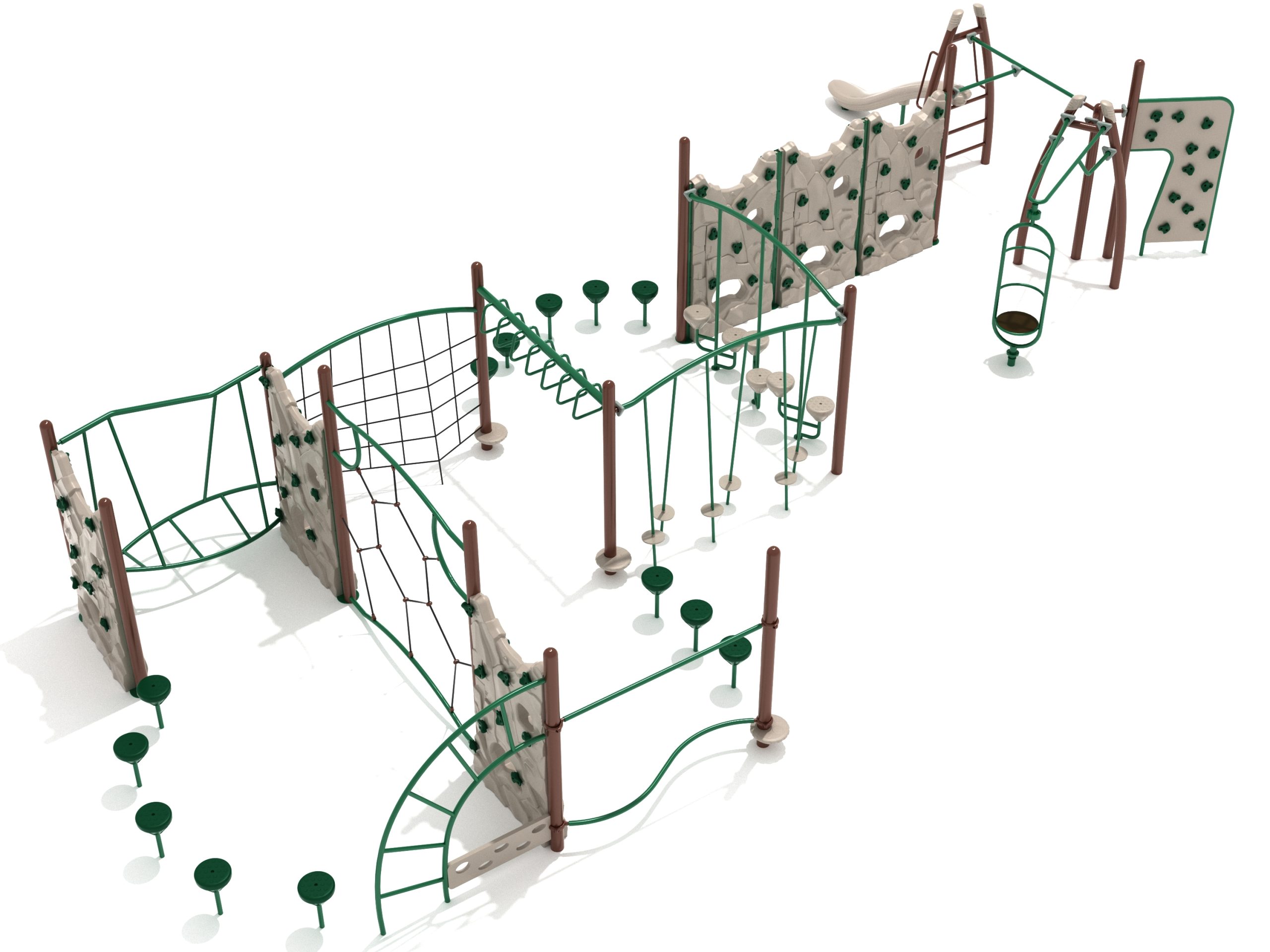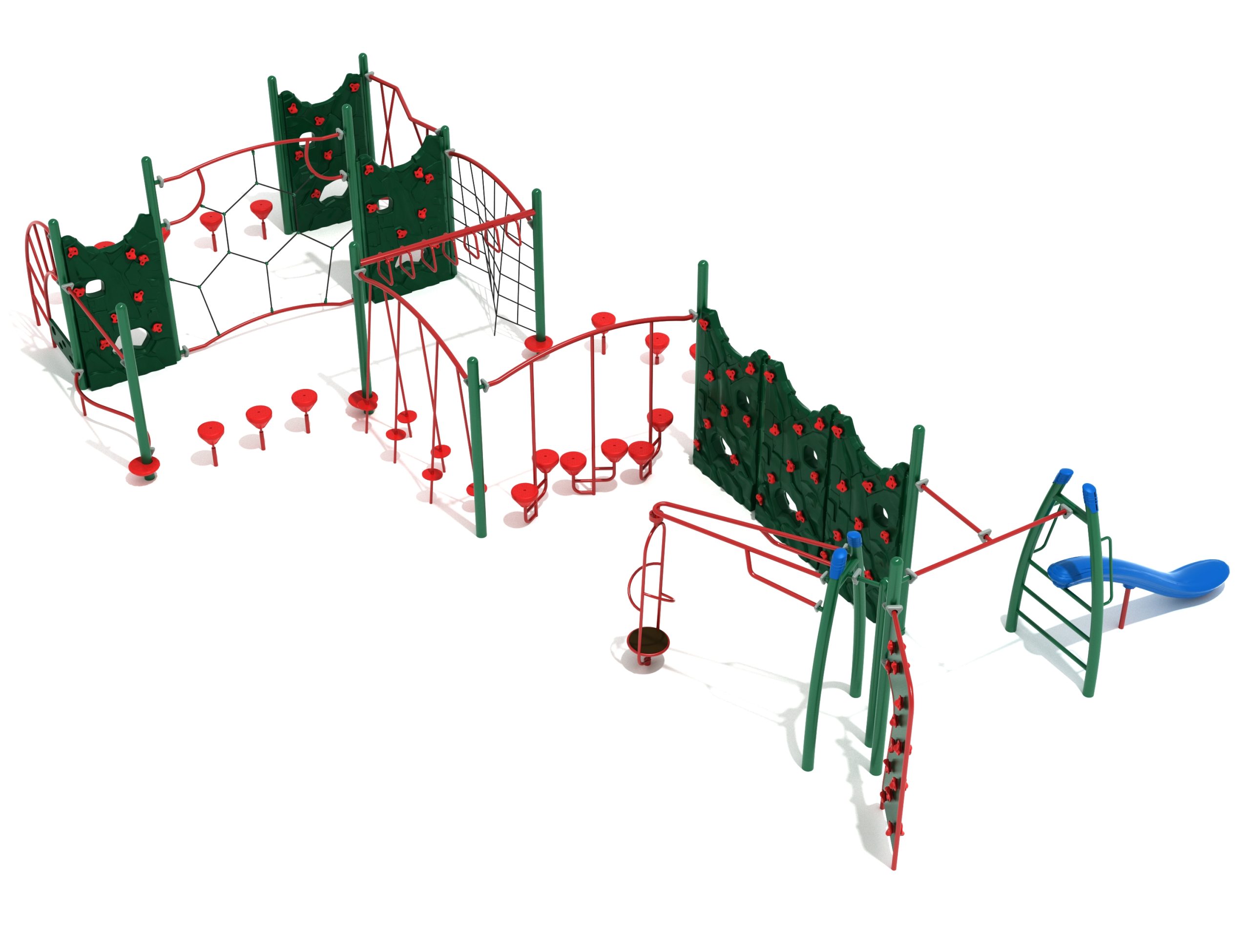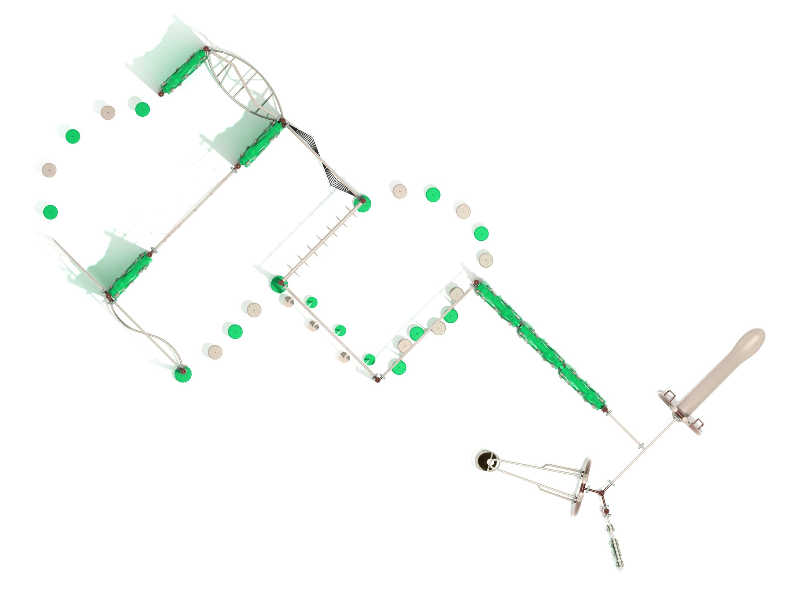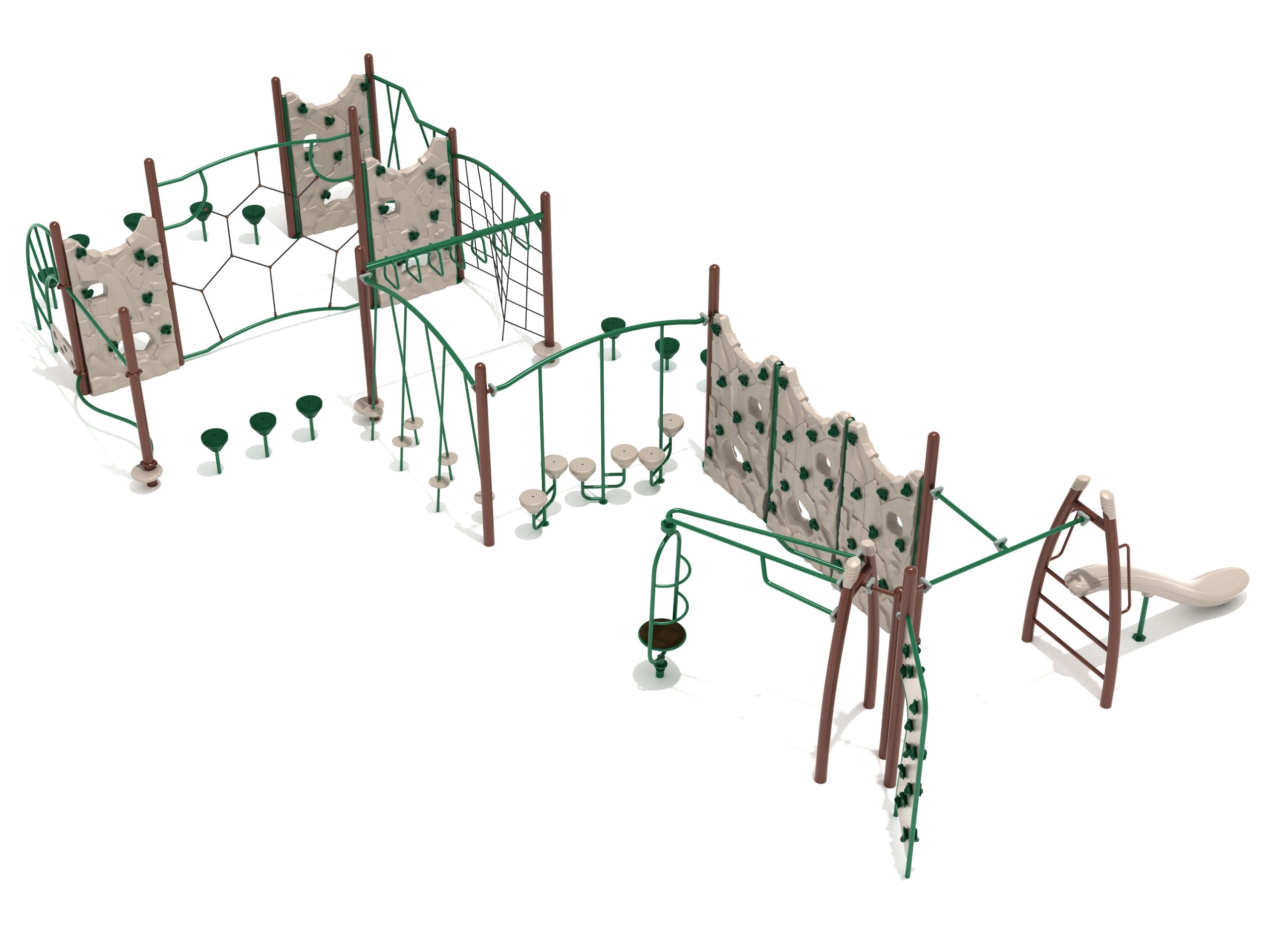 Whether kids like to climb, hop, swing or slide, they’re sure to find something they love about the Cedar Slope play apparatus. 2 sets of 3 Craggy Climber Straight Sections make 12 climbing surfaces in total to test kids to their limit and make them feel like they’re really clinging on to the side of a cliff as they shuffle carefully along. Hands, shoulders and arms are also given a workout on the Overhead Straight Trapezoid Loop Ladder and the Honeycomb Net Climber, both of which require a decent amount of upper body strength and agility. 13 different Pebble Climbers scattered around the structure are complemented by a wavy Pebble Bridge, and there’s even a Tilted Lily Pad Bridge and S Balance Bridge to give a coordination challenge. Before having hours of fun on the Standing Orbital Spinner which rockets kids around in circles, there’s the Zig Zag Net Climber and Zig Zag Challenge Bridge to conquer.