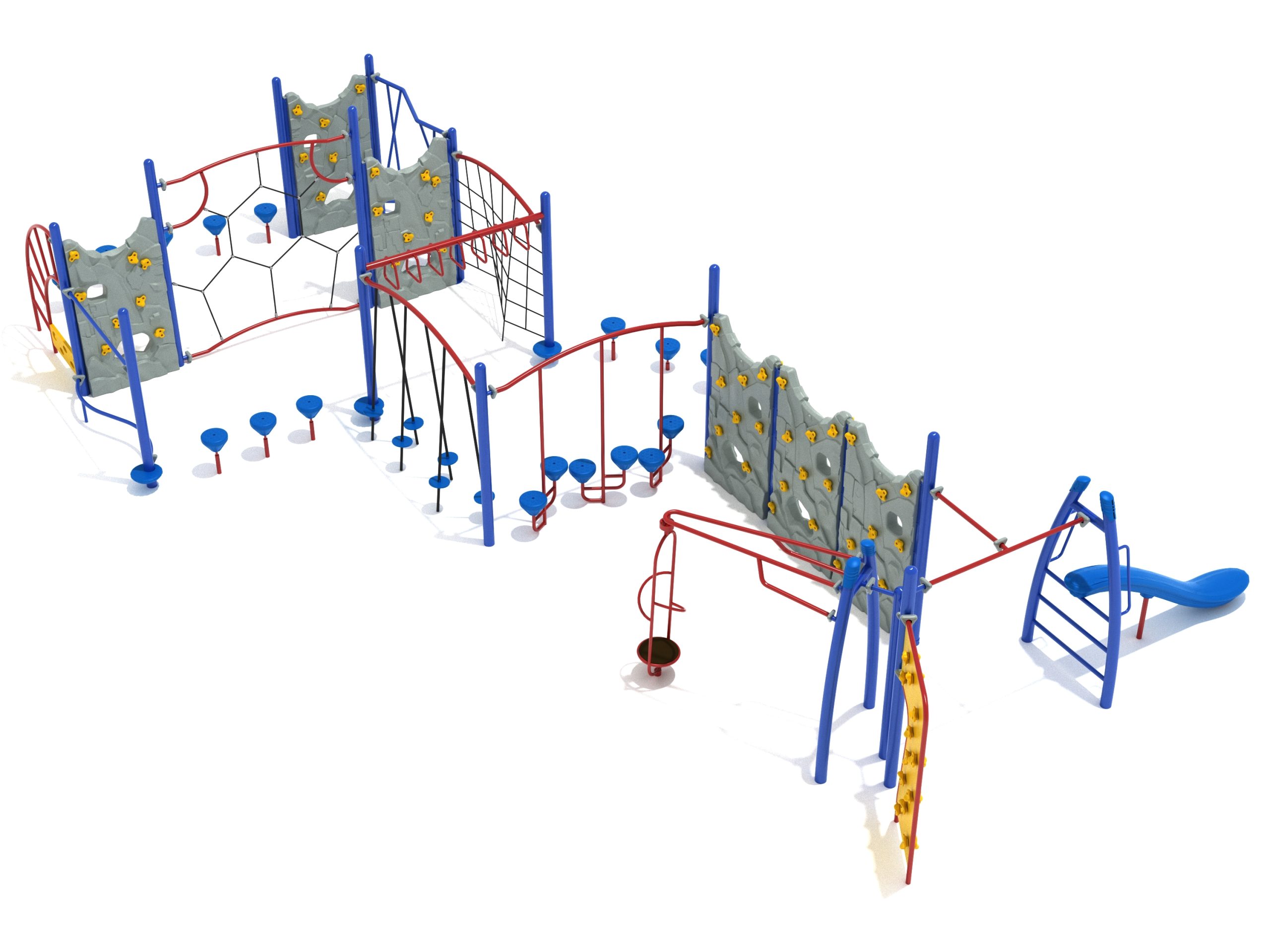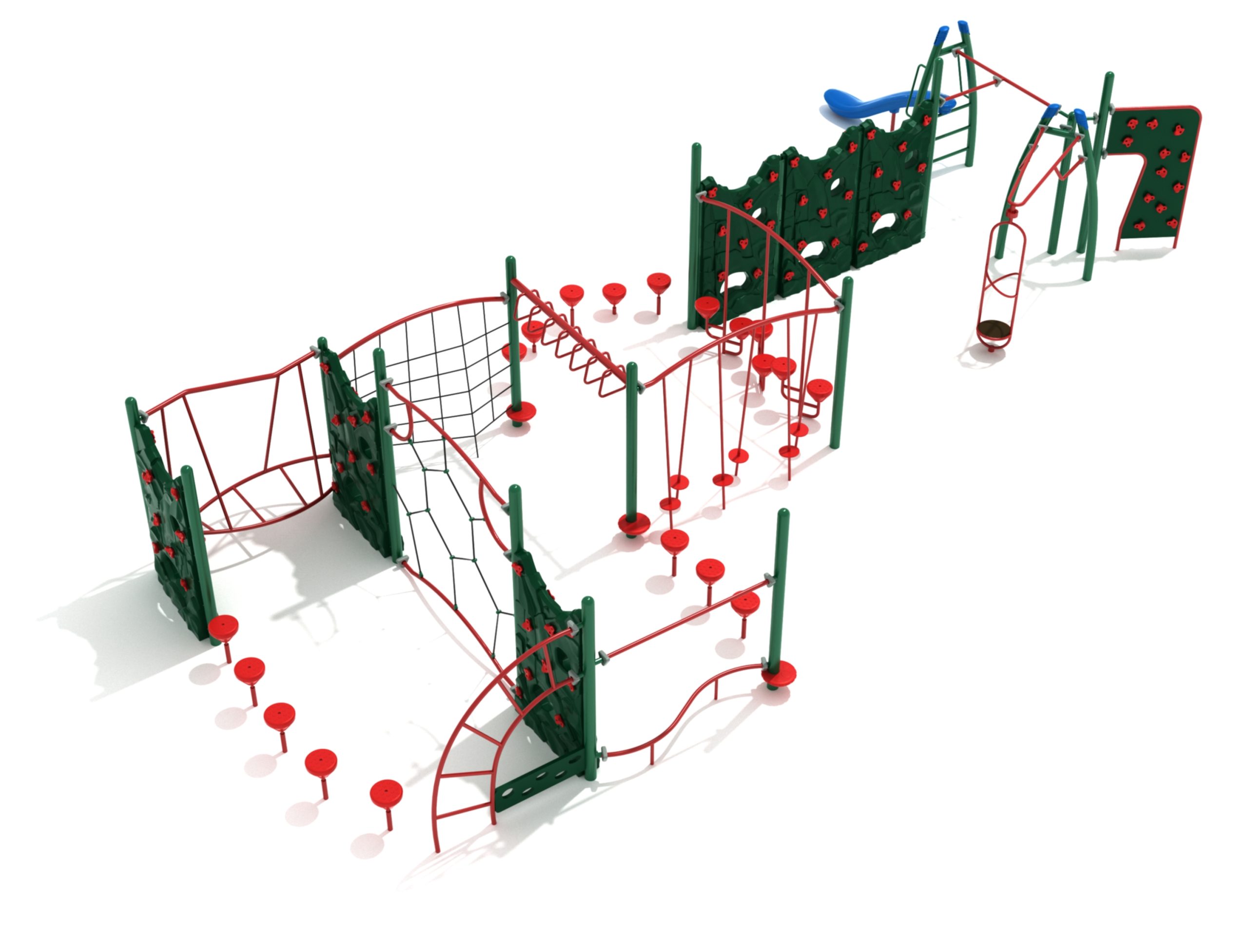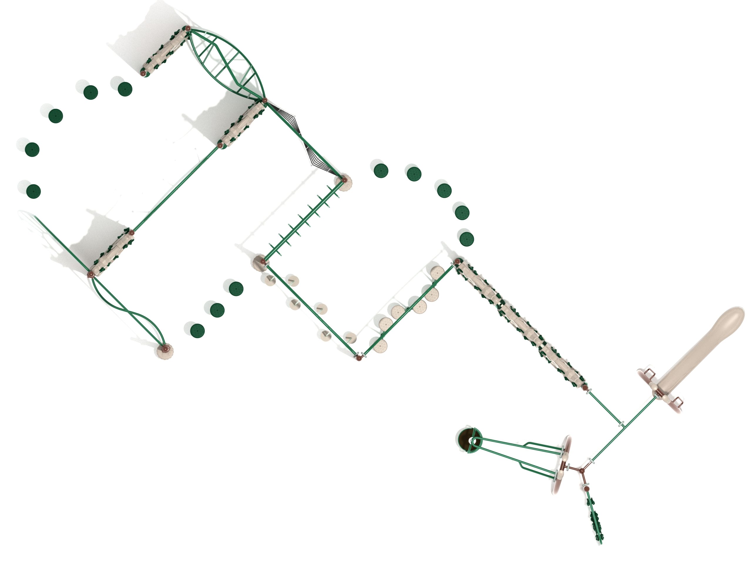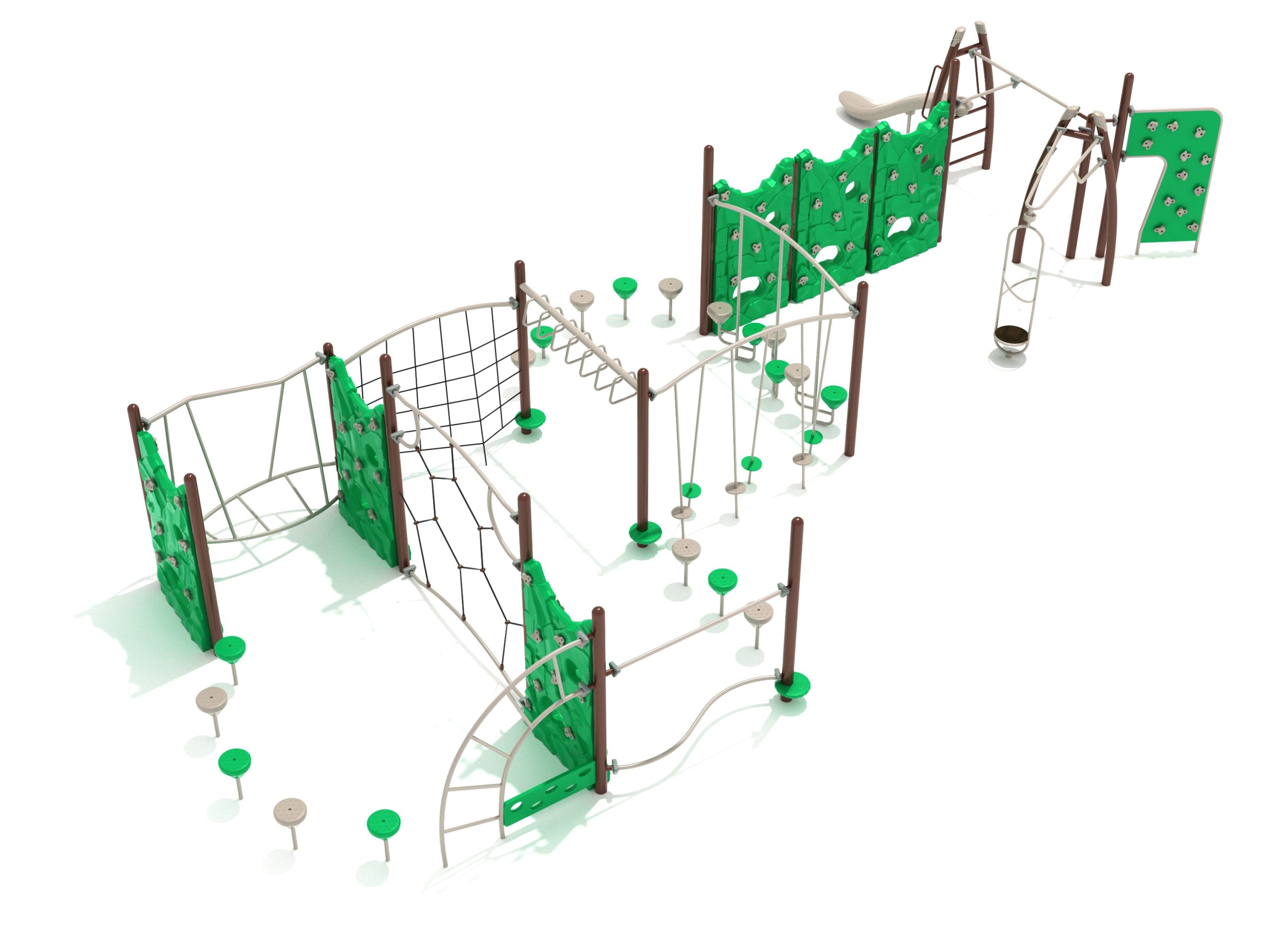 Whether kids like to climb, hop, swing or slide, they’re sure to find something they love about the Cedar Slope play apparatus. 2 sets of 3 Craggy Climber Straight Sections make 12 climbing surfaces in total to test kids to their limit and make them feel like they’re really clinging on to the side of a cliff as they shuffle carefully along. Hands, shoulders and arms are also given a workout on the Overhead Straight Trapezoid Loop Ladder and the Honeycomb Net Climber, both of which require a decent amount of upper body strength and agility. 13 different Pebble Climbers scattered around the structure are complemented by a wavy Pebble Bridge, and there’s even a Tilted Lily Pad Bridge and S Balance Bridge to give a coordination challenge. Before having hours of fun on the Standing Orbital Spinner which rockets kids around in circles, there’s the Zig Zag Net Climber and Zig Zag Challenge Bridge to conquer.