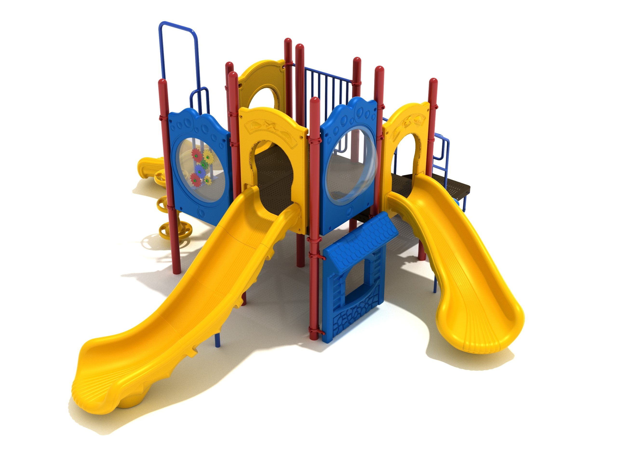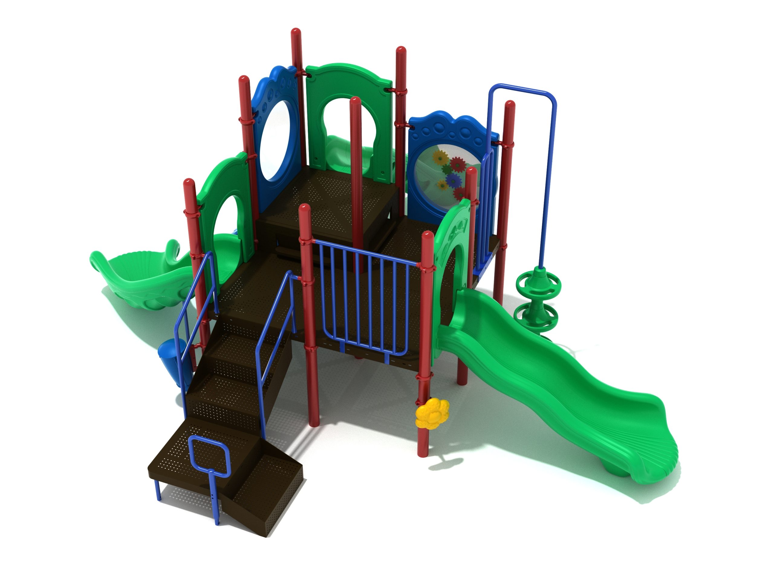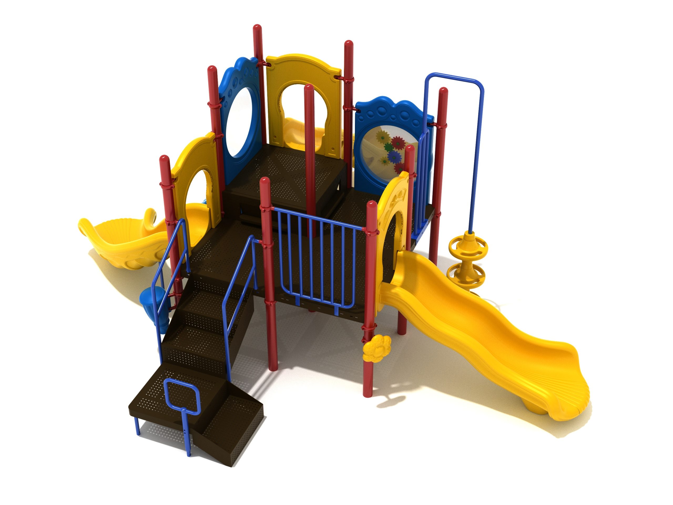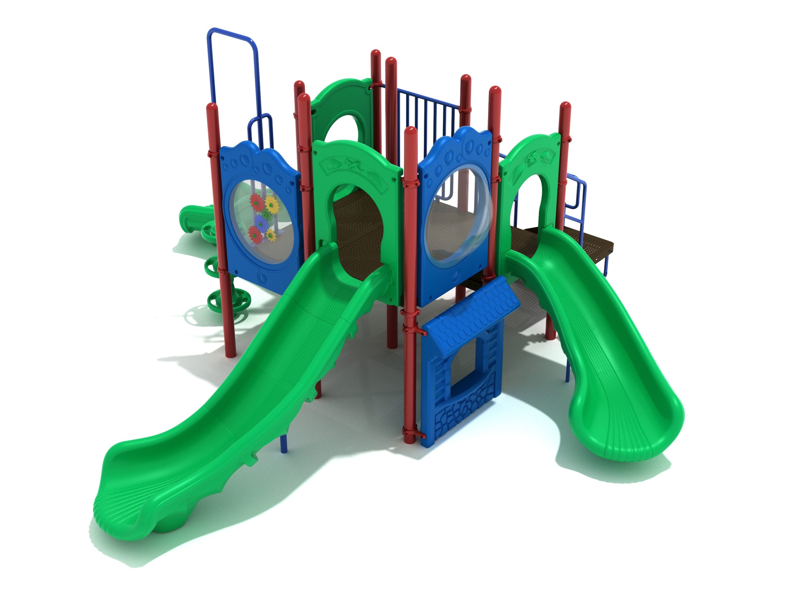 The Charleston play set is a fortress of fun where kids are never far from a slide or from their next adventure. The Charleston playground set is the perfect base for new play areas, including all of the basics kids expect to find on the playground. The sturdy plastic material is child-friendly and safe, so young kids will be free from the risk of scrapes, cuts, and splinters they risk on metal and wooden playgrounds. There’s something for every child on the Charleston play set, including a slide, a gear game, climbers, and a playhouse panel for imaginary games. The Charleston playground set also can be used in either outdoor or indoor playground spaces. Many Kid-Pleasing Features The main deck has a large square shape that gives children room to move around. The three slides, including two Right Turn Slides and a Wave Slide, that branch off from these decks give children plenty of options that they can easily choose between. Most of the square deck stands at 3 feet tall, but one quadrant has a little extra height at 4 feet. This is so that the Right Turn Slide attached to this section has a little bit of extra length to make it the most exciting of the three. To reach the deck, children can either climb up the transfer station stairs or use the vertical Pod Climber. A Single Drum and Store Panel provide additional activities on the ground level. And the Charleston play set is ADA-compliant, so children of all abilities can enjoy it. Save on a Charleston Playground Set When you need safe, durable, and affordable play equipment like the Charleston playground set, you can always count on PlaygroundEquipment.com to deliver. Our knowledgeable staff can also help you with installation options and planning your new play area. Get in touch with us today to get started!