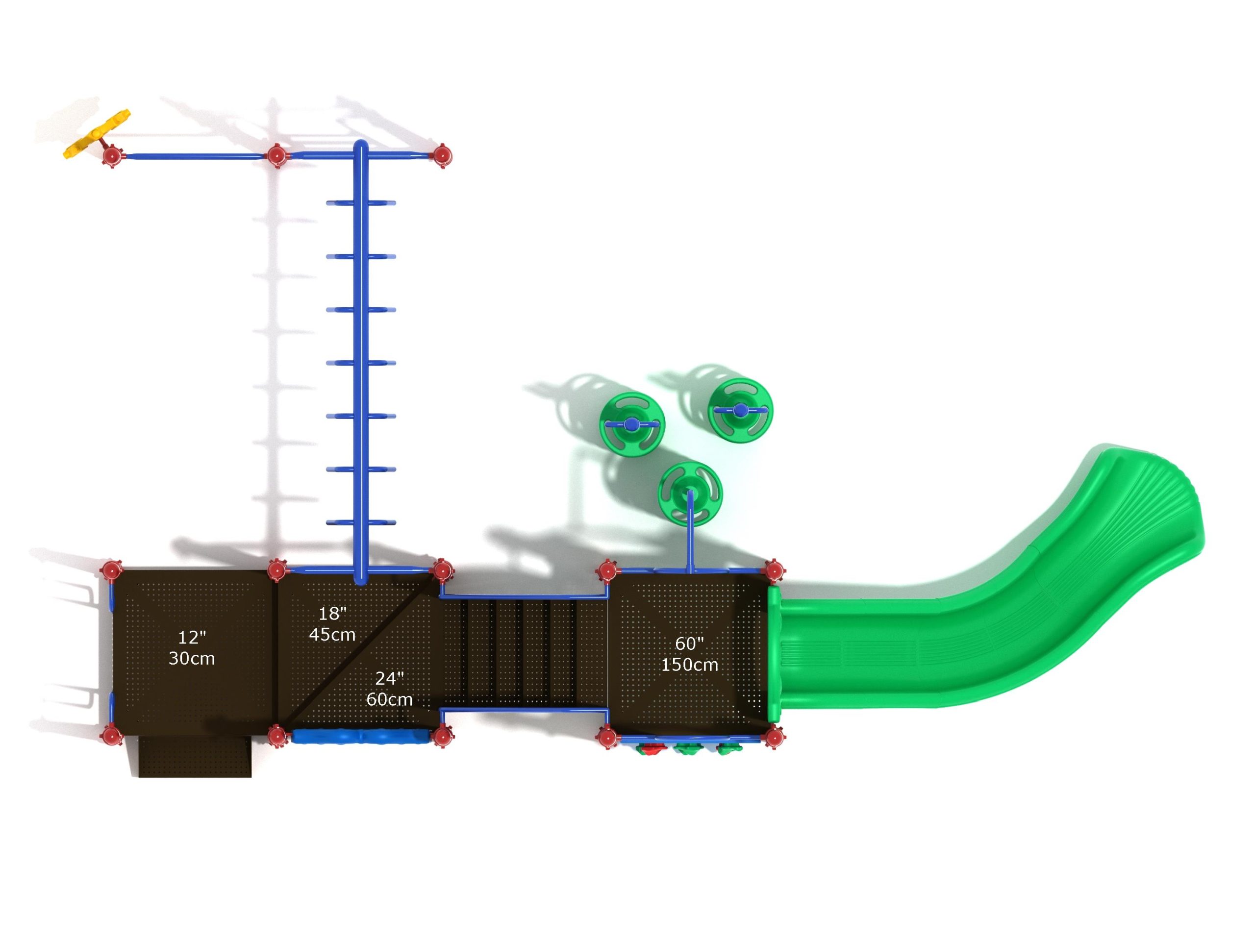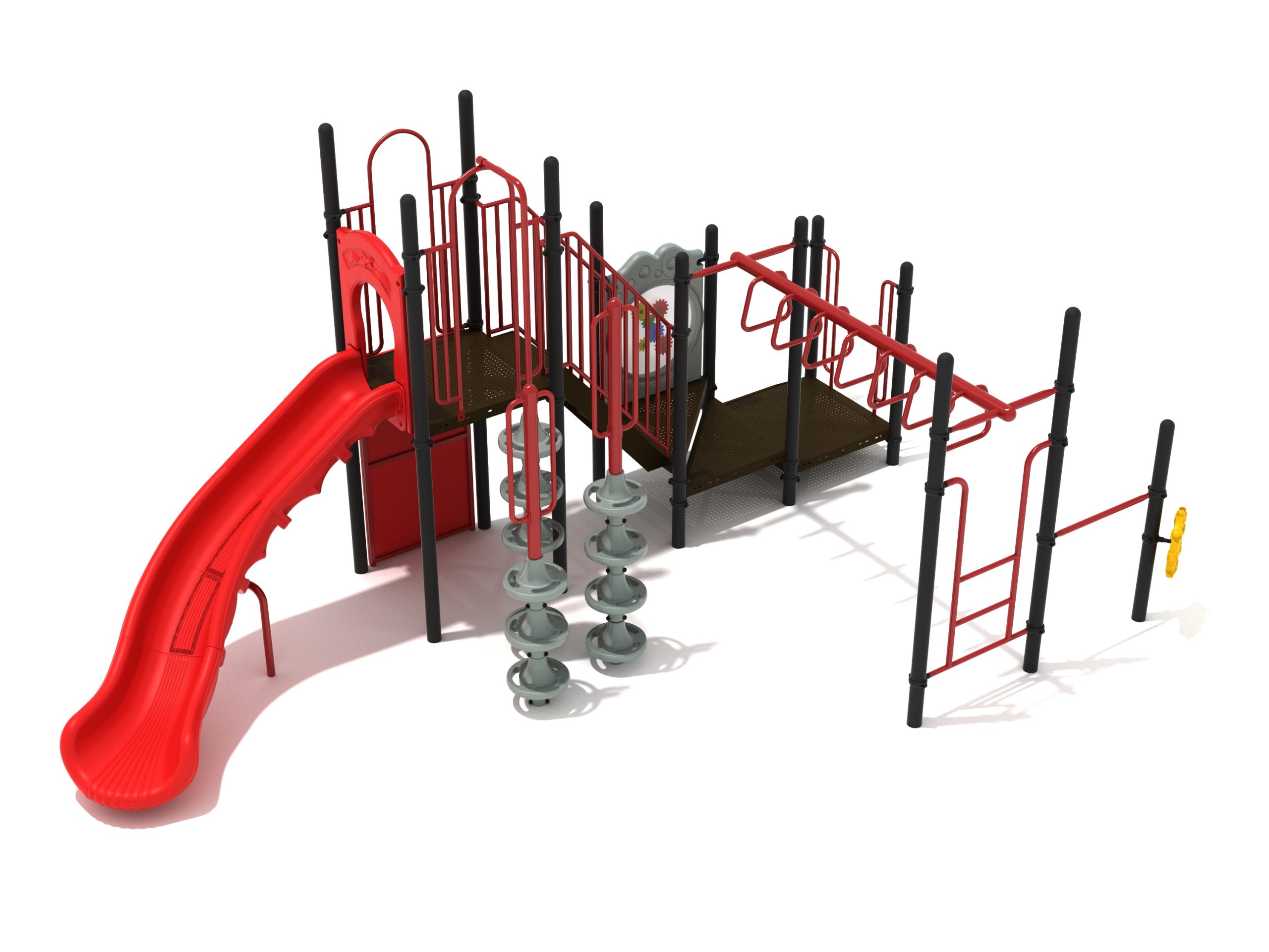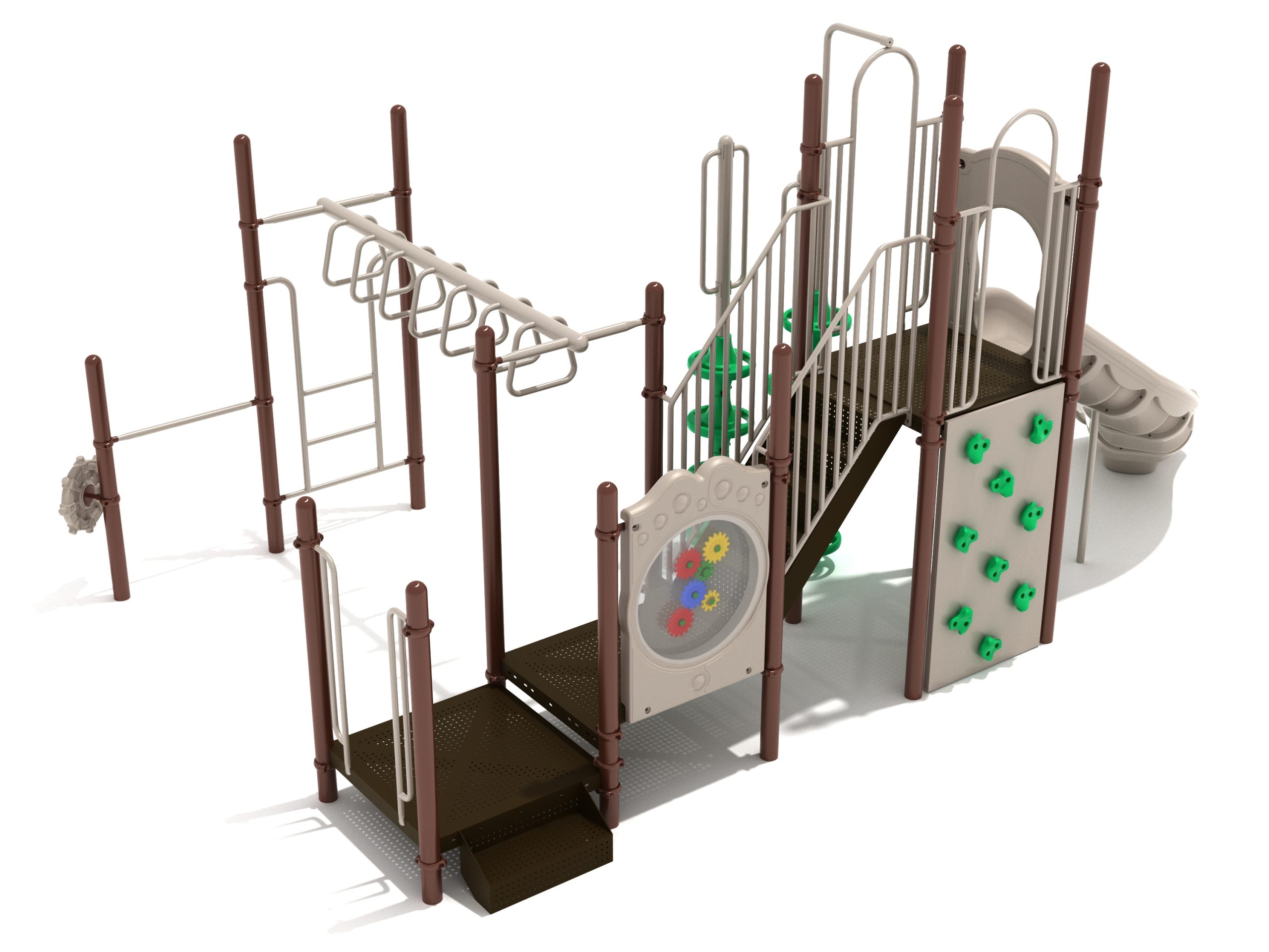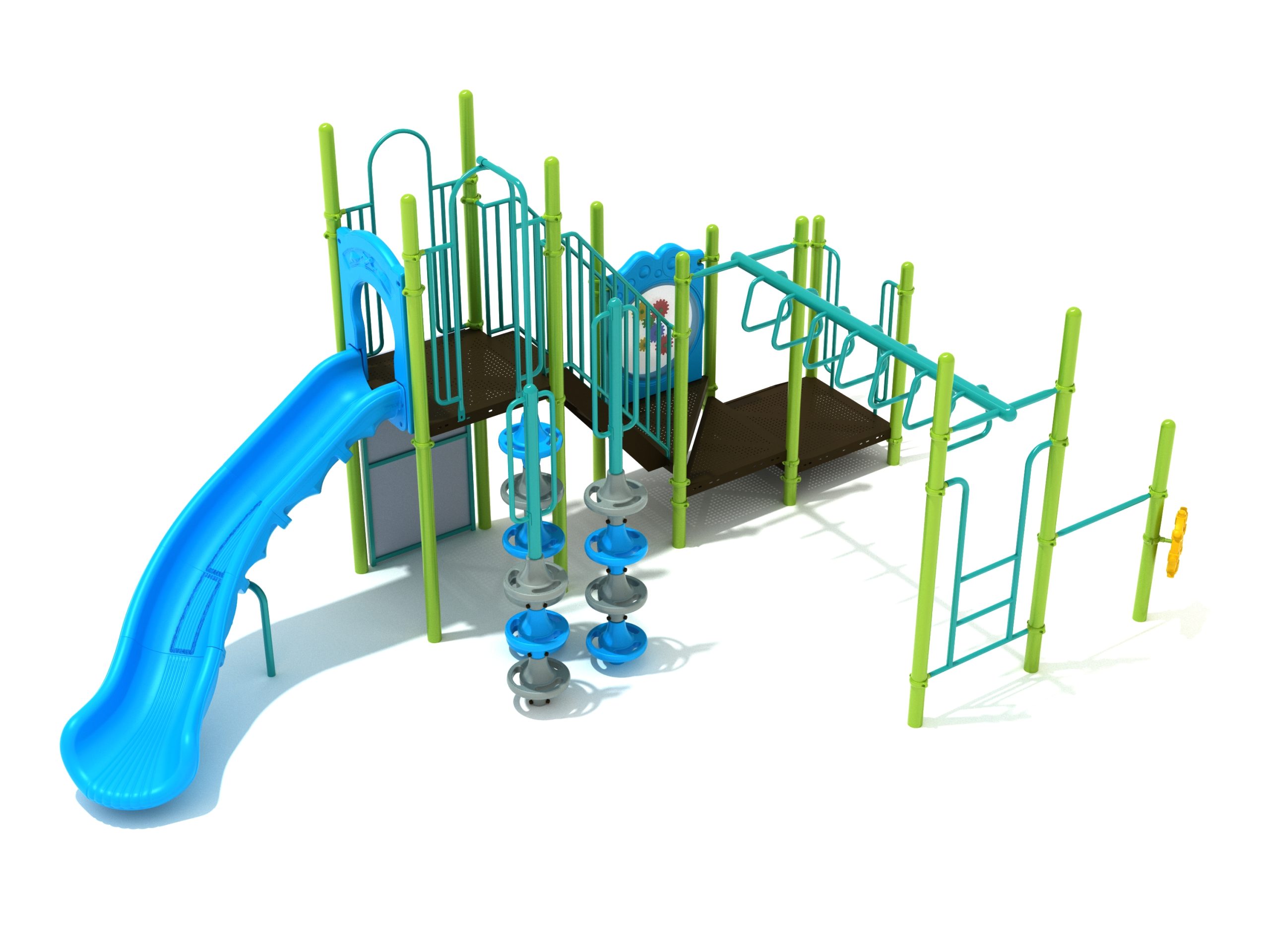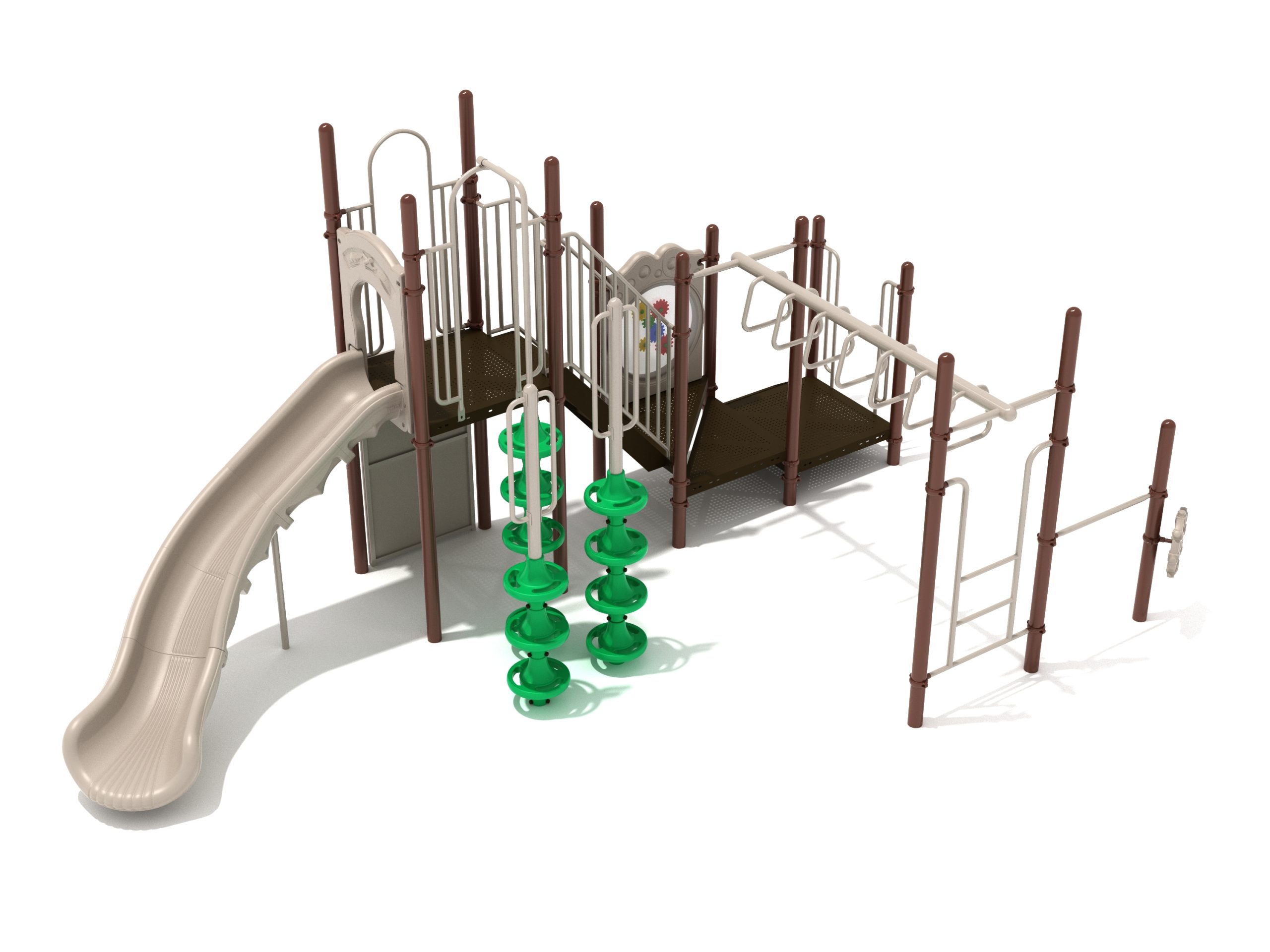 The Charlotte Play System is an action-packed playground structure that promotes fun and healthy physical activity. Kids will love exploring its various climbing features. Remember monkey bars? The Overhead Straight Trapezoid Loop Ladder is just like that but with a modern twist. Besides having fun, kids also build their upper-body strength with it. Moreover, it’s also connected to a Pull-Up Bar, which means more exciting challenges! For those eager to make it to the top, the trio of Pod Climbers offers the quickest way up – not without the challenges. The children must choose between climbing around it or hopping between the columns of steps! On the opposite side, the Vertical PE Rock Climbing Wall gives them another exciting route to reach the top, where they can zoom down the Left Turn Slide. With the wide range of fun activities the Charlotte Play System offers, the kids will definitely not want to leave your playground ever!