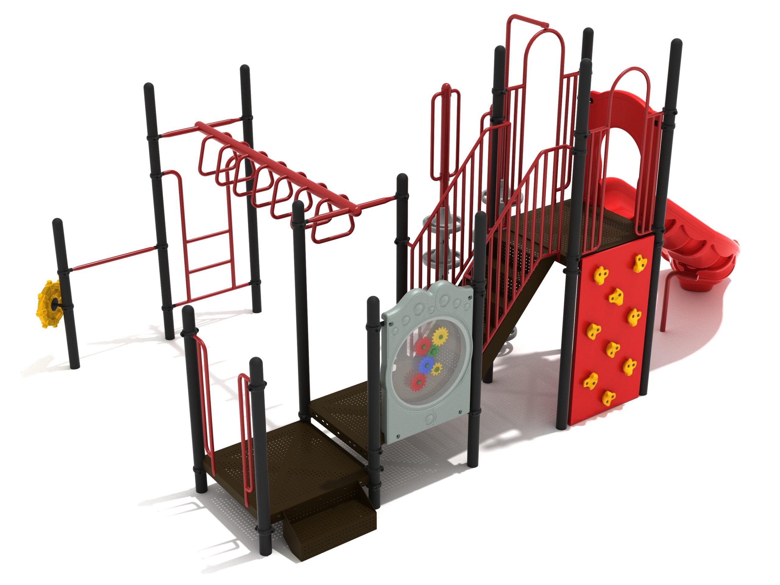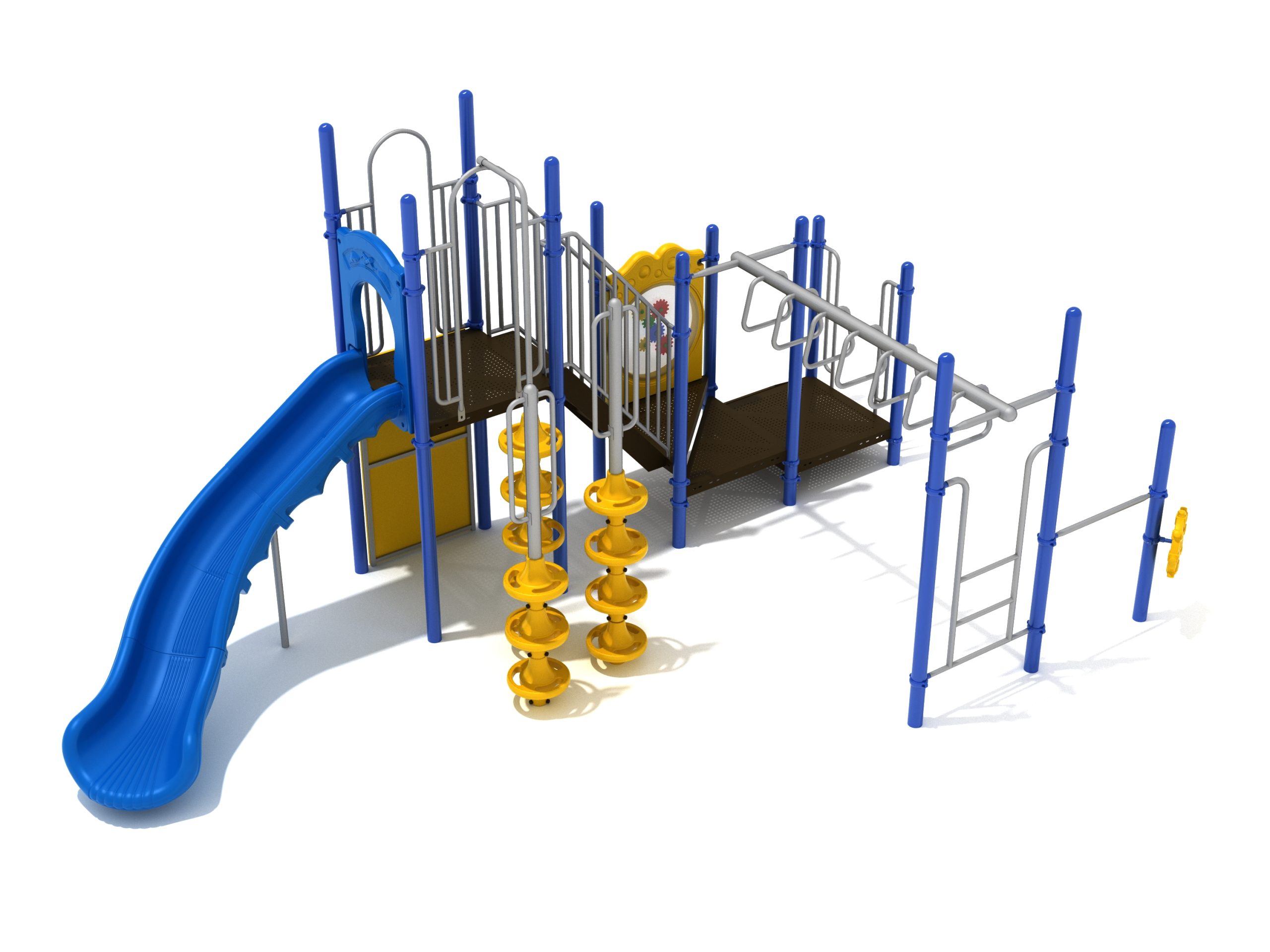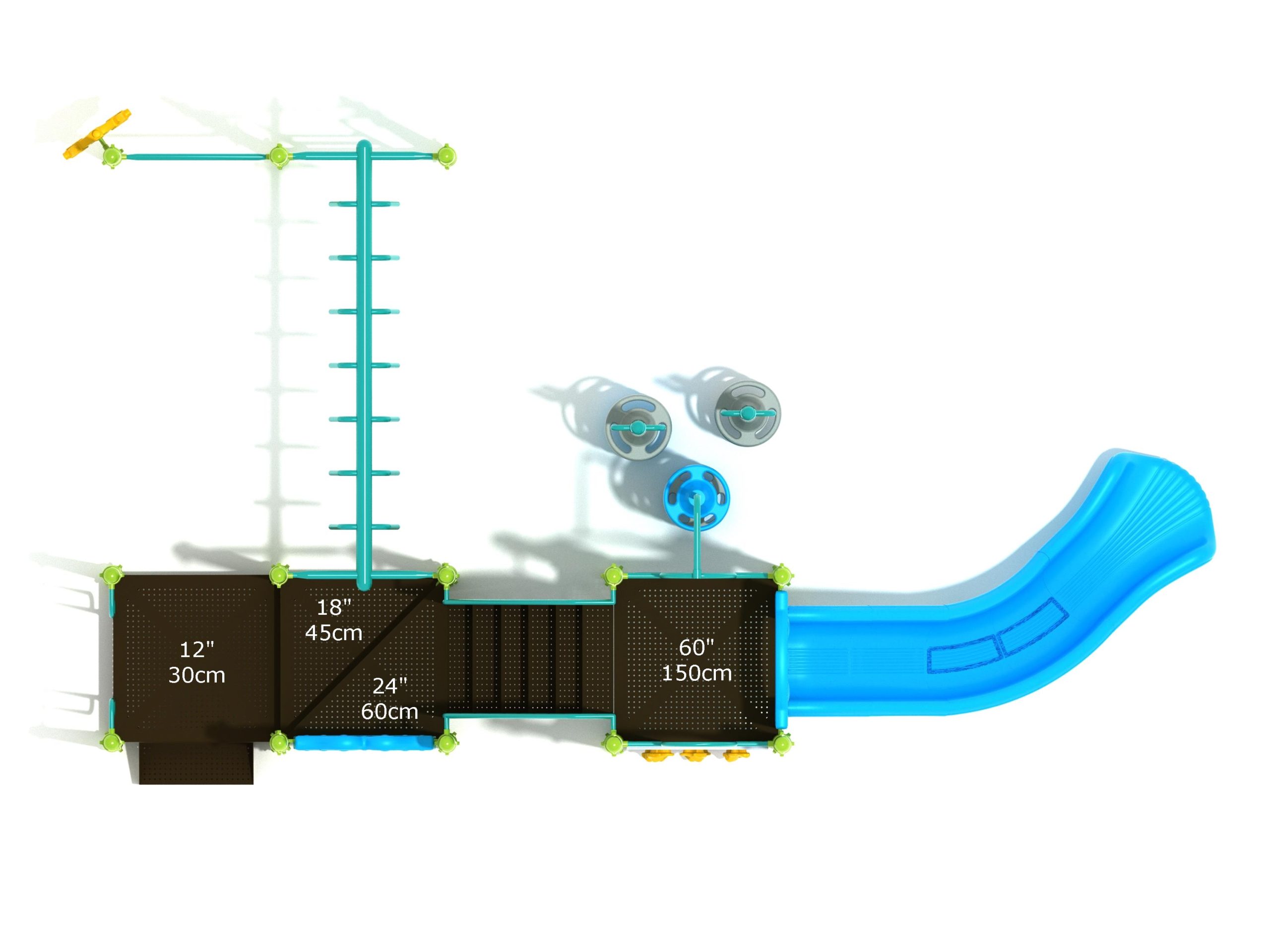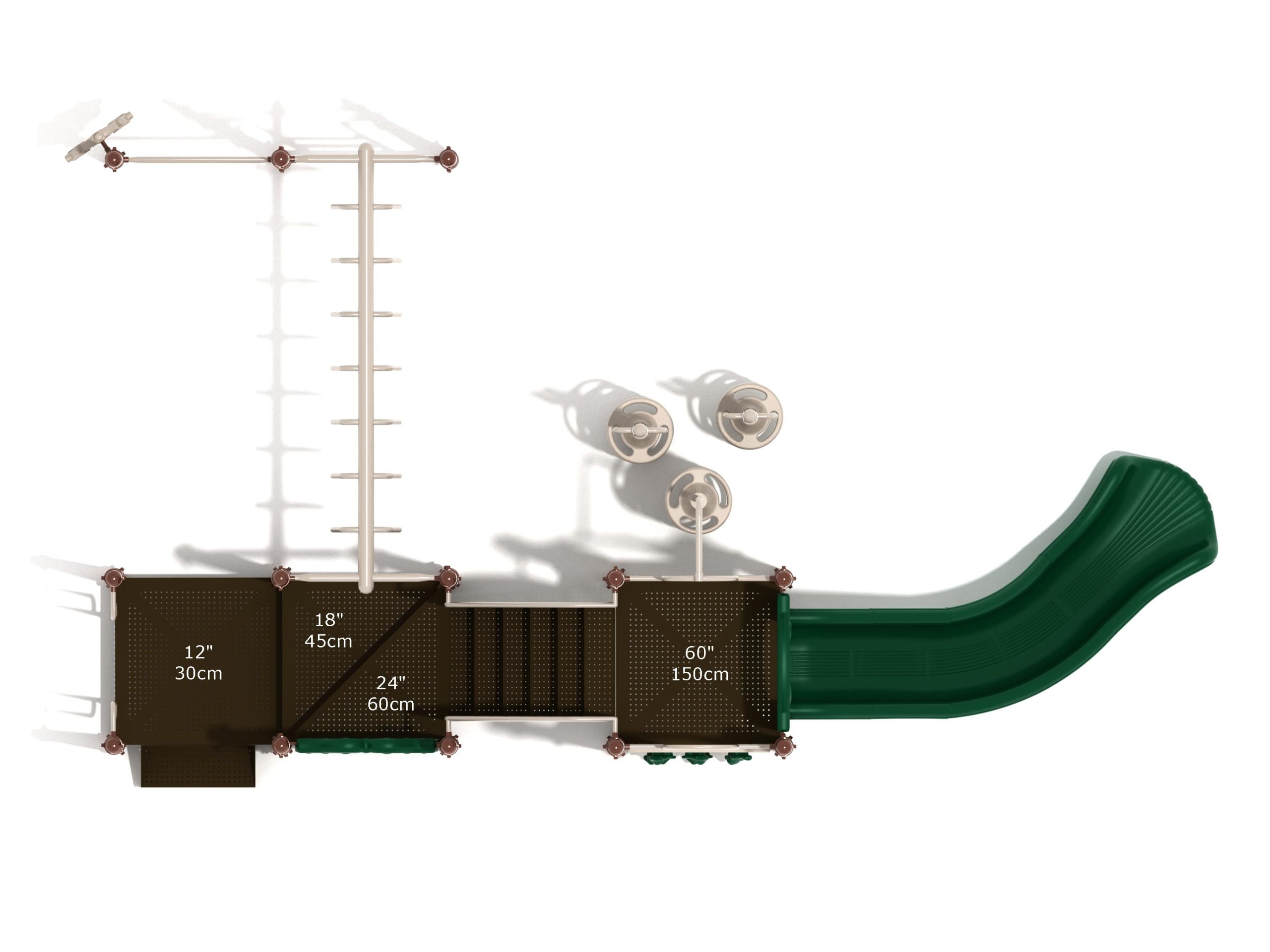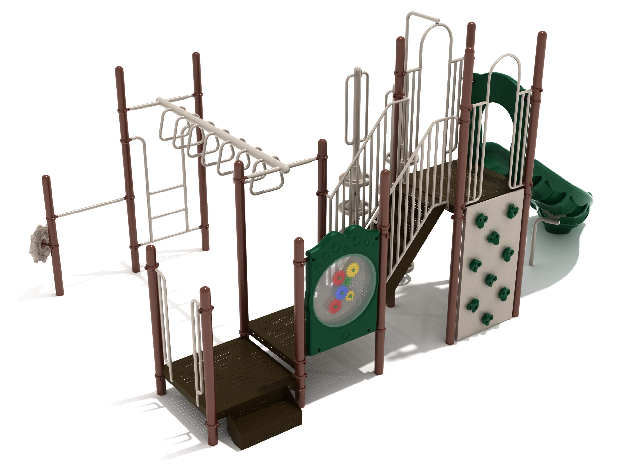 The Charlotte Play System is an action-packed playground structure that promotes fun and healthy physical activity. Kids will love exploring its various climbing features. Remember monkey bars? The Overhead Straight Trapezoid Loop Ladder is just like that but with a modern twist. Besides having fun, kids also build their upper-body strength with it. Moreover, it’s also connected to a Pull-Up Bar, which means more exciting challenges! For those eager to make it to the top, the trio of Pod Climbers offers the quickest way up – not without the challenges. The children must choose between climbing around it or hopping between the columns of steps! On the opposite side, the Vertical PE Rock Climbing Wall gives them another exciting route to reach the top, where they can zoom down the Left Turn Slide. With the wide range of fun activities the Charlotte Play System offers, the kids will definitely not want to leave your playground ever!