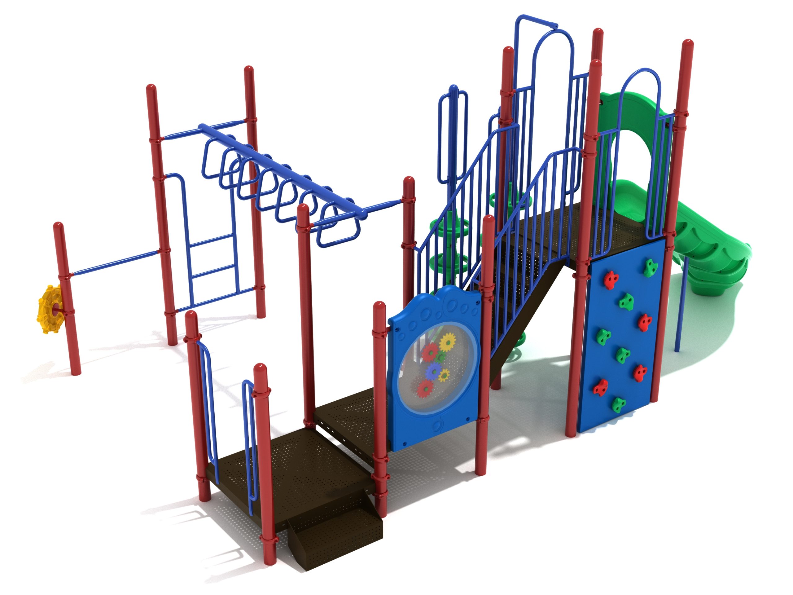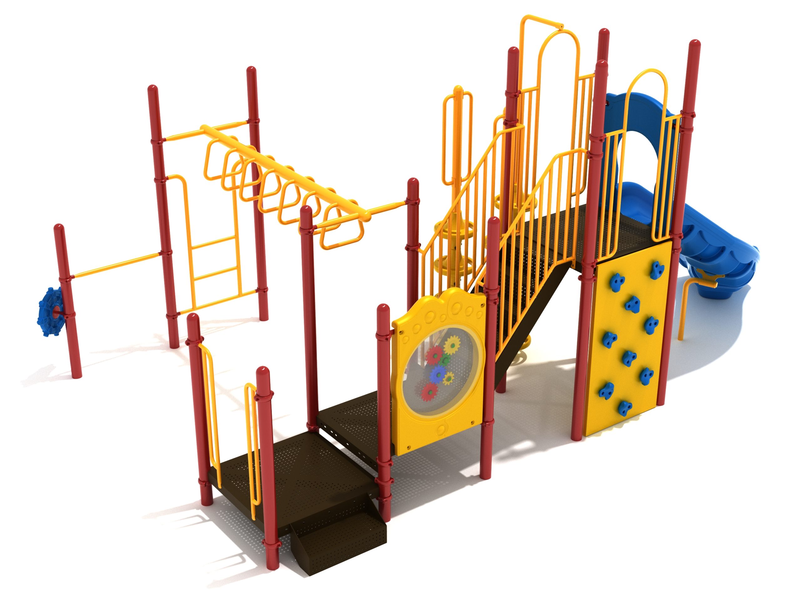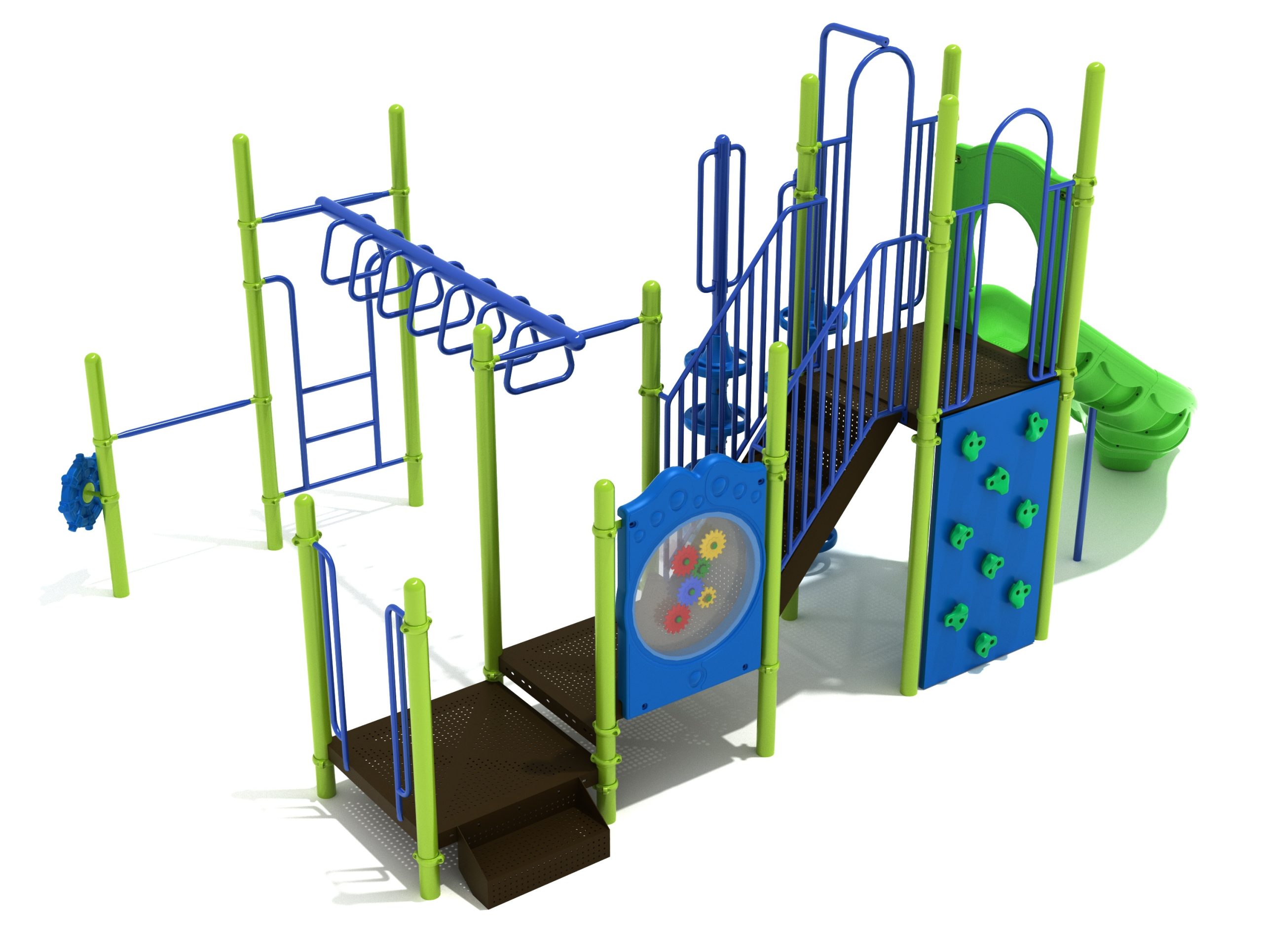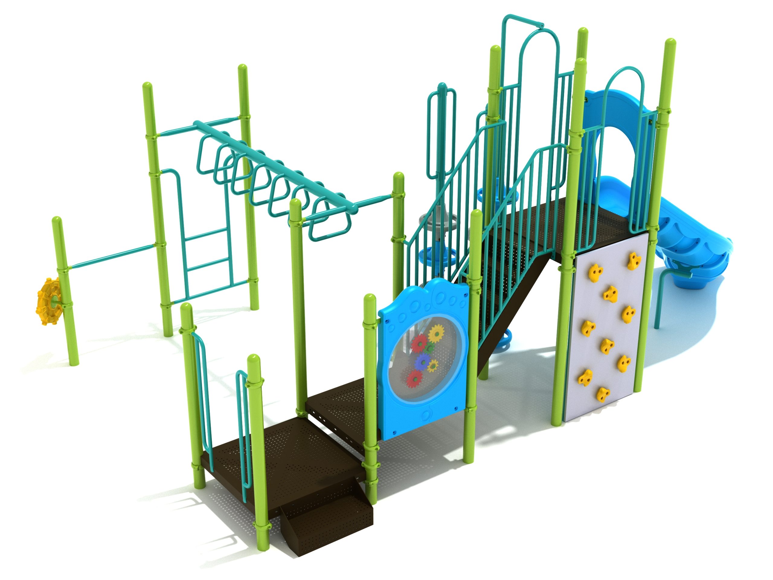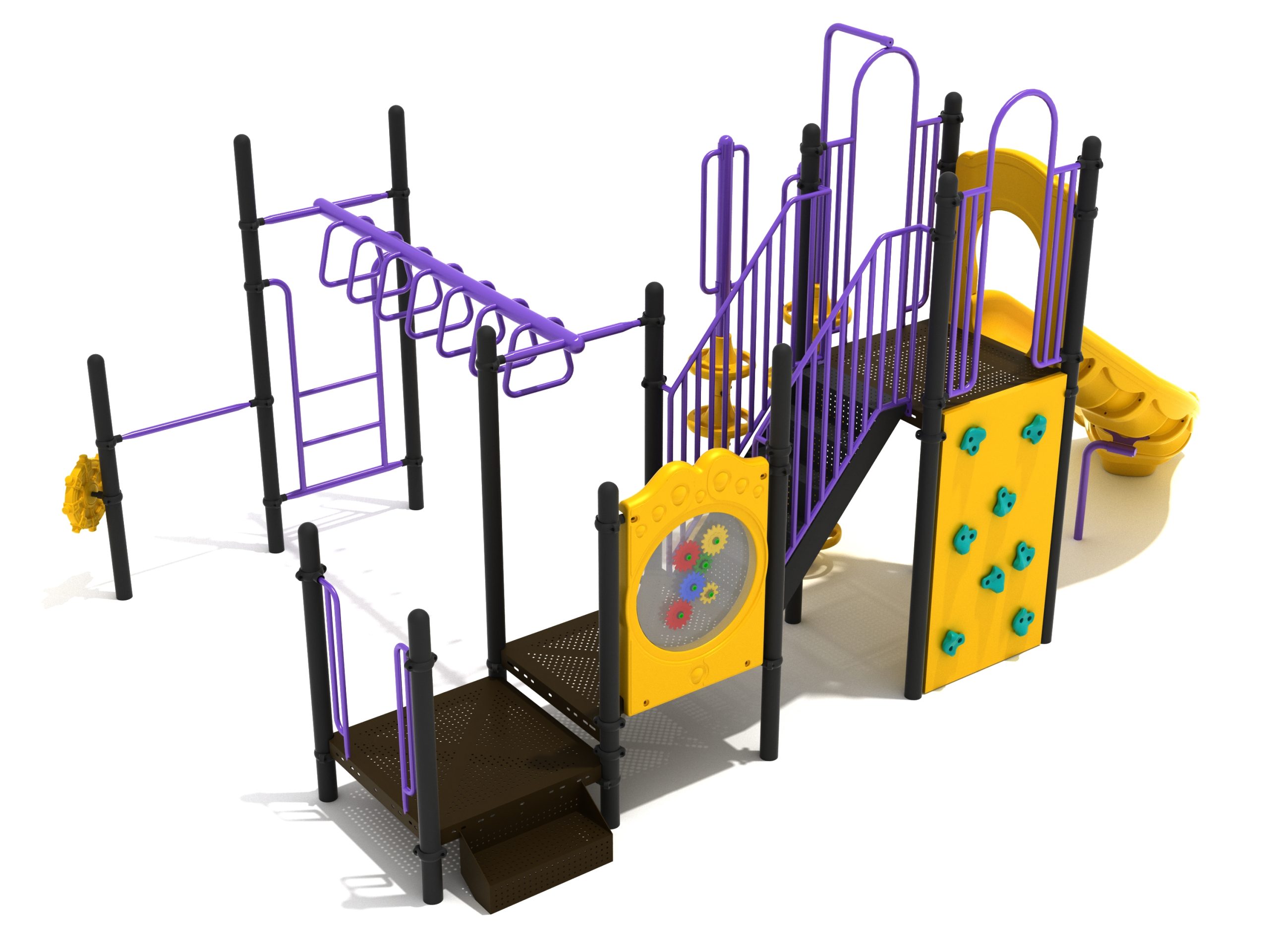 The Charlotte Play System is an action-packed playground structure that promotes fun and healthy physical activity. Kids will love exploring its various climbing features. Remember monkey bars? The Overhead Straight Trapezoid Loop Ladder is just like that but with a modern twist. Besides having fun, kids also build their upper-body strength with it. Moreover, it’s also connected to a Pull-Up Bar, which means more exciting challenges! For those eager to make it to the top, the trio of Pod Climbers offers the quickest way up – not without the challenges. The children must choose between climbing around it or hopping between the columns of steps! On the opposite side, the Vertical PE Rock Climbing Wall gives them another exciting route to reach the top, where they can zoom down the Left Turn Slide. With the wide range of fun activities the Charlotte Play System offers, the kids will definitely not want to leave your playground ever!