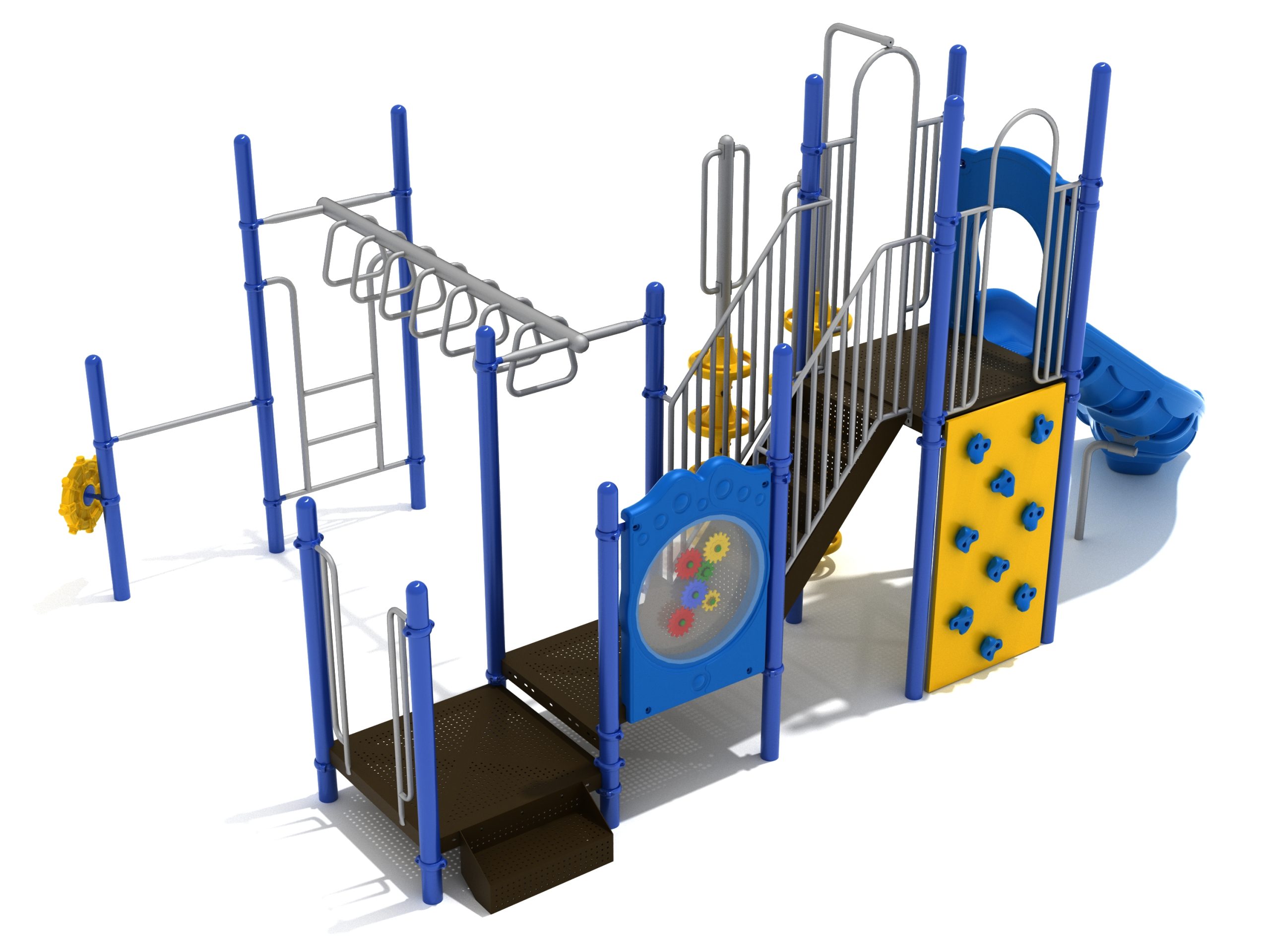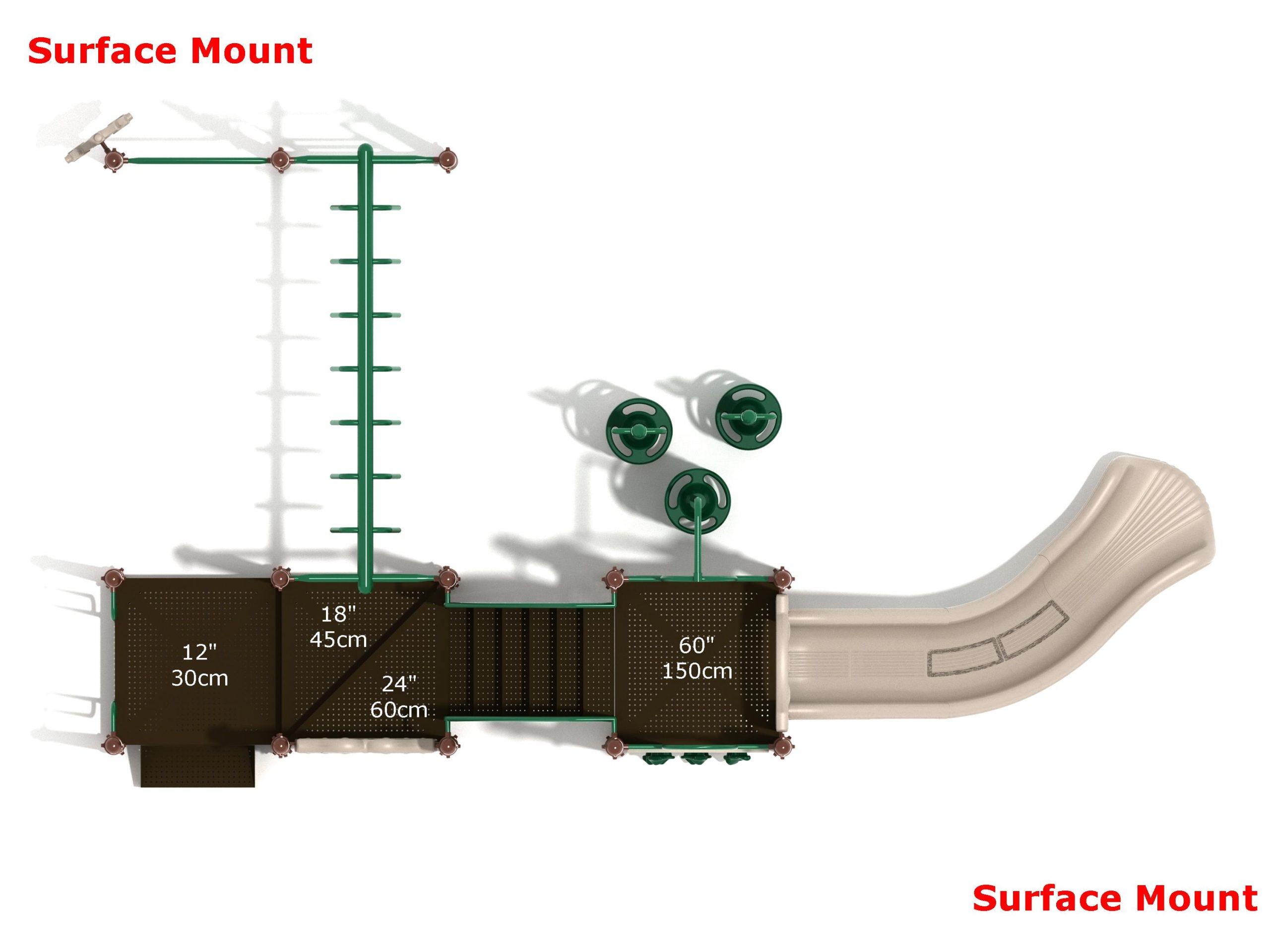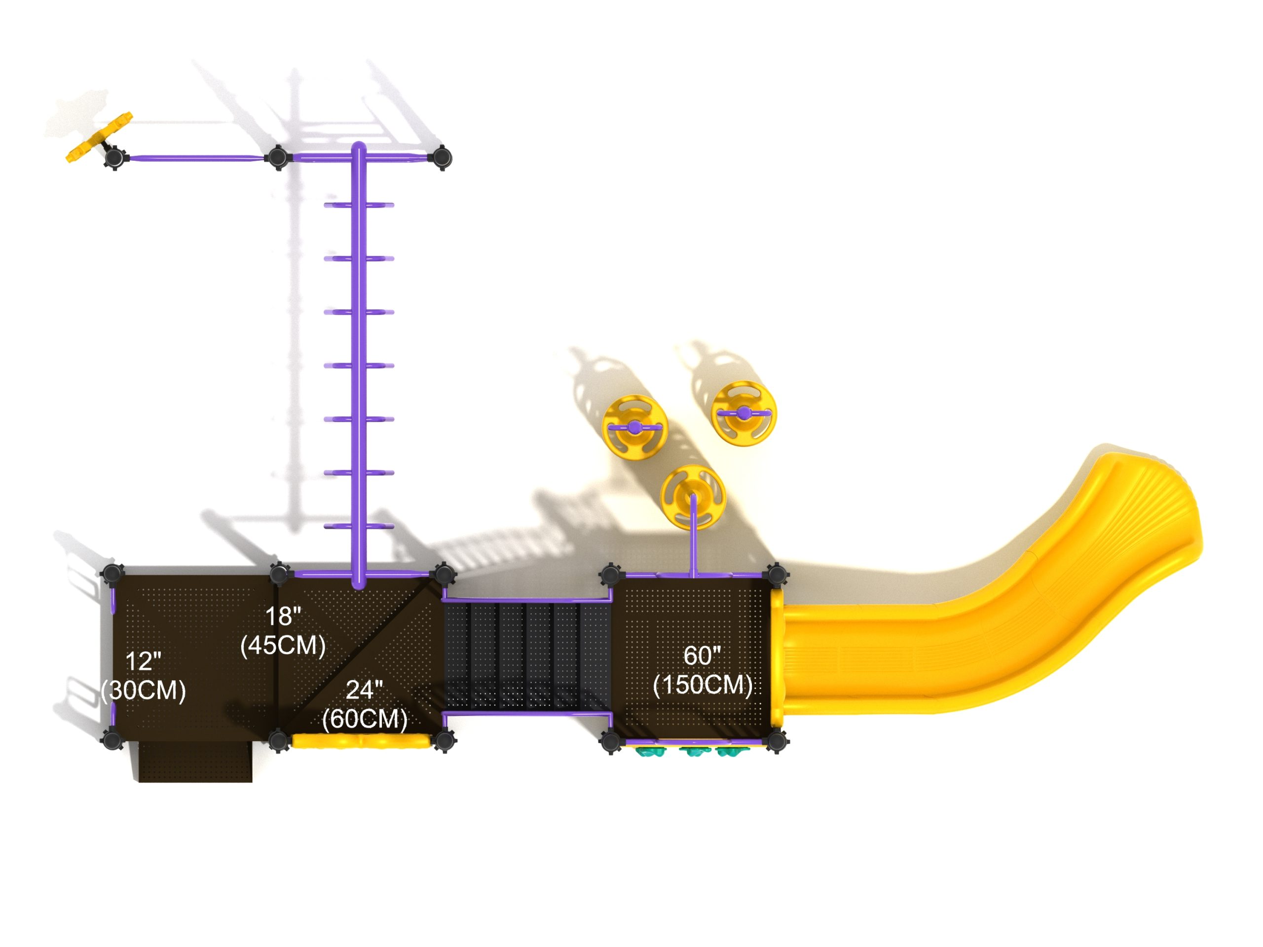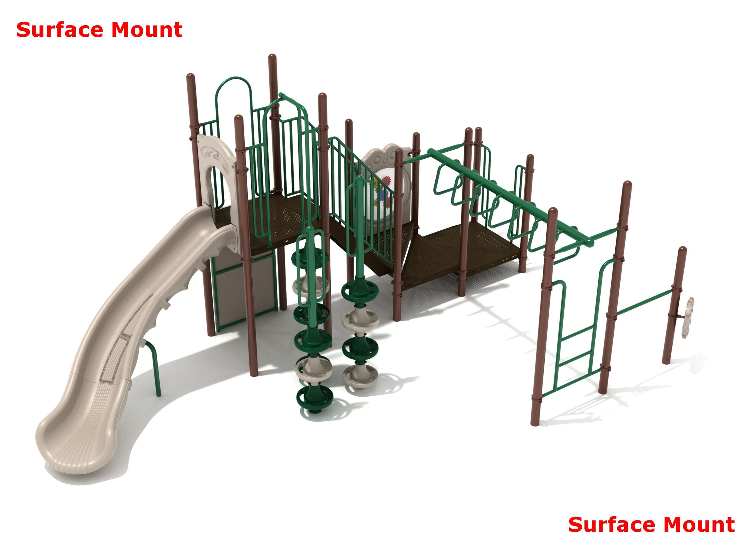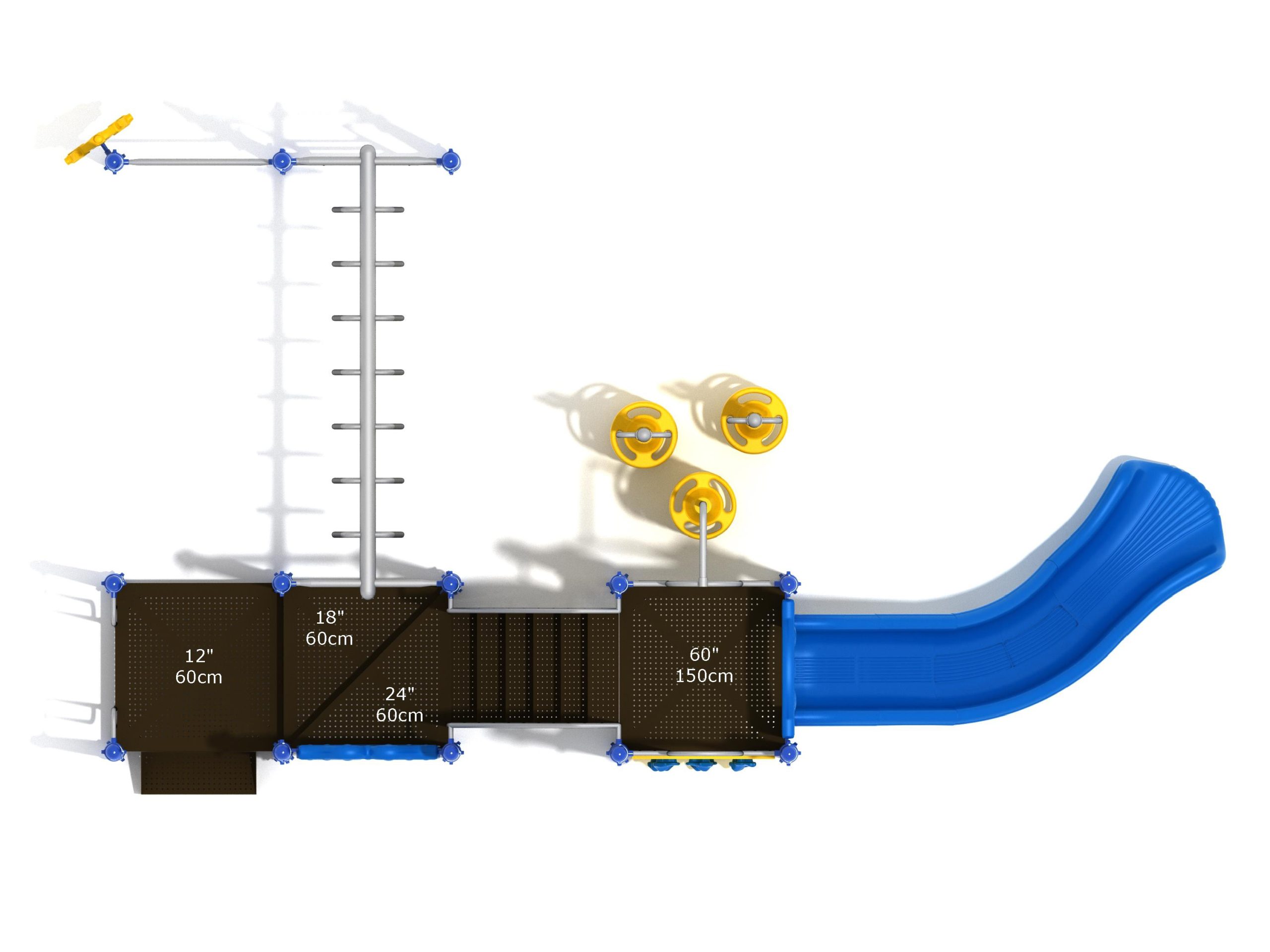 The Charlotte Play System is an action-packed playground structure that promotes fun and healthy physical activity. Kids will love exploring its various climbing features. Remember monkey bars? The Overhead Straight Trapezoid Loop Ladder is just like that but with a modern twist. Besides having fun, kids also build their upper-body strength with it. Moreover, it’s also connected to a Pull-Up Bar, which means more exciting challenges! For those eager to make it to the top, the trio of Pod Climbers offers the quickest way up – not without the challenges. The children must choose between climbing around it or hopping between the columns of steps! On the opposite side, the Vertical PE Rock Climbing Wall gives them another exciting route to reach the top, where they can zoom down the Left Turn Slide. With the wide range of fun activities the Charlotte Play System offers, the kids will definitely not want to leave your playground ever!