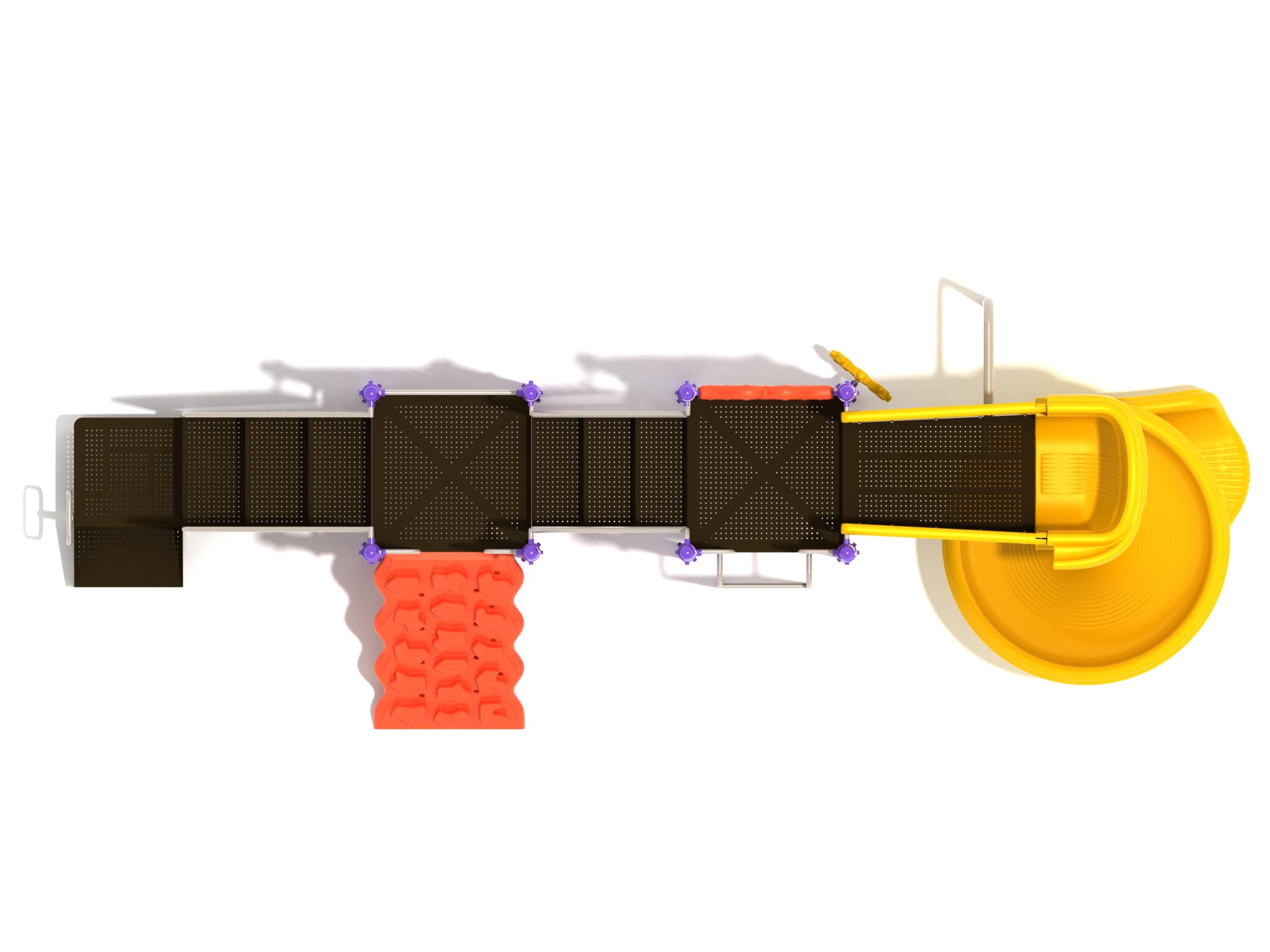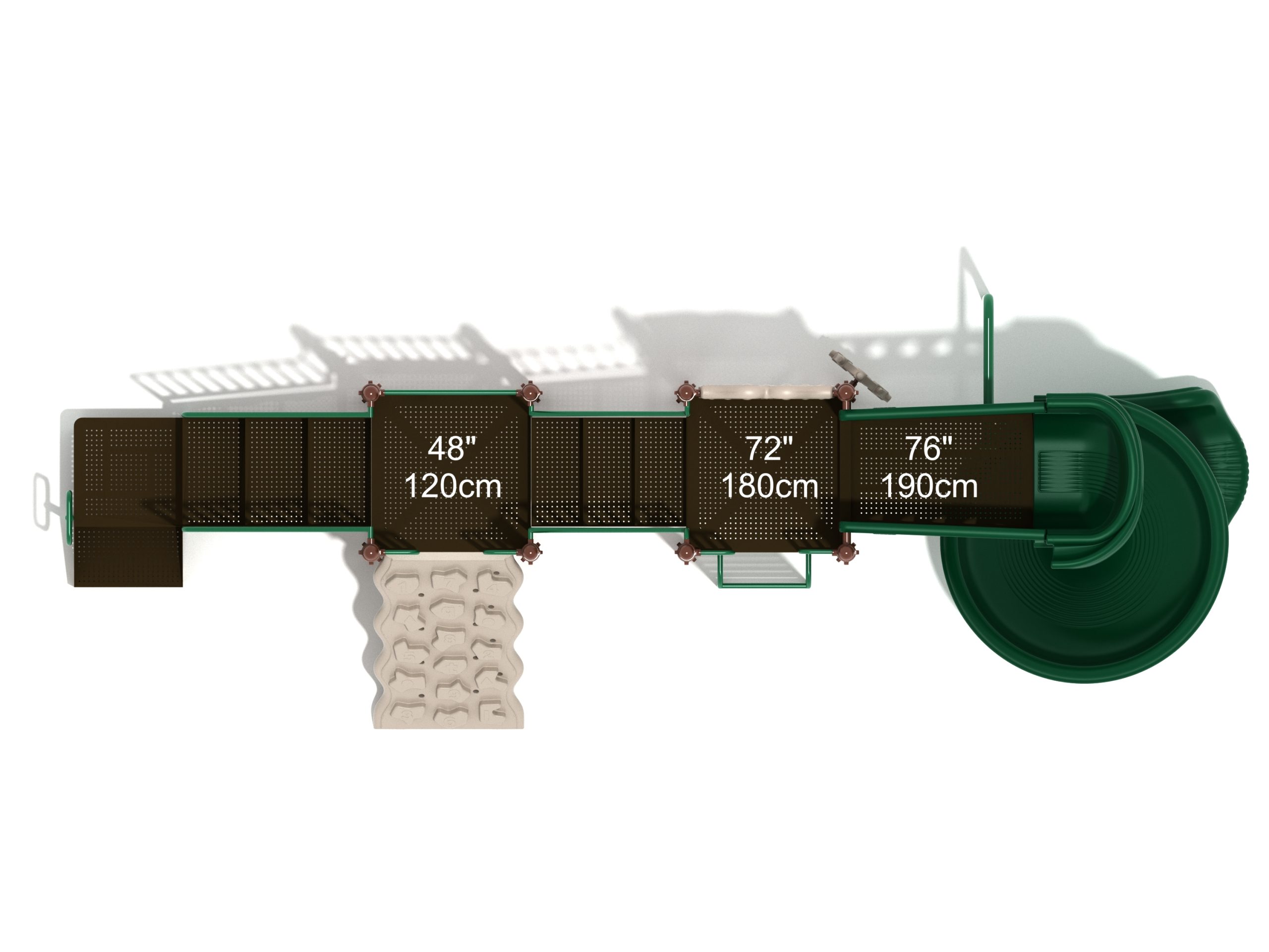 Starting at the Transfer Station children can experience everything the Columbia has to offer as they walk up and along the different levels of platform, each with interesting things to do. The Figure Climber can be accessed both ways and while the journey down this steep hillside on angular rocks is a lot more difficult than the upward climb, children will be able to use hand-eye coordination skills to navigate it successfully. There’s a Vertical Ladder to take children to the top platform where they can engage with the Gear Panel’s colorful cogs and watch the mechanical workings spin around. But what every child is really climbing the structure for is the huge Spiral Slide that’s going to provide twists and turns and an unforgettable experience that they’ll want to do again and again. Below the structure is a Ship’s Wheel for some awesome pirate action as they sail their friends on the SS Columbia through choppy ocean waves.