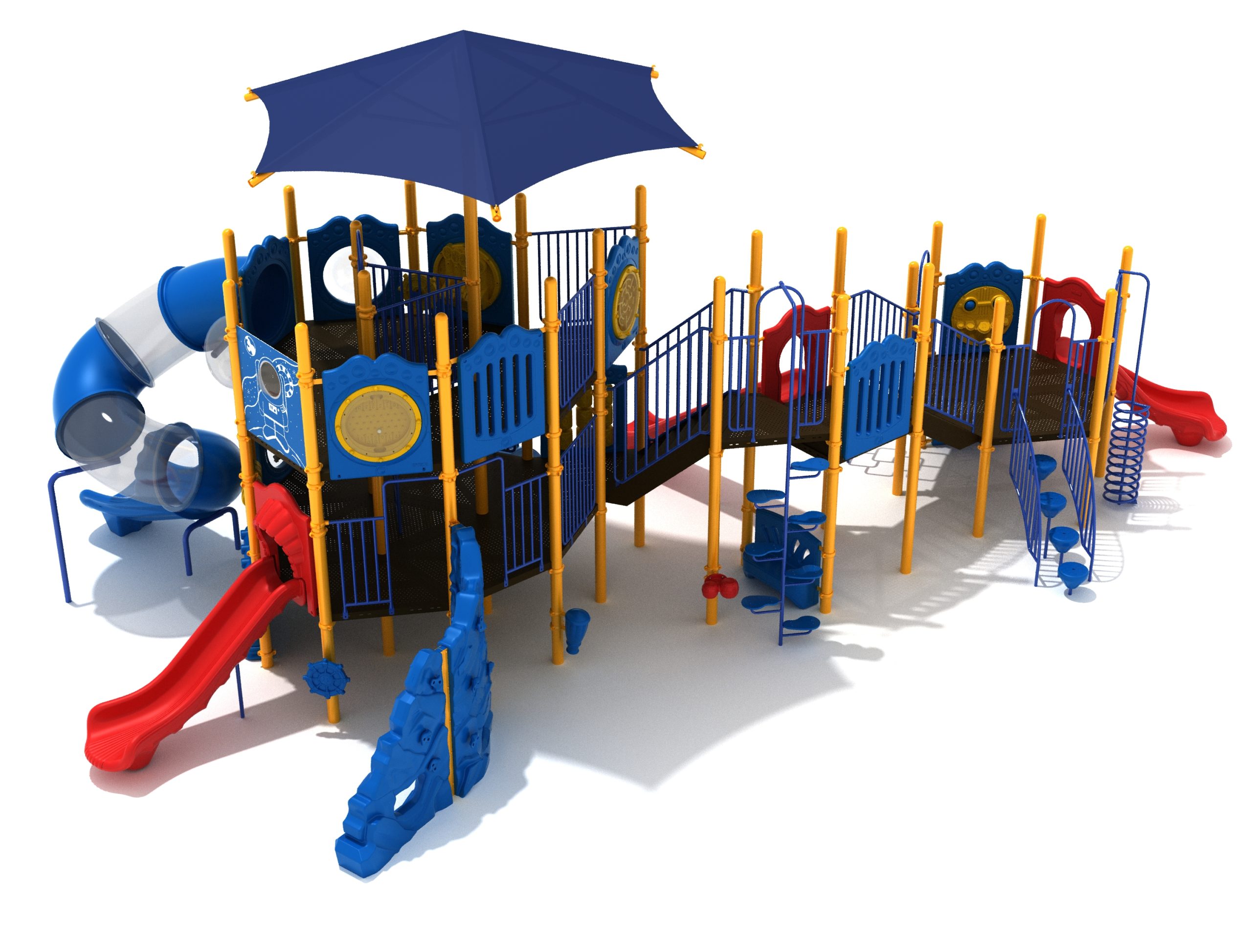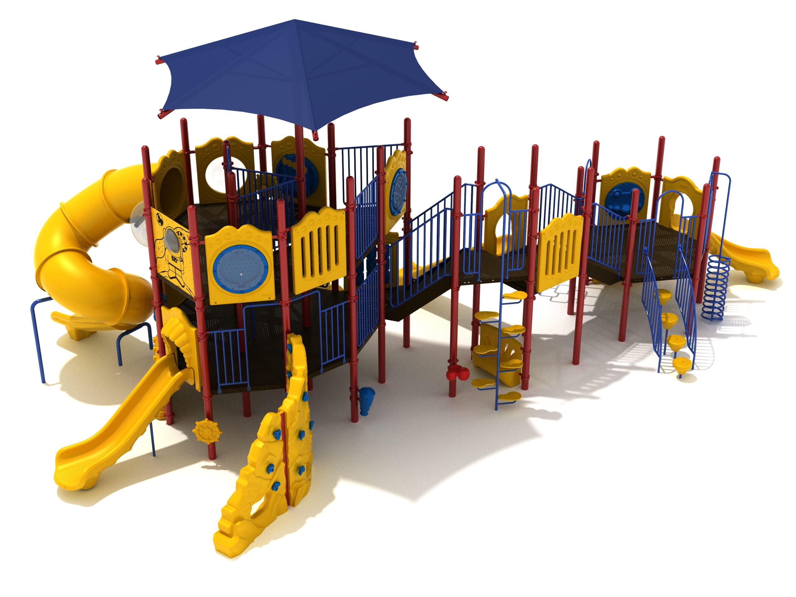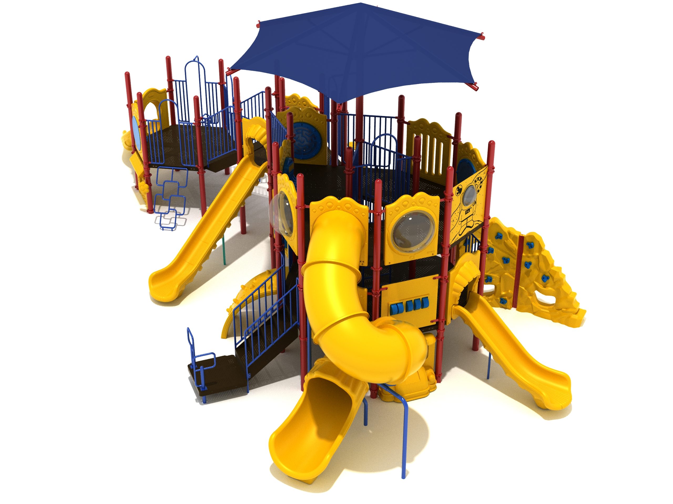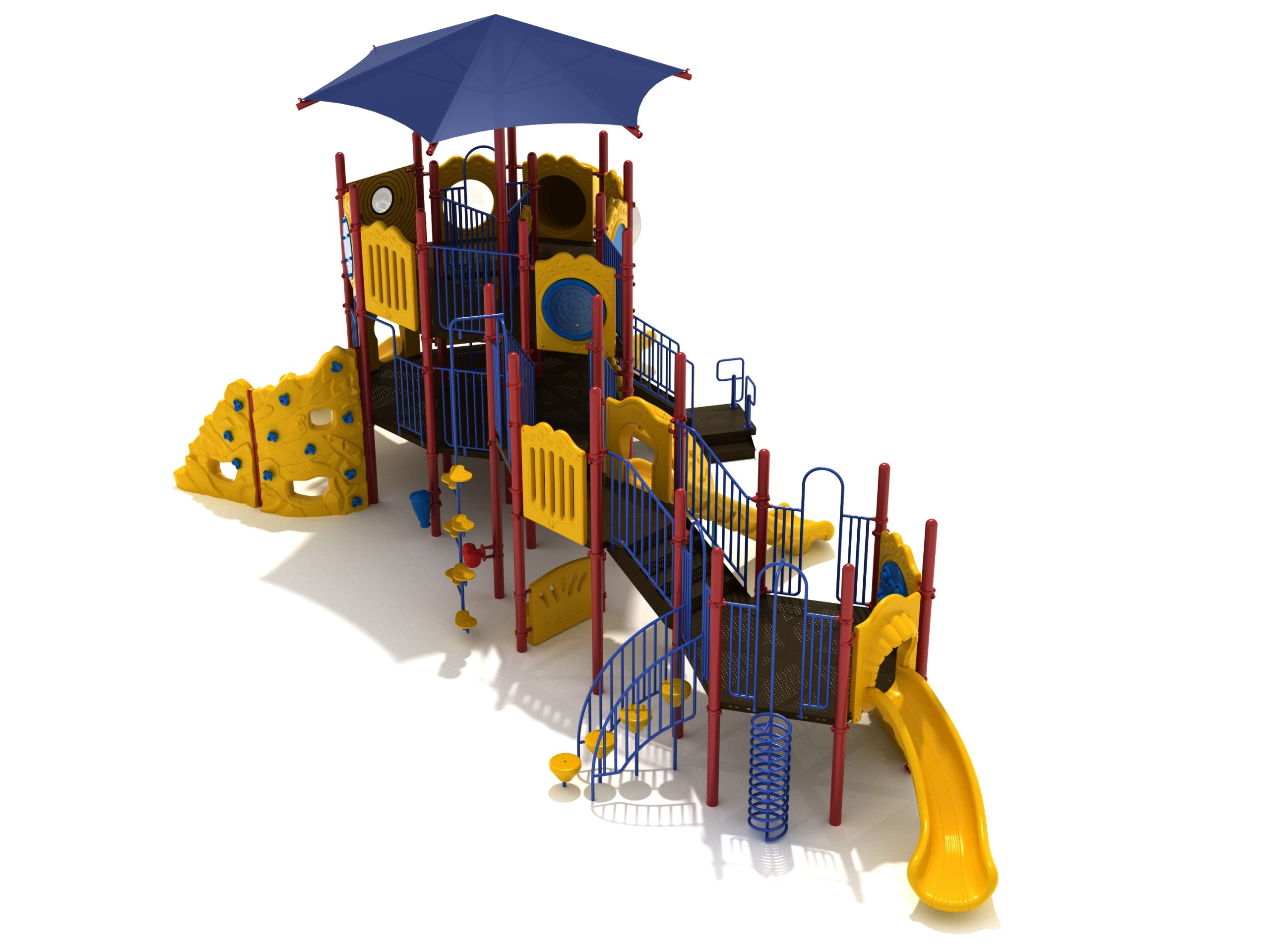 This play structure resembles a megacity of fun for kids with different slides, climbers, decks, & panels. On top of Concord Station, children can chase a never-ending fun ride. This metropolis can be accessed via Spiral and Craggy Climbers. After climbing these rocky cliffs, agile kids return to the ground via a Spiral Tube Slide. A 3-story shaded tower serves as the central feature of Concord Station. Kids can play underneath it when it’s too sunny outside. They can easily reach the upper levels by climbing on different steps that promote physical activity and boost their coordination skills. The Sea Creature Climber has animal-shaped handholds to serve as the perfect setting for an imaginative climbing experience. The Car Panel and the Ship’s Wheel allow kids to call upon their imagination while remaining grounded. Many pathways connect these slides and climbers, promoting exploration and curiosity, almost like finding their way out of a see-through maze. With 25 individual play components, it’s All Aboard as the Concord Train leaves the station.