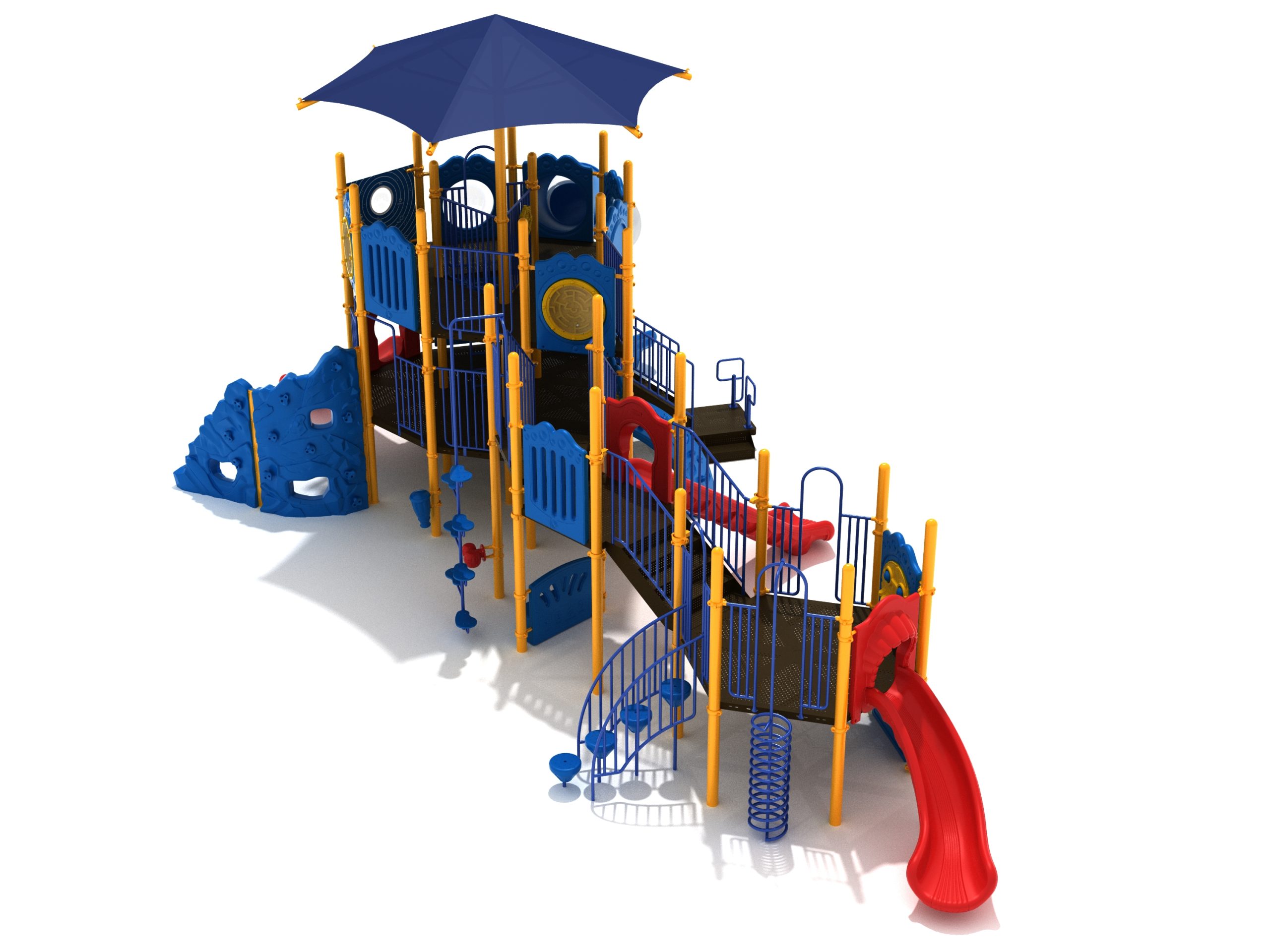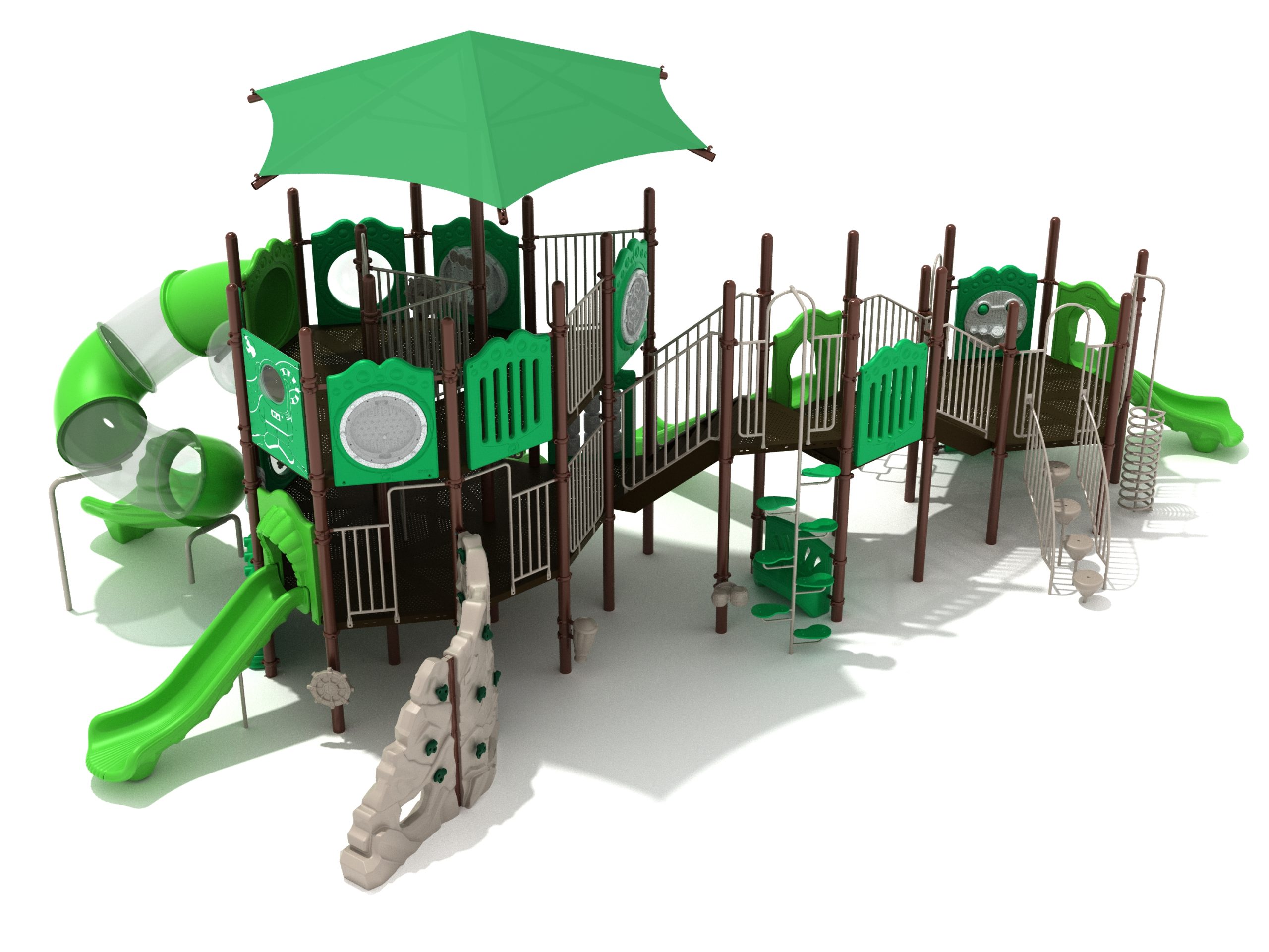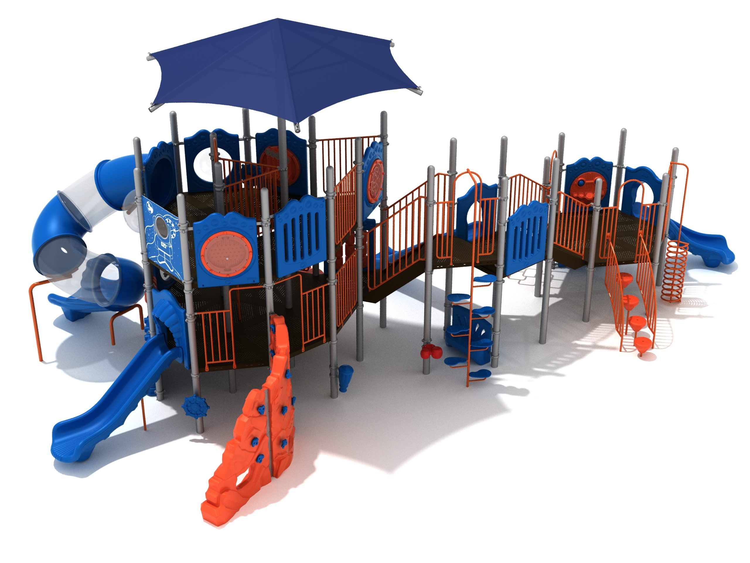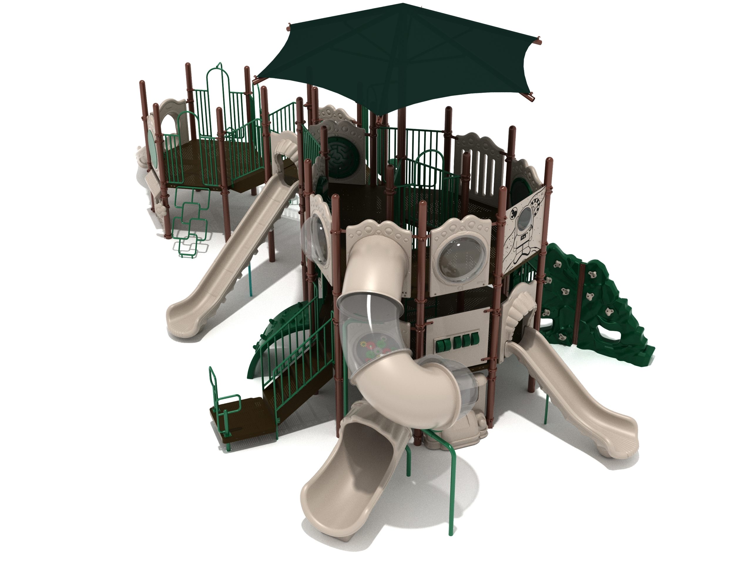 This play structure resembles a megacity of fun for kids with different slides, climbers, decks, & panels. On top of Concord Station, children can chase a never-ending fun ride. This metropolis can be accessed via Spiral and Craggy Climbers. After climbing these rocky cliffs, agile kids return to the ground via a Spiral Tube Slide. A 3-story shaded tower serves as the central feature of Concord Station. Kids can play underneath it when it’s too sunny outside. They can easily reach the upper levels by climbing on different steps that promote physical activity and boost their coordination skills. The Sea Creature Climber has animal-shaped handholds to serve as the perfect setting for an imaginative climbing experience. The Car Panel and the Ship’s Wheel allow kids to call upon their imagination while remaining grounded. Many pathways connect these slides and climbers, promoting exploration and curiosity, almost like finding their way out of a see-through maze. With 25 individual play components, it’s All Aboard as the Concord Train leaves the station.