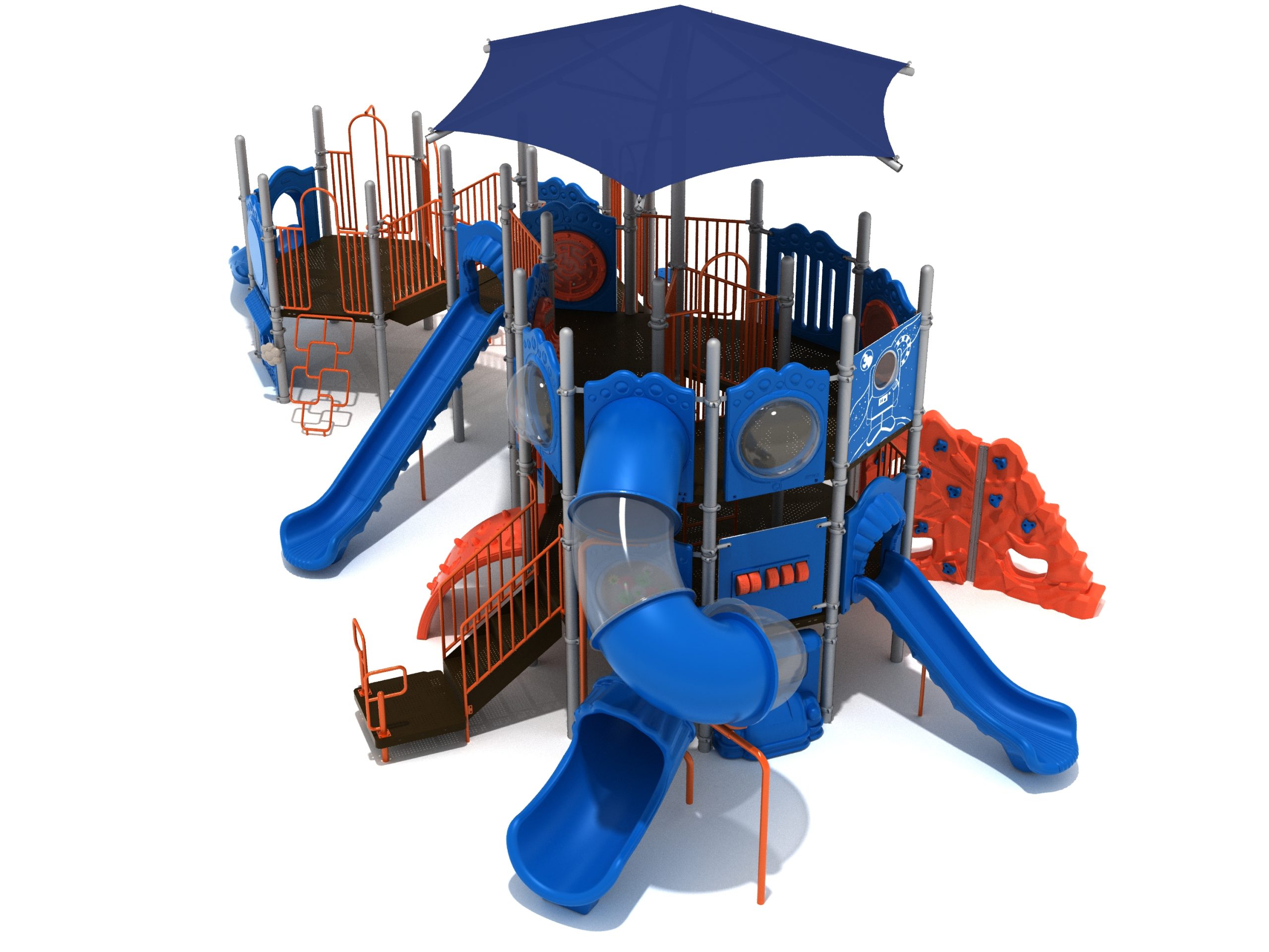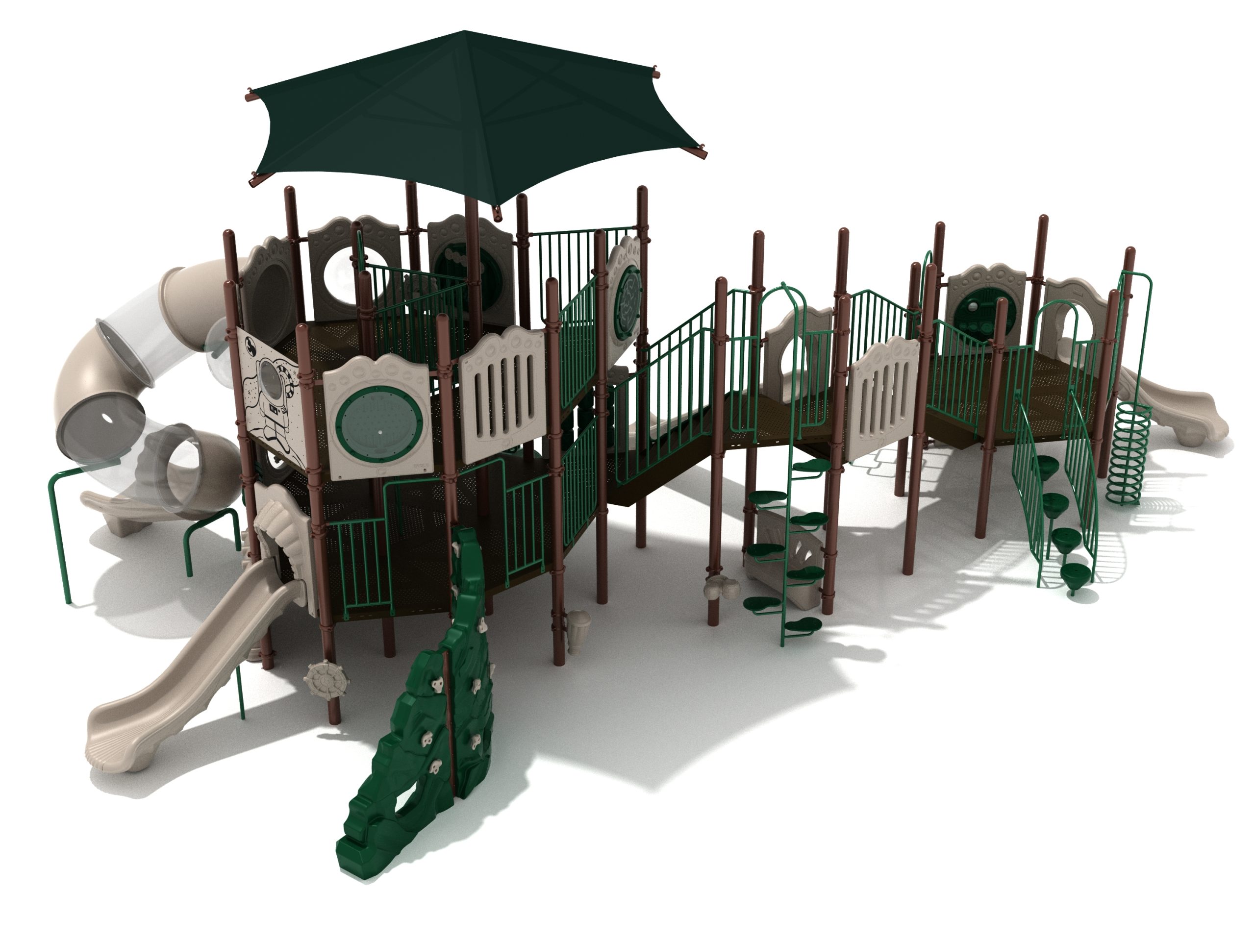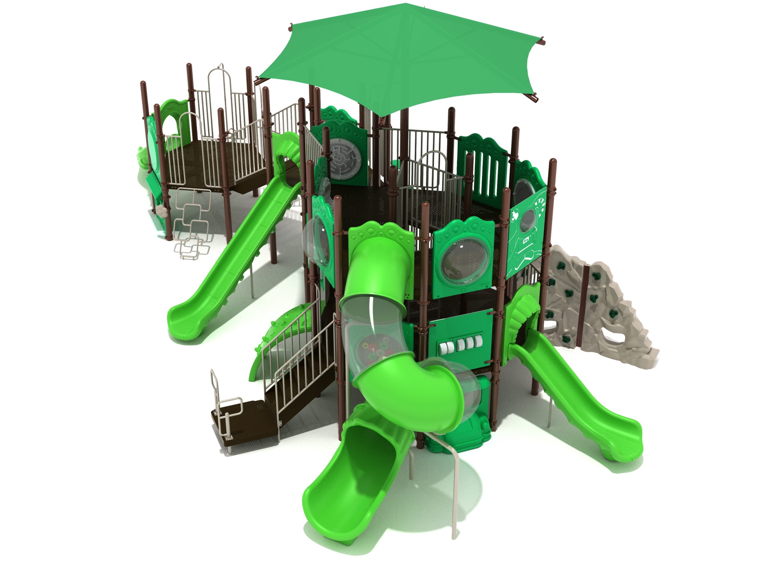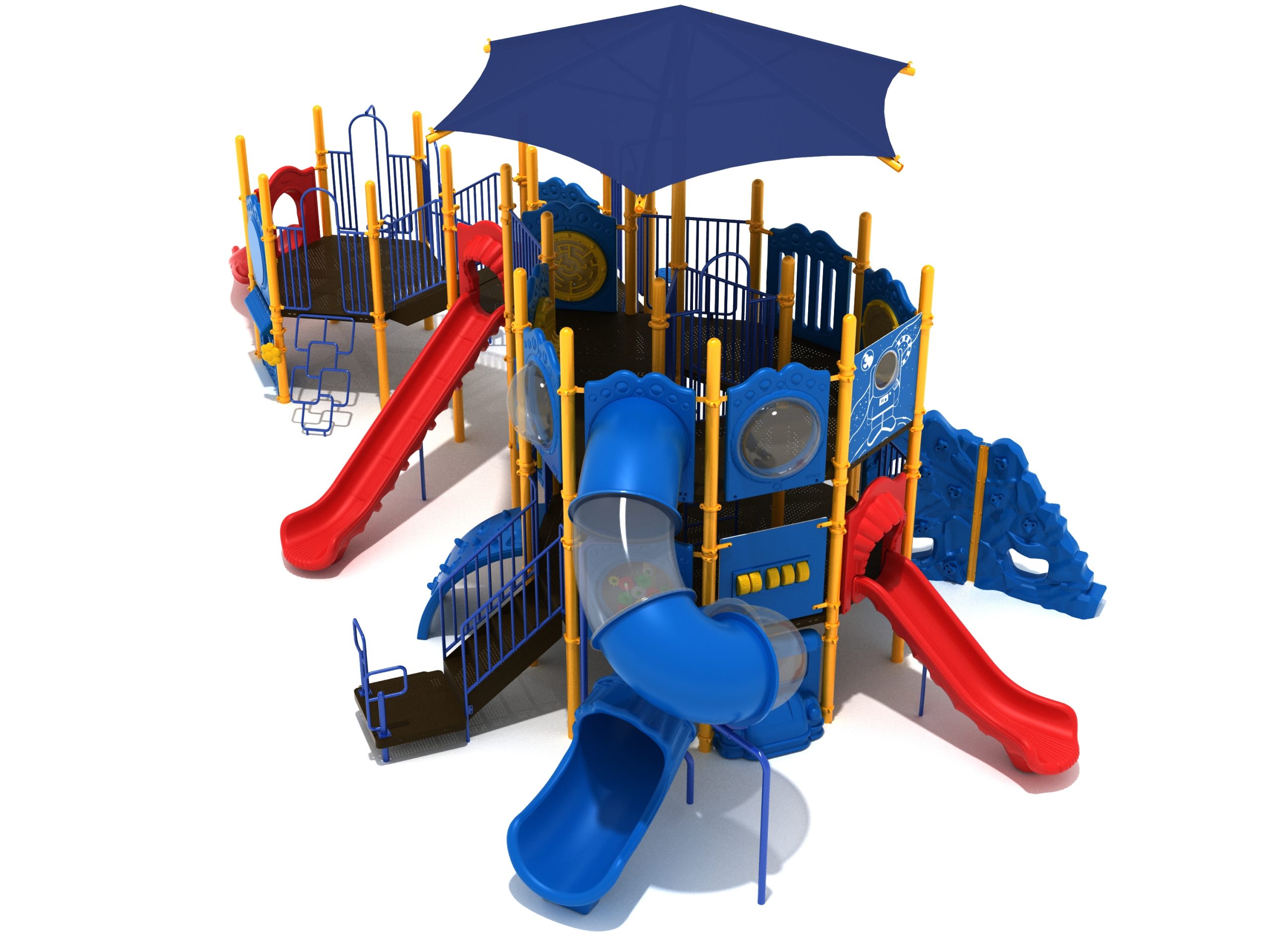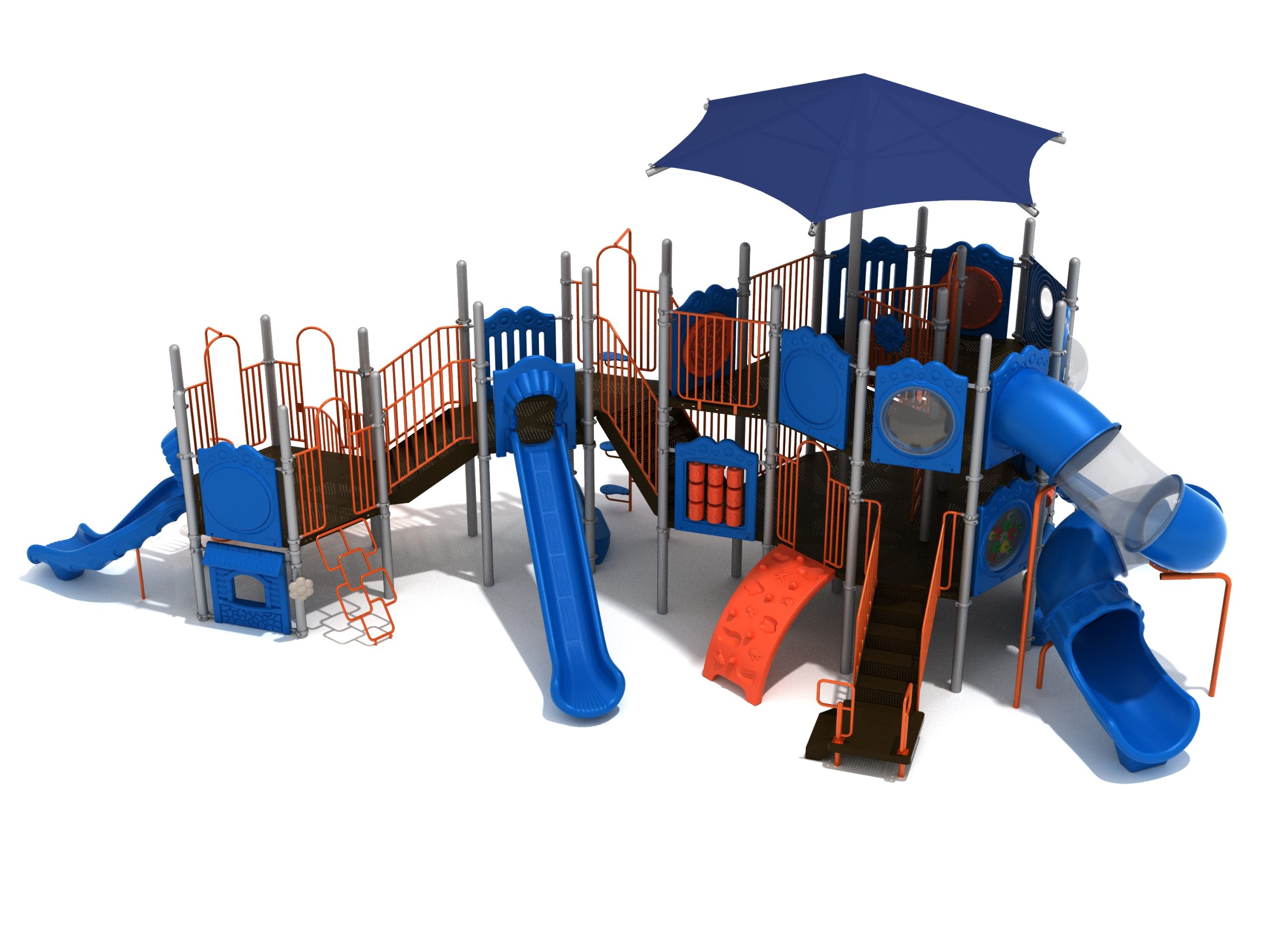 This play structure resembles a megacity of fun for kids with different slides, climbers, decks, & panels. On top of Concord Station, children can chase a never-ending fun ride. This metropolis can be accessed via Spiral and Craggy Climbers. After climbing these rocky cliffs, agile kids return to the ground via a Spiral Tube Slide. A 3-story shaded tower serves as the central feature of Concord Station. Kids can play underneath it when it’s too sunny outside. They can easily reach the upper levels by climbing on different steps that promote physical activity and boost their coordination skills. The Sea Creature Climber has animal-shaped handholds to serve as the perfect setting for an imaginative climbing experience. The Car Panel and the Ship’s Wheel allow kids to call upon their imagination while remaining grounded. Many pathways connect these slides and climbers, promoting exploration and curiosity, almost like finding their way out of a see-through maze. With 25 individual play components, it’s All Aboard as the Concord Train leaves the station.