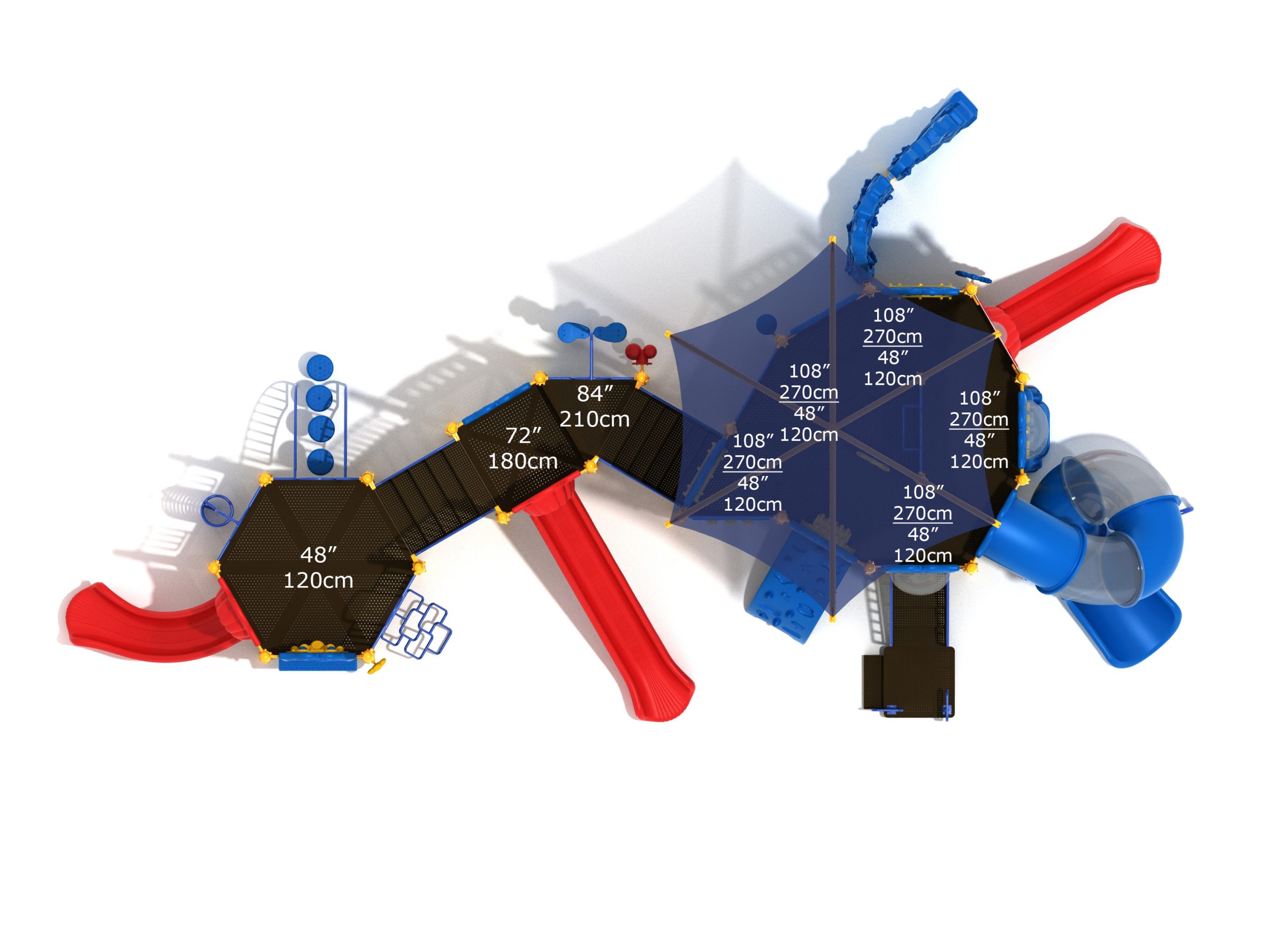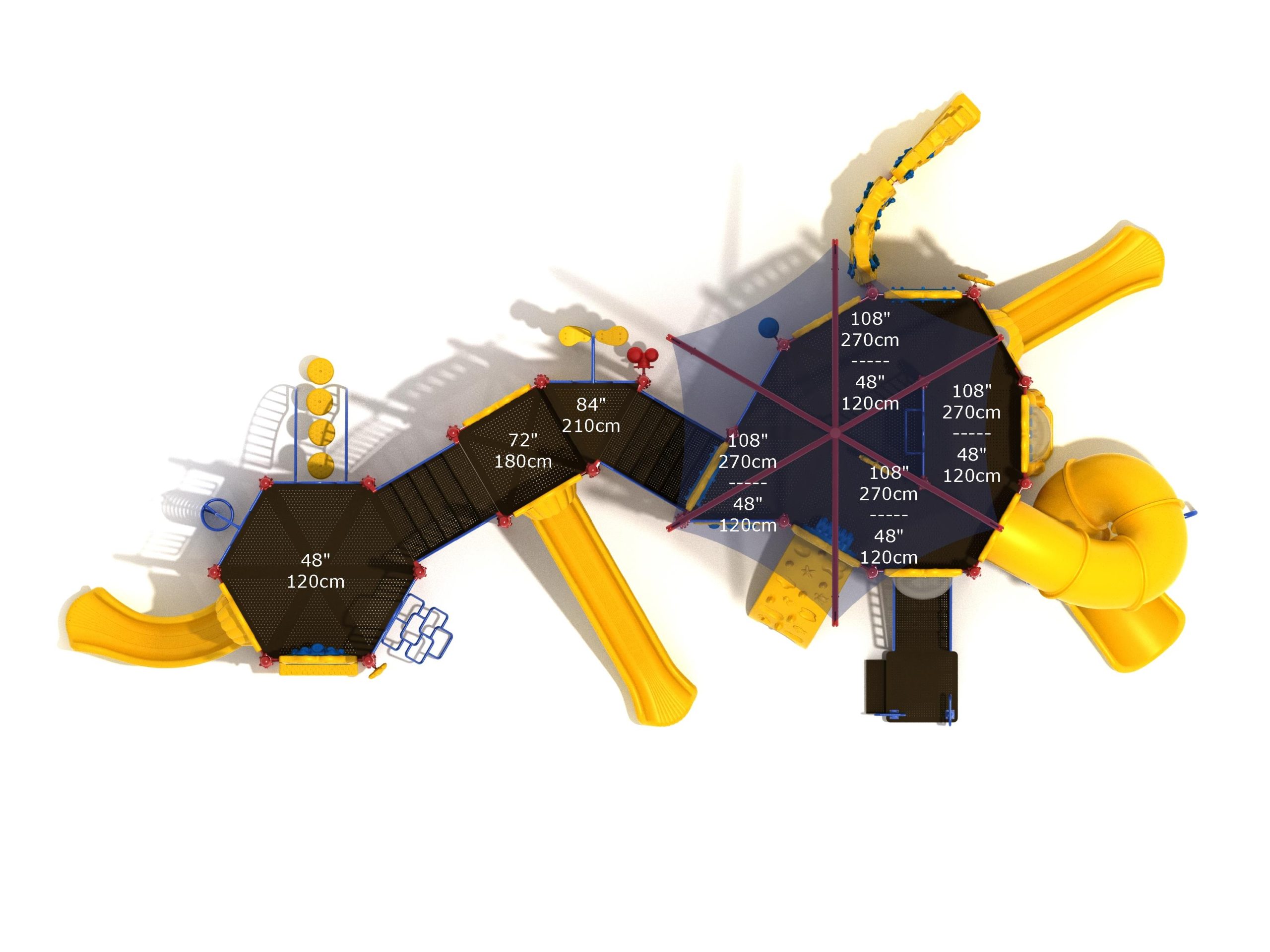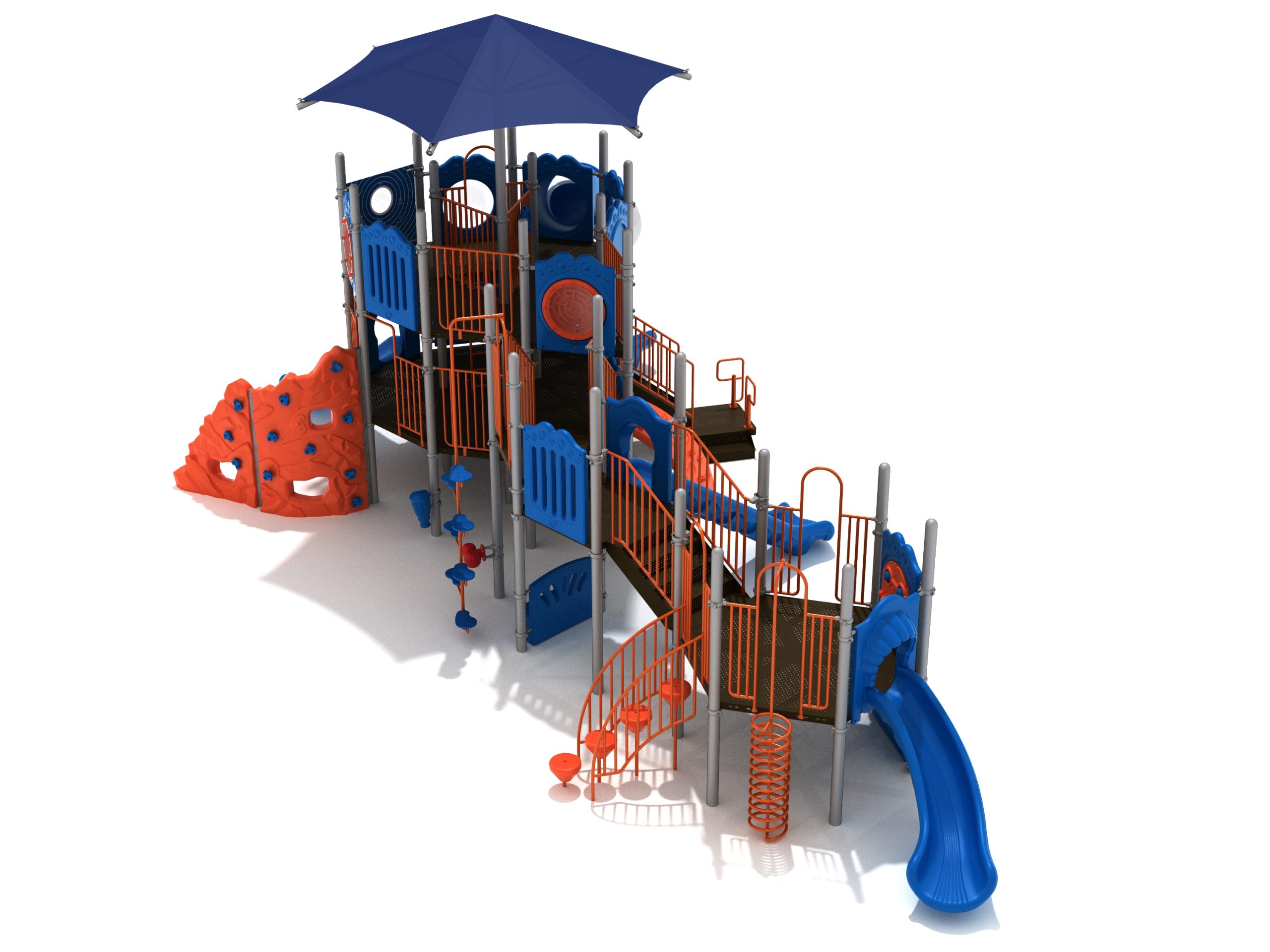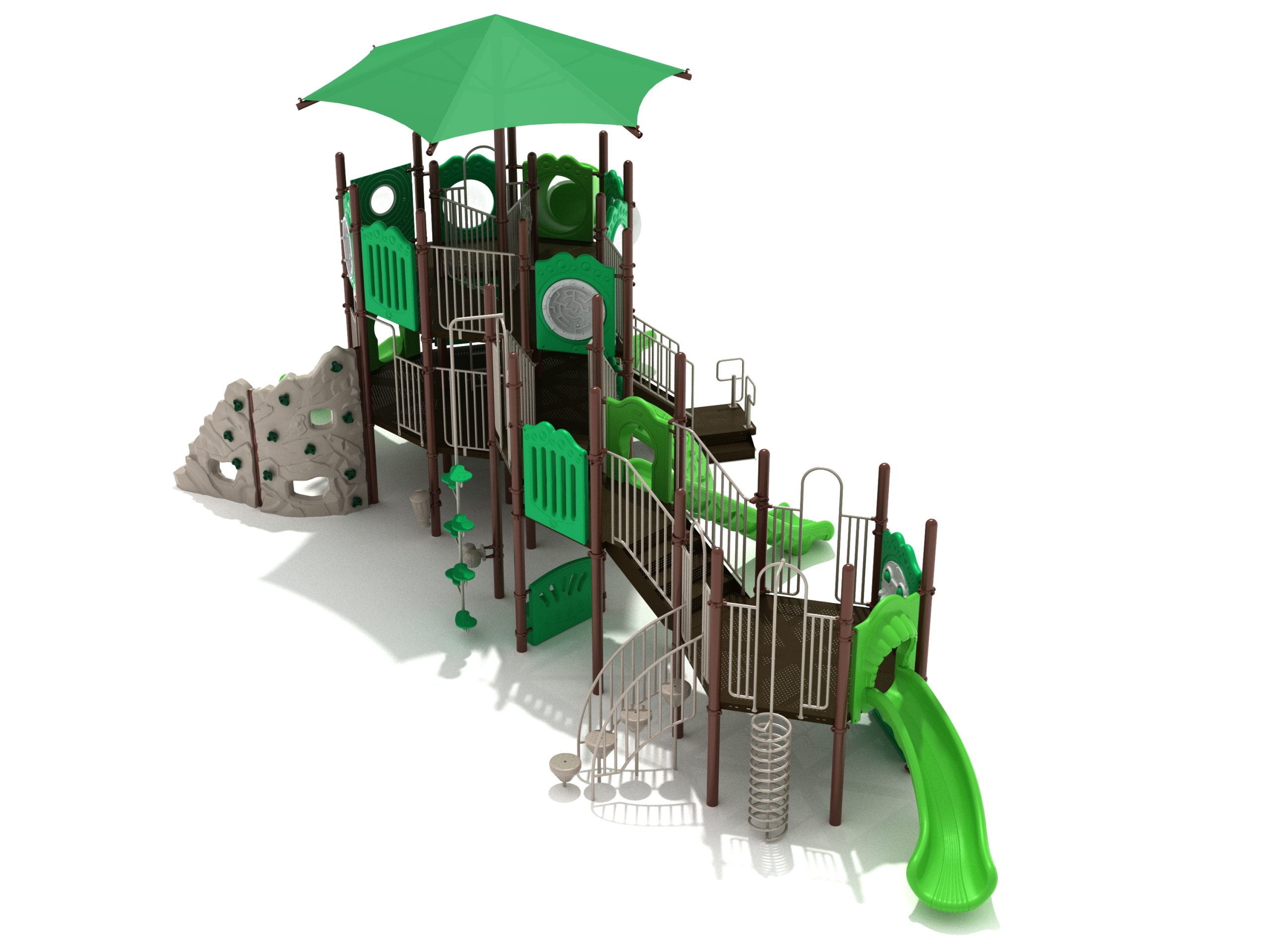 This play structure resembles a megacity of fun for kids with different slides, climbers, decks, & panels. On top of Concord Station, children can chase a never-ending fun ride. This metropolis can be accessed via Spiral and Craggy Climbers. After climbing these rocky cliffs, agile kids return to the ground via a Spiral Tube Slide. A 3-story shaded tower serves as the central feature of Concord Station. Kids can play underneath it when it’s too sunny outside. They can easily reach the upper levels by climbing on different steps that promote physical activity and boost their coordination skills. The Sea Creature Climber has animal-shaped handholds to serve as the perfect setting for an imaginative climbing experience. The Car Panel and the Ship’s Wheel allow kids to call upon their imagination while remaining grounded. Many pathways connect these slides and climbers, promoting exploration and curiosity, almost like finding their way out of a see-through maze. With 25 individual play components, it’s All Aboard as the Concord Train leaves the station.