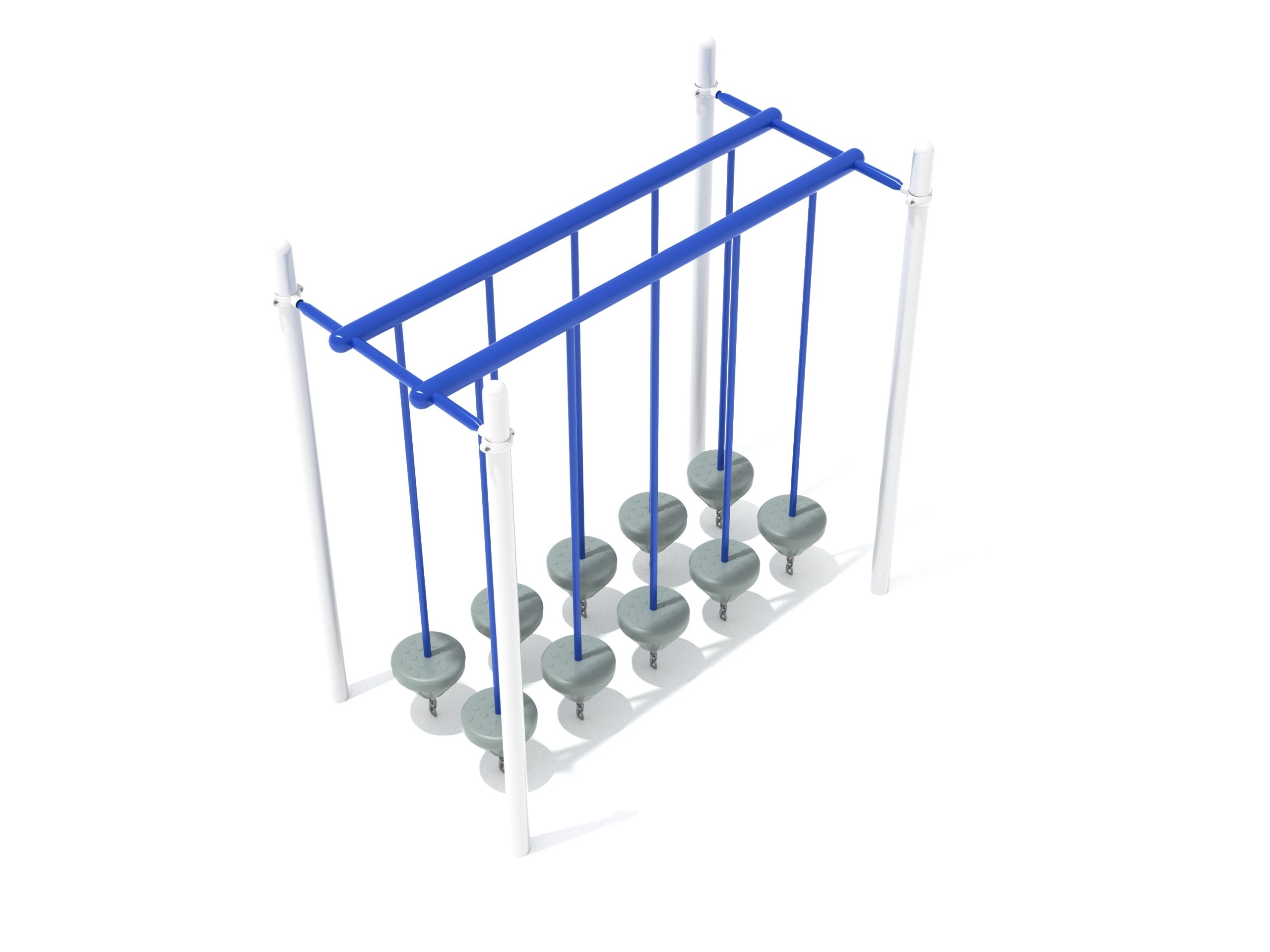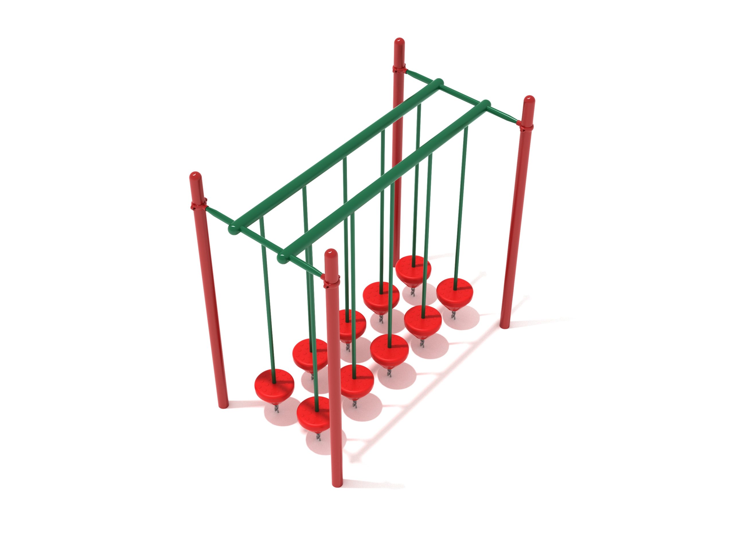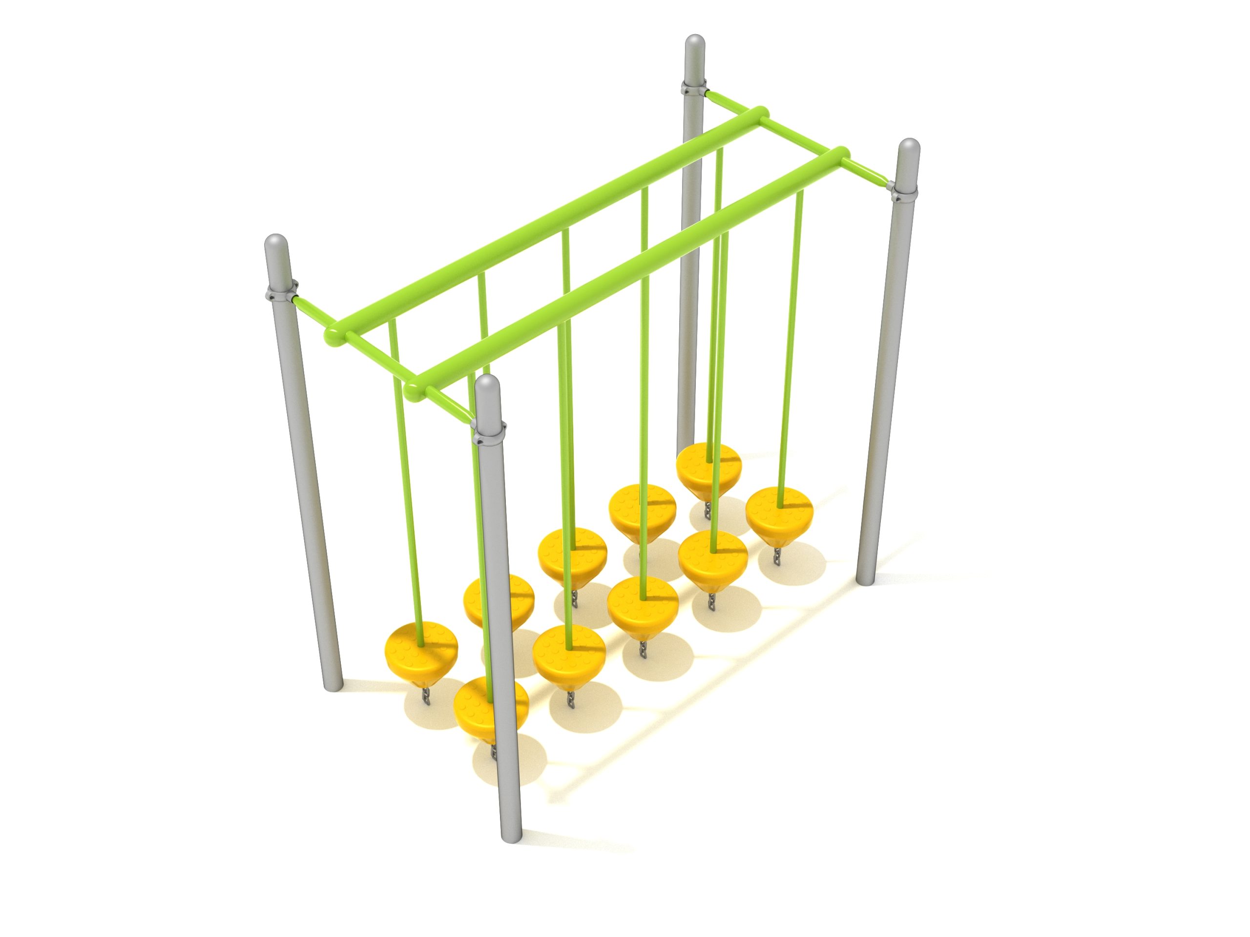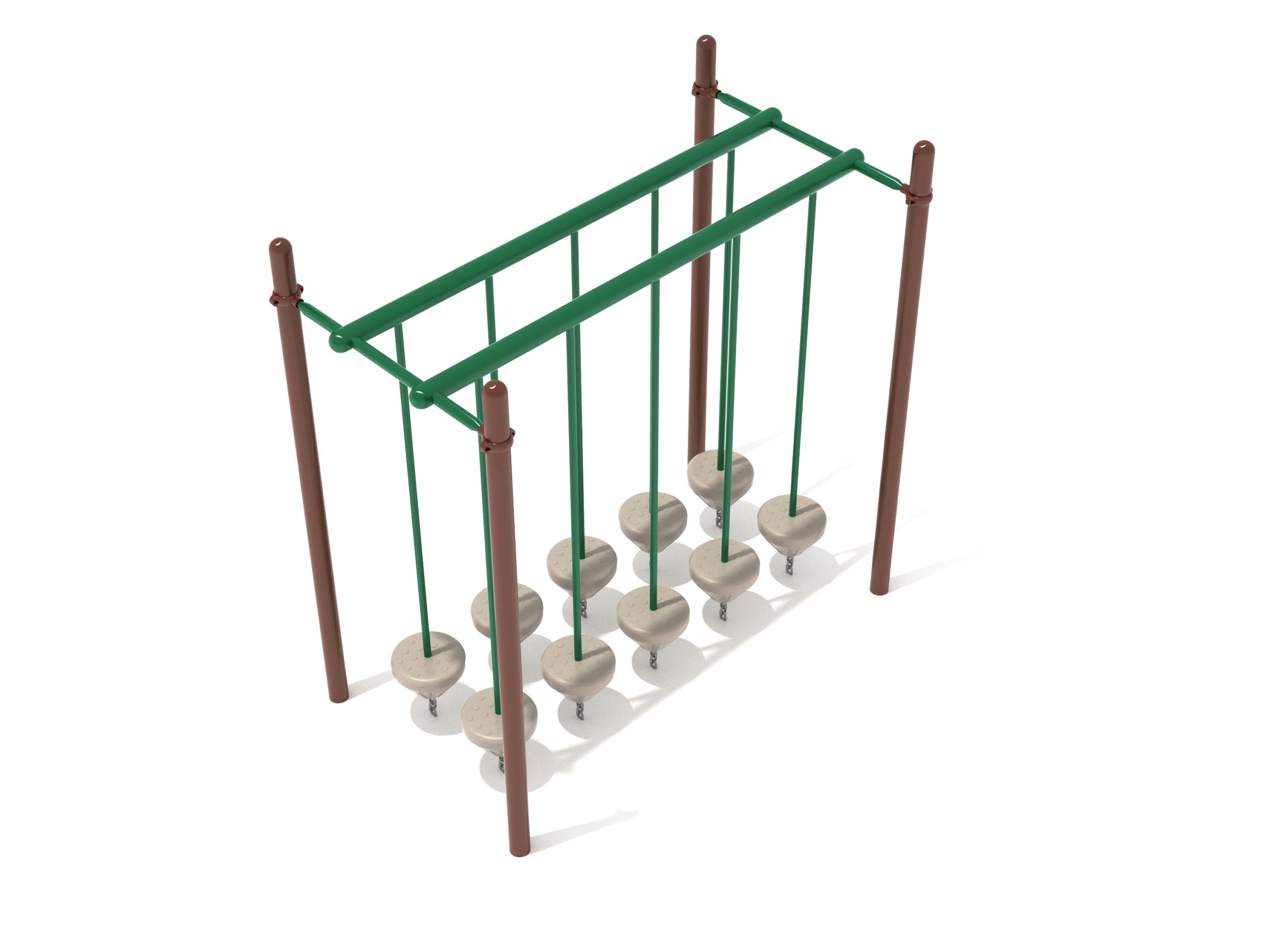 The Double Row Pebble Bridge is a visually appealing recreational set suitable for larger parks and play areas. The double rows of swiveling platforms present a unique challenge for children of all ages and to navigate the equipment they must hold on tight to the bars as the platforms beneath them gyrate when stood on. It’s a treat to watch children try to get across the Double Row Pebble Bridge thanks to this unique feature and you can be sure there’ll be lots of laughter as they attempt to balance themselves. This adventure structure becomes even more fun when there’s more than one child trying to cross as they may have to use the same pebble at times and it will swivel beneath them on the short chains. It helps to develop key coordination skills as the top rail must be gripped confidently and the core muscles must attempt to keep the body upright even as the feet move randomly in all directions. Add some imagination to the mix by pretending they’re crossing a raging river and must not fall in.