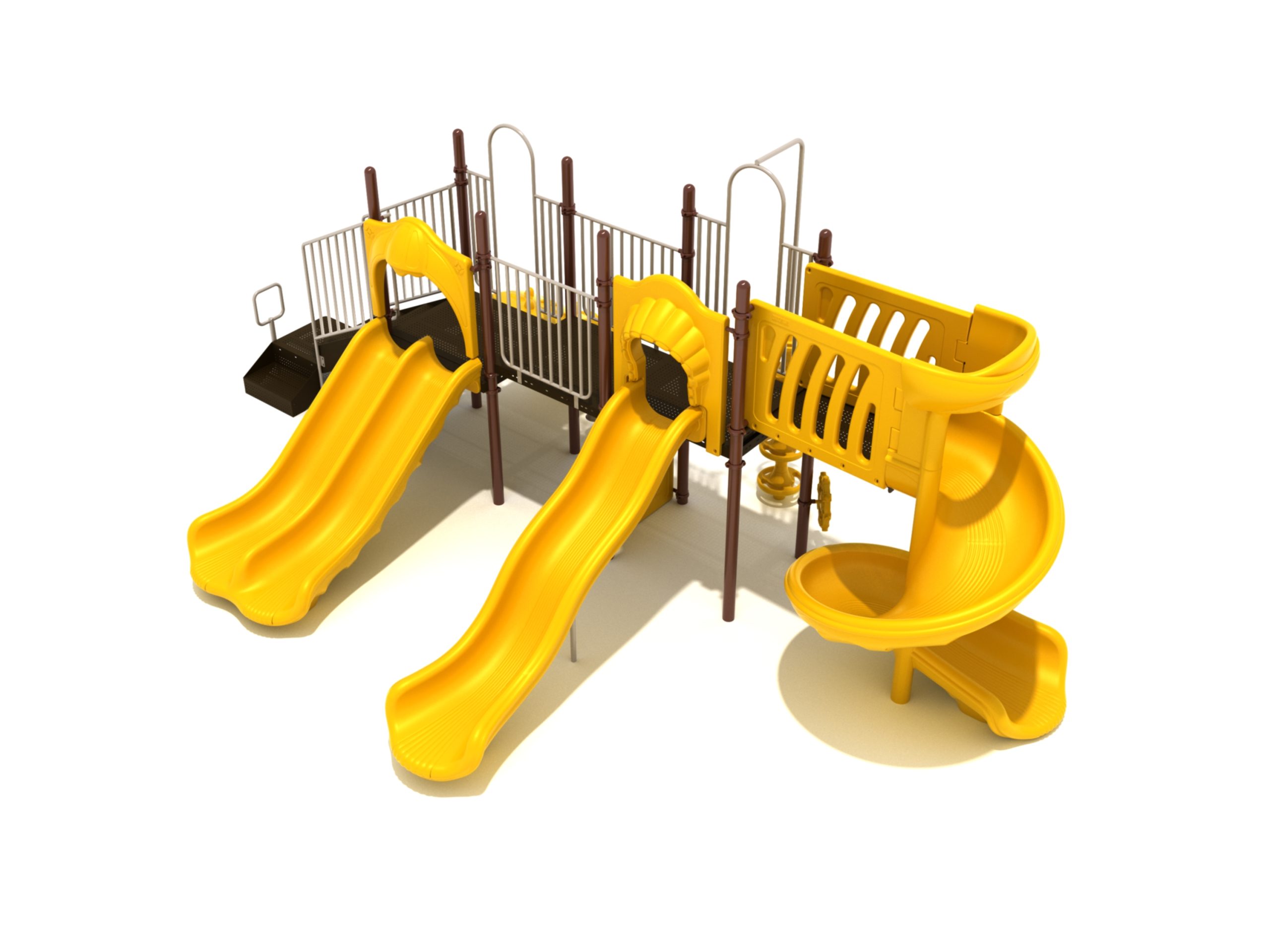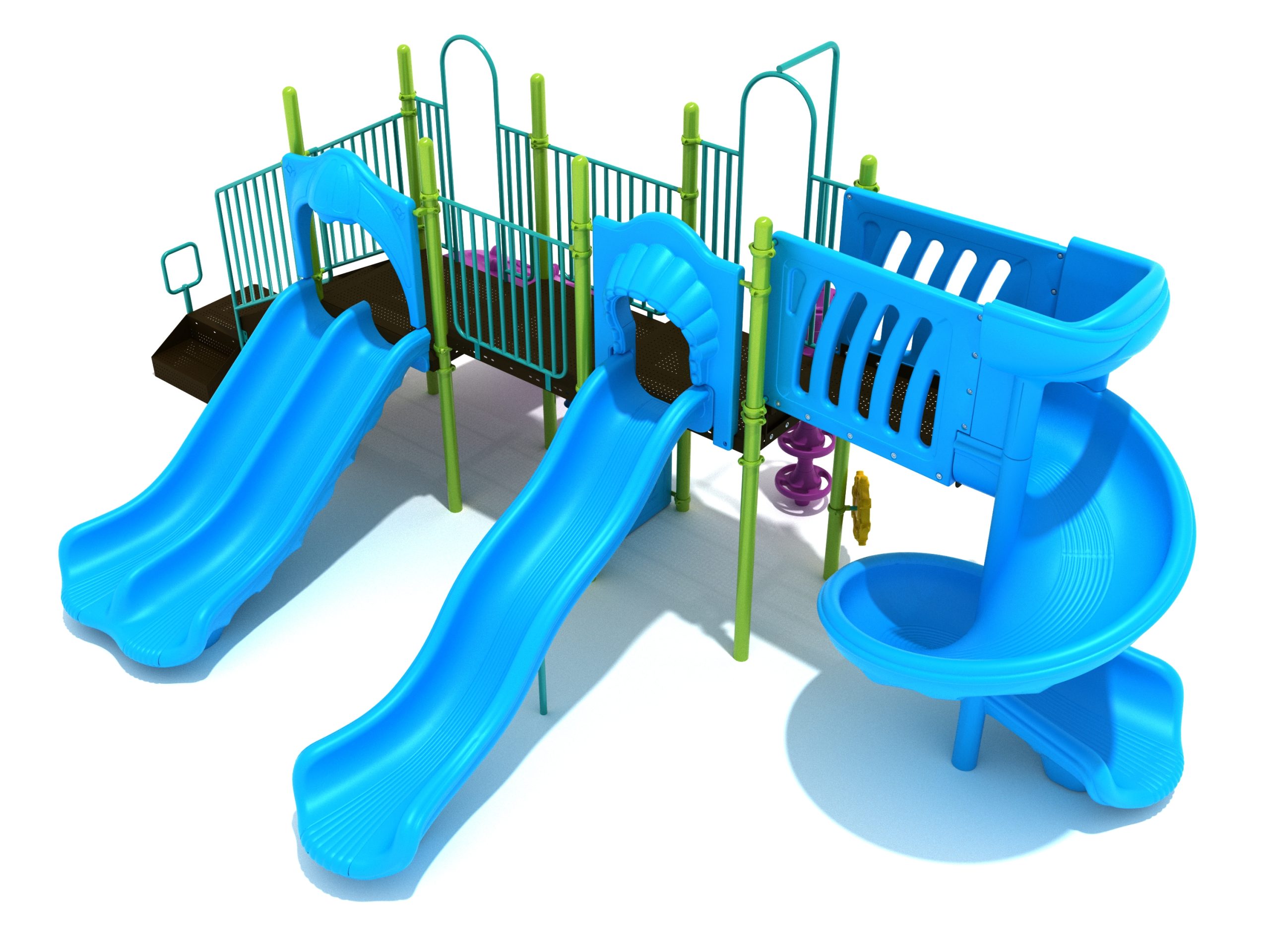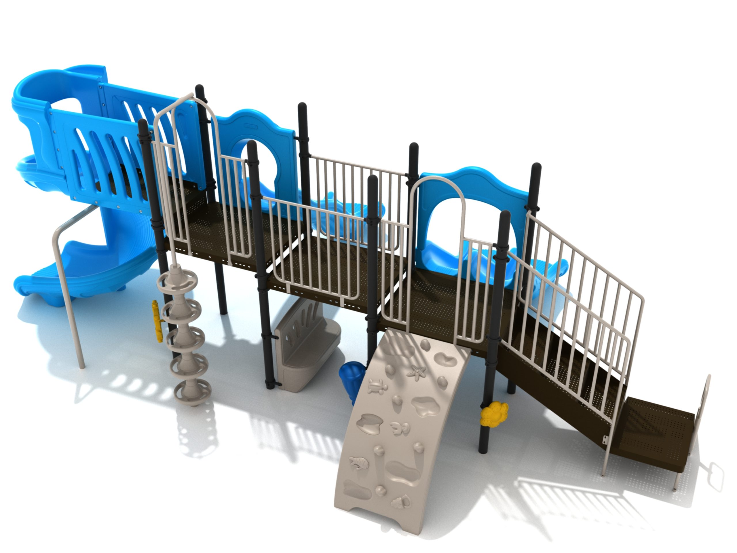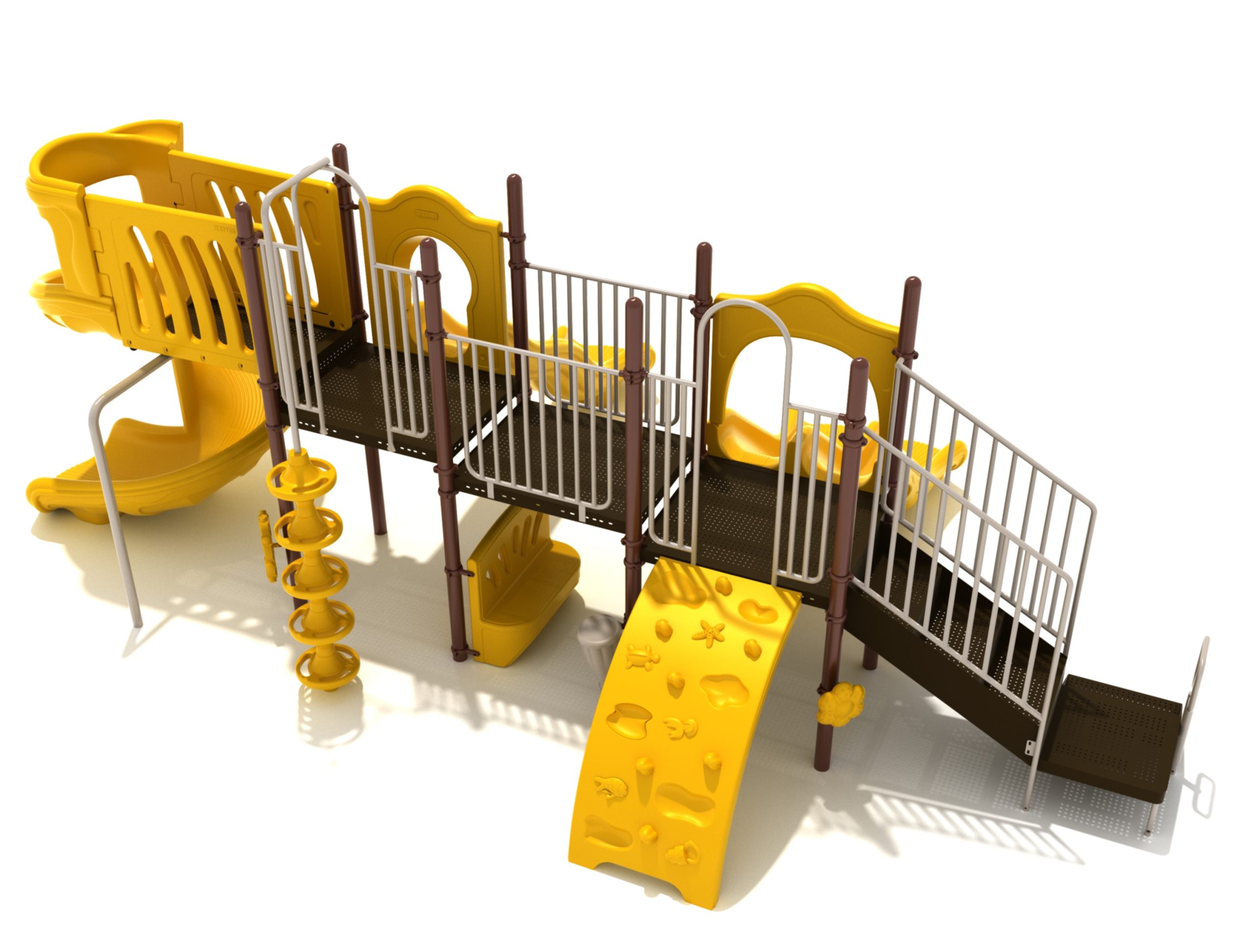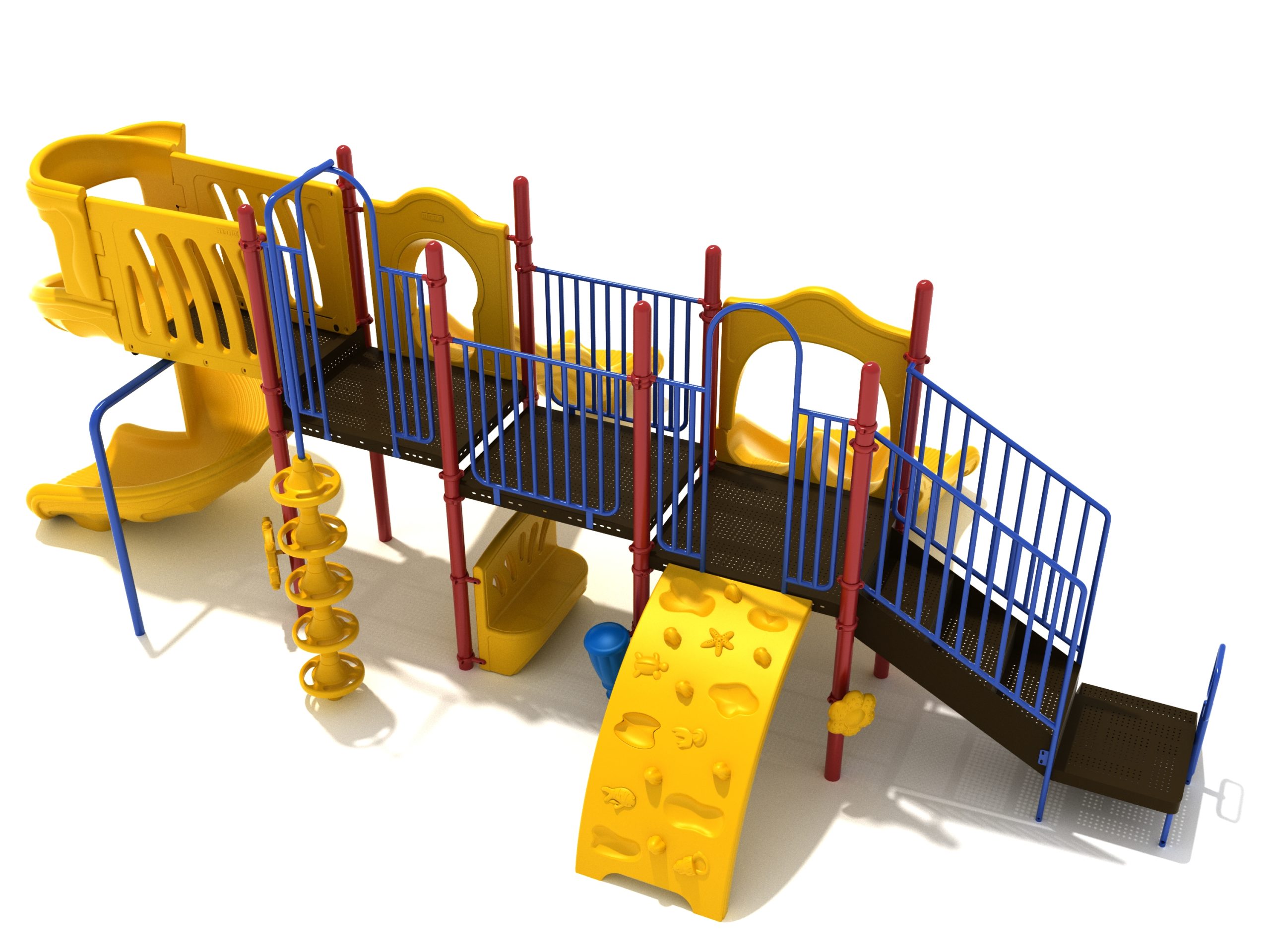 Climbing up climbers, sliding down slides, and playing with their friends is what makes up a day’s work when you are a child, and that is why children love the Durham play structure, which encompasses climbers, slides, and fun in its design, is so popular amongst children. Children can access this play structure with a sea creature climber, pod climber, or stairs. Children also have a choice of sliding down a double slide, wave slide, or spiral slide that are attached to the Durham play structure. A ship’s wheel, single drum, rain wheel, bongos, and a bench panel make this play structure ADA compliant, as well as offer lots of on-ground play for children to partake in. The bench panel also gives active children a place to rest after a hard day of play. This play structure is designed and built for children who are between the ages of 2 and 12 years old.