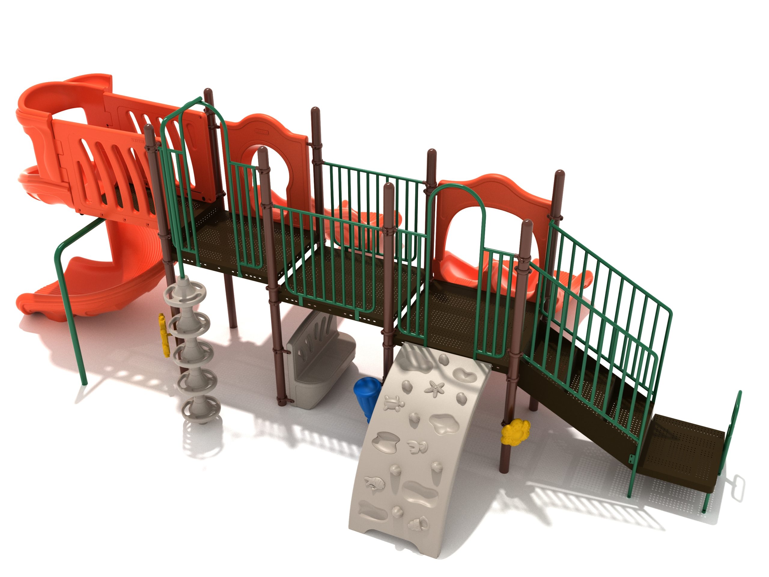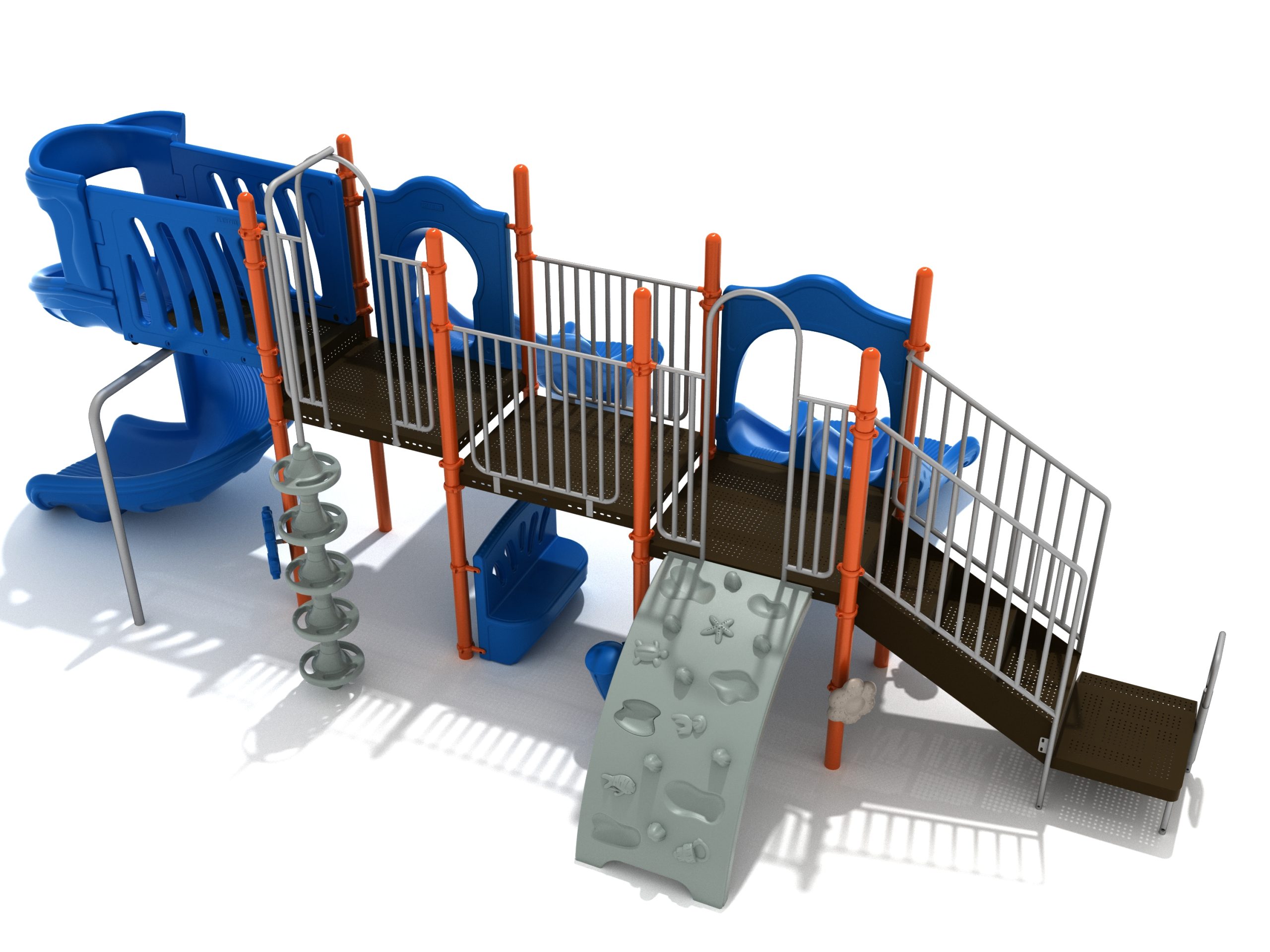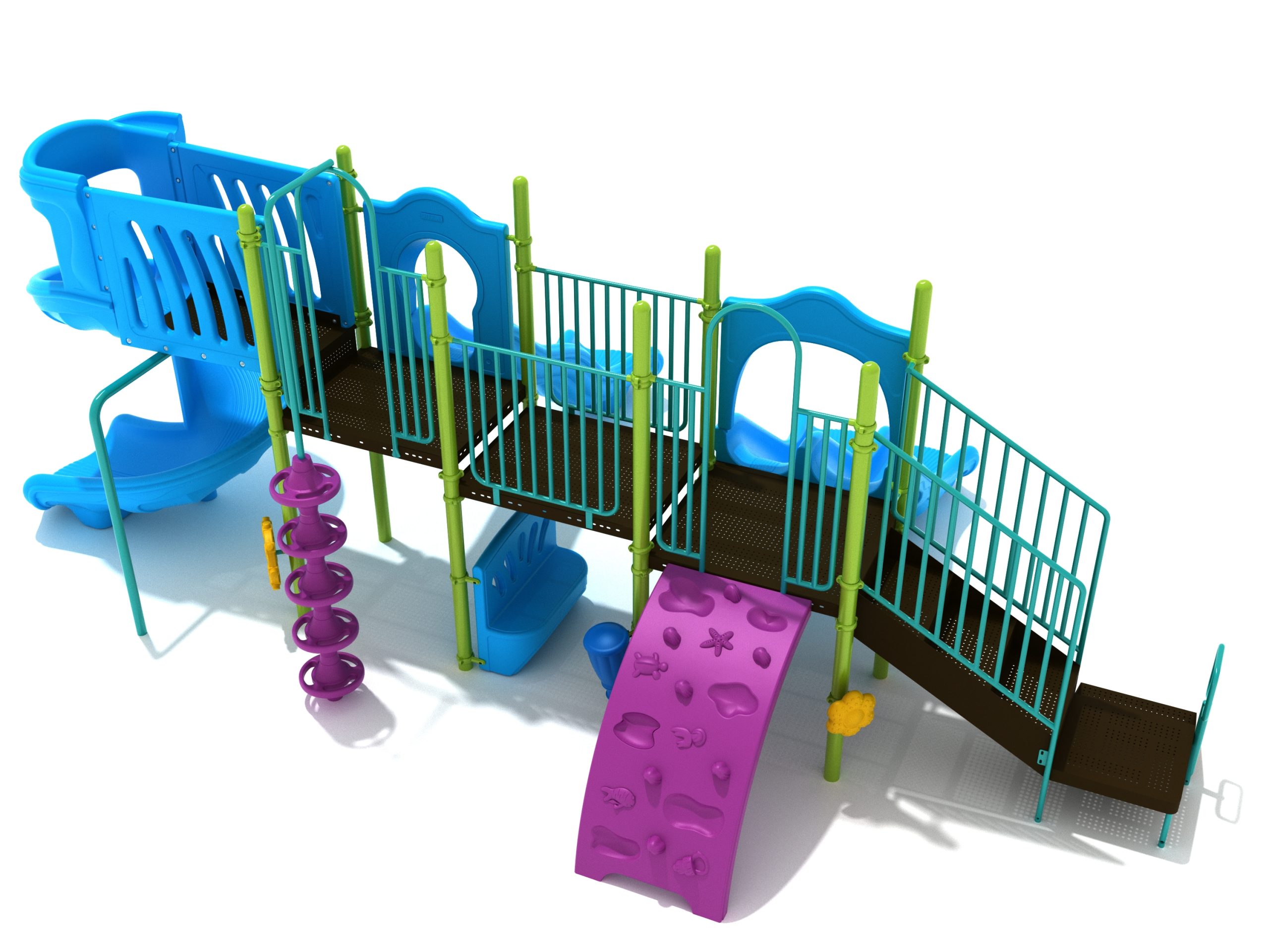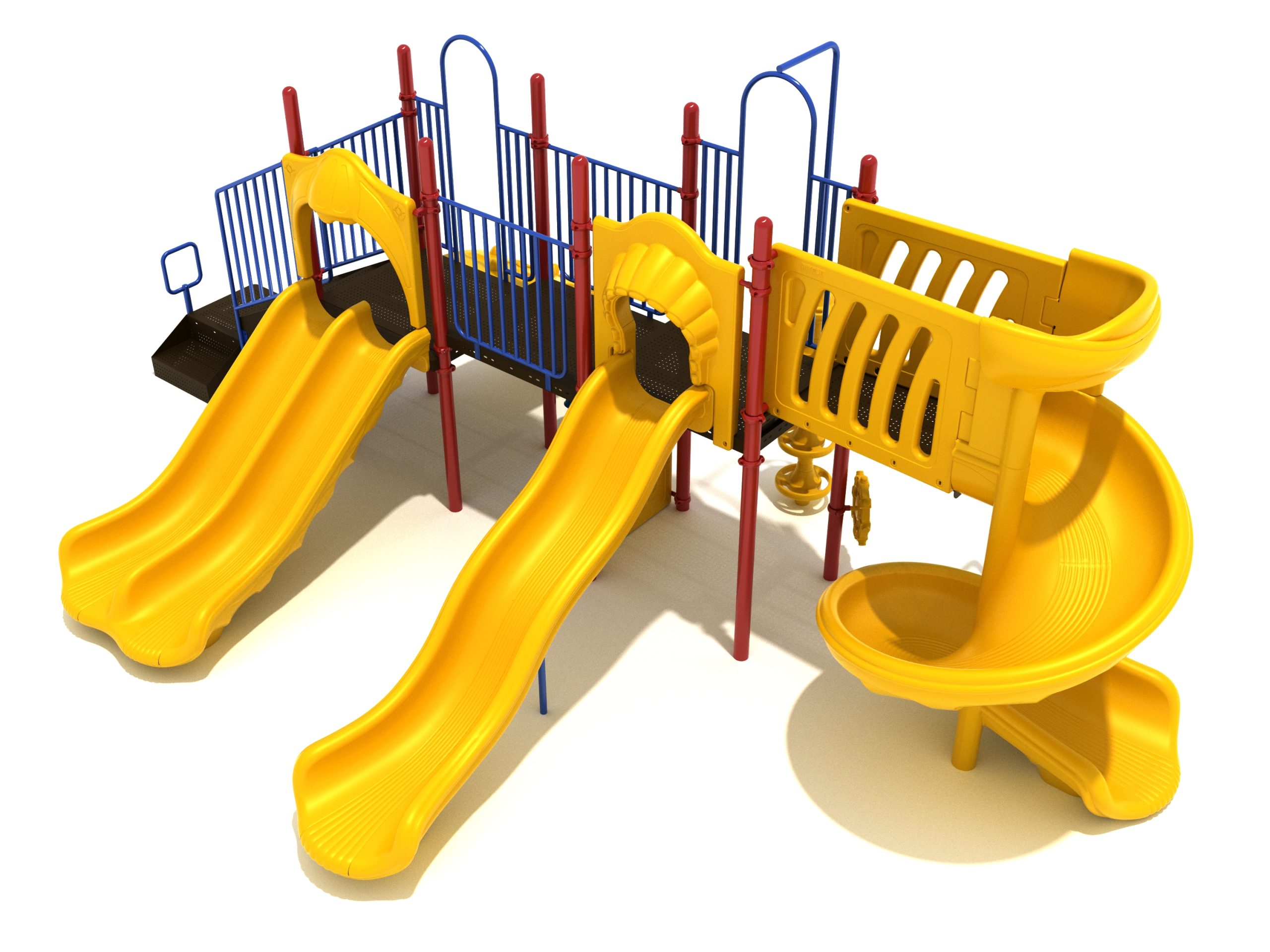 Climbing up climbers, sliding down slides, and playing with their friends is what makes up a day’s work when you are a child, and that is why children love the Durham play structure, which encompasses climbers, slides, and fun in its design, is so popular amongst children. Children can access this play structure with a sea creature climber, pod climber, or stairs. Children also have a choice of sliding down a double slide, wave slide, or spiral slide that are attached to the Durham play structure. A ship’s wheel, single drum, rain wheel, bongos, and a bench panel make this play structure ADA compliant, as well as offer lots of on-ground play for children to partake in. The bench panel also gives active children a place to rest after a hard day of play. This play structure is designed and built for children who are between the ages of 2 and 12 years old.
