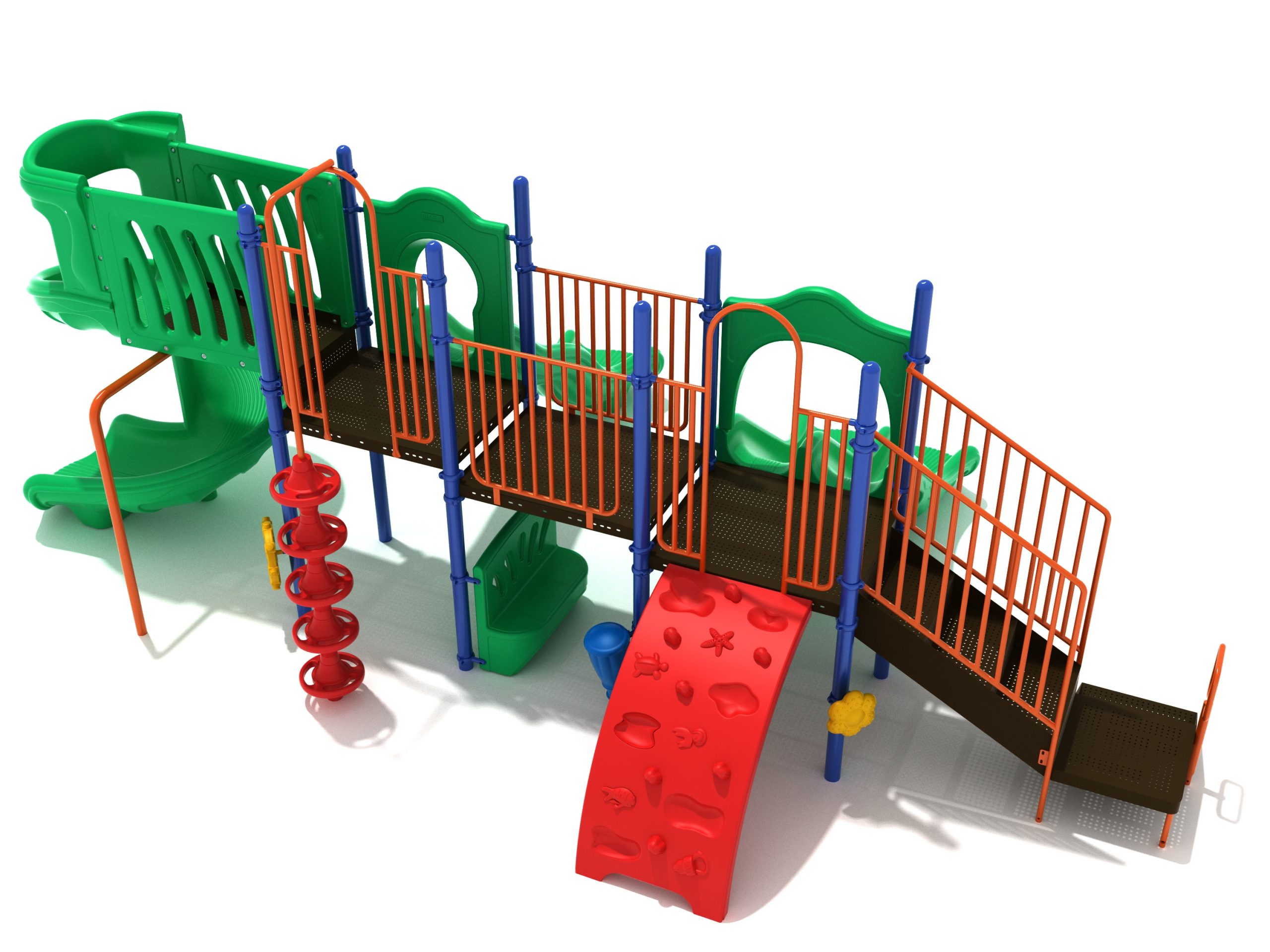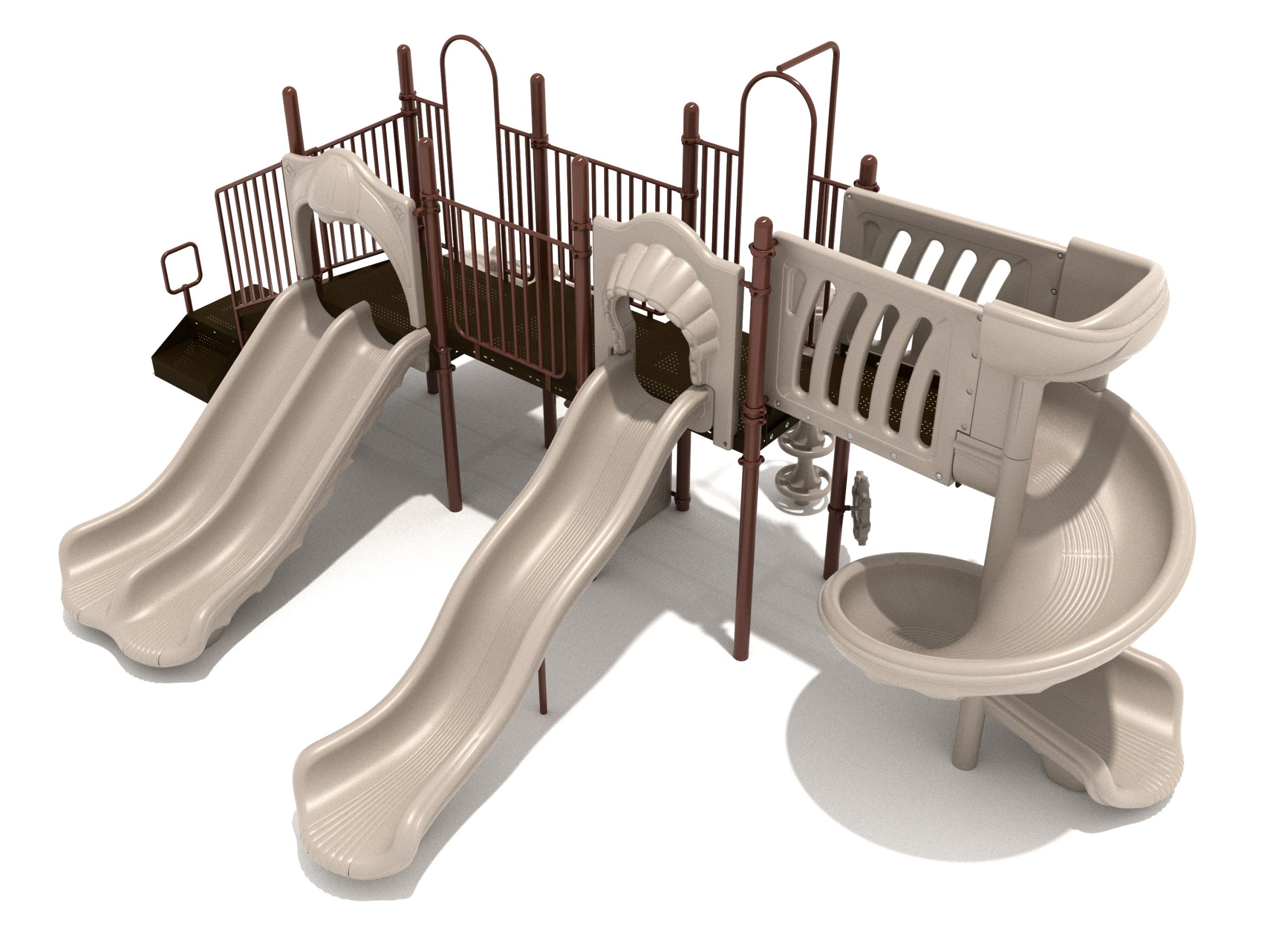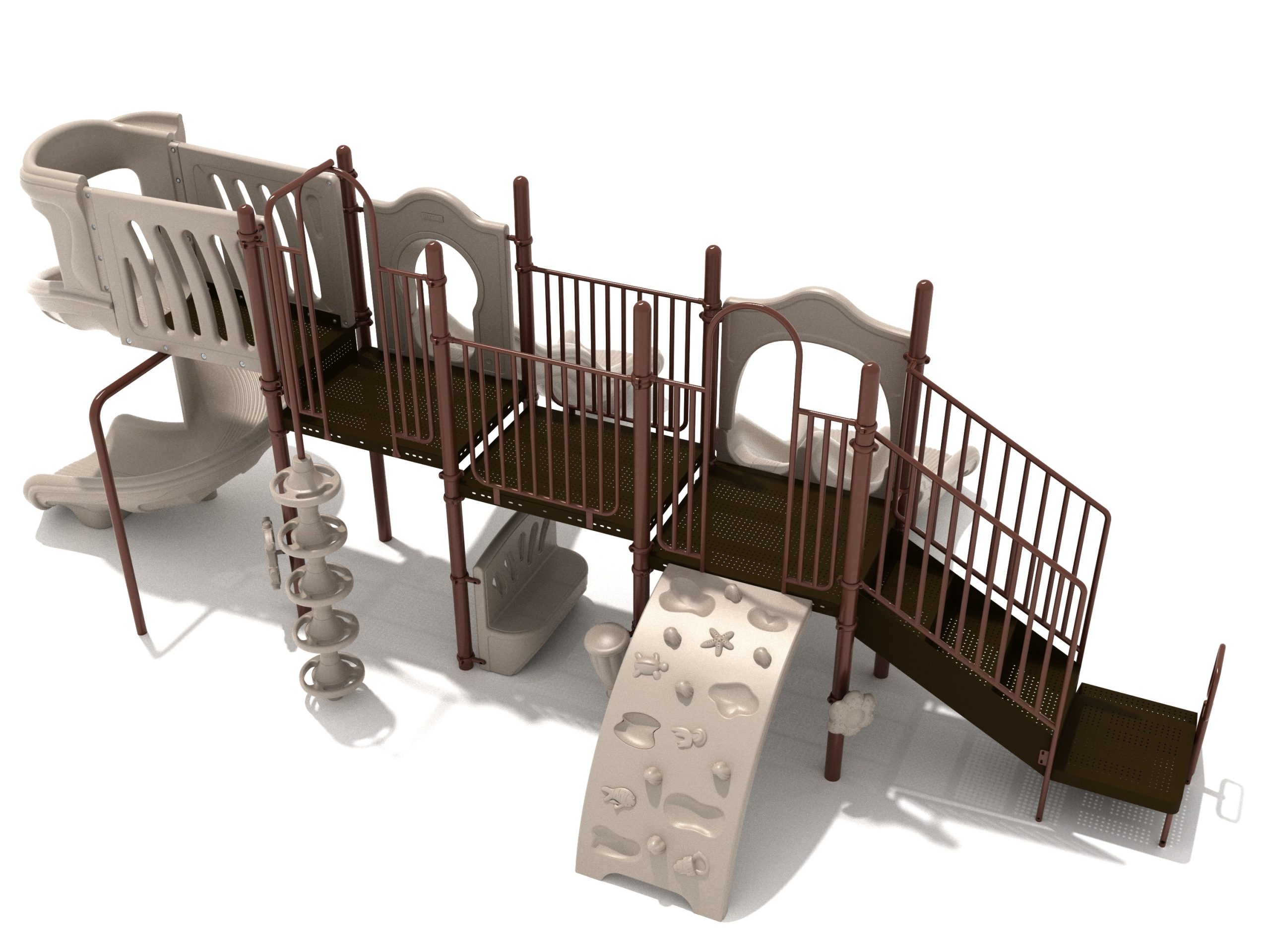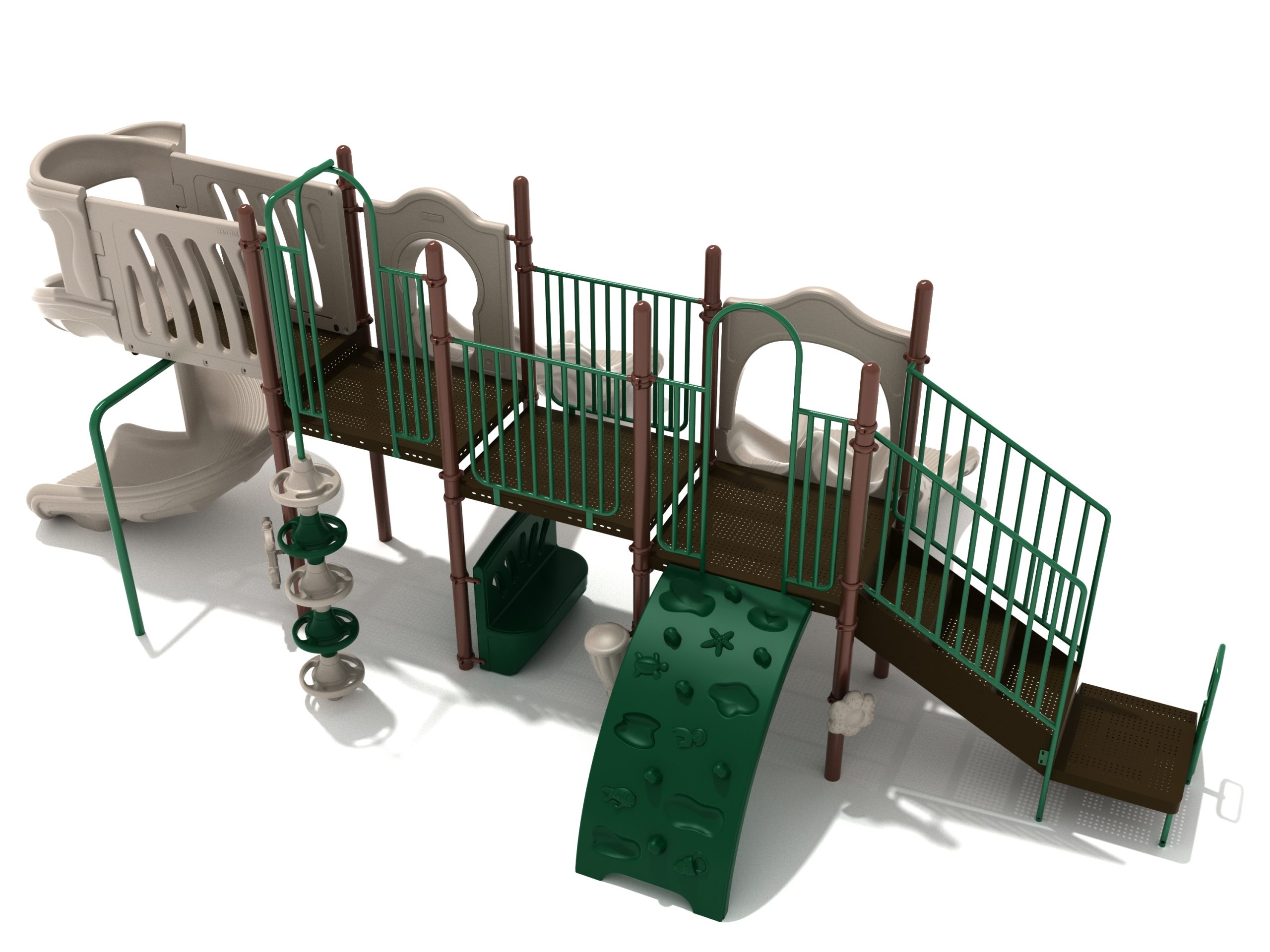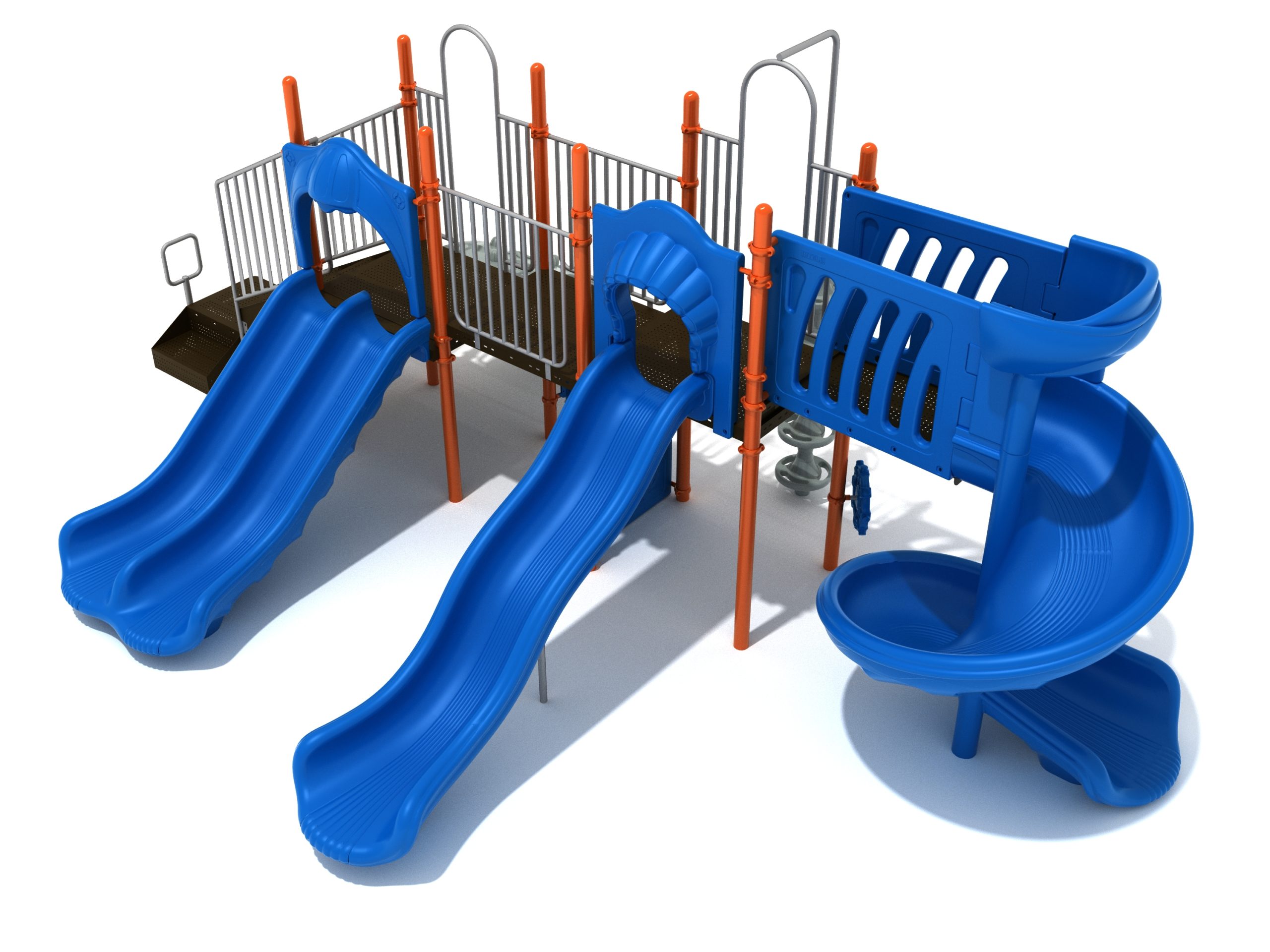 Climbing up climbers, sliding down slides, and playing with their friends is what makes up a day’s work when you are a child, and that is why children love the Durham play structure, which encompasses climbers, slides, and fun in its design, is so popular amongst children. Children can access this play structure with a sea creature climber, pod climber, or stairs. Children also have a choice of sliding down a double slide, wave slide, or spiral slide that are attached to the Durham play structure. A ship’s wheel, single drum, rain wheel, bongos, and a bench panel make this play structure ADA compliant, as well as offer lots of on-ground play for children to partake in. The bench panel also gives active children a place to rest after a hard day of play. This play structure is designed and built for children who are between the ages of 2 and 12 years old.