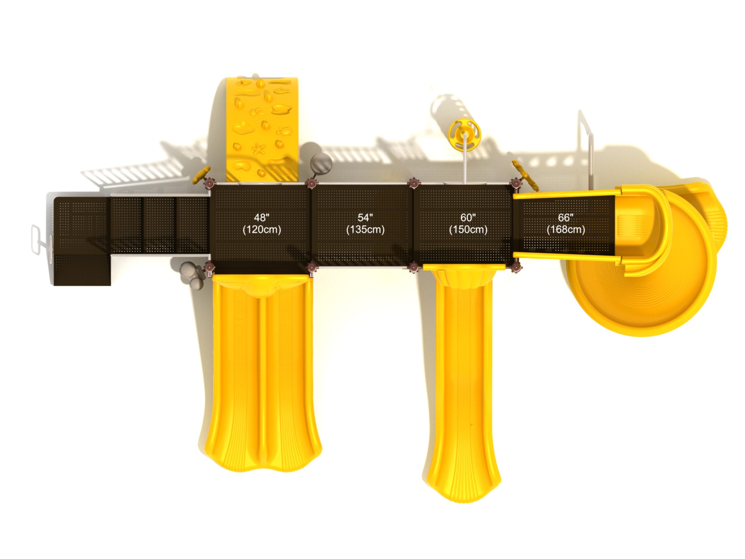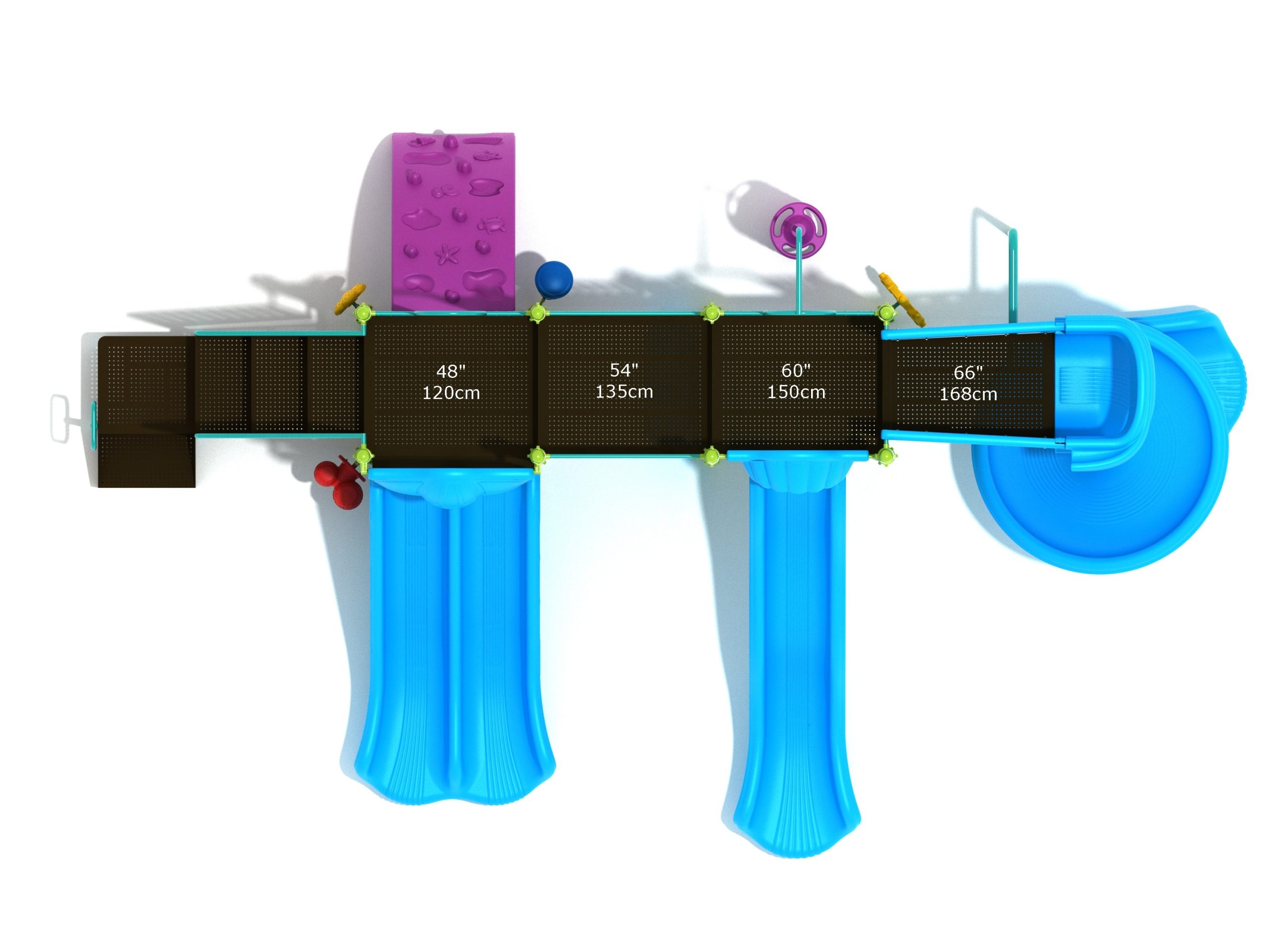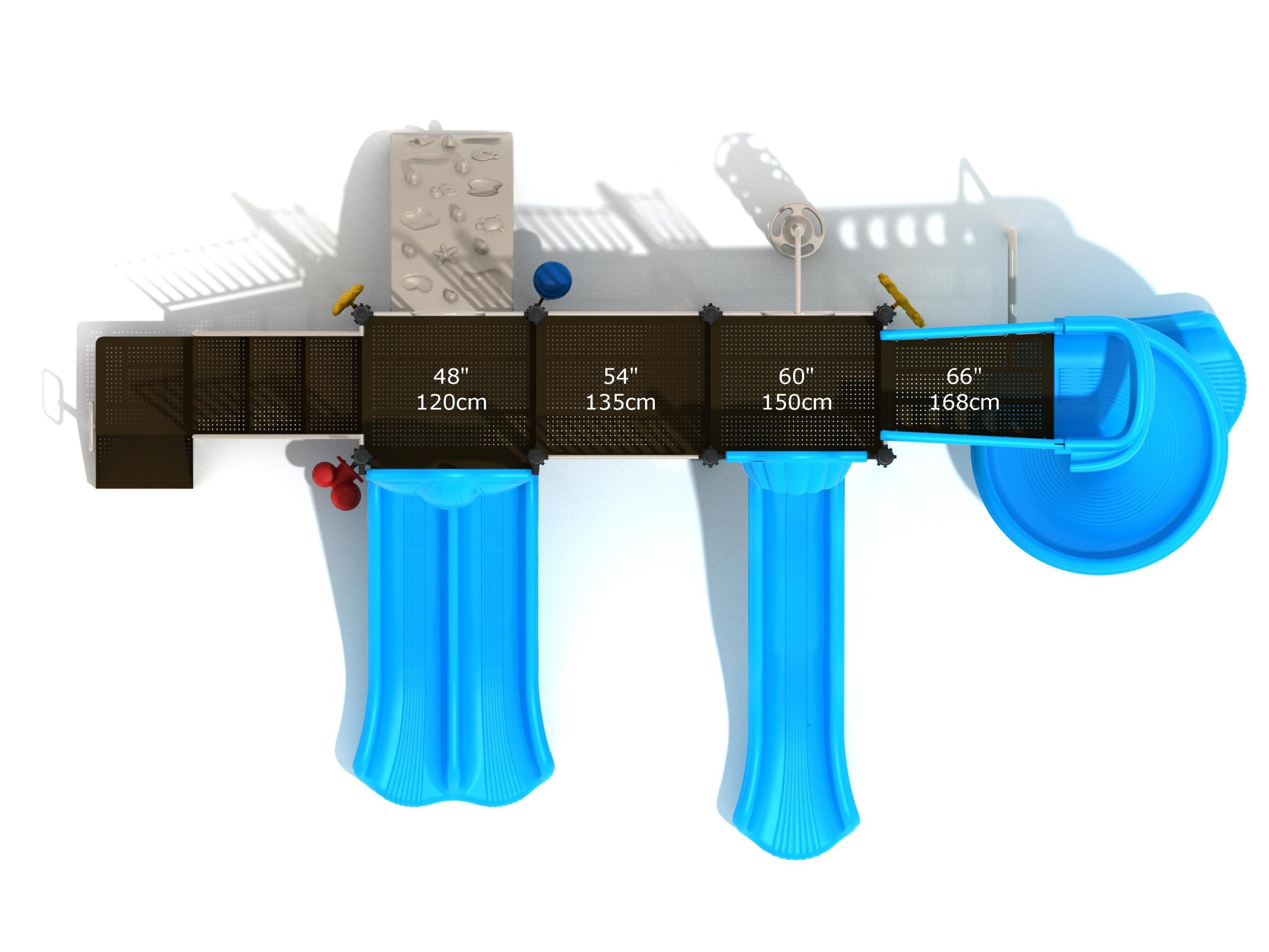 The linear design of the Durham makes it easy for children to access all parts of the equipment when they climb aboard at the Transfer Station. There are two other ways to get to the platforms. The Pod Climber lets them feel like they’re climbing up a palm tree or temple column with the rounded design, and the Sea Creature Climber brings excitement as they grab 3D starfish and turtles to help their ascent. The Durham boasts three fun slides to choose from: a Double Slide for thrilling competition, a Wave Slide for an undulating experience or a Spiral Slide for giggle-inducing twists and turns. On the ground level there is a Bench Panel to catch their breath from all of the excitement as well as a Ship’s Wheel to inspire creativity. The sound of music from the Bongos and Single Drum creates a happy atmosphere in the playground and younger children especially will love to bang their hands on these. A spinning Rain Wheel is also included to emulate the pitter patter of raindrops.