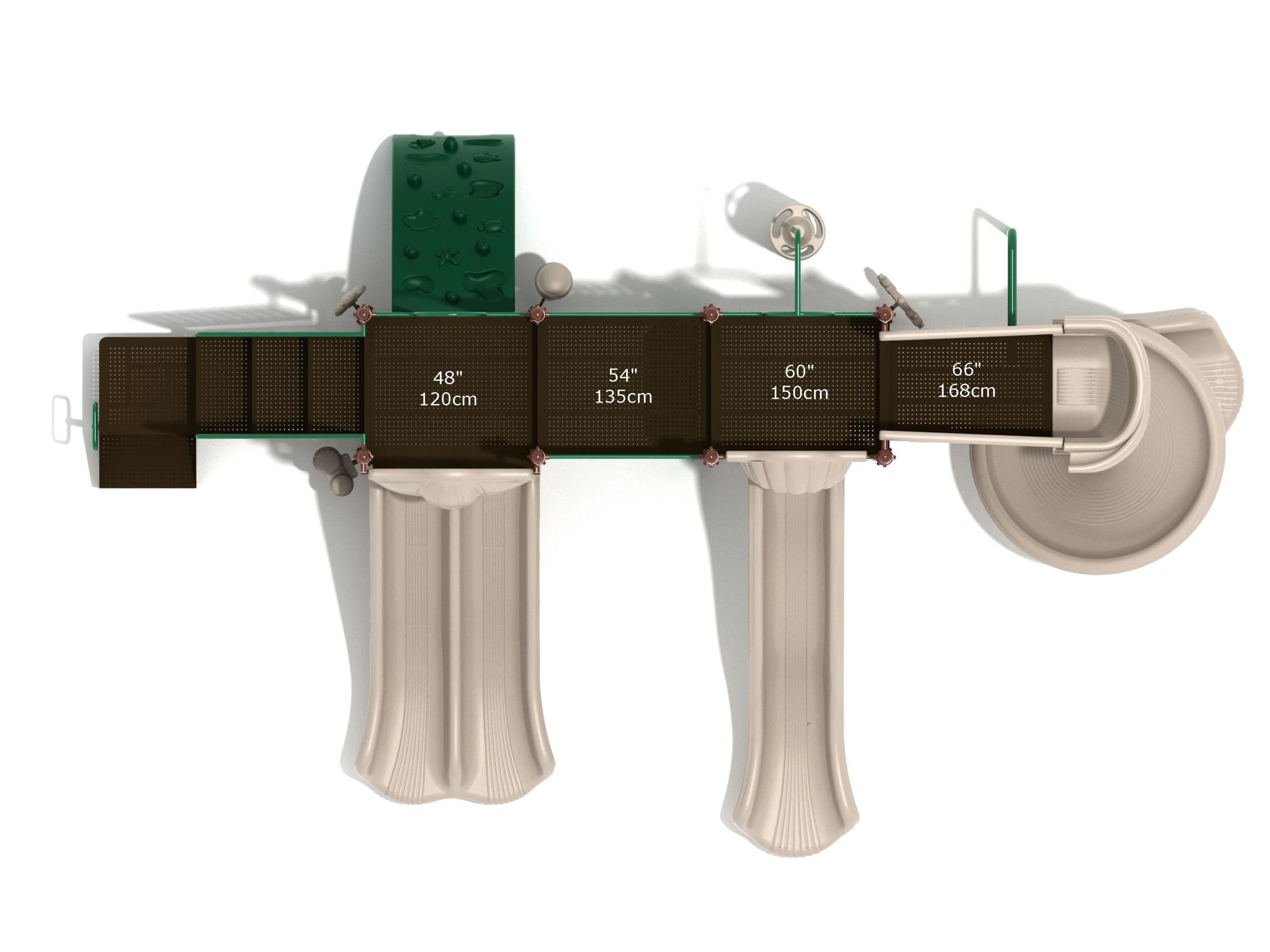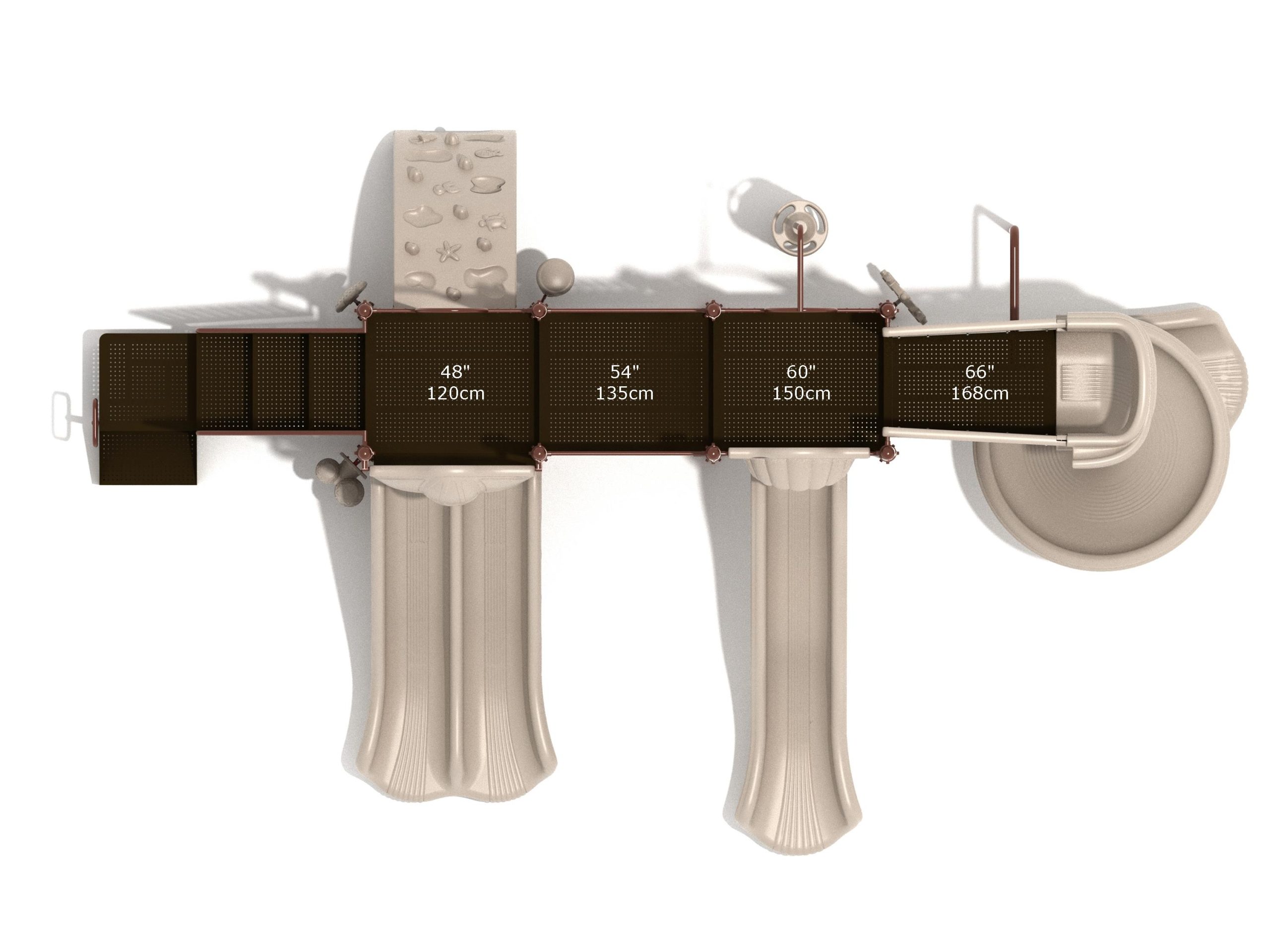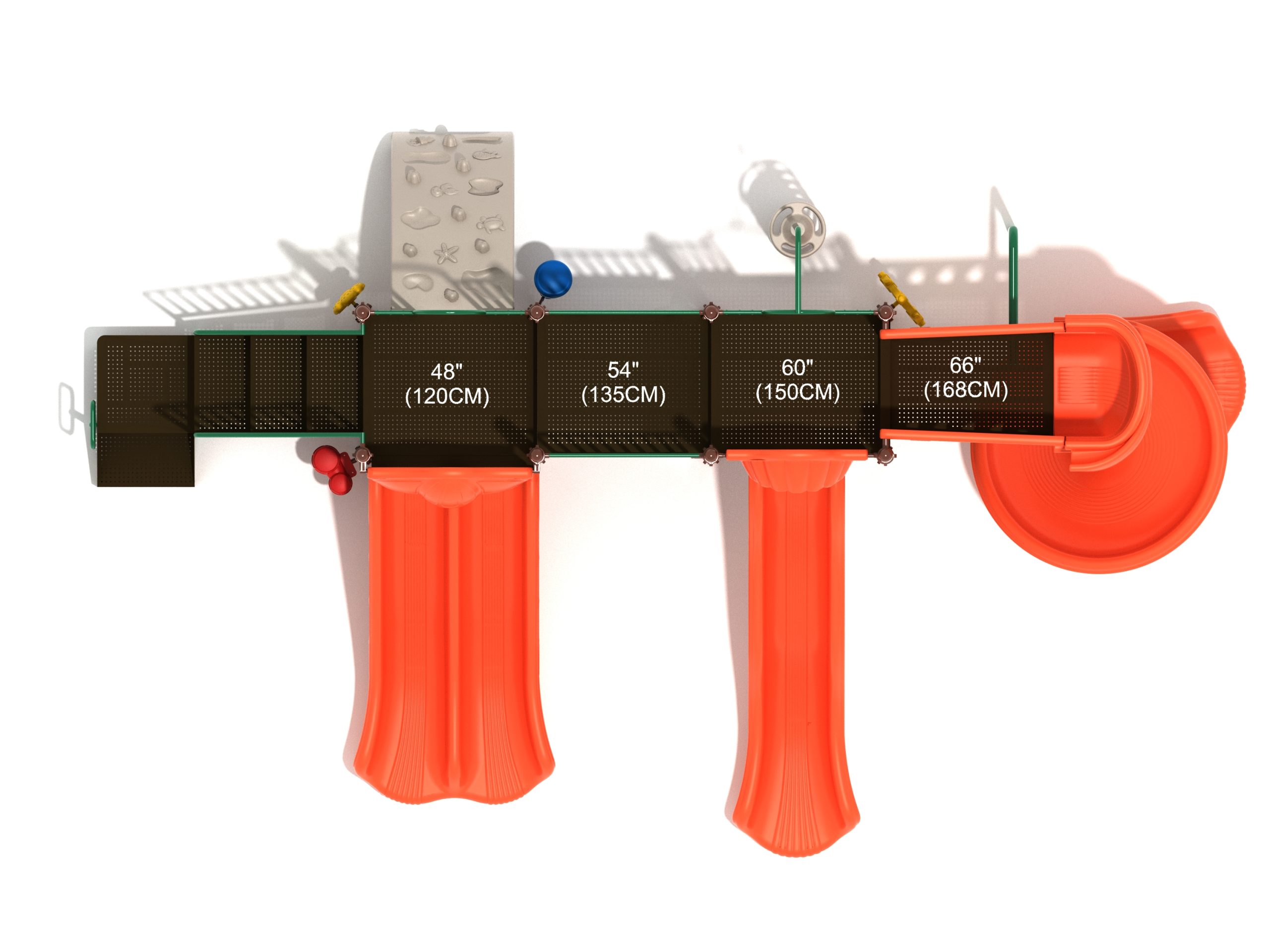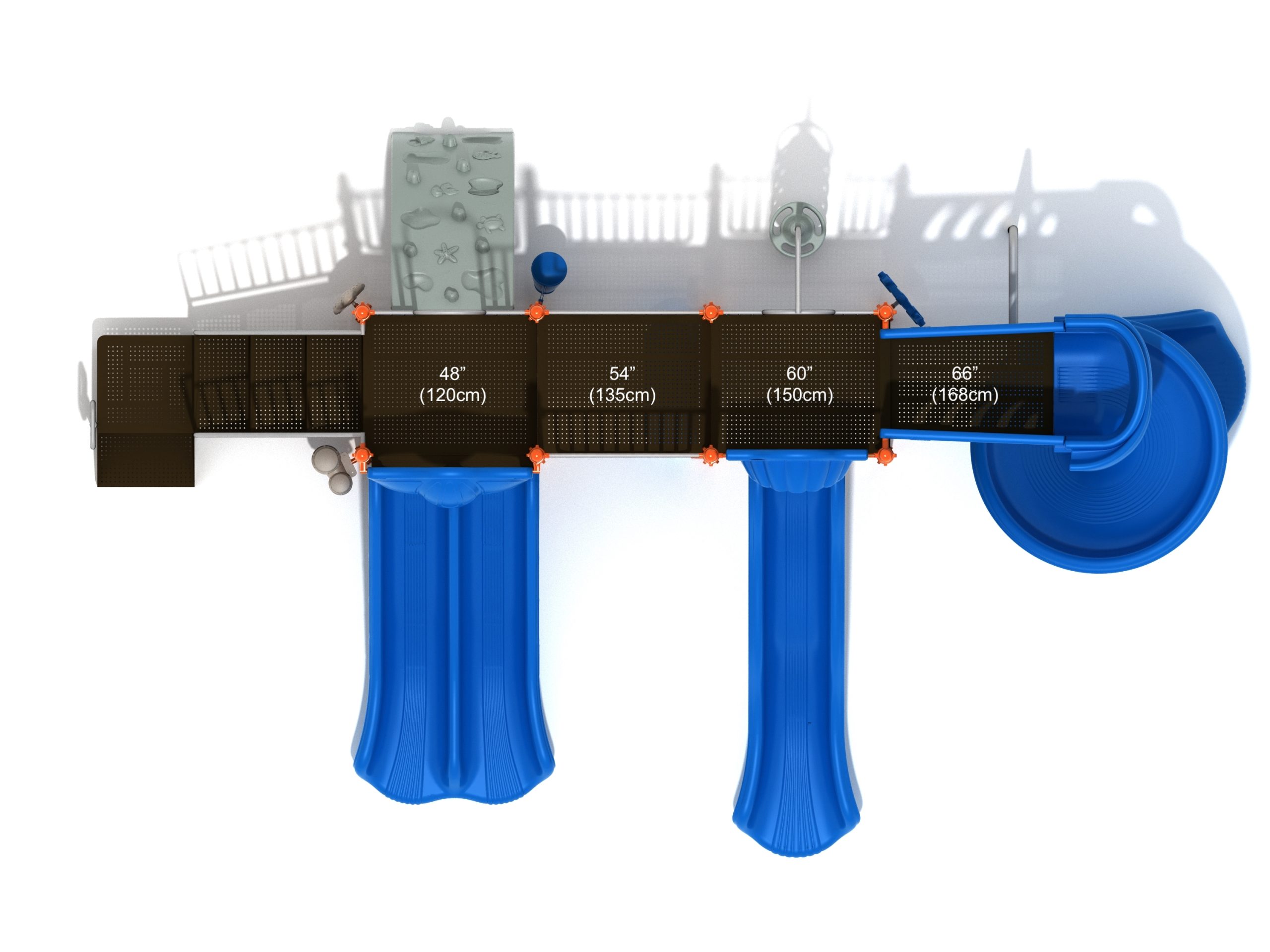 The linear design of the Durham makes it easy for children to access all parts of the equipment when they climb aboard at the Transfer Station. There are two other ways to get to the platforms. The Pod Climber lets them feel like they’re climbing up a palm tree or temple column with the rounded design, and the Sea Creature Climber brings excitement as they grab 3D starfish and turtles to help their ascent. The Durham boasts three fun slides to choose from: a Double Slide for thrilling competition, a Wave Slide for an undulating experience or a Spiral Slide for giggle-inducing twists and turns. On the ground level there is a Bench Panel to catch their breath from all of the excitement as well as a Ship’s Wheel to inspire creativity. The sound of music from the Bongos and Single Drum creates a happy atmosphere in the playground and younger children especially will love to bang their hands on these. A spinning Rain Wheel is also included to emulate the pitter patter of raindrops.
