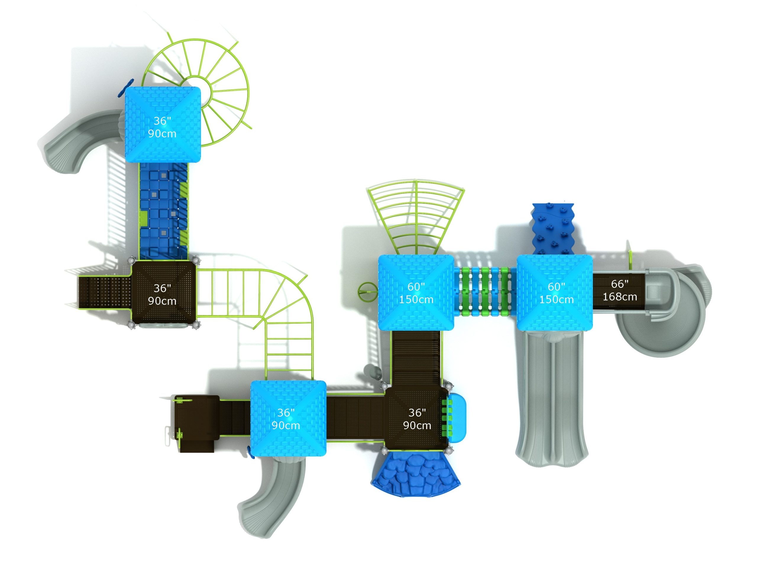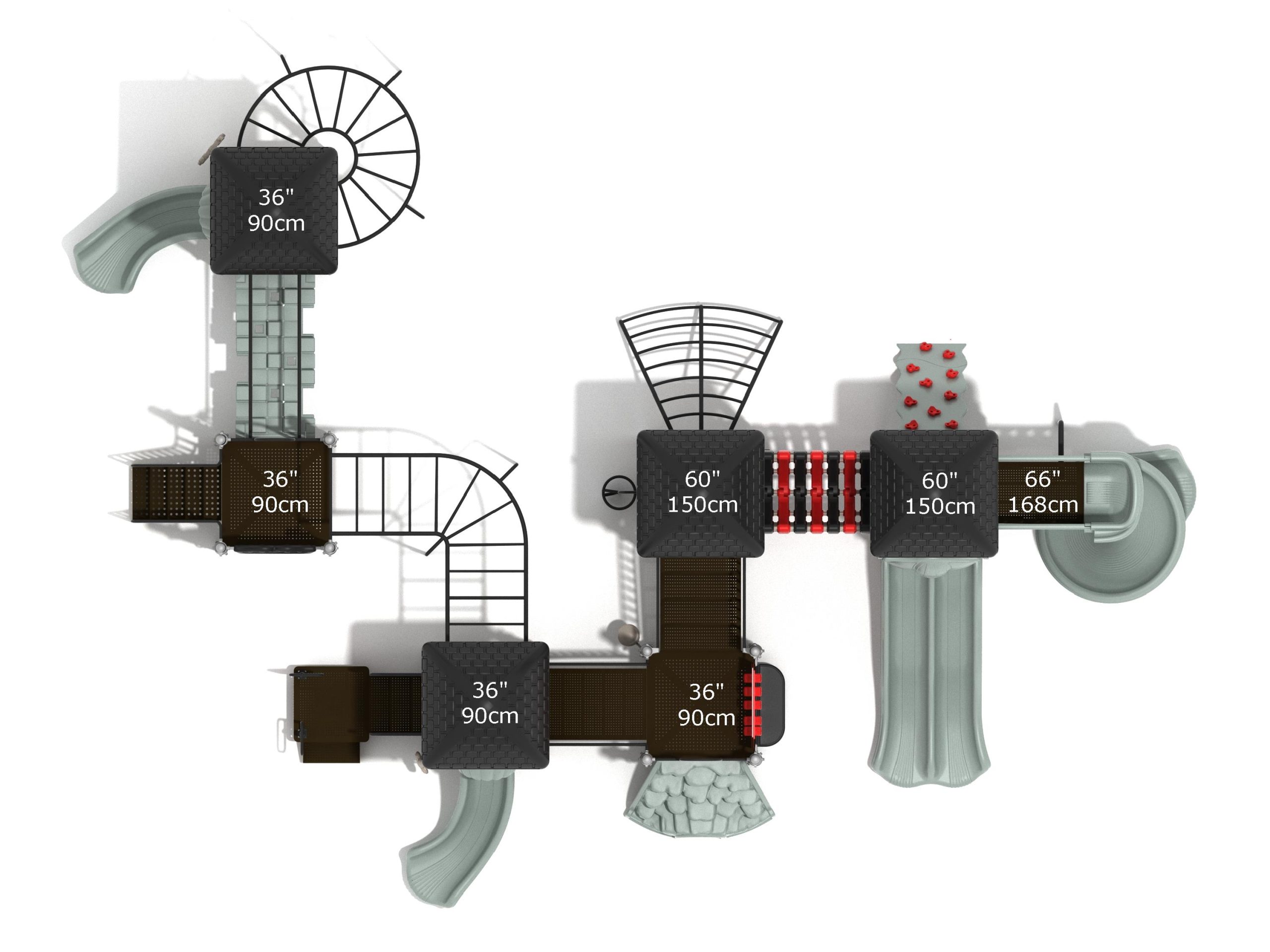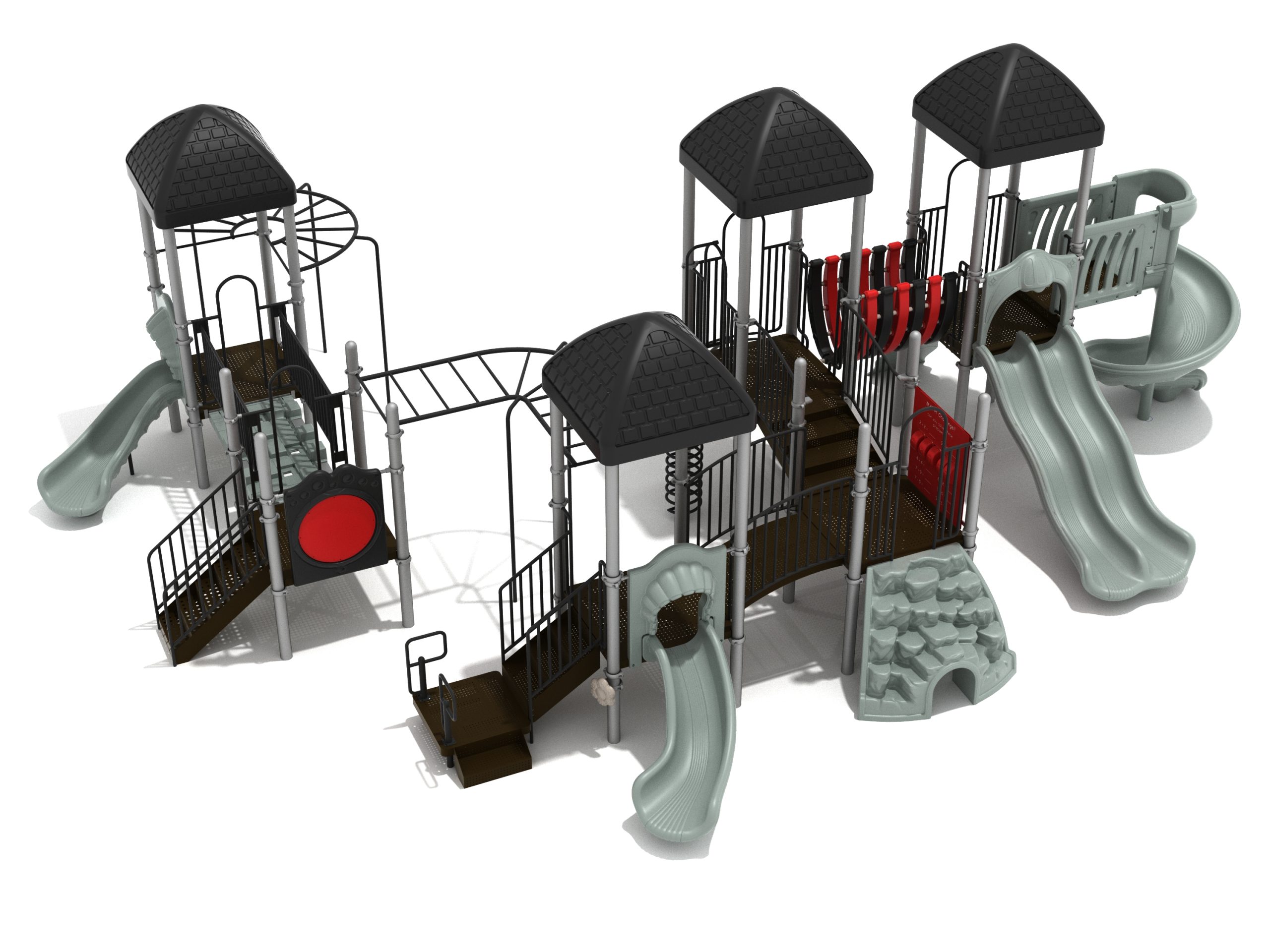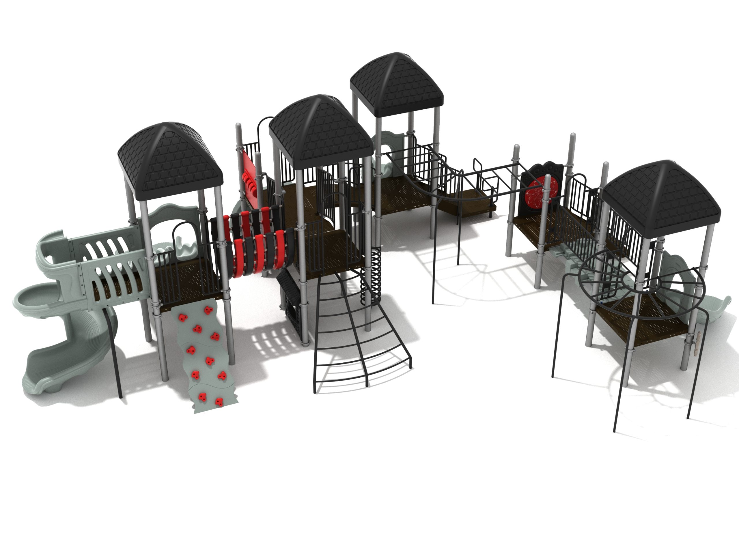 Esplanade Ridge is a play structure that resembles a small city filled with all sorts of adventures. With 5 slides and plenty of amenities, Esplanade Ridge is a must-have in every playground. Its design is of untamed landscape so kids can explore different interactive elements. They can hide beneath the Rock Hole Climber, pretending to camp in a cave. A Spiral Climber & a Wavy PE Rock Climbing Wall offer exciting yet challenging climbing experiences to young adventurers. So, they can make their way to the Bones Bridge, scrambling between climbers. Math, Bench, & Store Panels allow them to have fun with friends at various locations. 4 Square Toofs cover it all, making this play structure perfect for running around. The Finger Maze Panel adds to kids’ curiosity. Esplanade Ridge’s futuristic design invites children to hopscotch and develop their social skills while enjoying themselves. Since it is built with commercial-grade materials, this play structure provides safety and is sure to last for years to come.